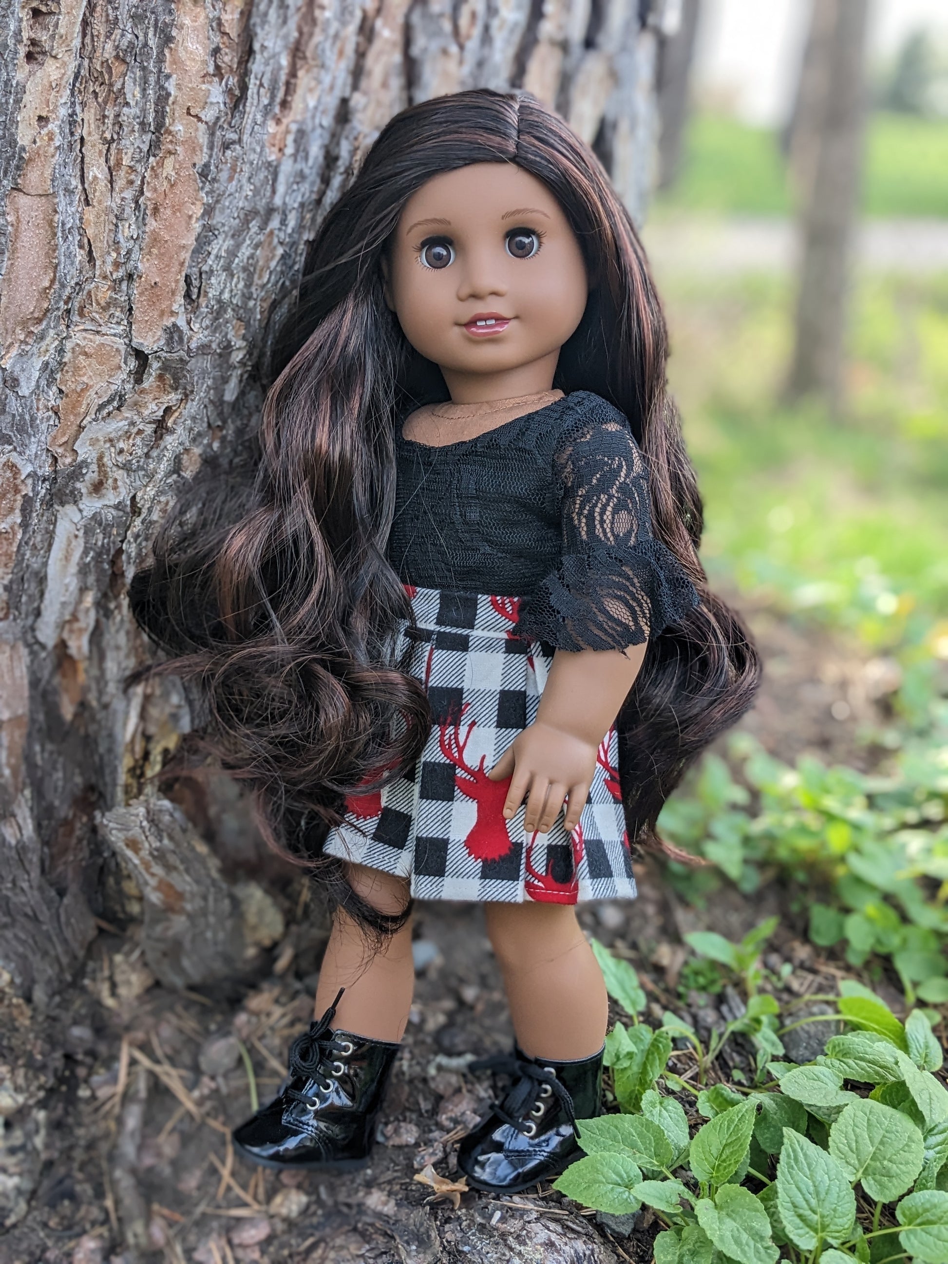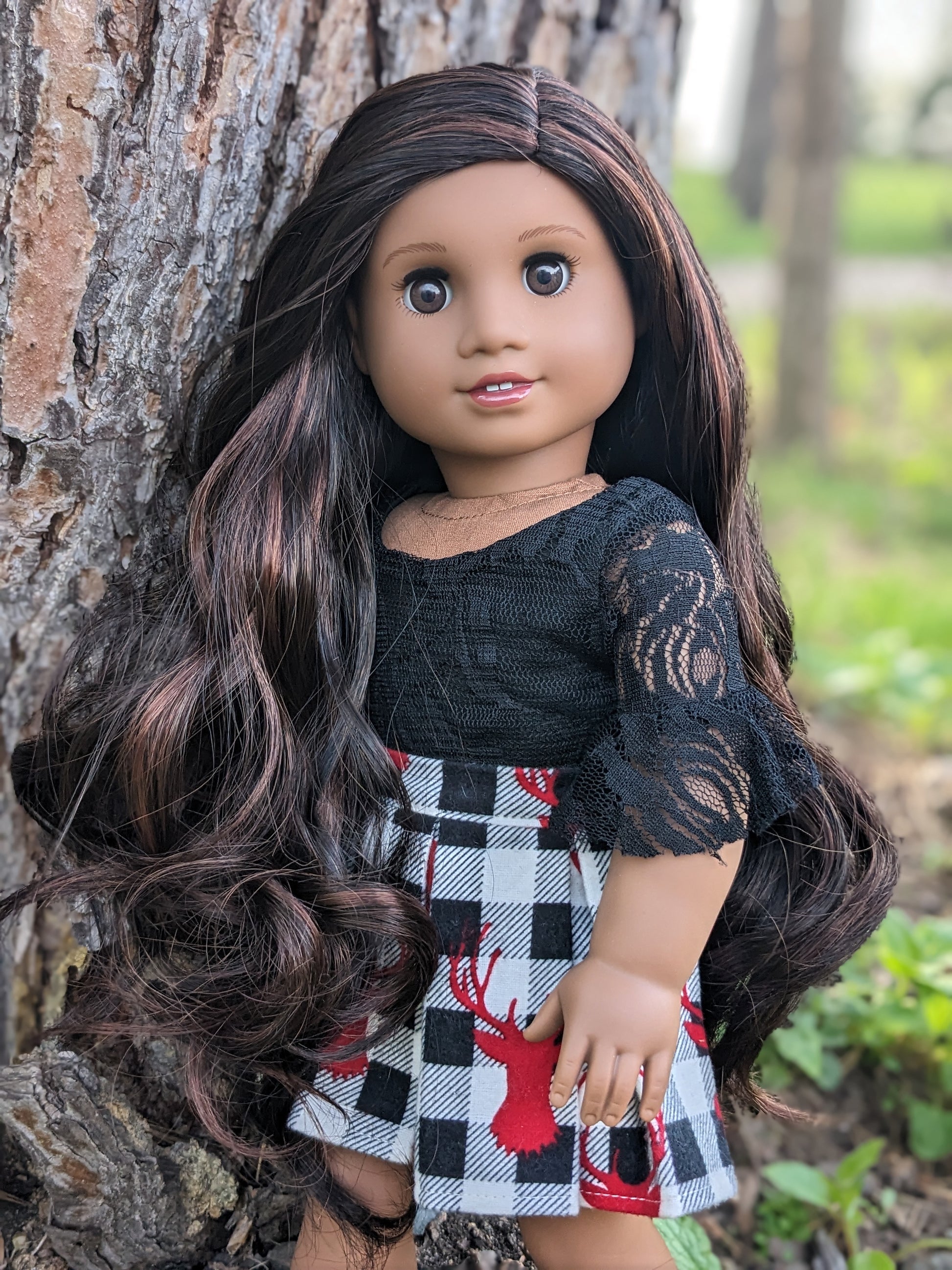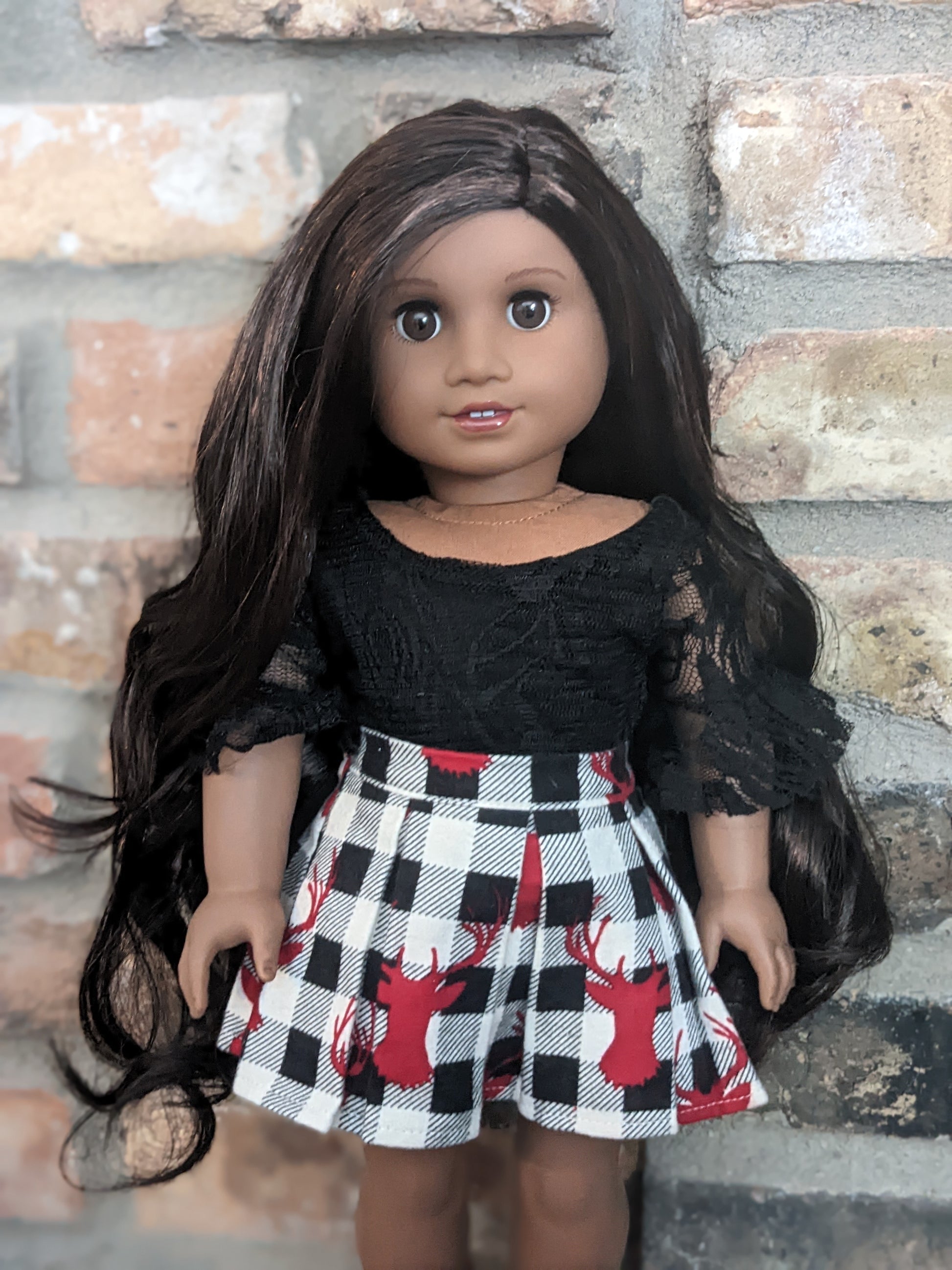 This one of a kind OOAK custom American Girl doll was created with a brand new Truly Me doll, a dark reddish brown wig from a new Maritza doll, and brown eyes. She has lip gloss that was hand painted and sealed. She may have some minor shine marks from handling. She comes with the outfit pictured.