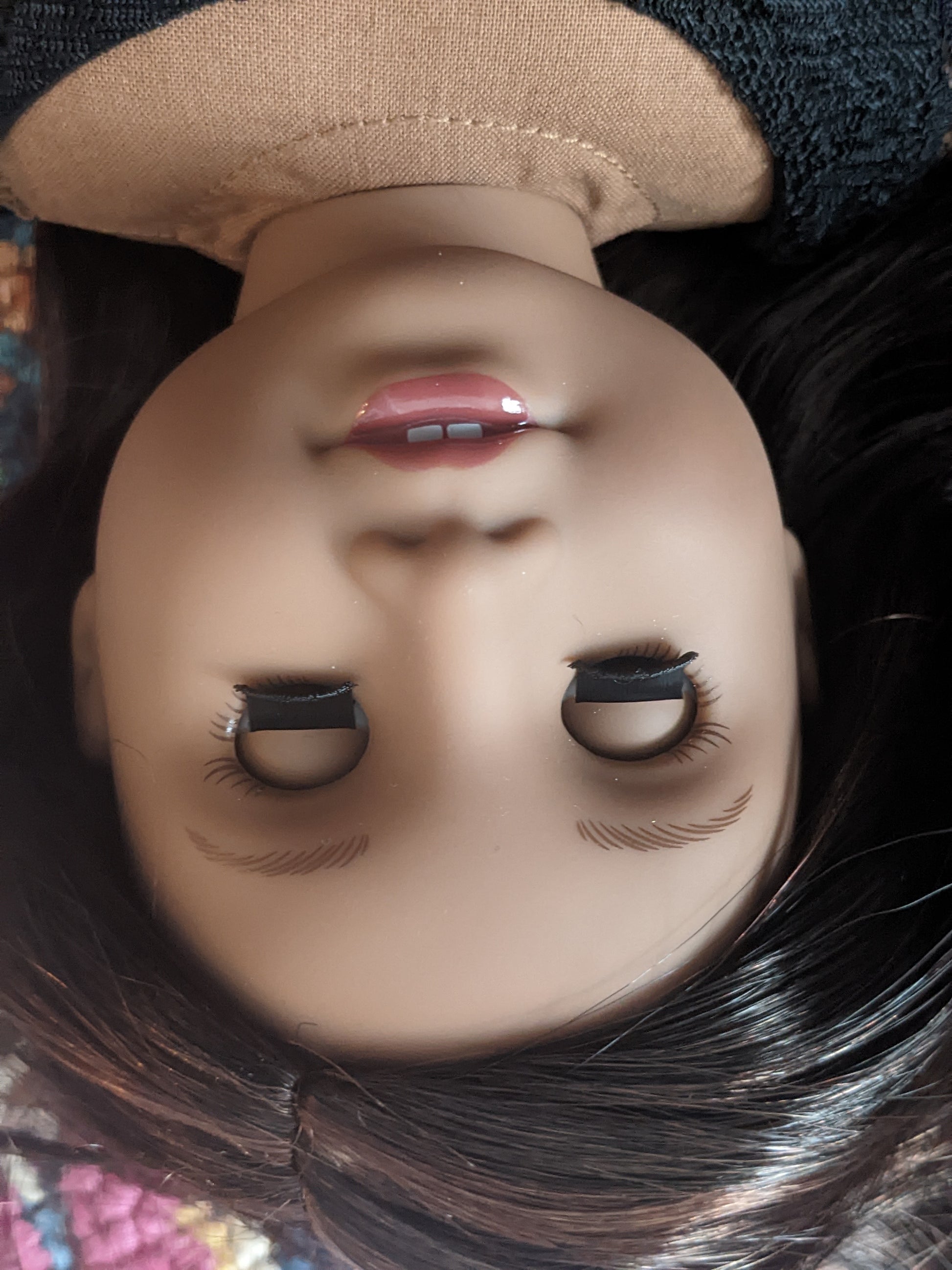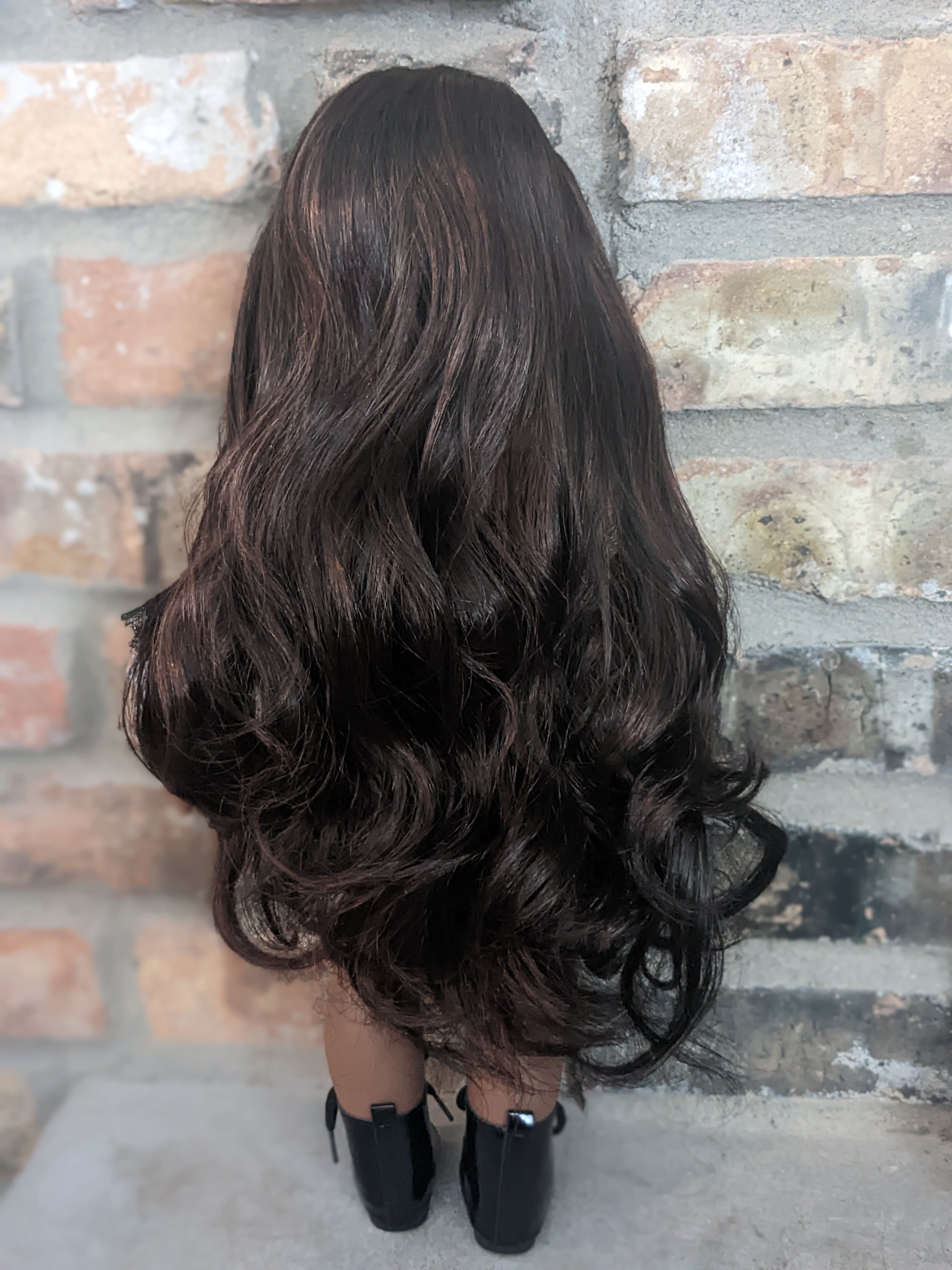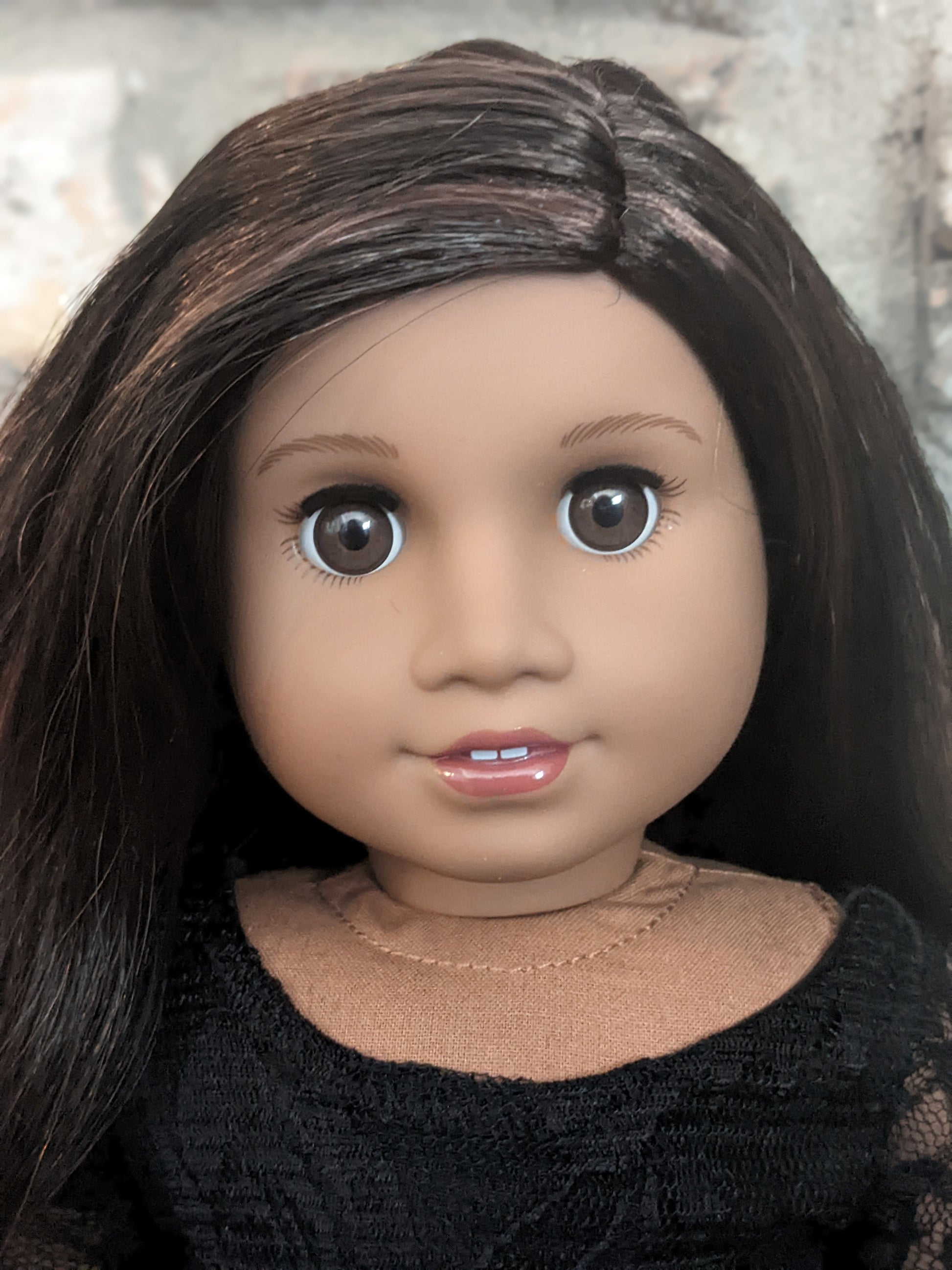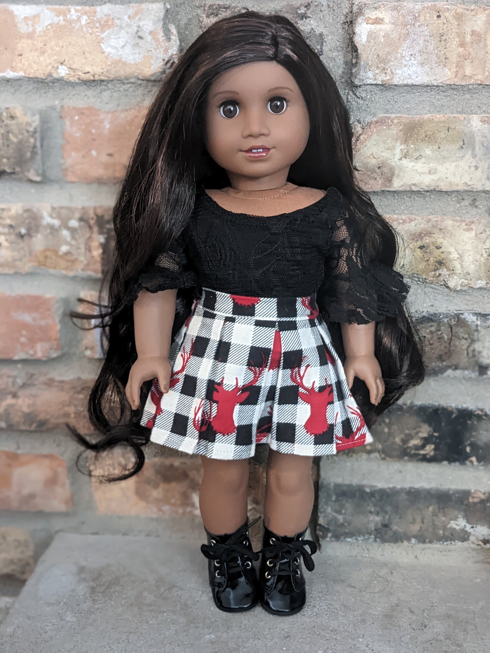 This one of a kind OOAK custom American Girl doll was created with a brand new Truly Me doll, a dark reddish brown wig from a new Maritza doll, and brown eyes. She has lip gloss that was hand painted and sealed. She may have some minor shine marks from handling. She comes with the outfit pictured.