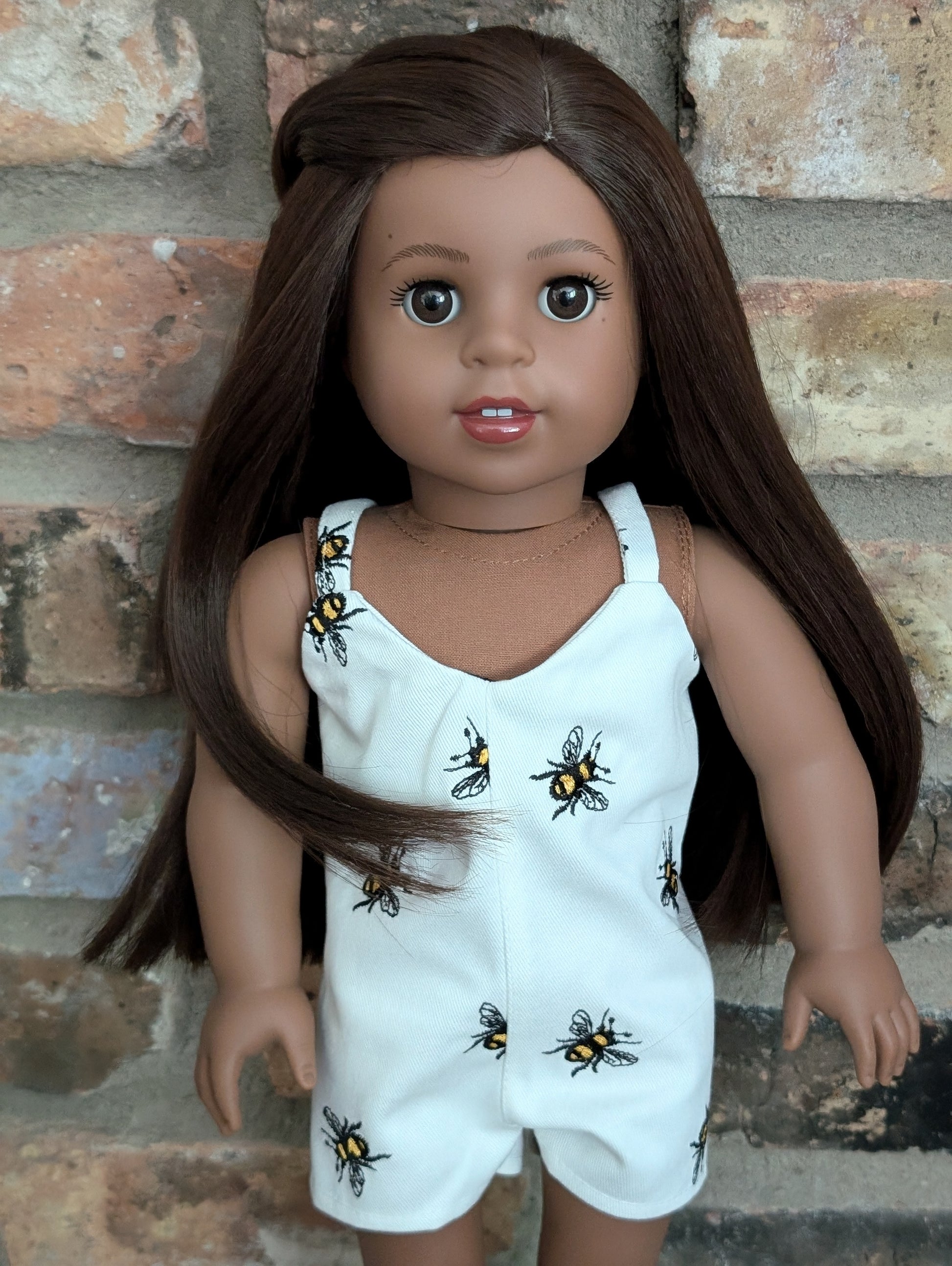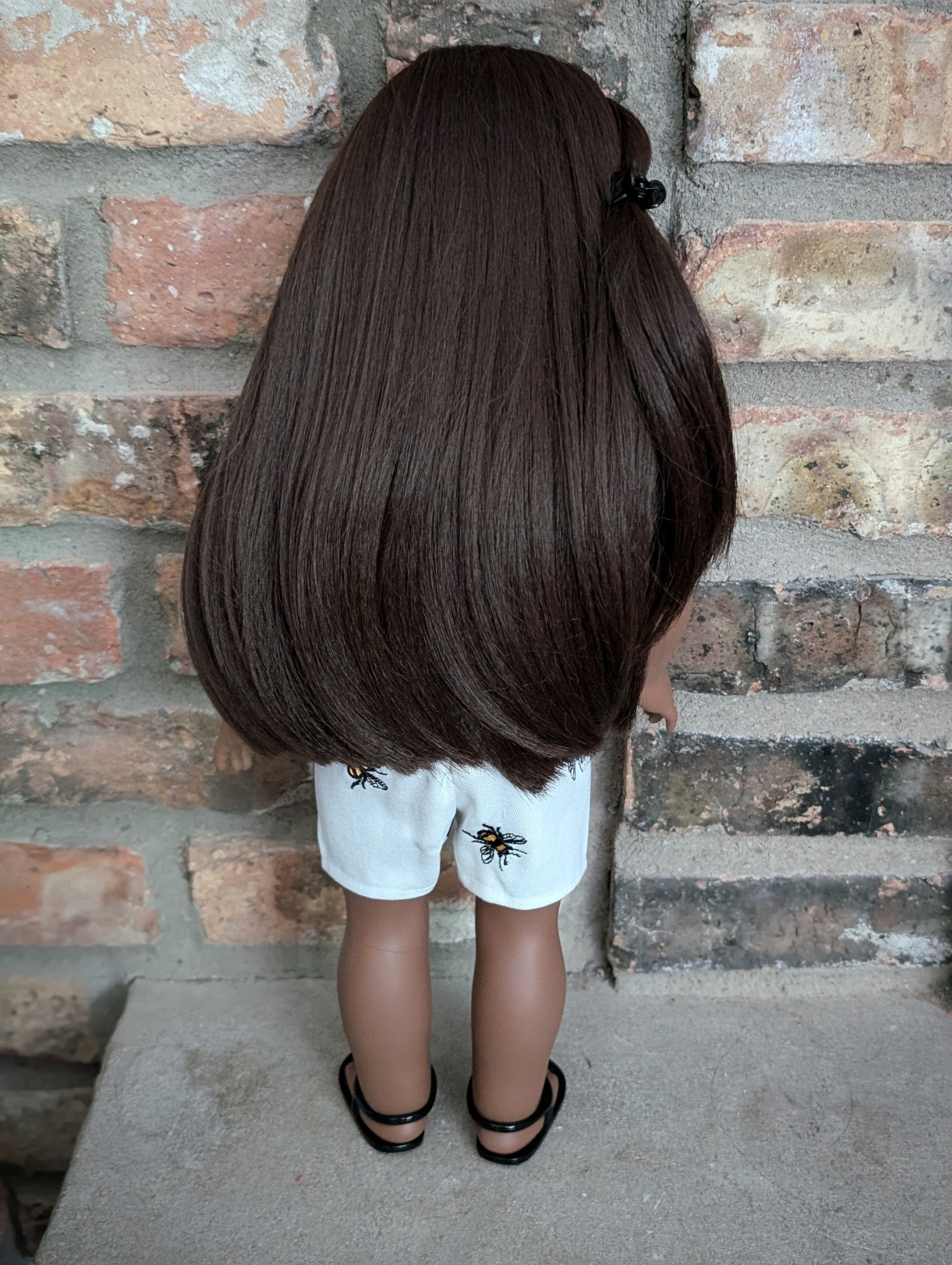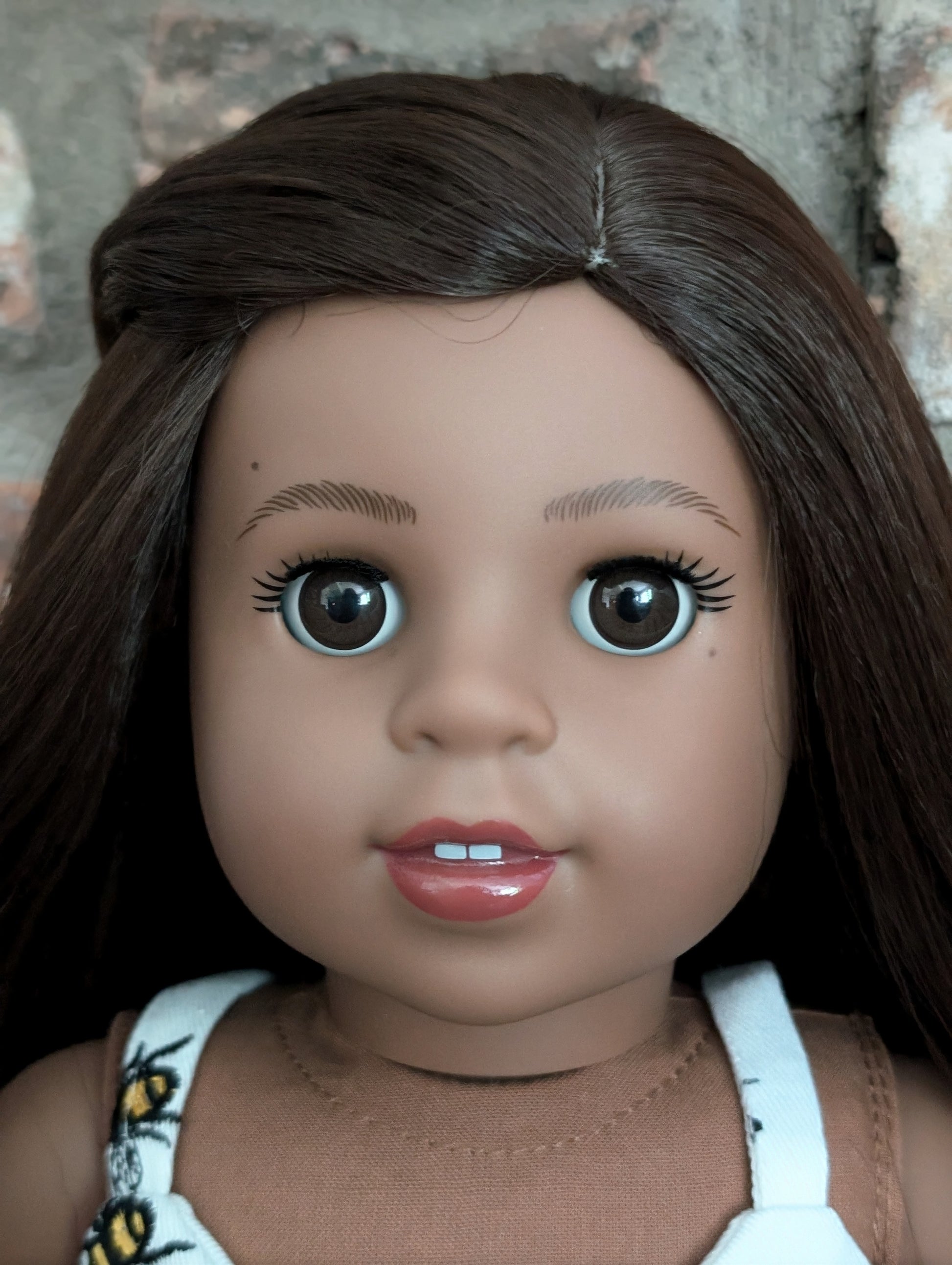 This one of a kind OOAK custom American Girl doll was created with a brand new Truly Me doll, a dark brown textured wig, and brown eyes. She has lip gloss and beauty marks that were hand painted and sealed. She may have some minor shine marks from handling. She comes with the outfit pictured.