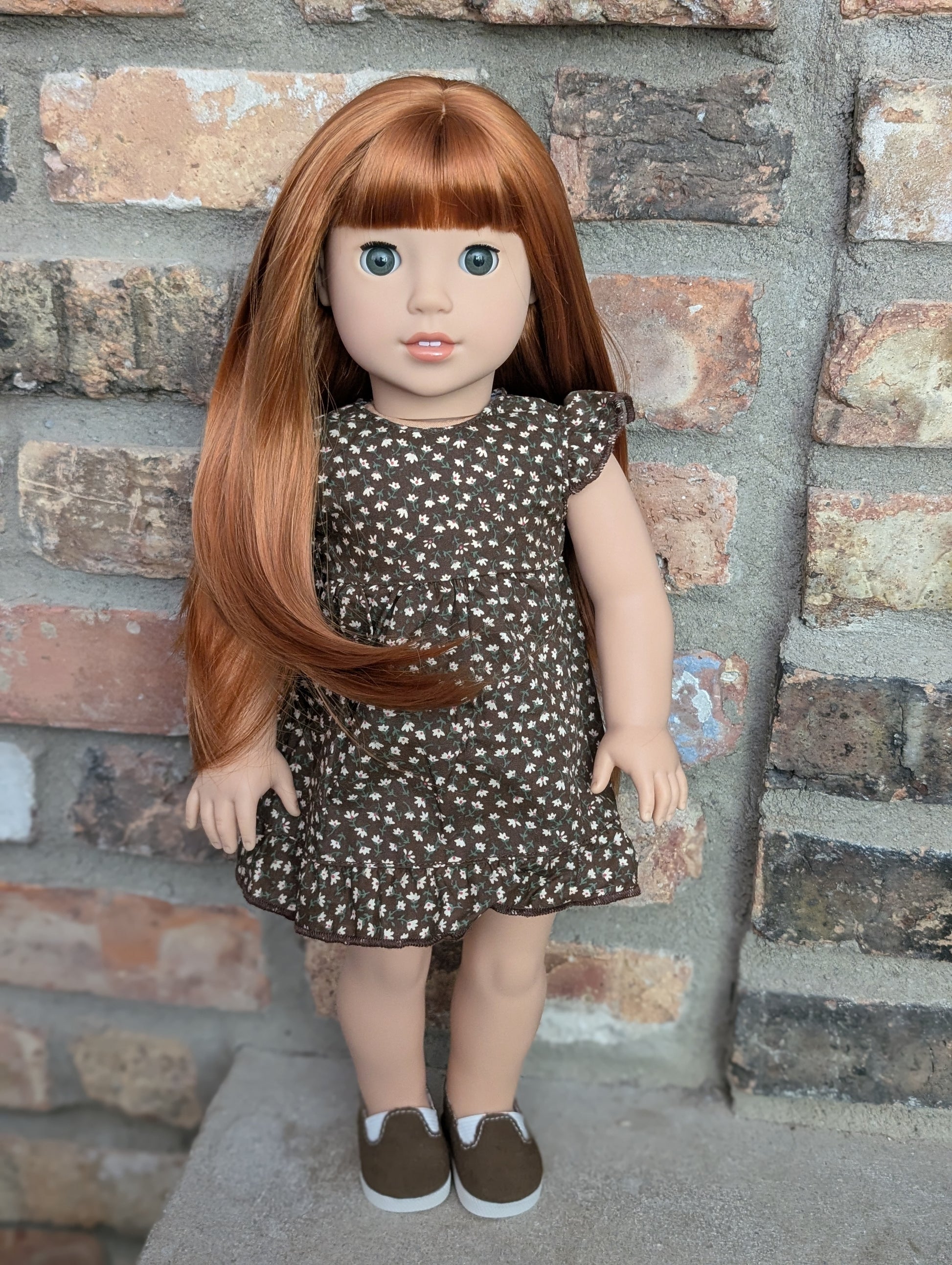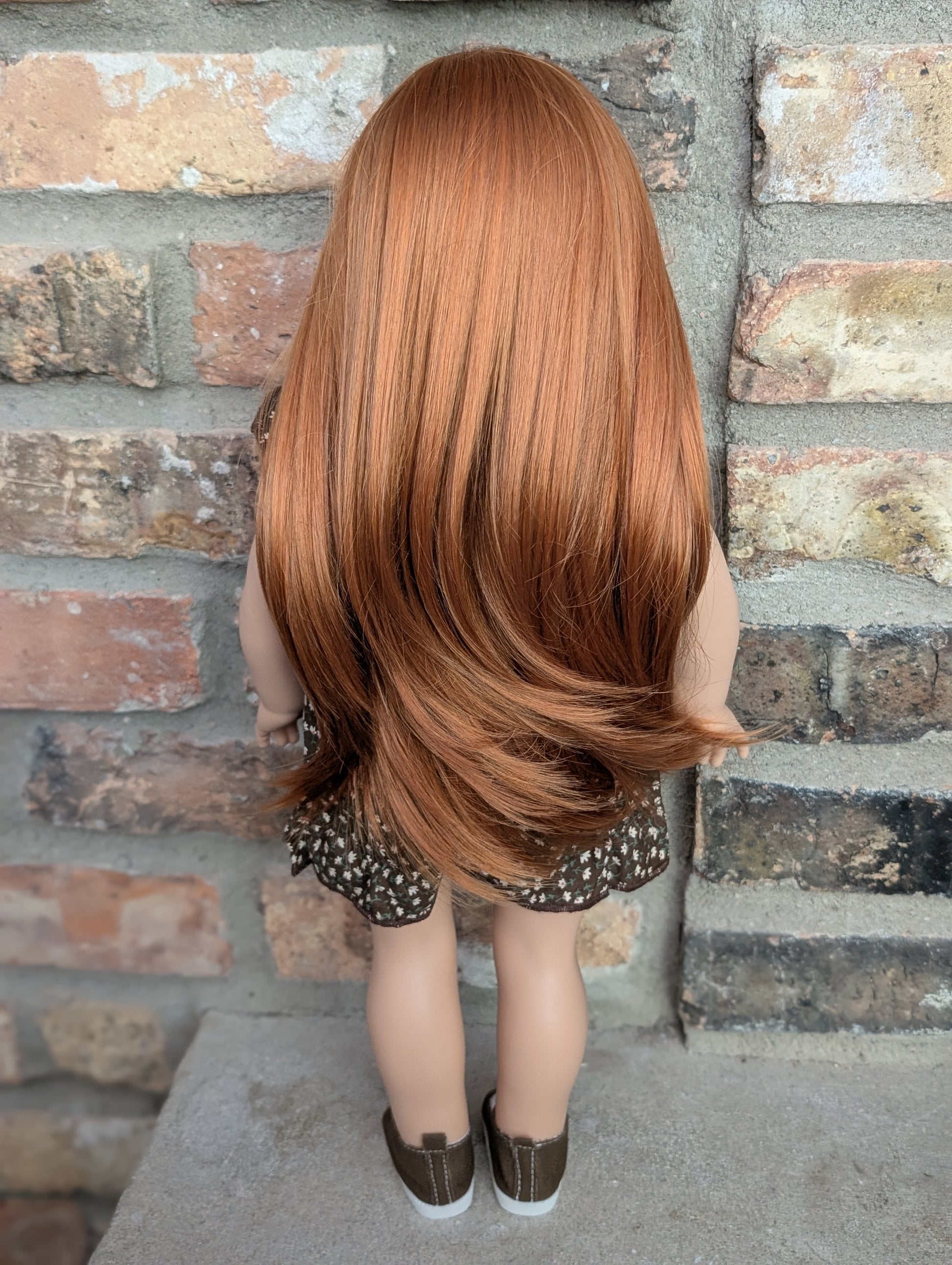 This one of a kind OOAK custom American Girl doll was created with a brand new doll, a red wig, and grey eyes. She has lip gloss that was hand painted and sealed. She may have some minor shine marks from handling. She comes with the outfit pictured.