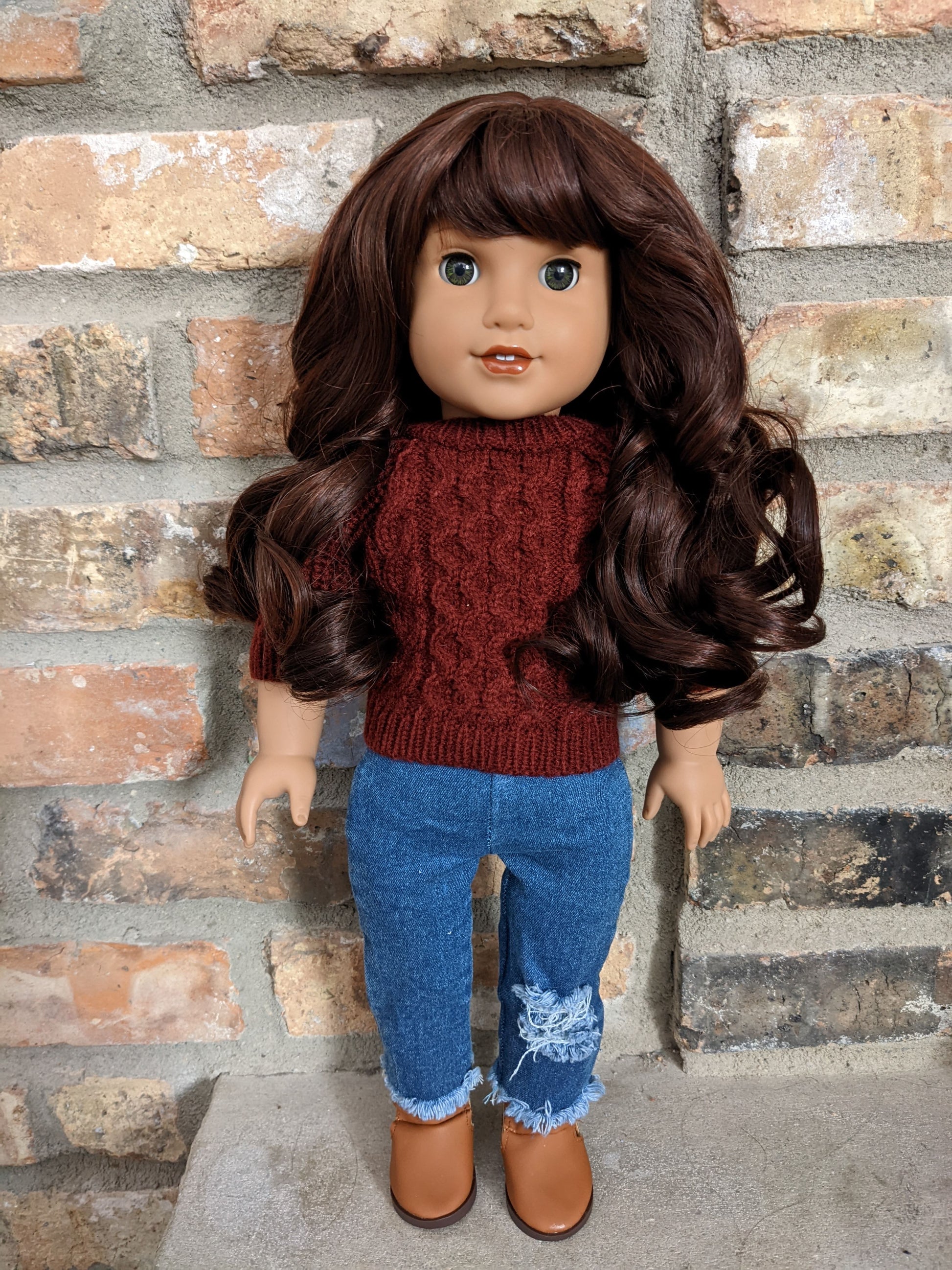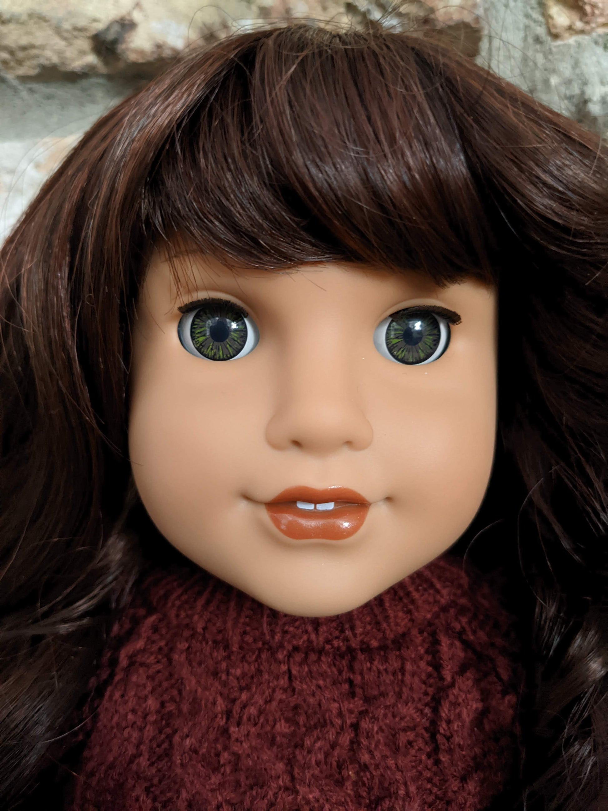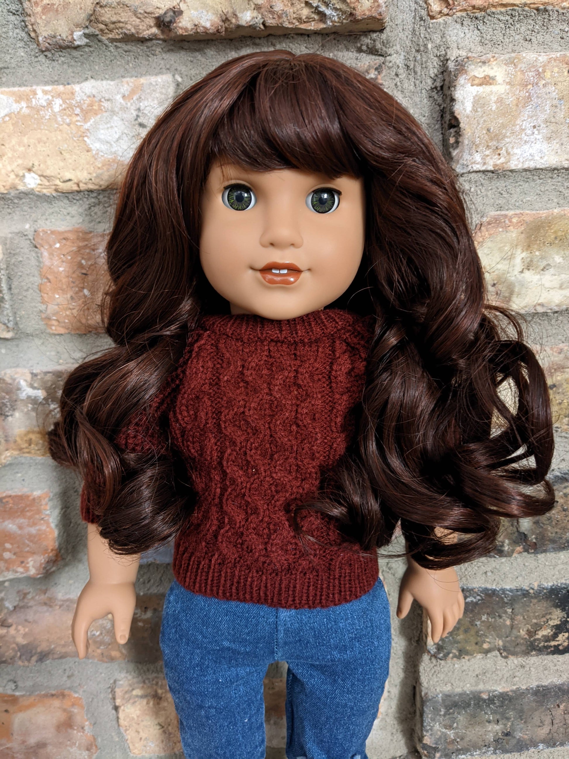 This one of a kind OOAK custom American Girl doll was created with a brand new doll, a reddish dark brown curly wig with bangs, and hazel eyes. She has custom lip gloss, painted and sealed. She may have some minor shine marks from handling. She comes with the outfit pictured. Please let me know if you would like the wig left unattached by leaving a note in the "Order Special Instructions" box upon checkout. For all other orders, I will glue the wig on using a heavy duty permanent adhesive for a strong hold. I can reposition the wig to change the part location if you prefer or I can glue the wig on as close to how its pictured as possible, but slight variations may occur during the gluing process.