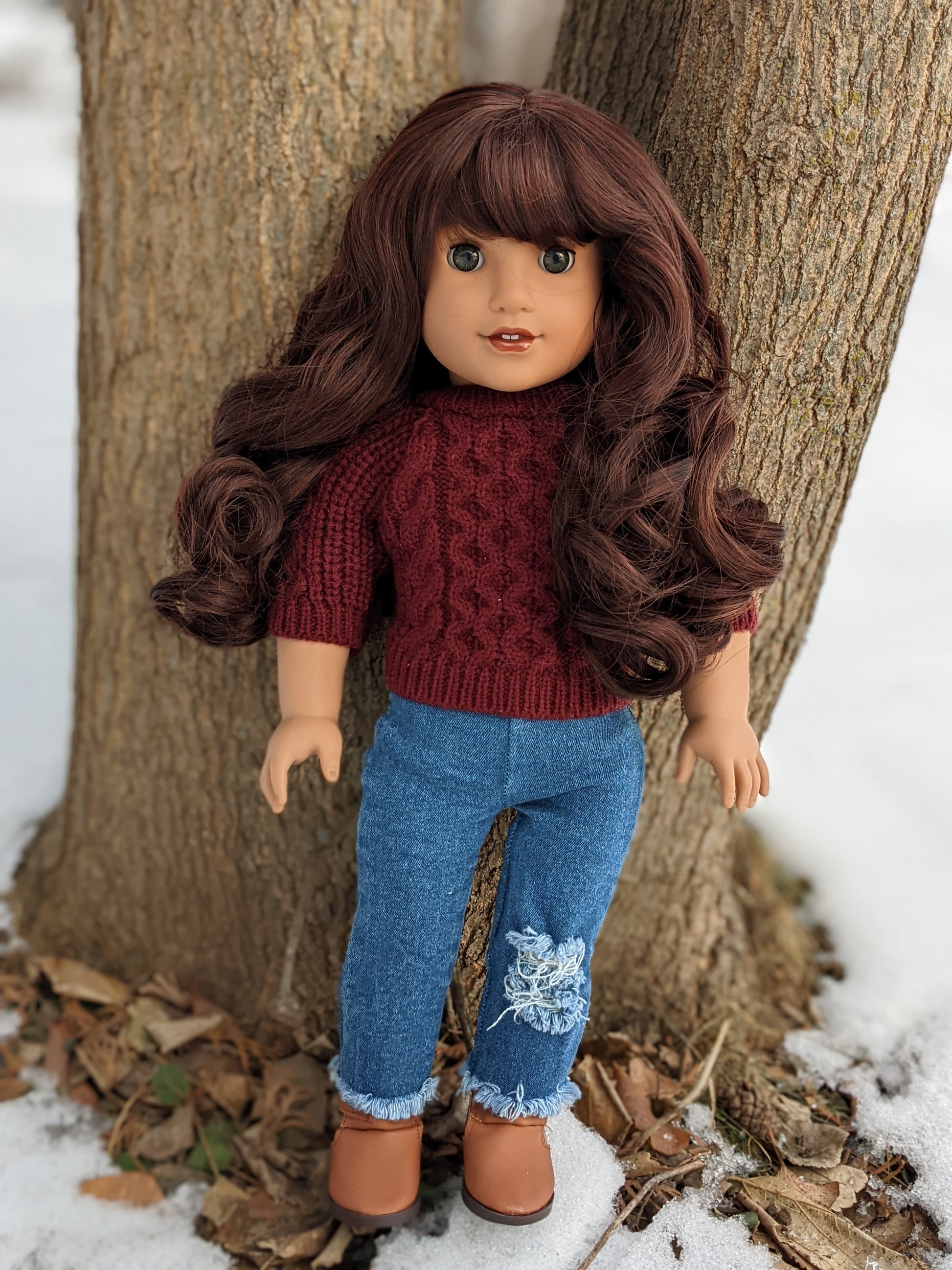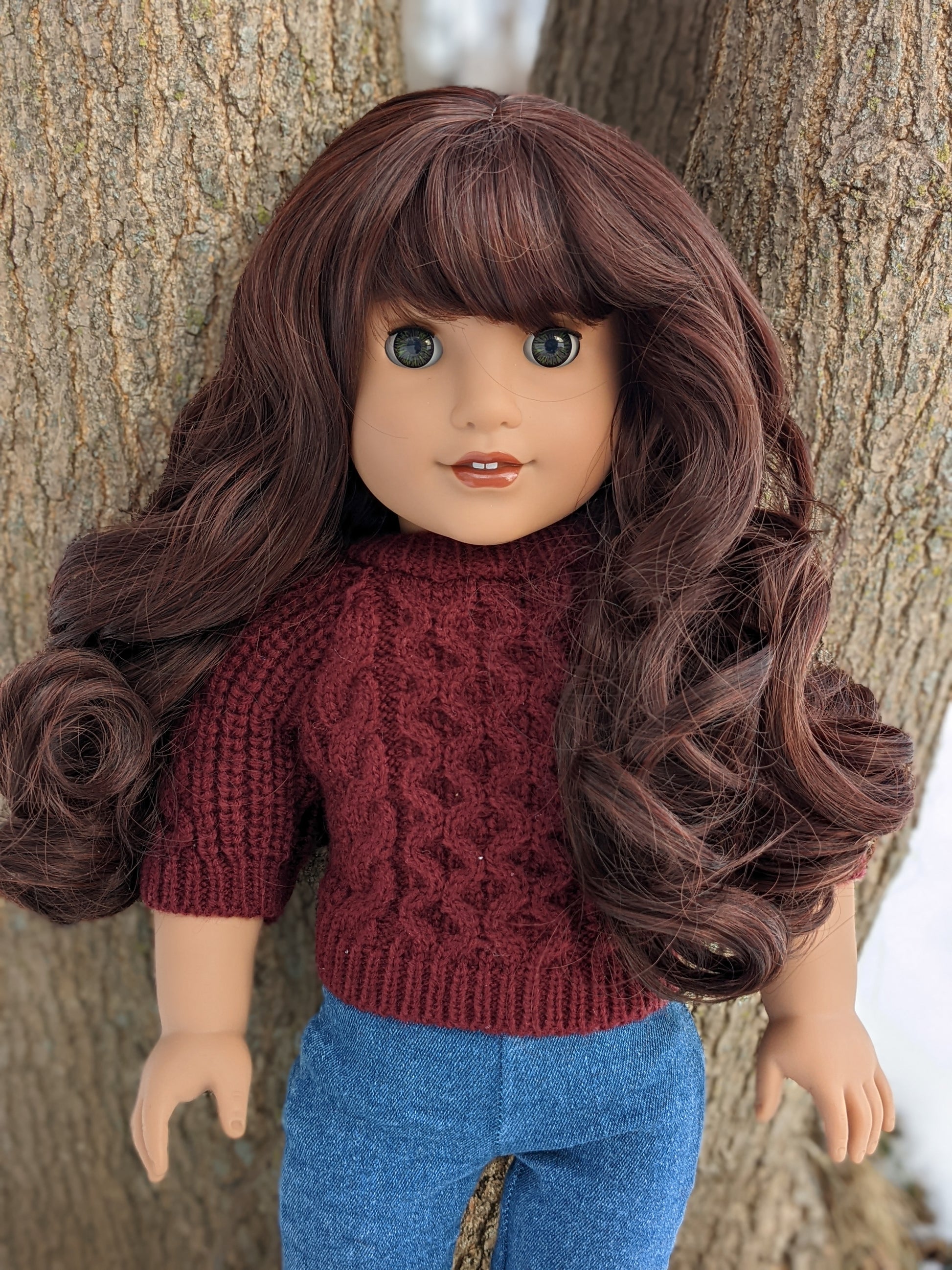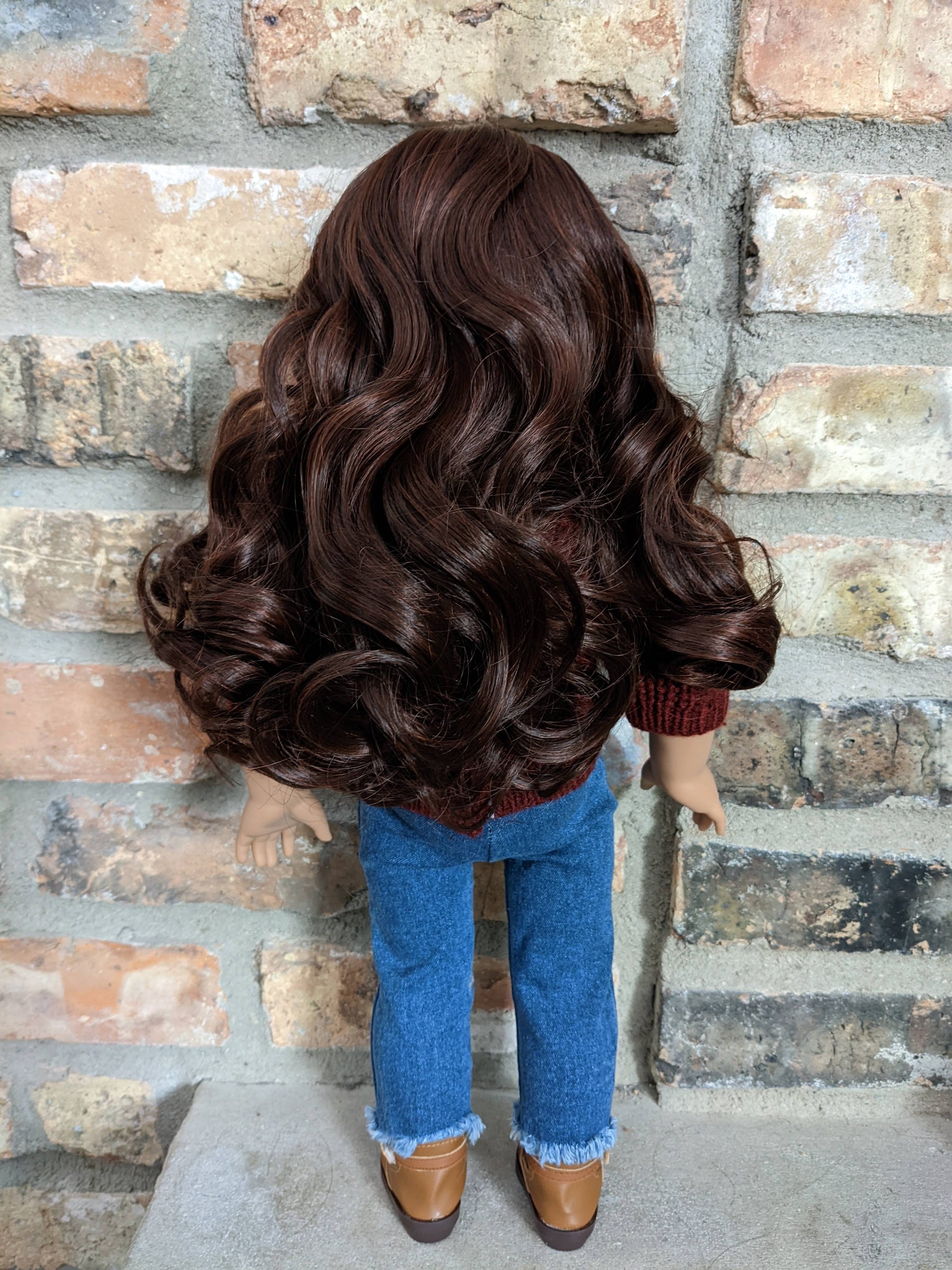 This one of a kind OOAK custom American Girl doll was created with a brand new doll, a reddish dark brown curly wig with bangs, and hazel eyes. She has custom lip gloss, painted and sealed. She may have some minor shine marks from handling. She comes with the outfit pictured. Please let me know if you would like the wig left unattached by leaving a note in the "Order Special Instructions" box upon checkout. For all other orders, I will glue the wig on using a heavy duty permanent adhesive for a strong hold. I can reposition the wig to change the part location if you prefer or I can glue the wig on as close to how its pictured as possible, but slight variations may occur during the gluing process.