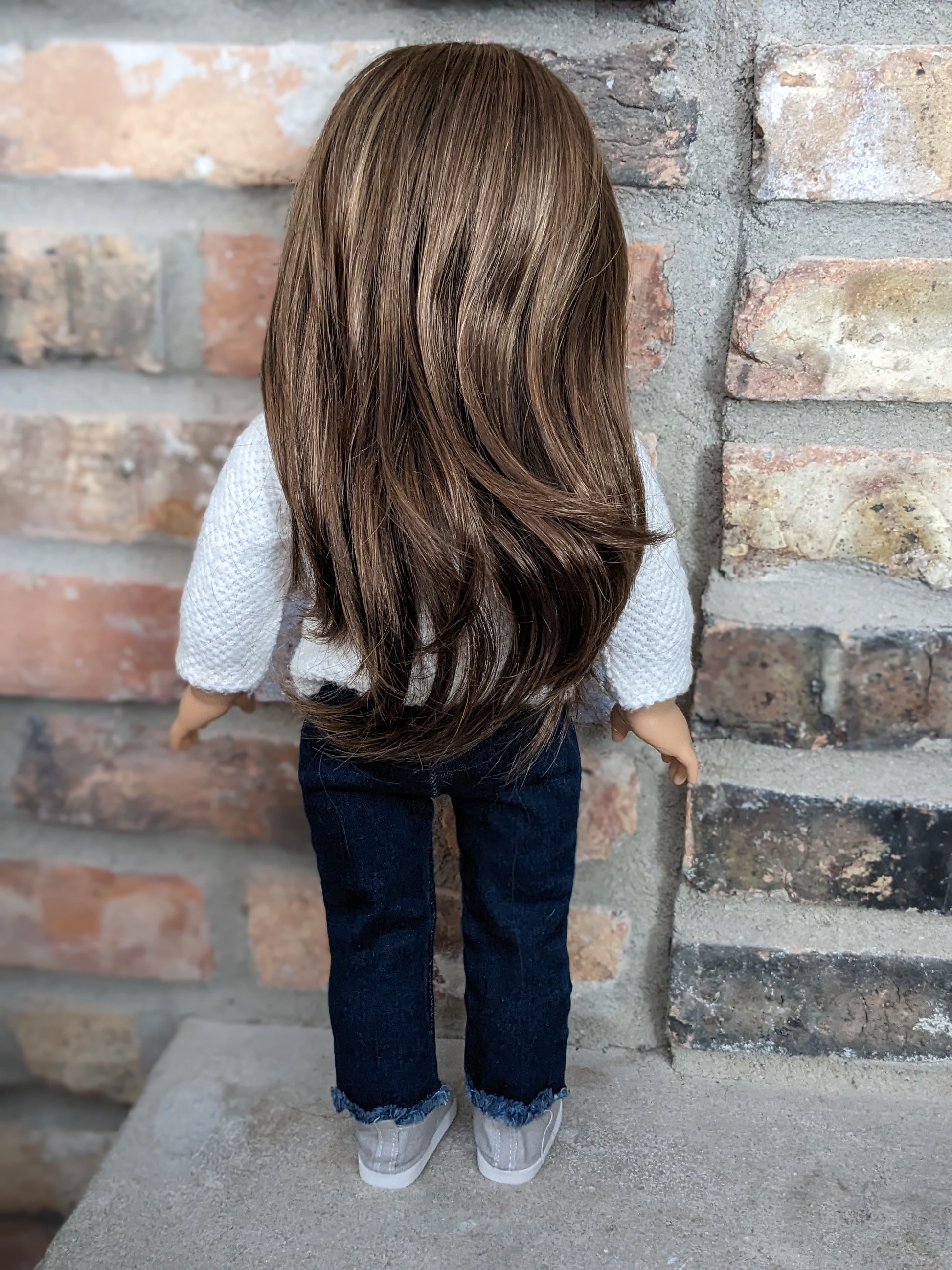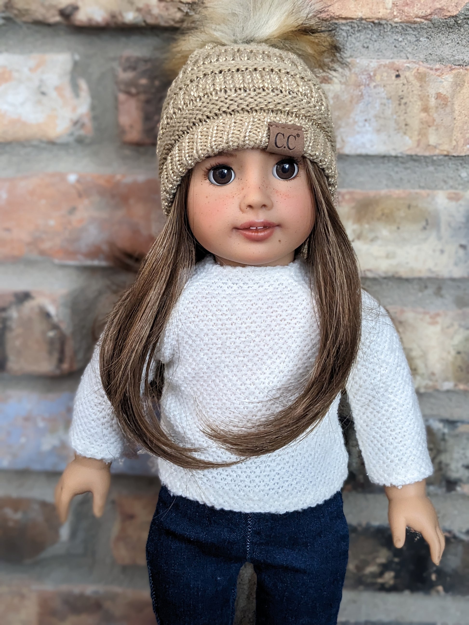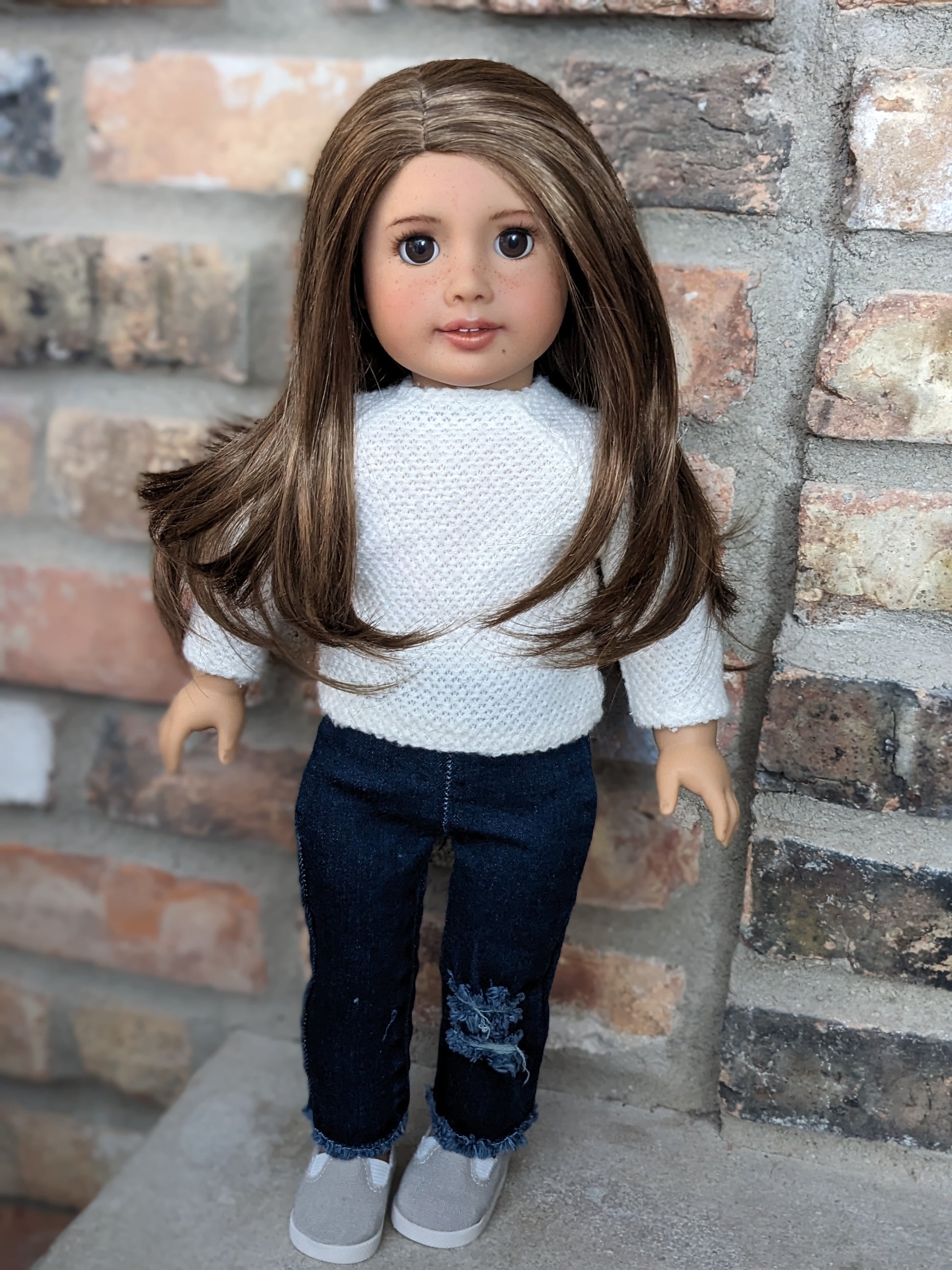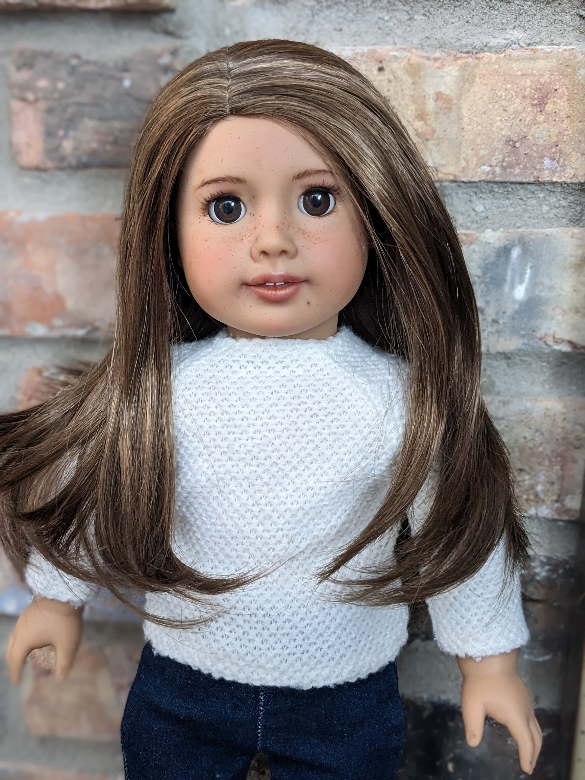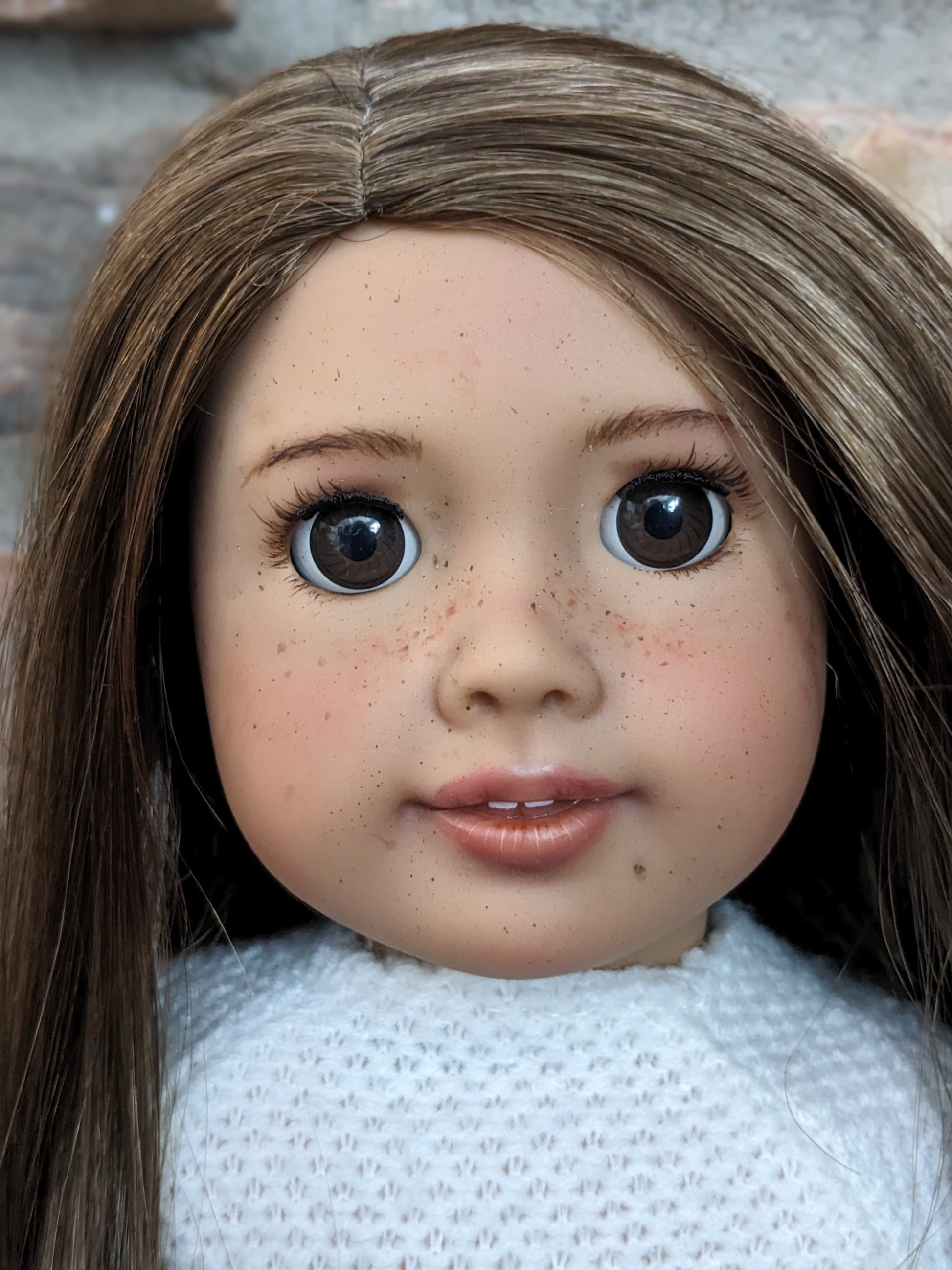 This one of a kind OOAK custom American Girl doll was created from a brand new doll, a golden brown wig from a new Joss doll, and brown eyes. She has a beautiful faceup that was hand painted and sealed by the extremely talented Mary Campa of SashaLi on Etsy. She may have some minor shine marks from handling. She comes with the outfit pictured.