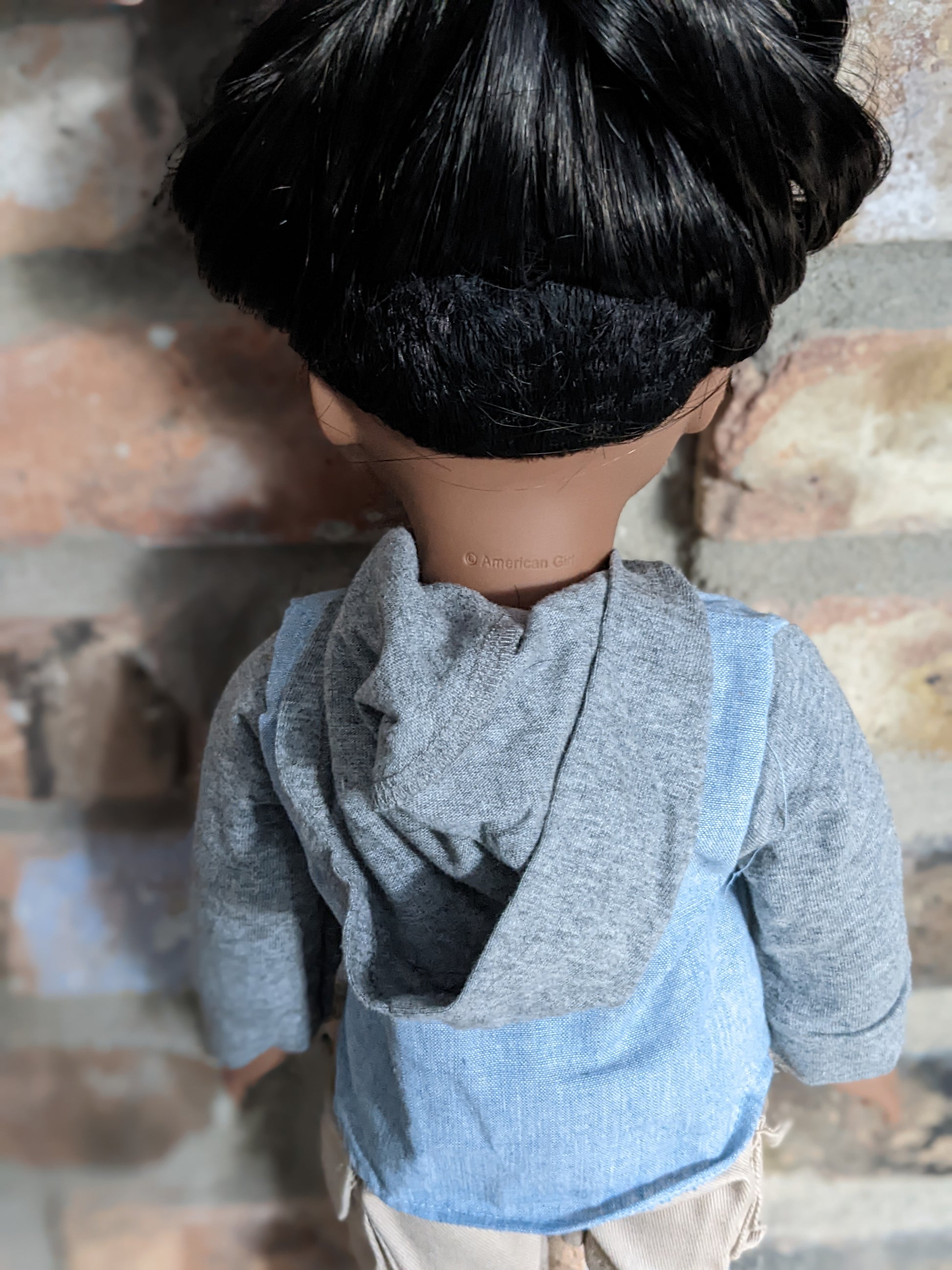 This one of a kind OOAK custom boy American Girl doll was created with a new TM 77 doll, amber eyes, and a new black wig. The doll is in great condition, though he may have some minor shine marks from handling. I have replaced his zip tie with neck strings. He comes with the outfit and shoes pictured.