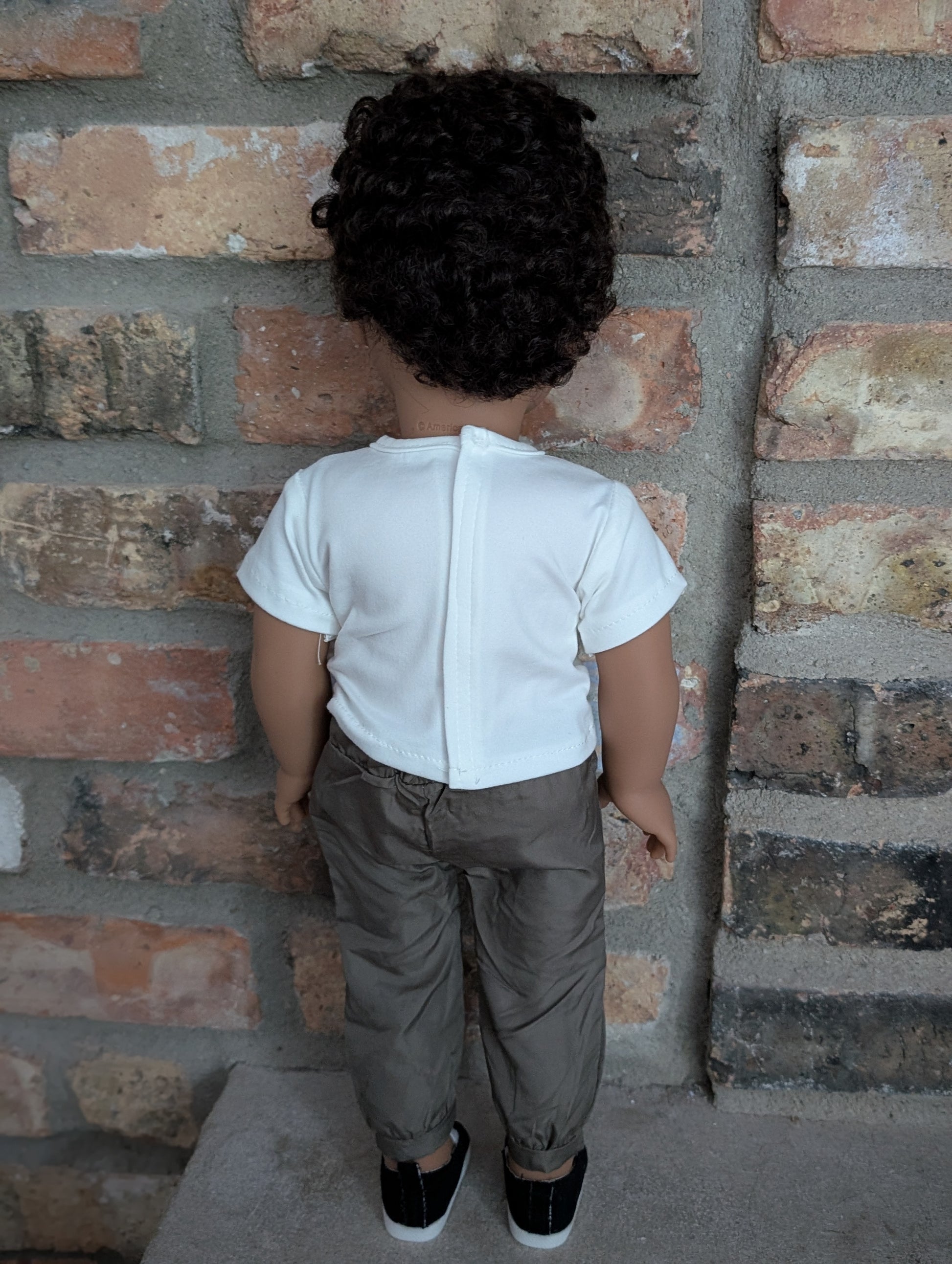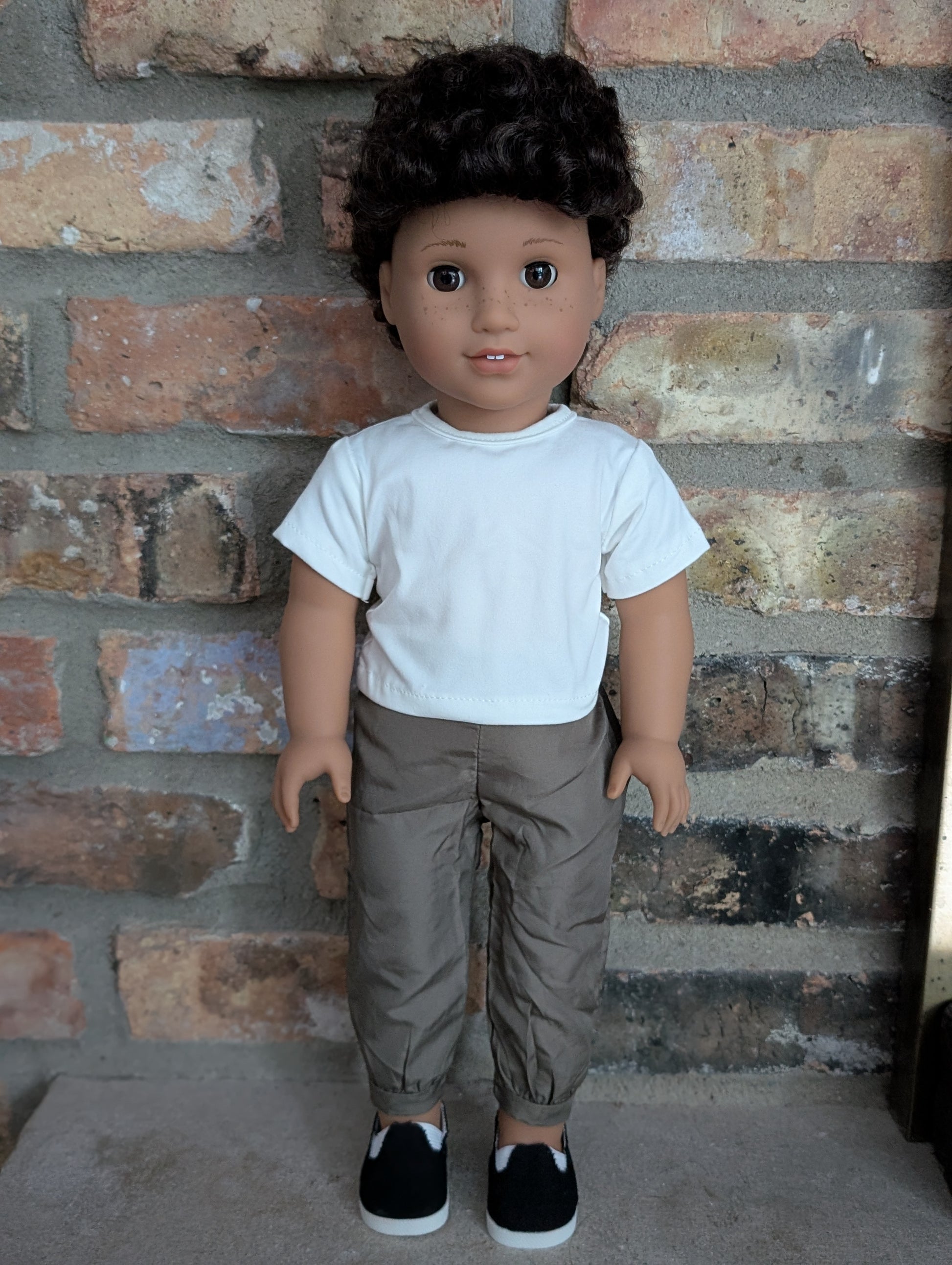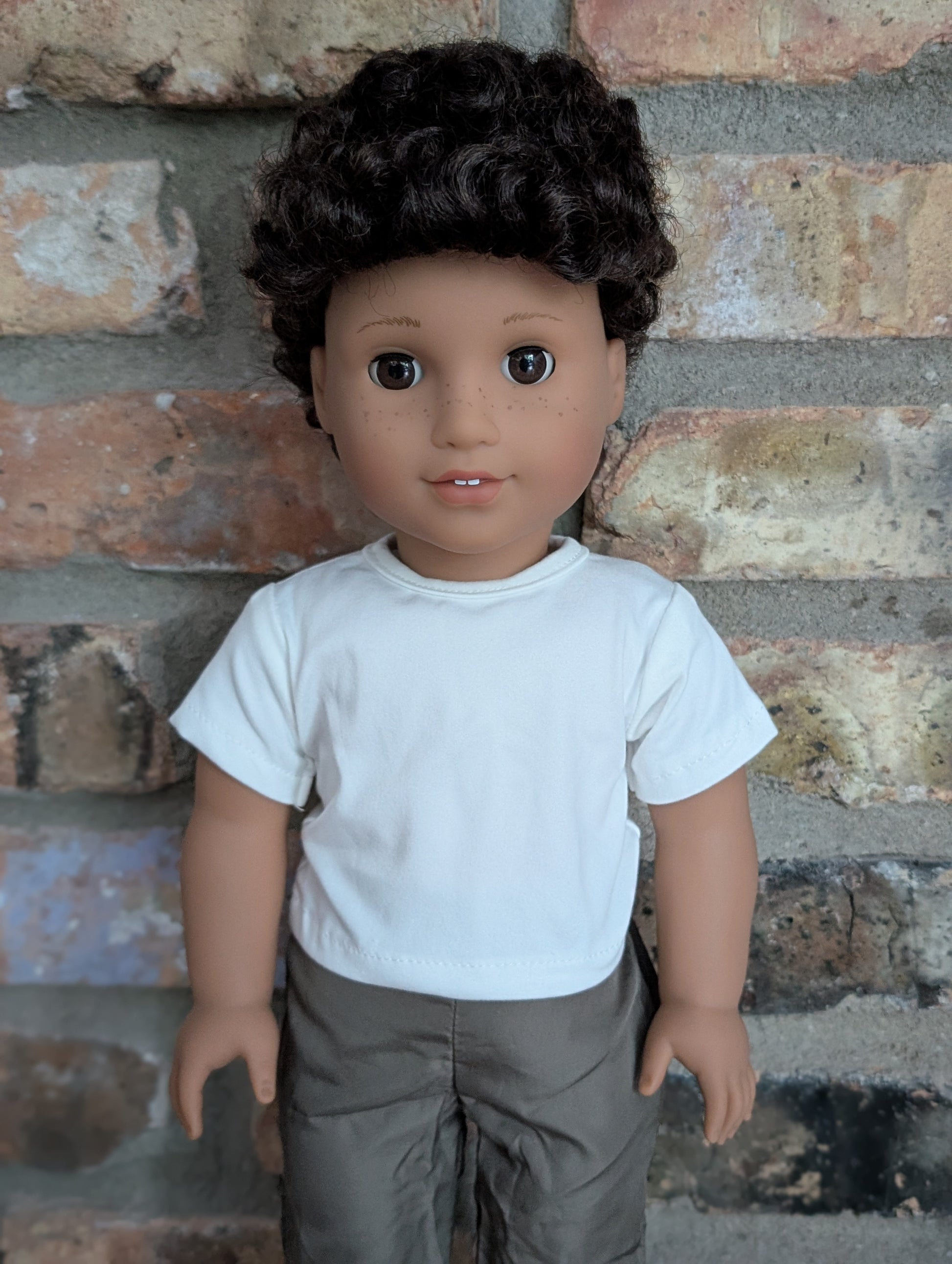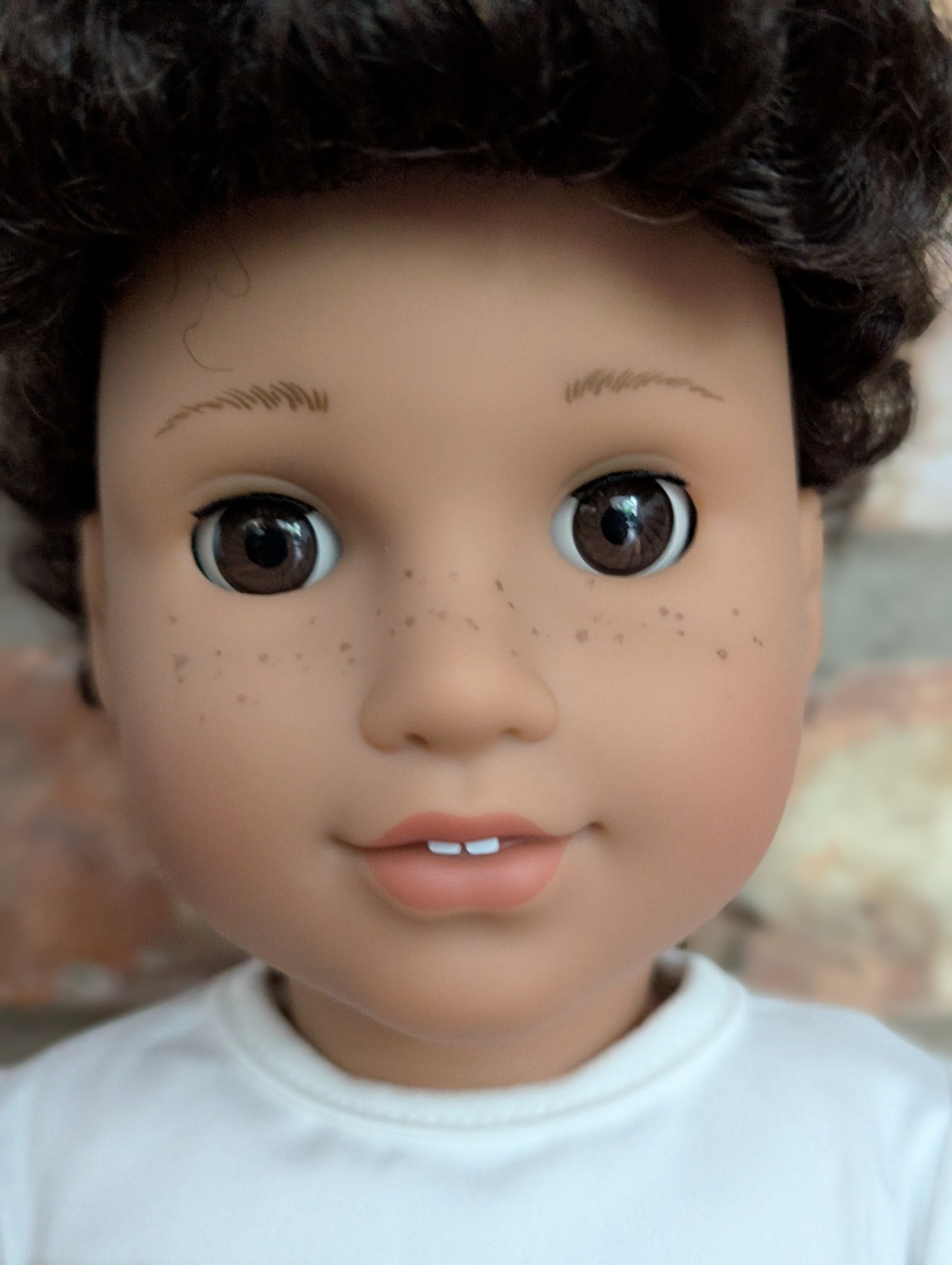 This one of a kind OOAK custom boy American Girl doll was created with a brand new doll, a dark brown wig, and brown eyes. He has freckles that were hand painted and sealed. He may have some minor shine marks from handling. He comes with the outfit pictured.