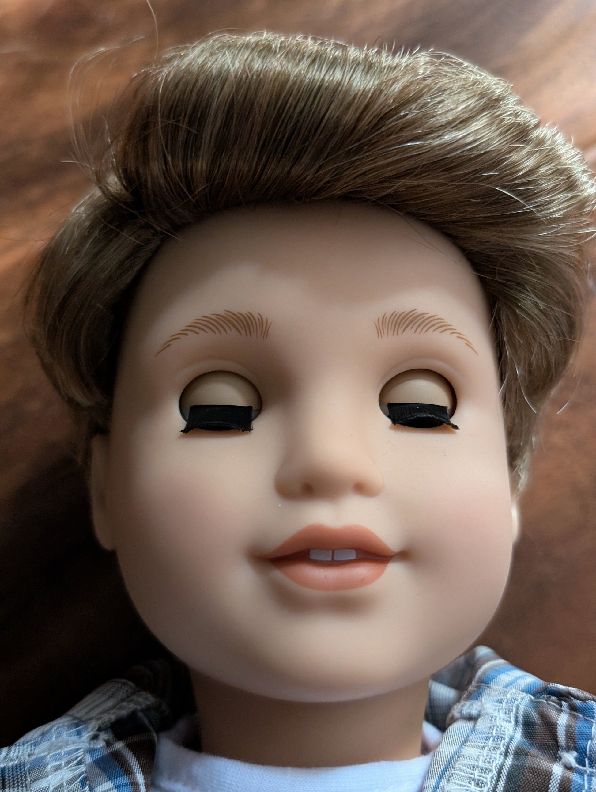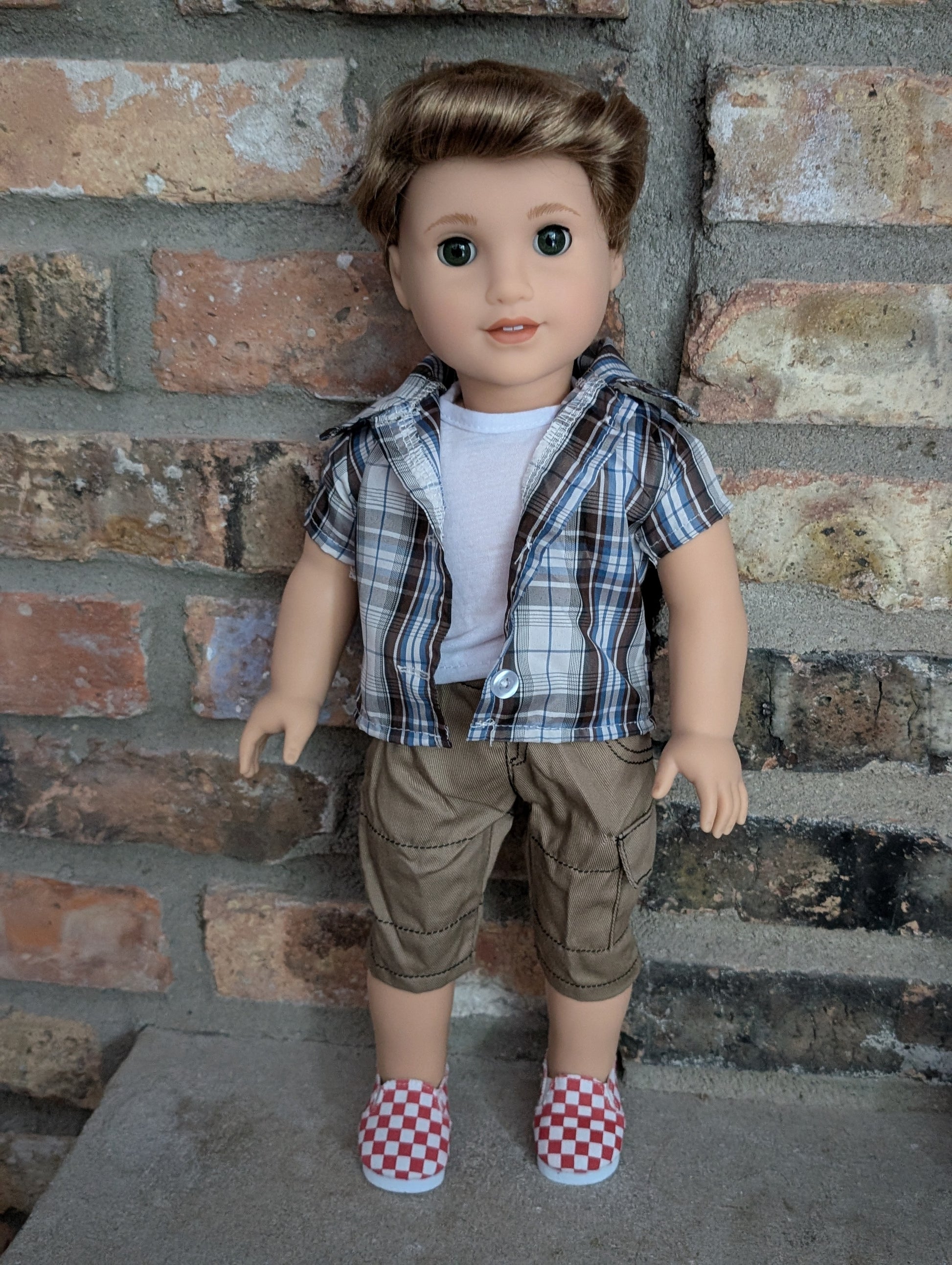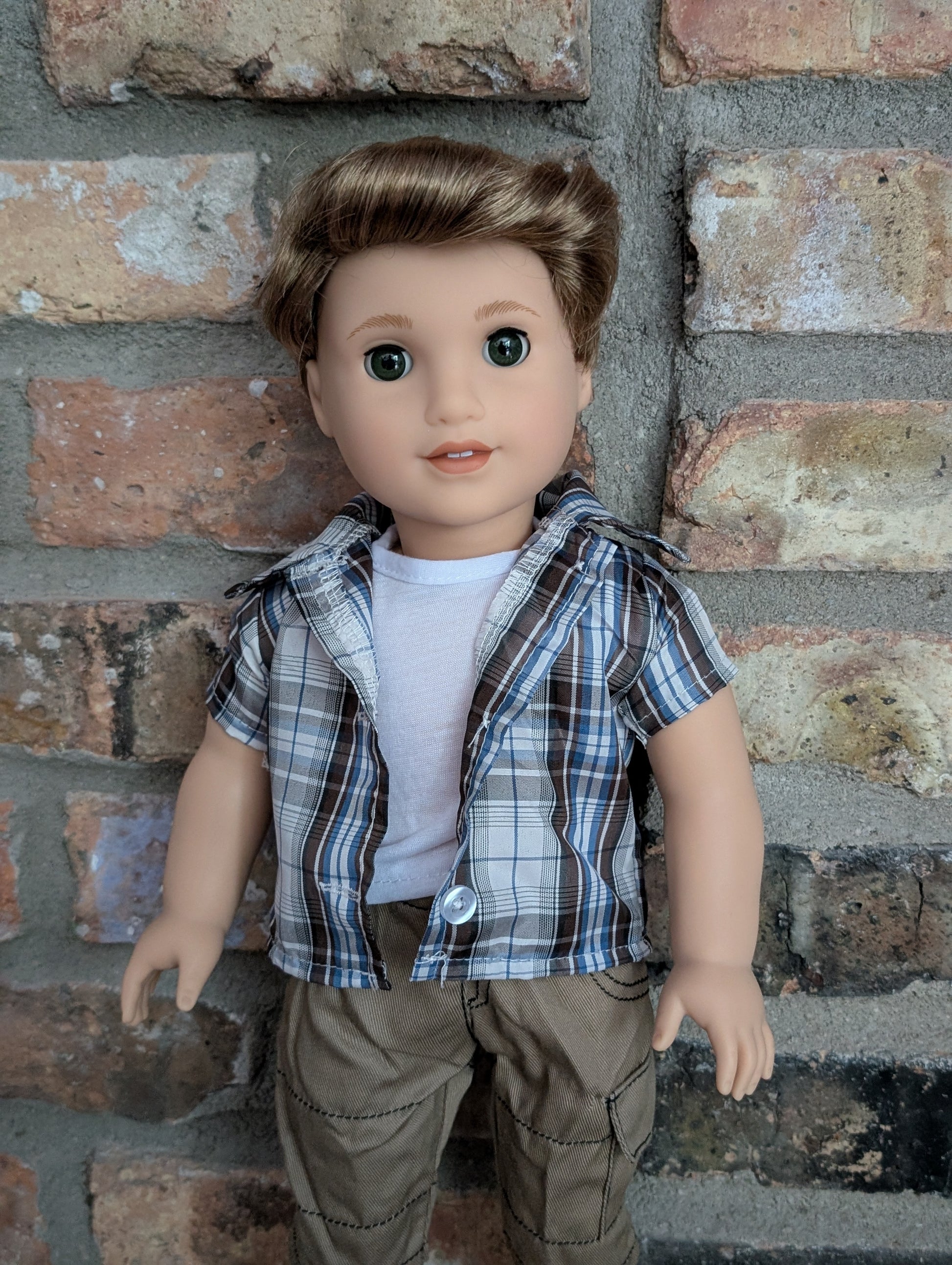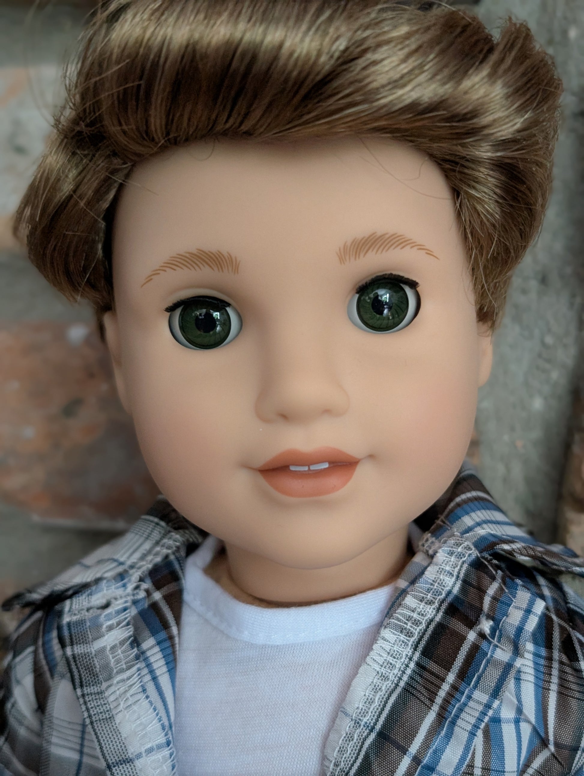 This one of a kind OOAK custom boy American Girl doll was created with a brand new doll, a blonde wig, and green eyes. He may have some minor shine marks from handling. He comes with the outfit pictured.