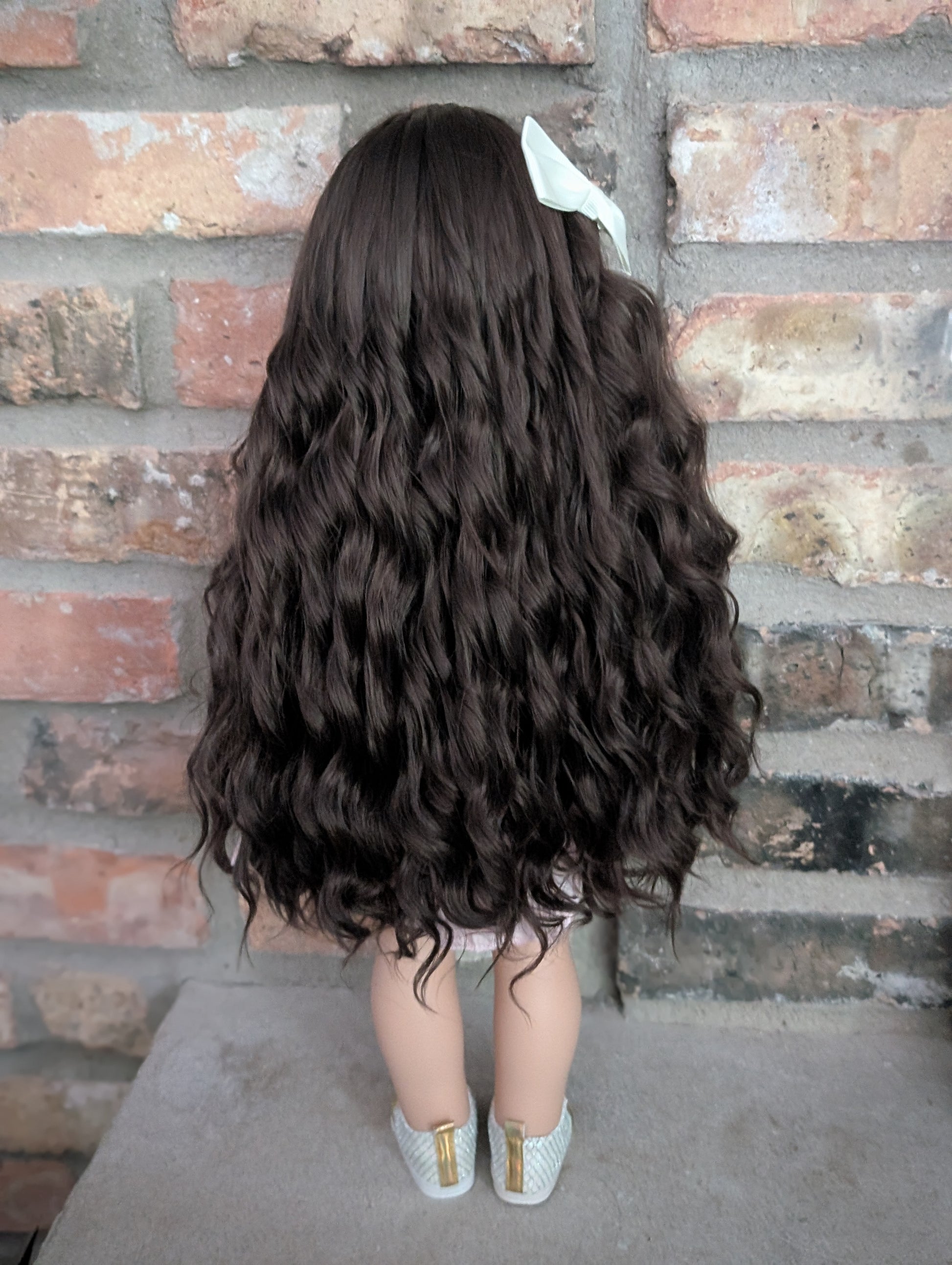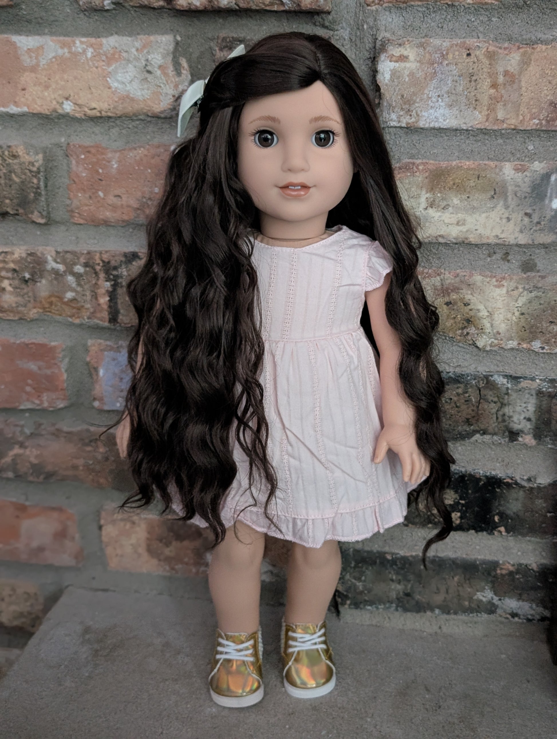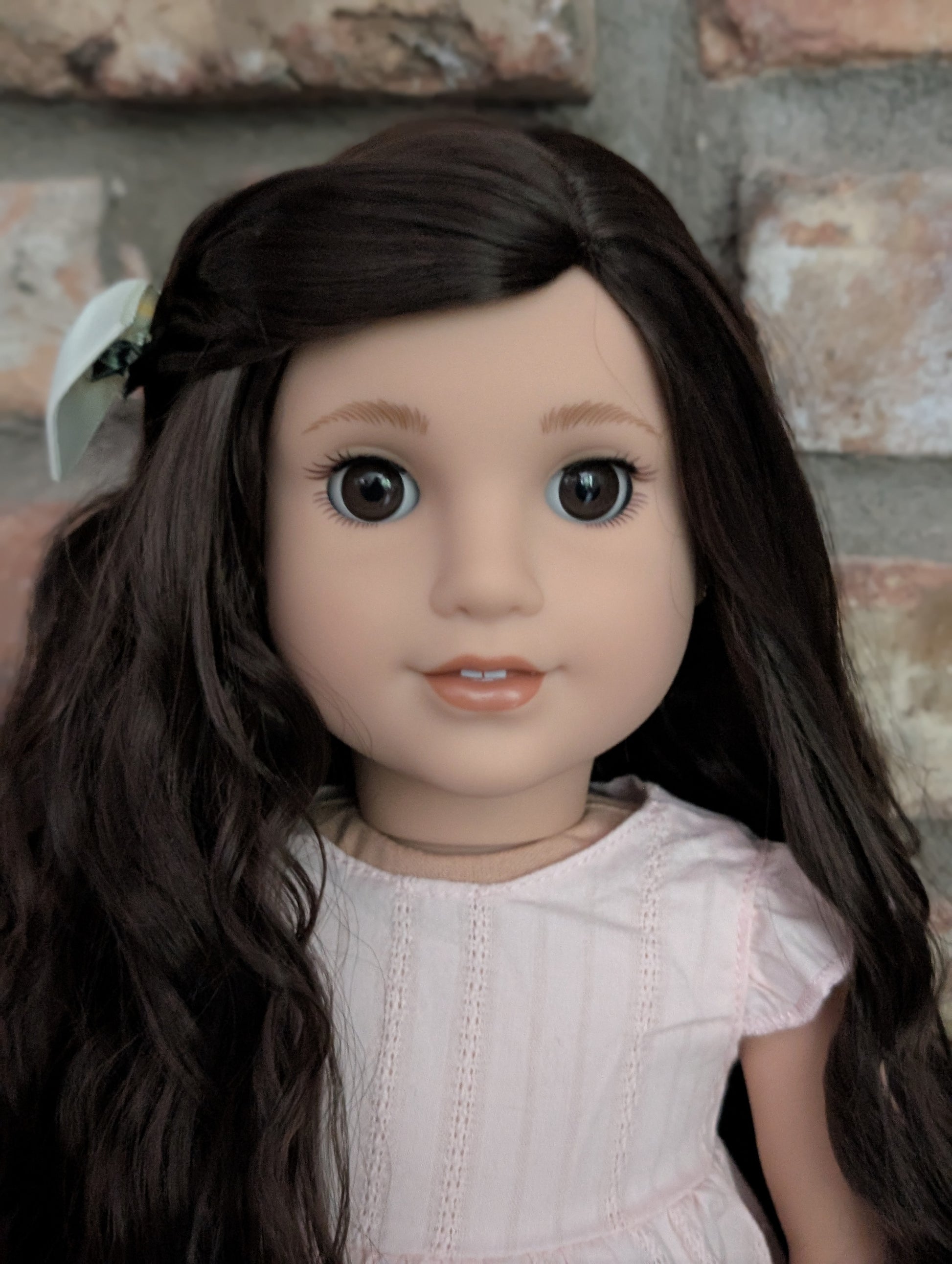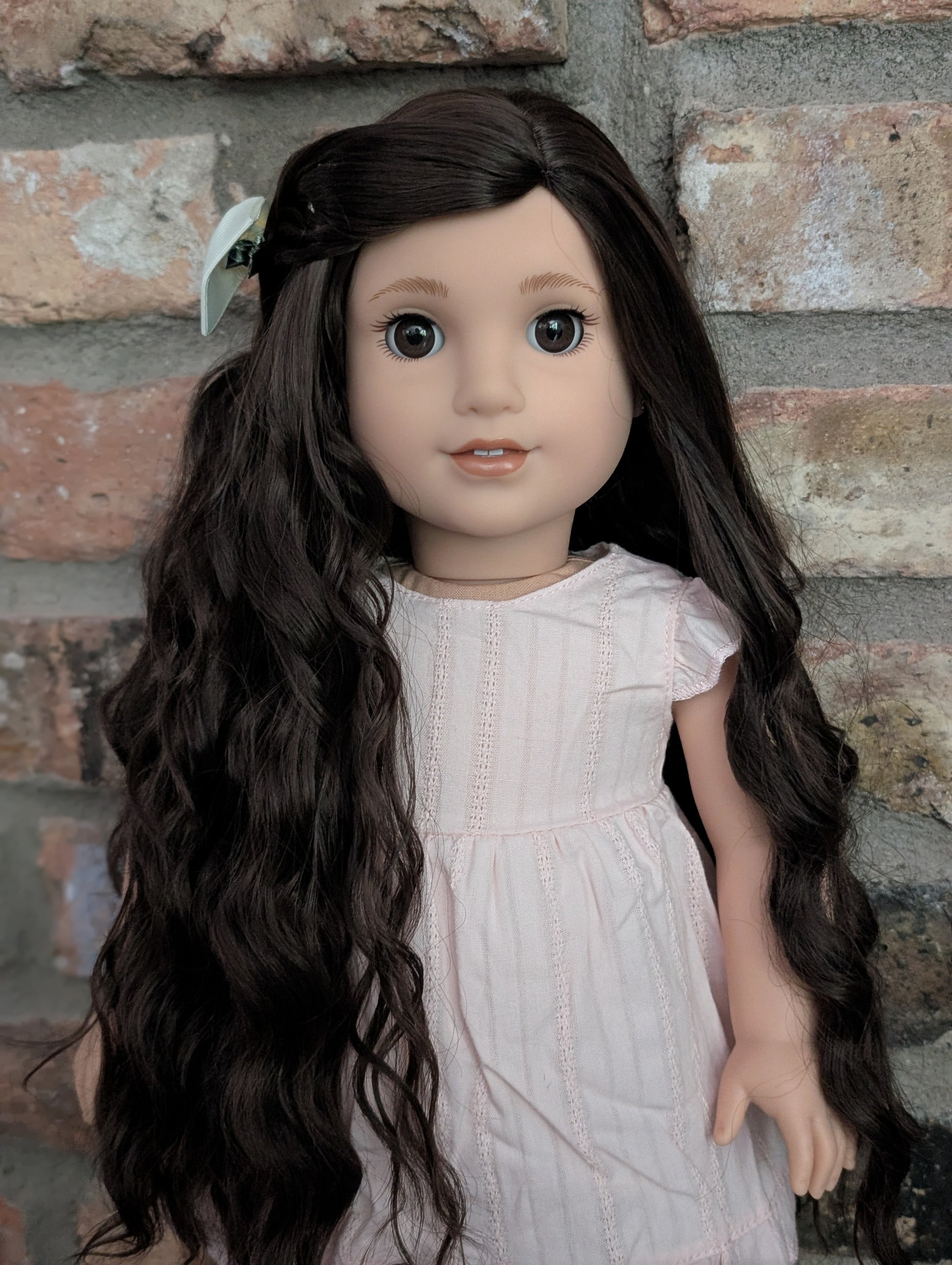 This one of a kind OOAK custom American Girl doll was created with a brand new doll, a brown wig, and brown eyes. She has lip gloss that was hand painted and sealed. She may have some minor shine marks from handling. She comes with the outfit pictured. Her ears are pierced with American Girl doll sized earrings.