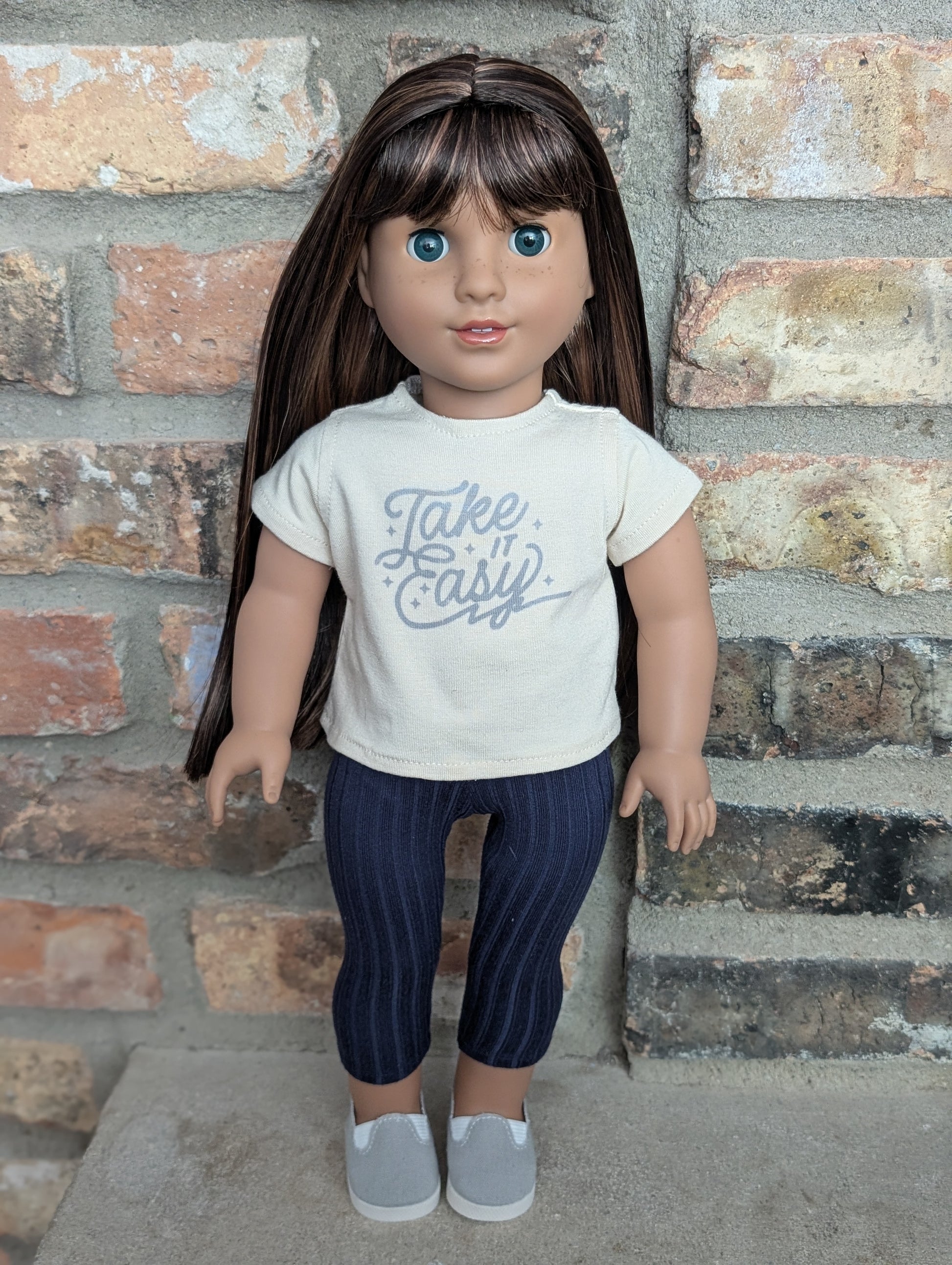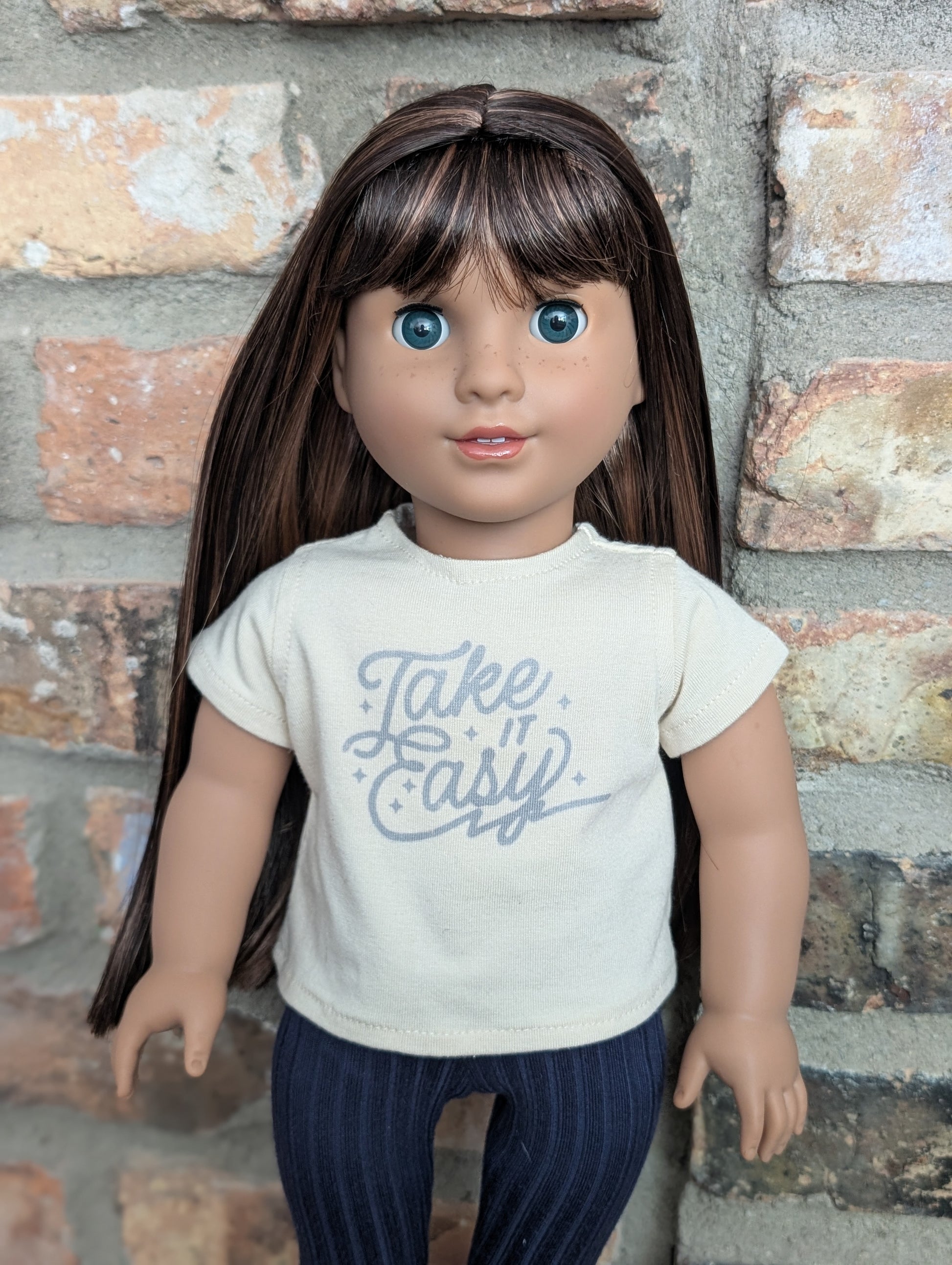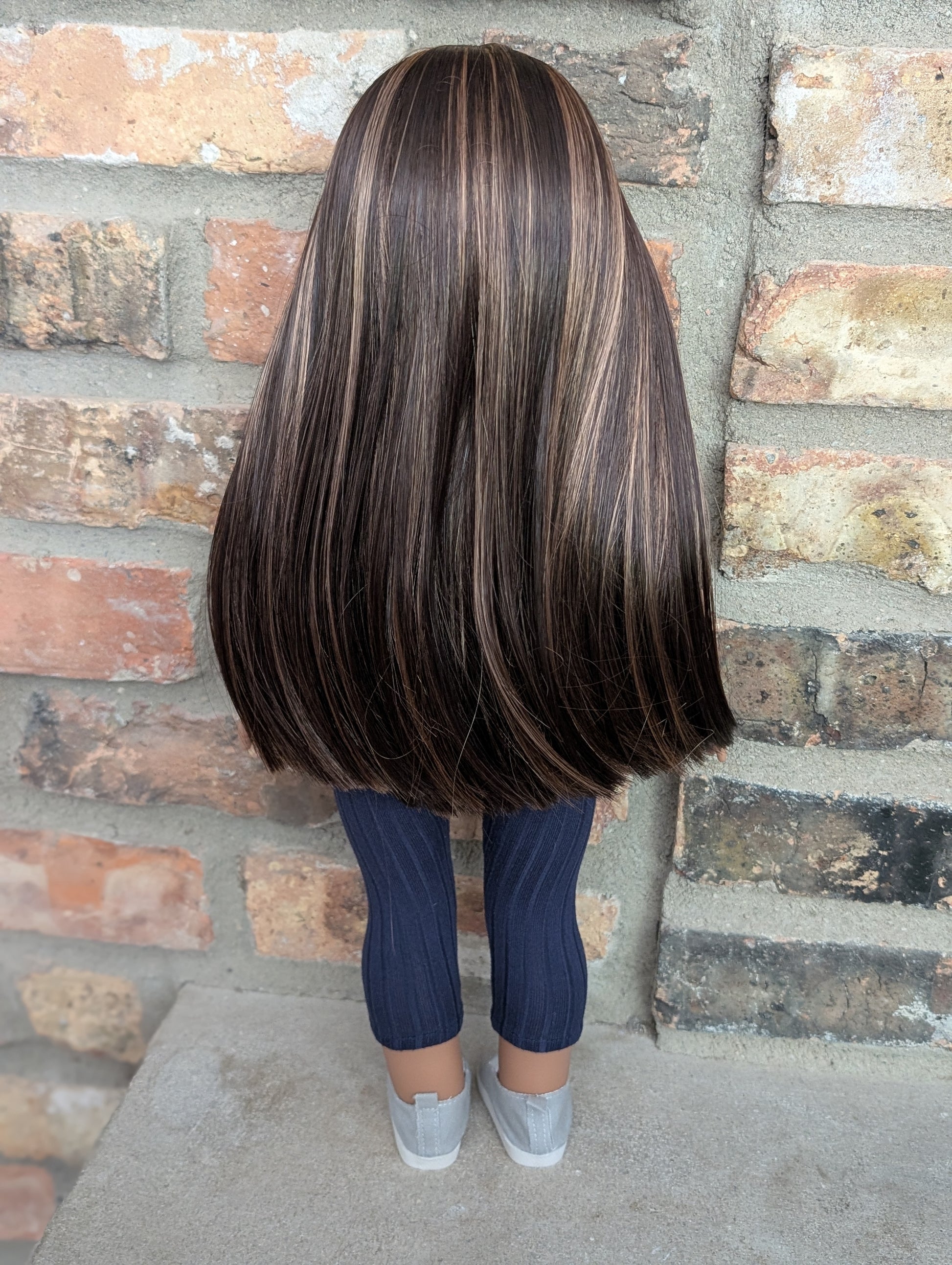 This one of a kind OOAK custom American Girl doll was created with a brand new doll, a brown wig, and dark blue eyes. She has lip gloss and freckles that were hand painted and sealed. She may have some minor shine marks from handling. She comes with the outfit pictured.