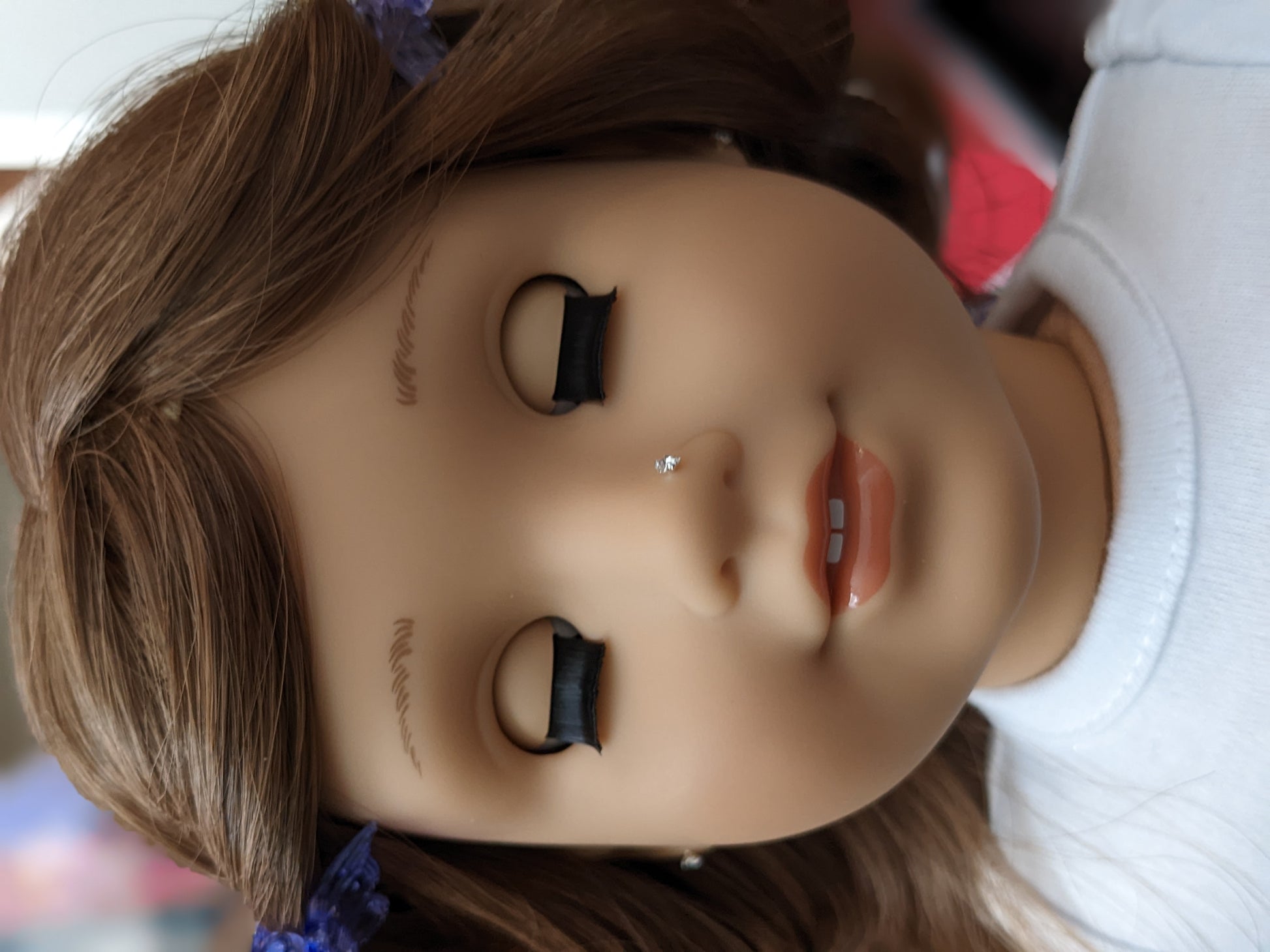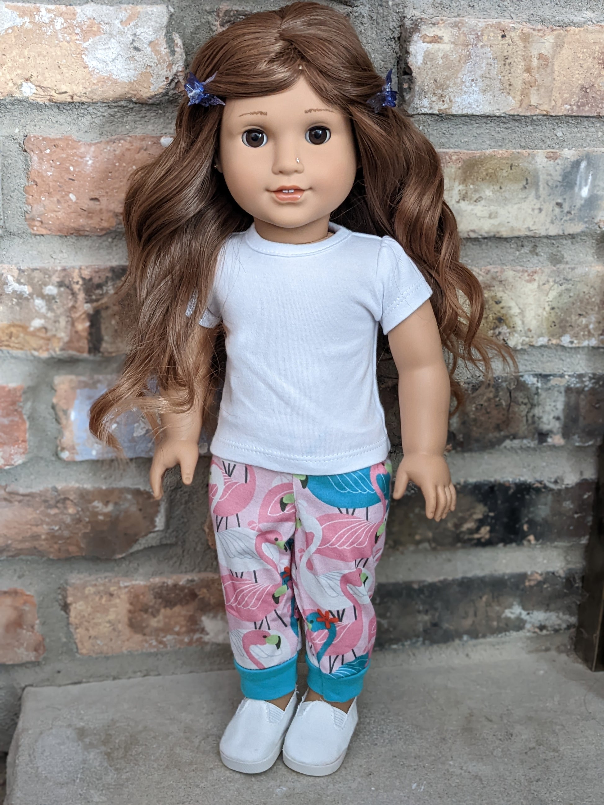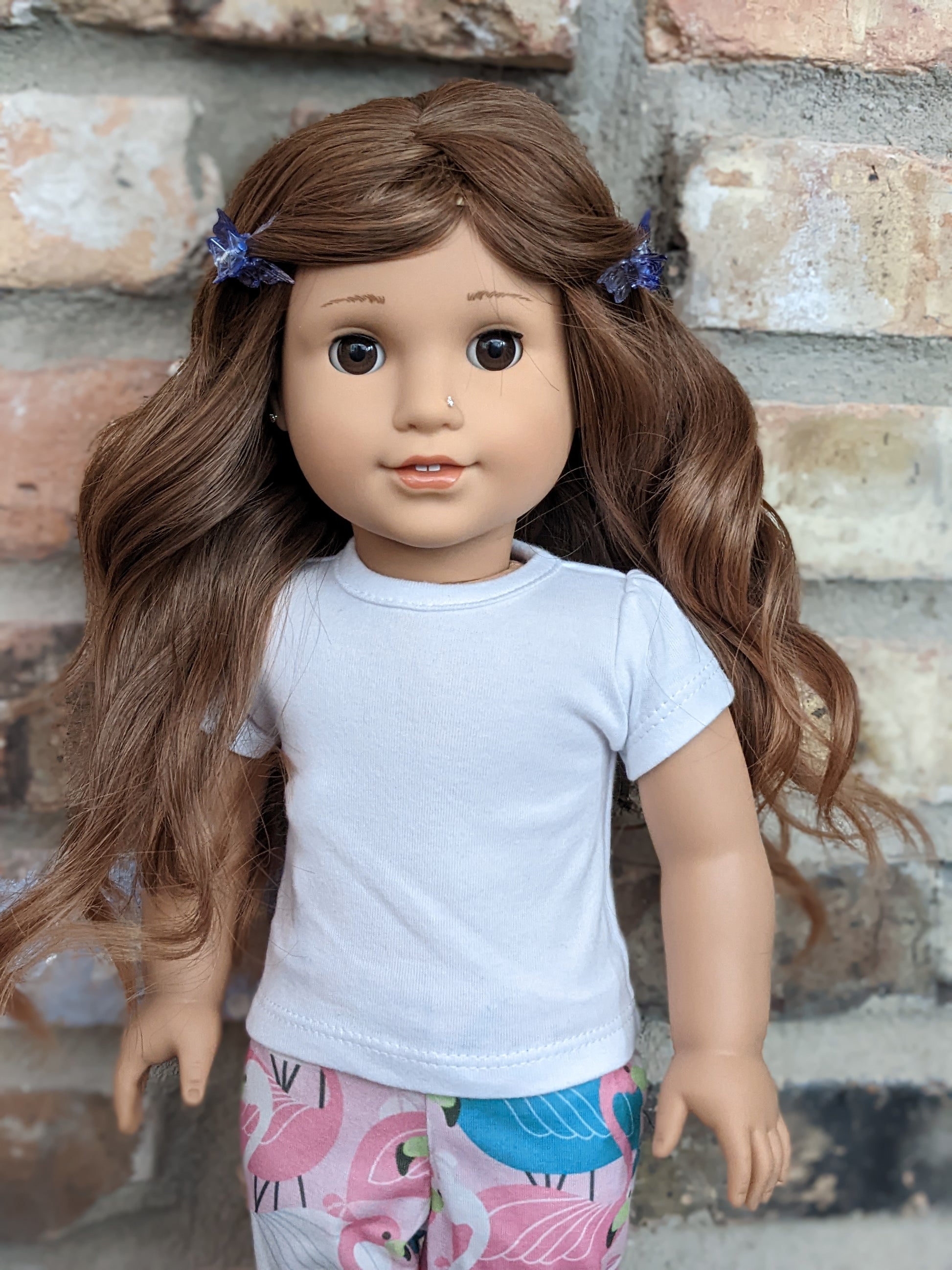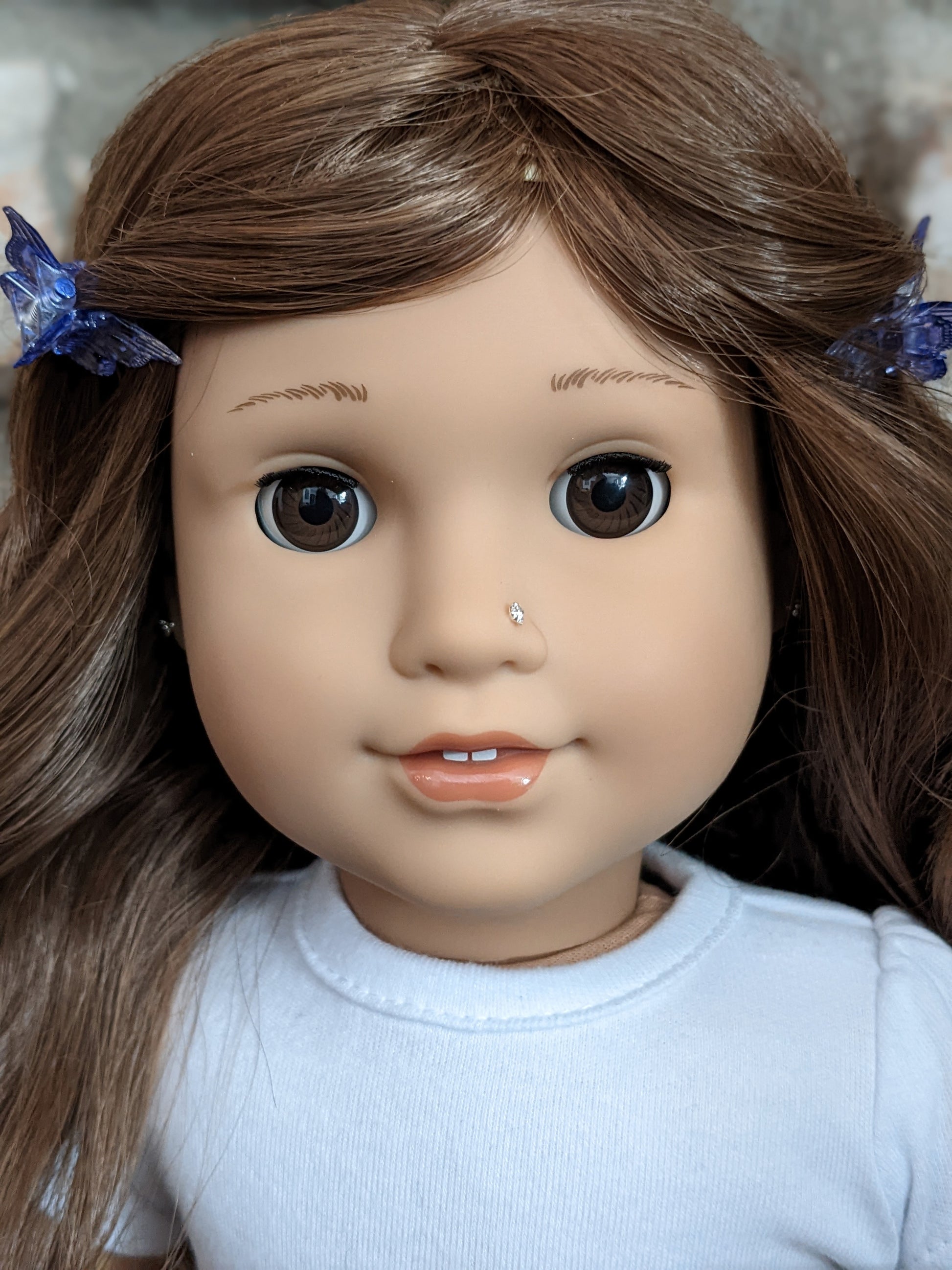 This one of a kind OOAK custom American Girl doll was created with a brand new TM doll, a brown wig, and brown eyes. She has lip gloss that was hand painted and sealed. She may have some minor shine marks from handling. She comes with the outfit pictured. Her nose and ears are pierced with normal earrings and the tiny diamond look studs are included.