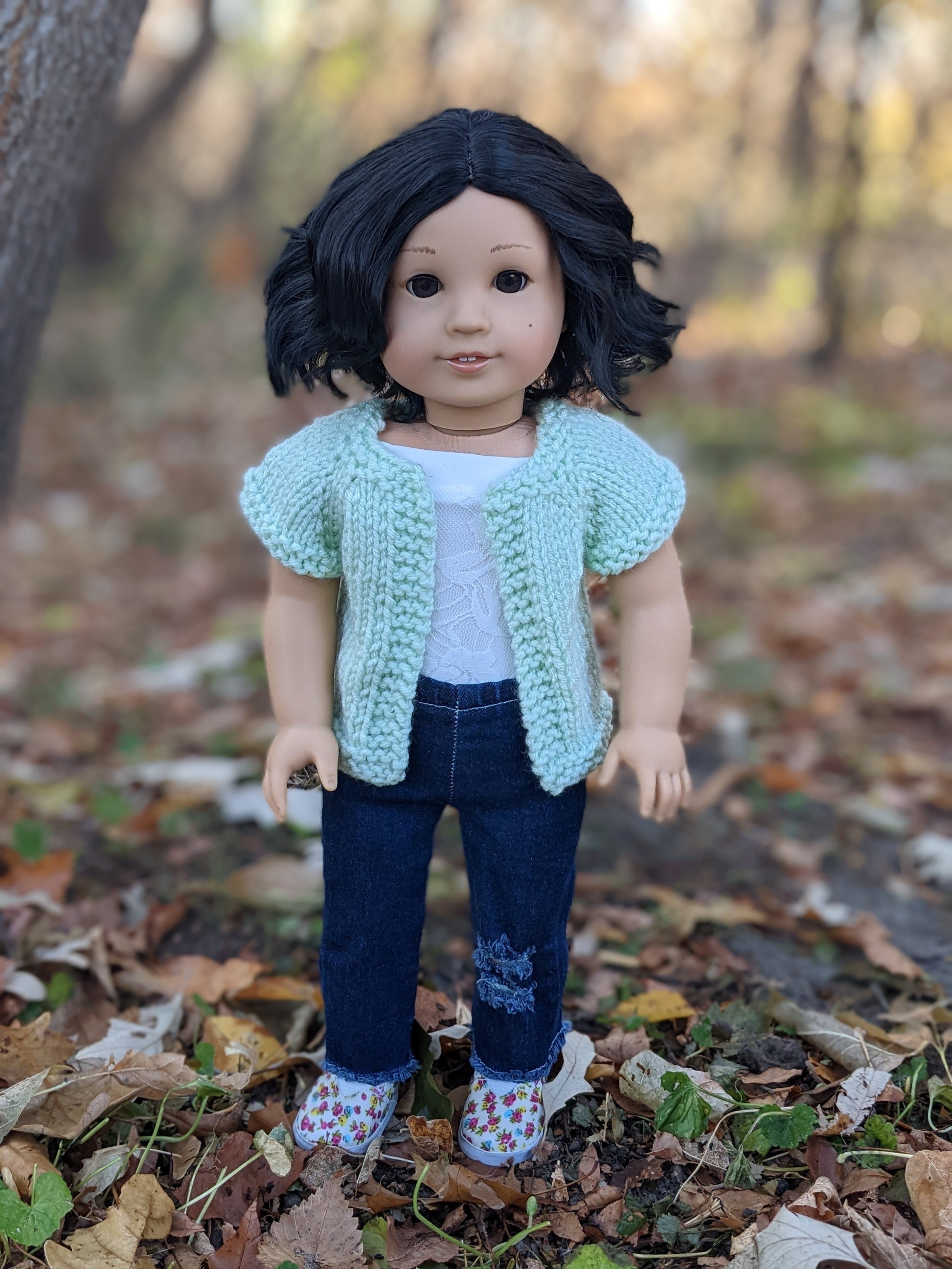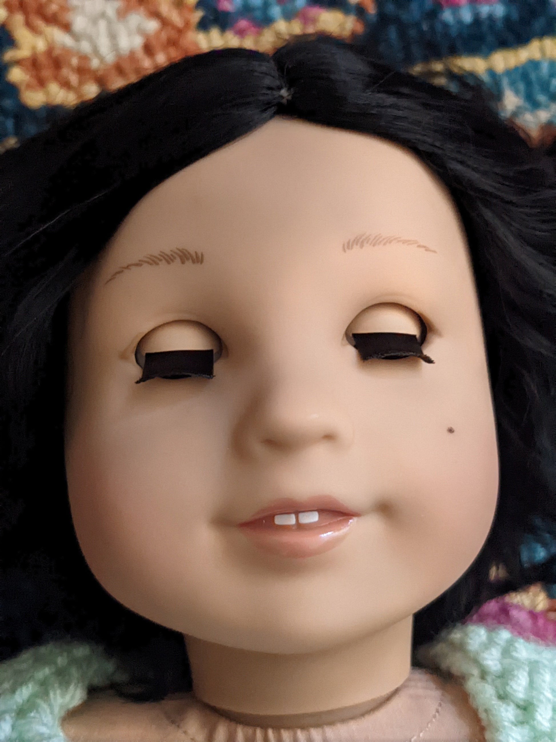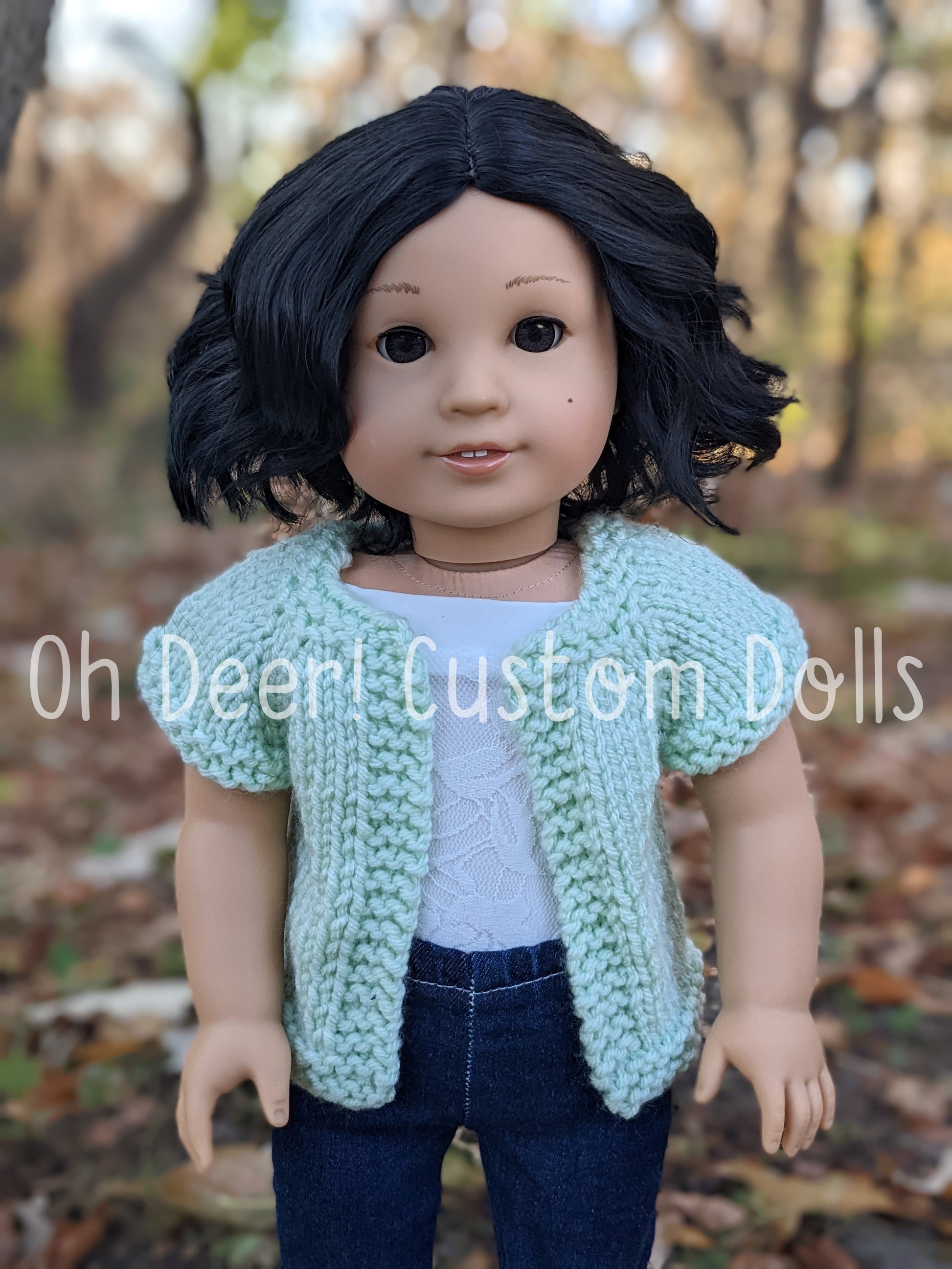 Grey was created with a brand new Truly Me doll, a black wavy wig, and brown decal eyes from a Samantha doll. She has lip gloss and a beauty mark that was hand painted and sealed. She may have some minor shine marks from handling. She comes with the outfit pictured. She has the microfiber cloth body.