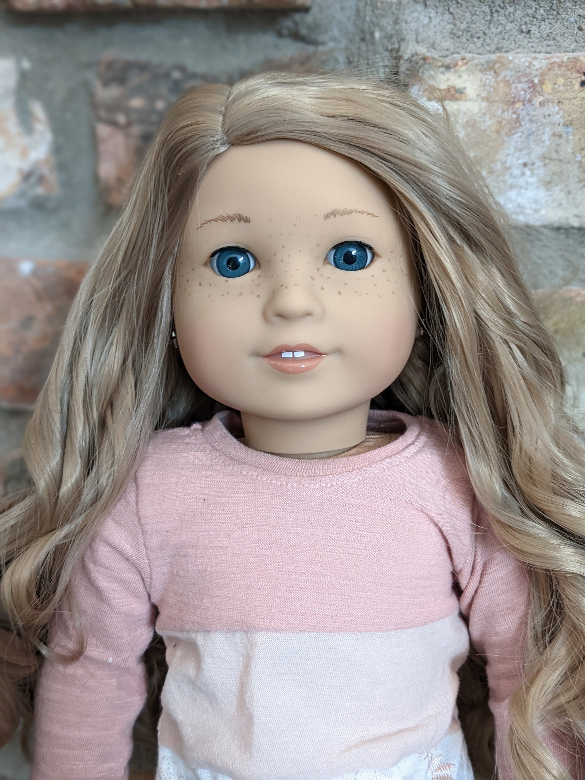 Marceline was created with a brand new Truly Me doll, a blonde curly wig, and blue eyes. She has lip gloss and freckles that were hand painted and sealed. She may have some minor shine marks from handling. She comes with the outfit pictured. Her ears are pierced by American Girl and the earrings pictured are included.