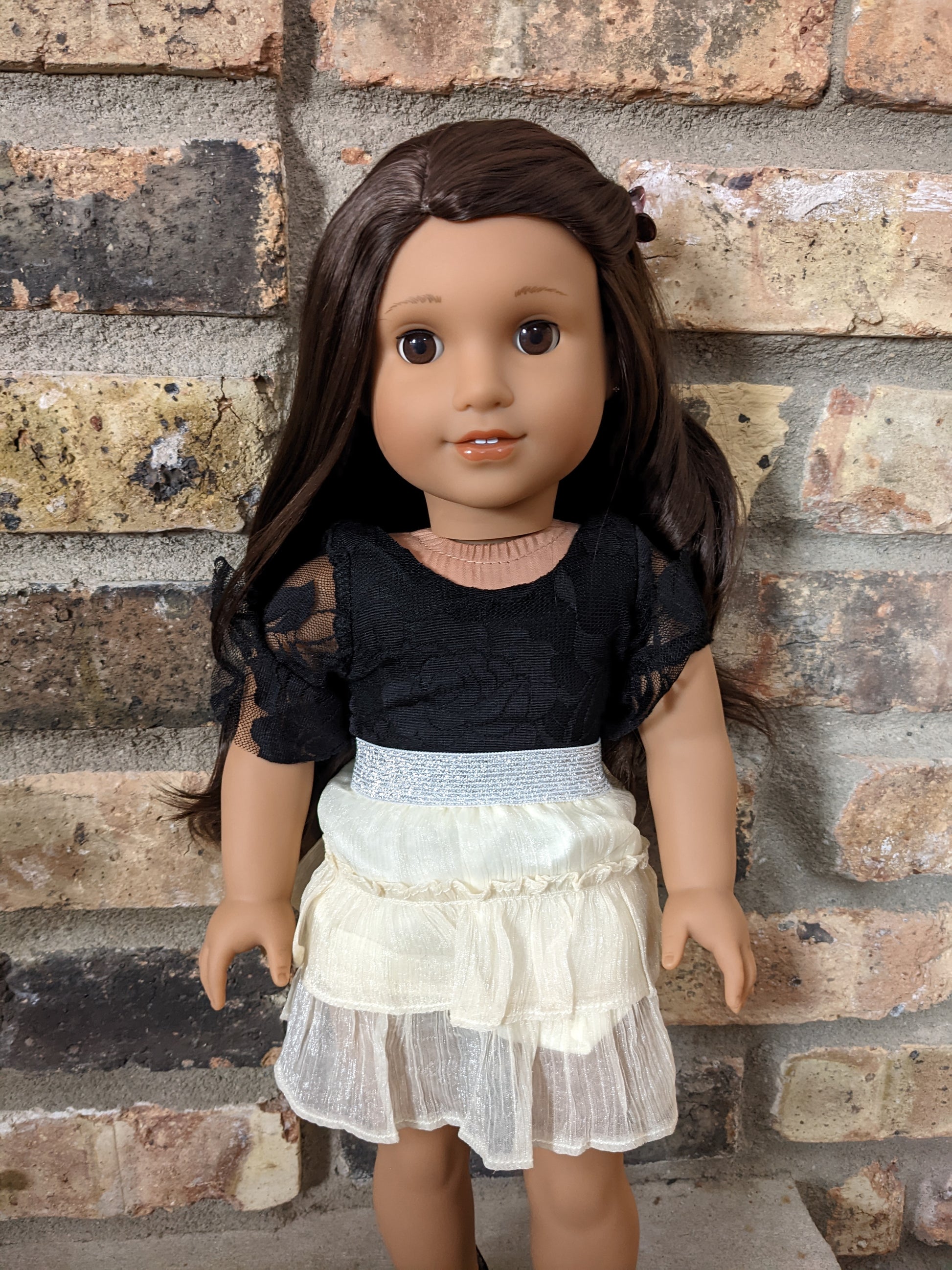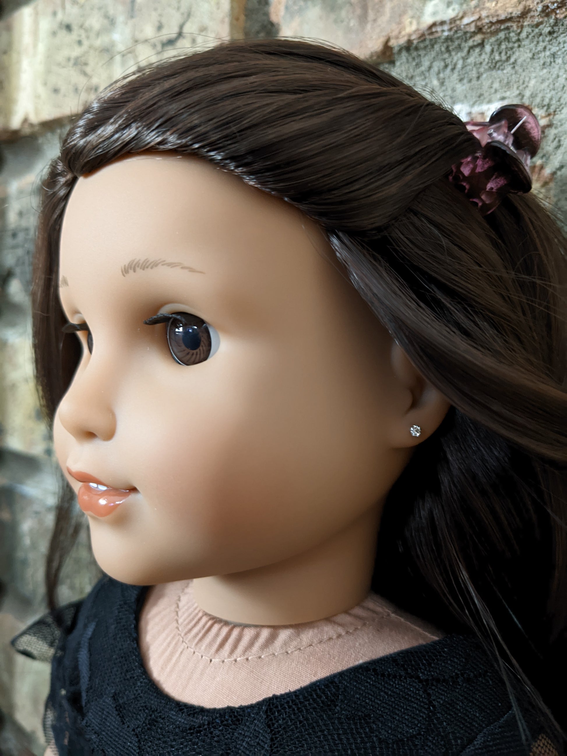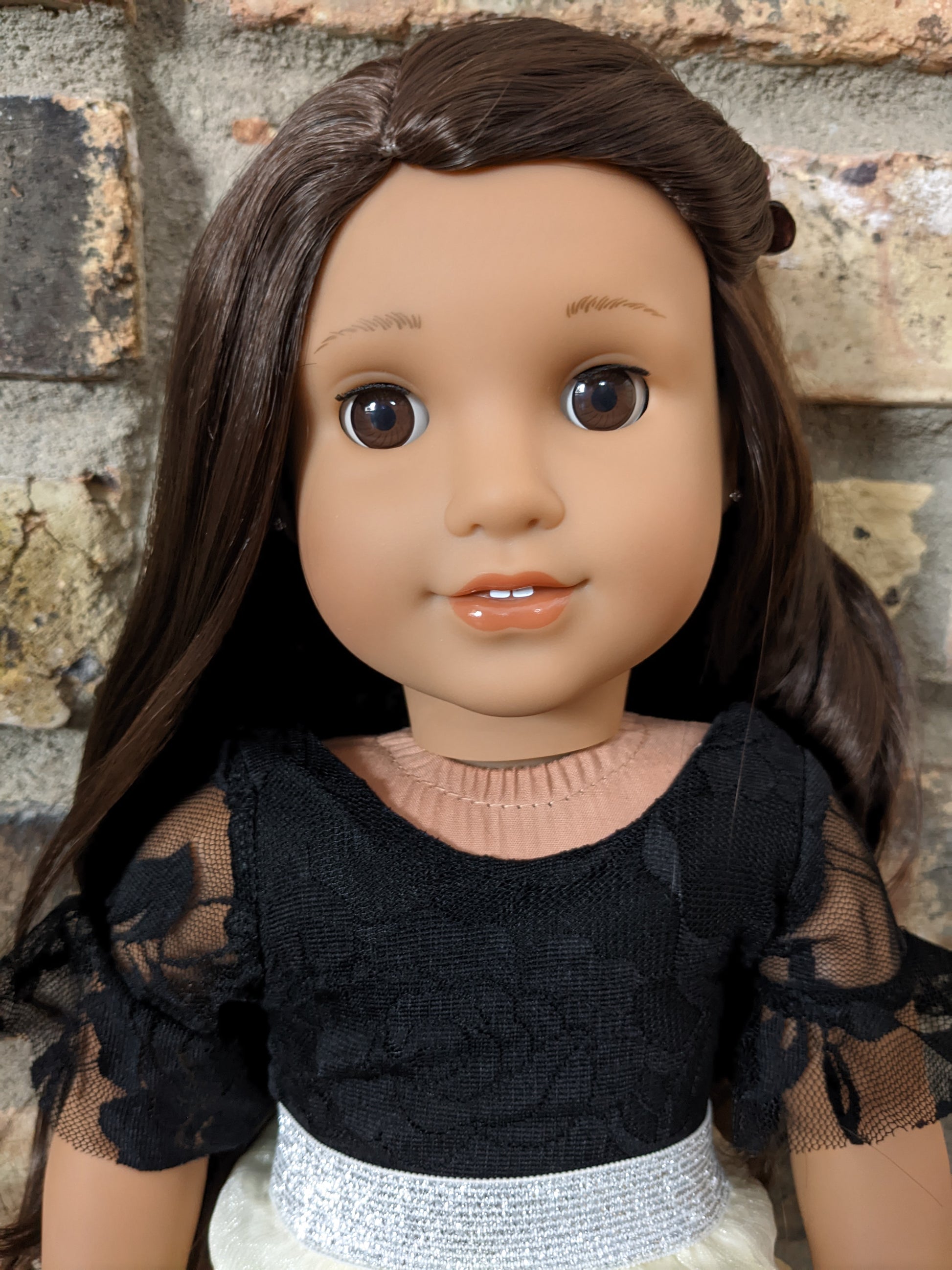 This one of a kind OOAK custom American Girl doll was created with a brand new Truly Me doll, a dark brown wig, and brown eyes. She has lip gloss that was hand painted and sealed. She may have some minor shine marks from handling. She comes with the outfit pictured. Her ears are pierced with normal earrings and the tiny diamond look studs are included.