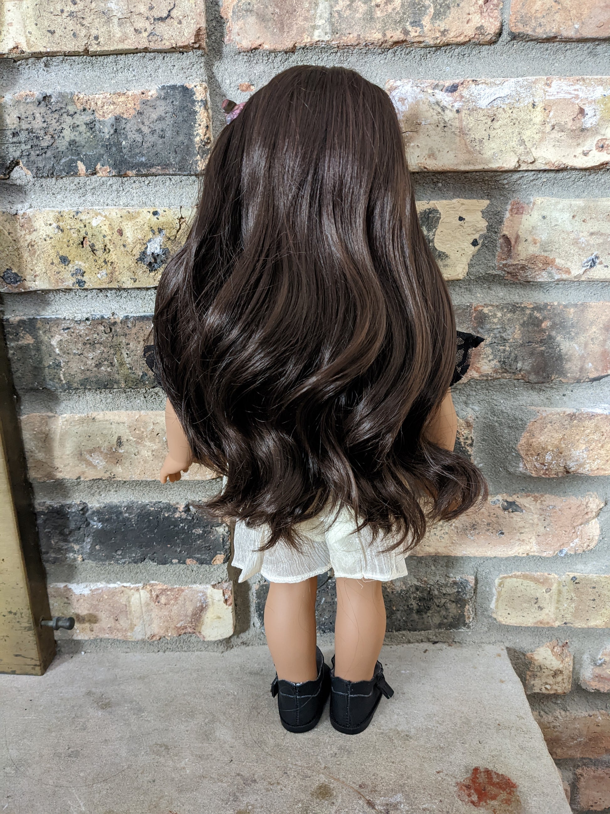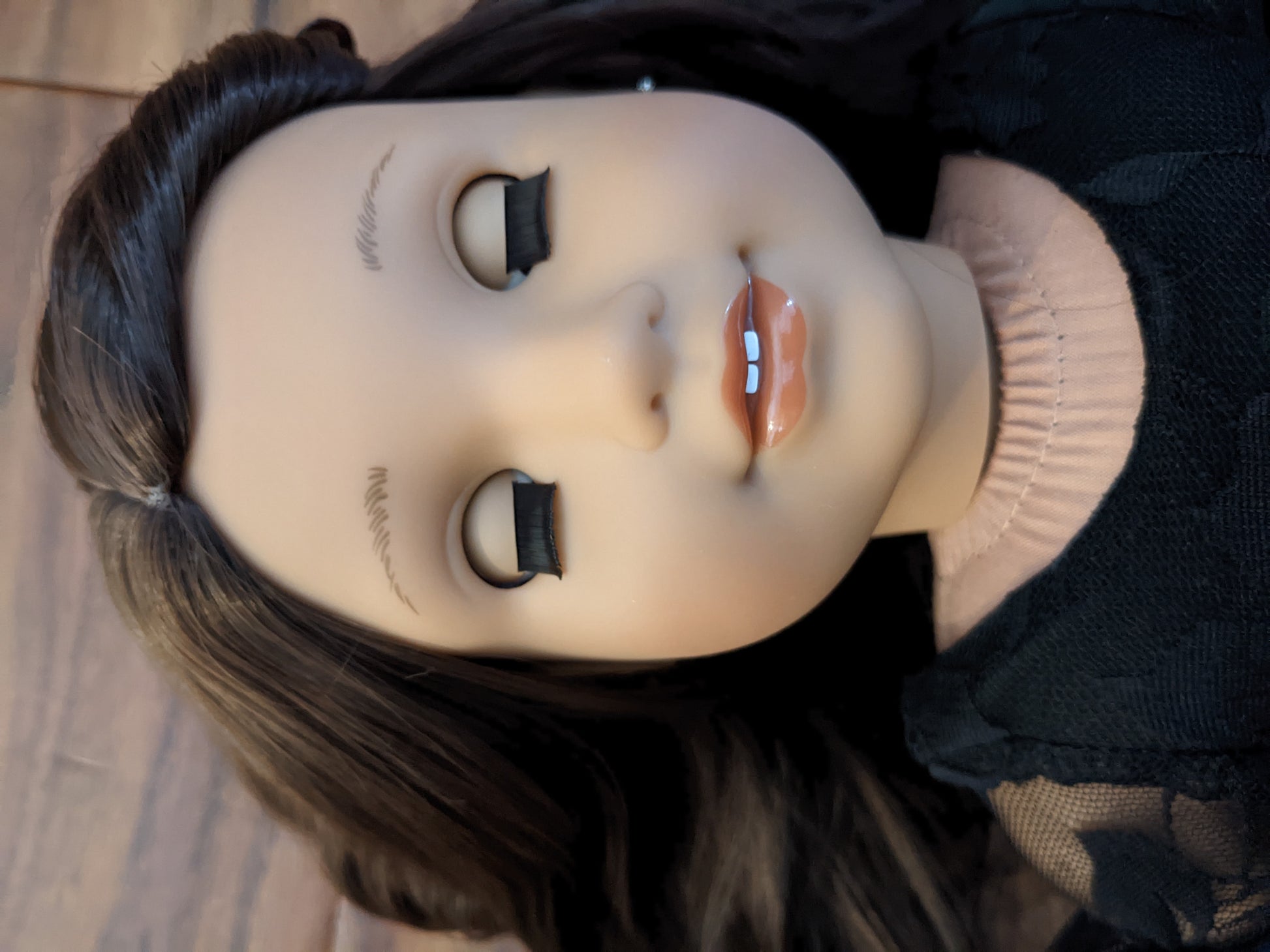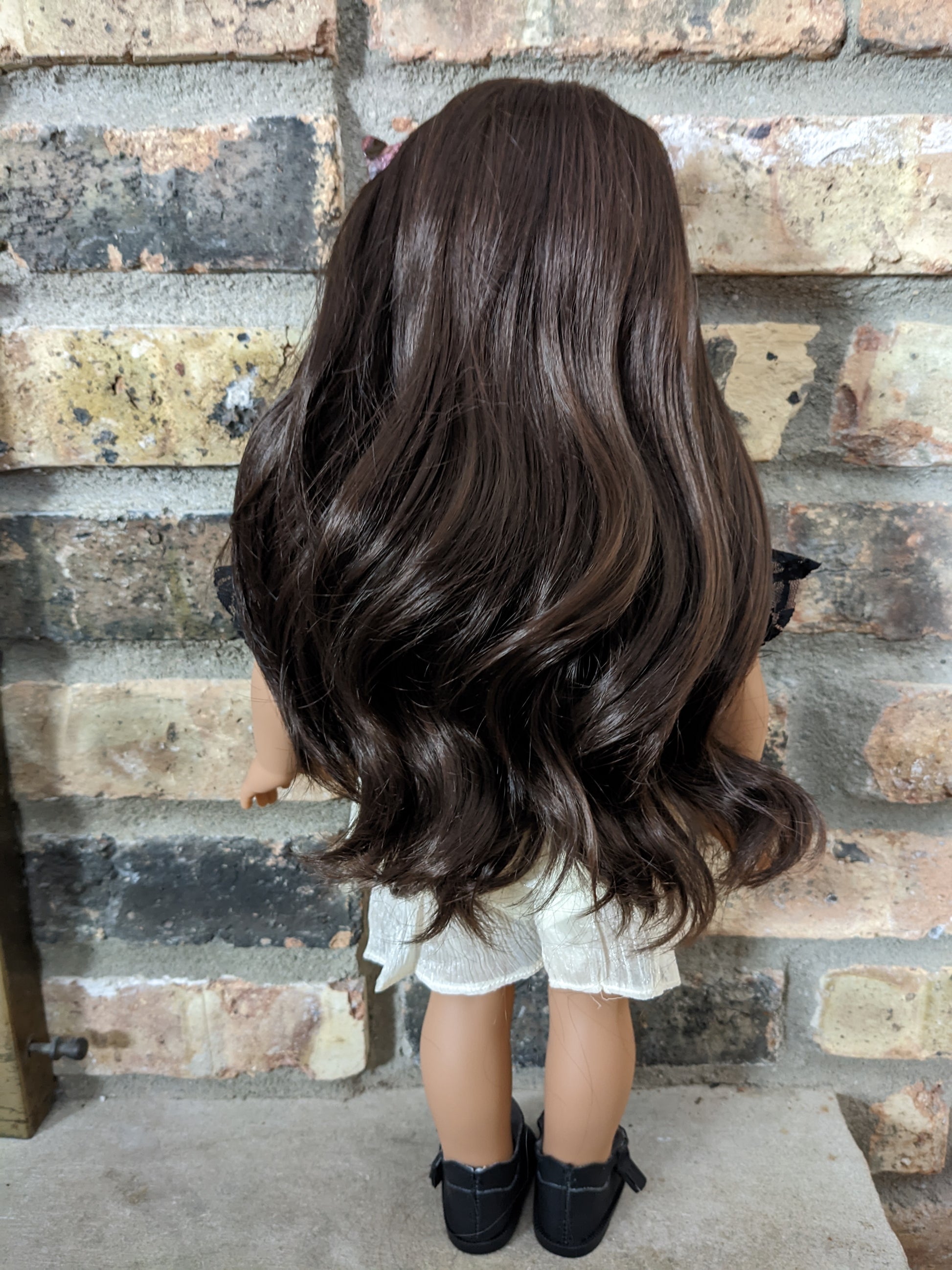 This one of a kind OOAK custom American Girl doll was created with a brand new Truly Me doll, a dark brown wig, and brown eyes. She has lip gloss that was hand painted and sealed. She may have some minor shine marks from handling. She comes with the outfit pictured. Her ears are pierced with normal earrings and the tiny diamond look studs are included.