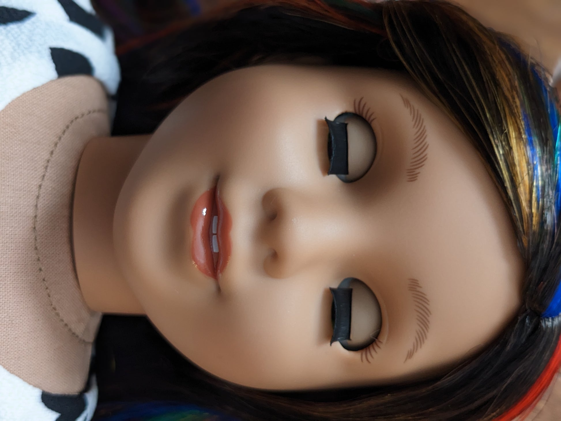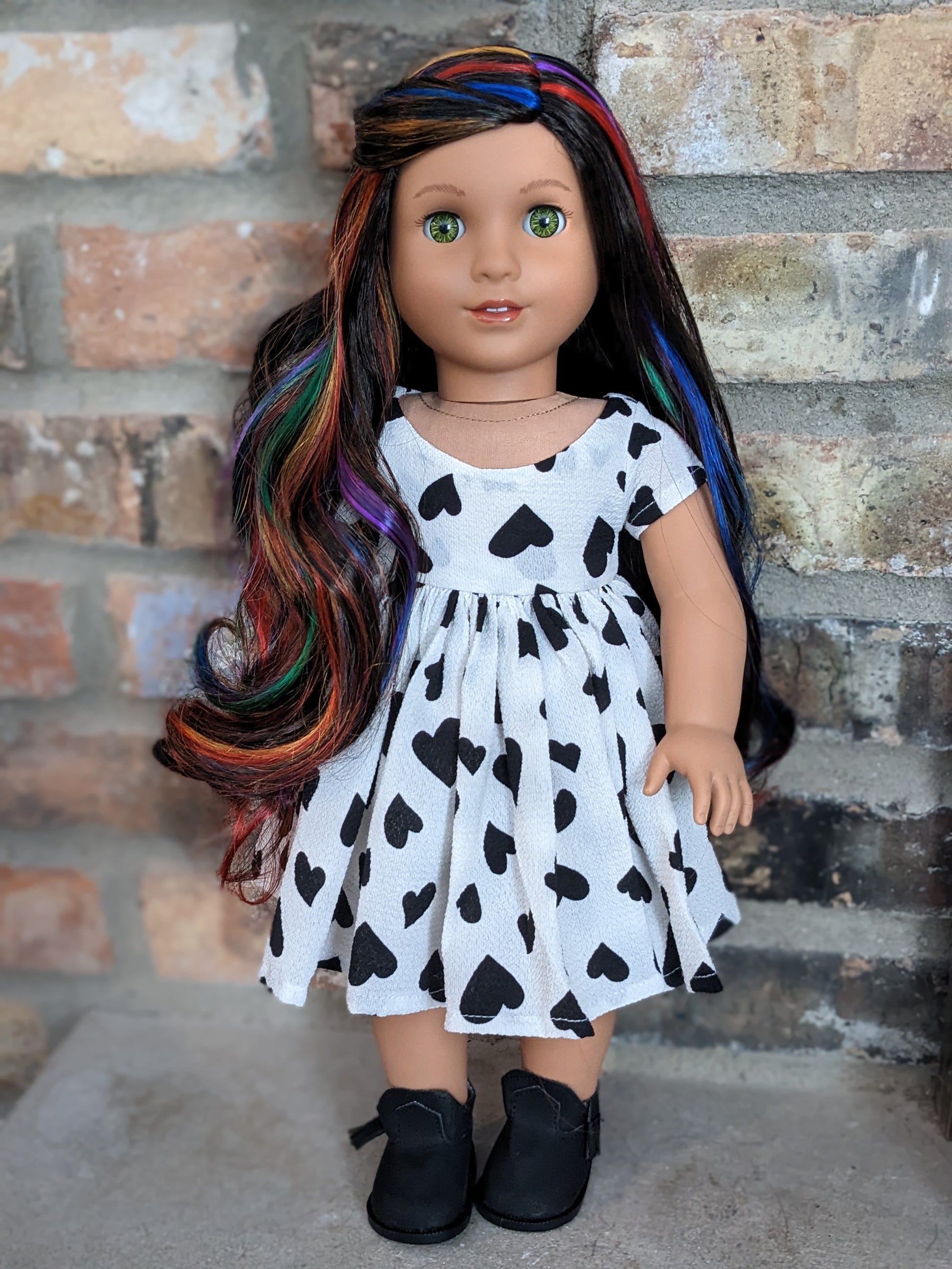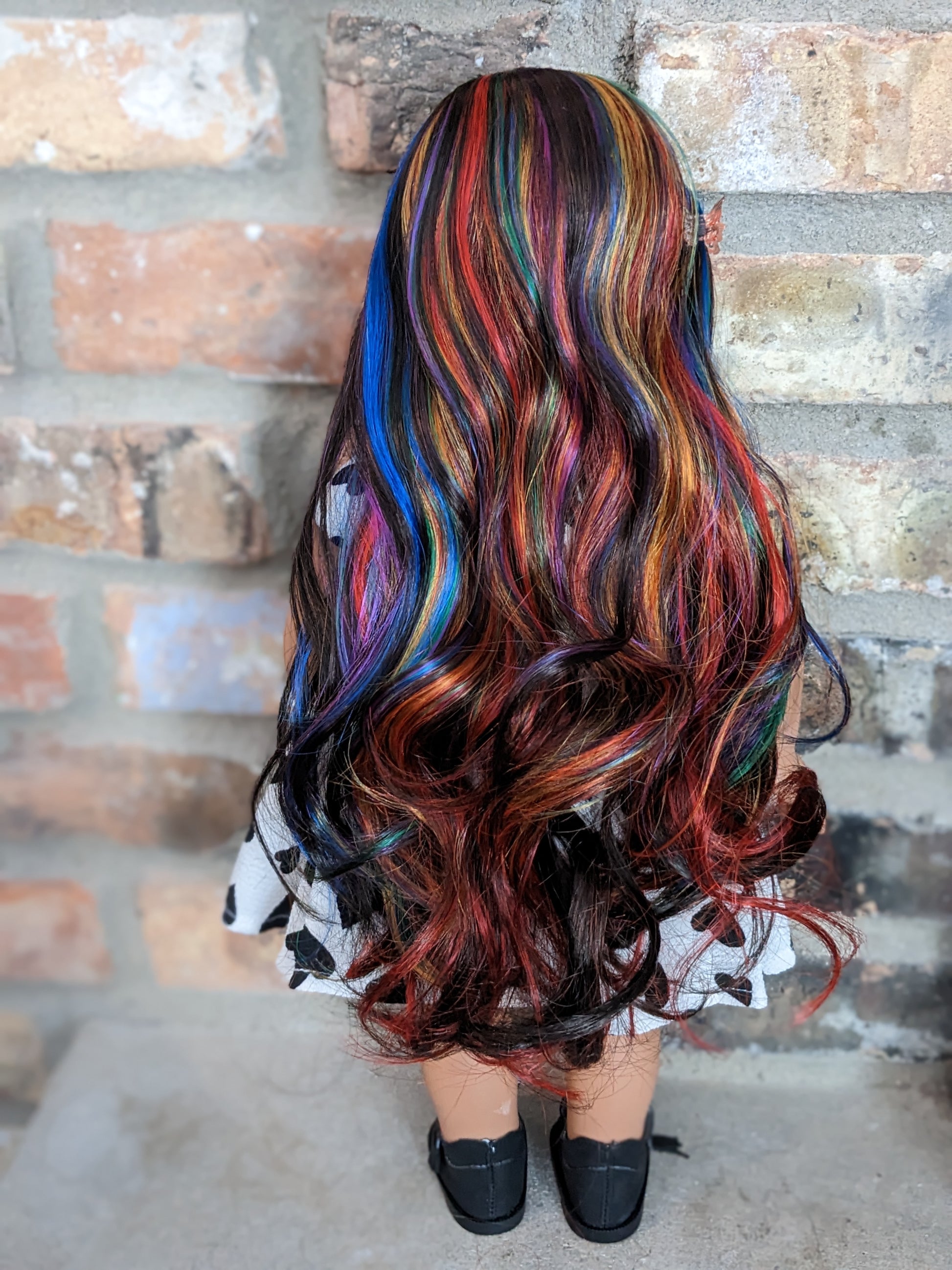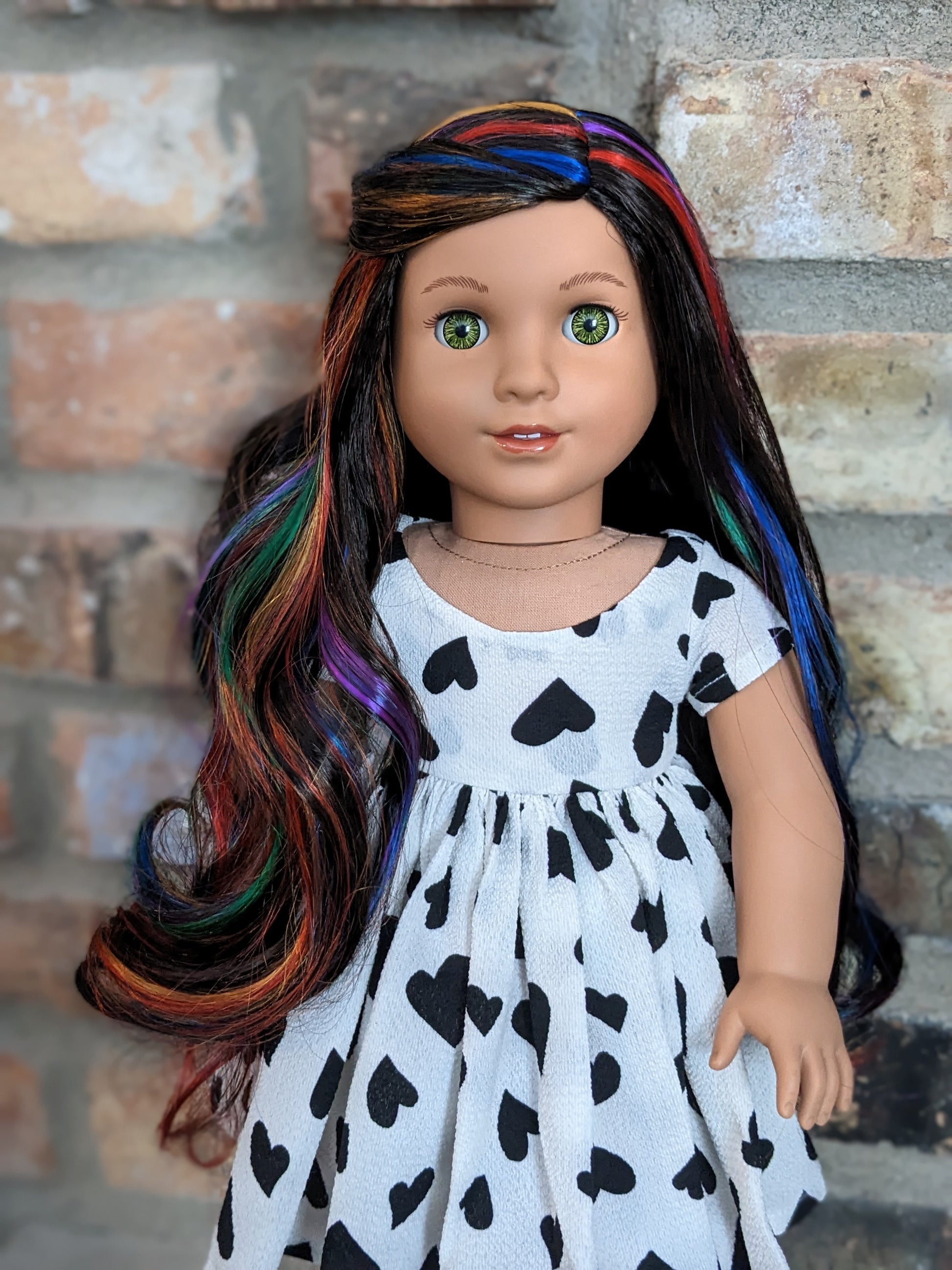 This one of a kind OOAK custom American Girl doll was created with a new TM 117 doll, a dark brown hair with rainbow highlights from a new TM 120 doll, and laser green eyes from a new Isabel doll. She has lip gloss that was hand painted and sealed. She may have some minor shine marks from handling. She comes with the outfit pictured. Her bottom painted on eyelashes have been removed.