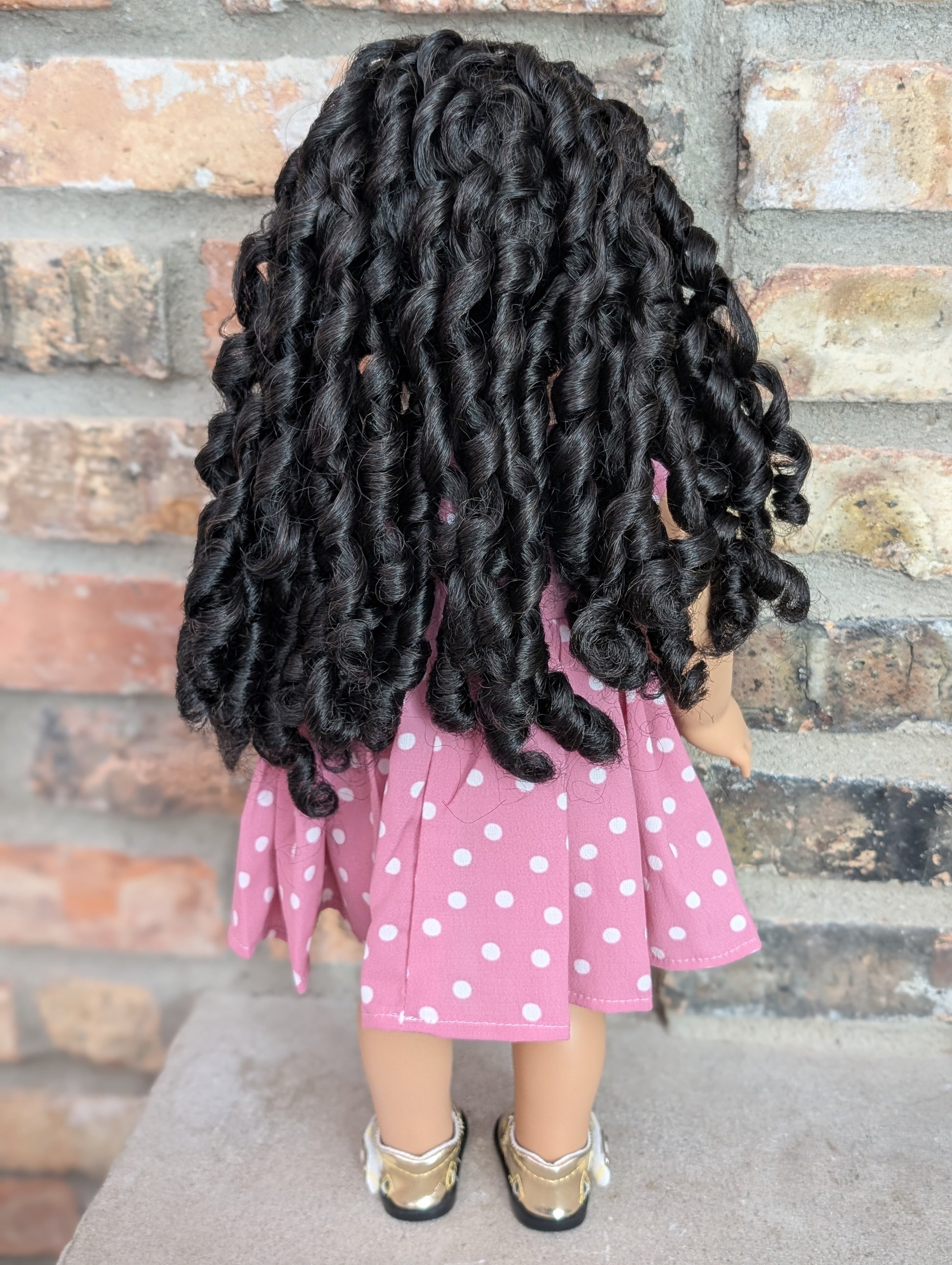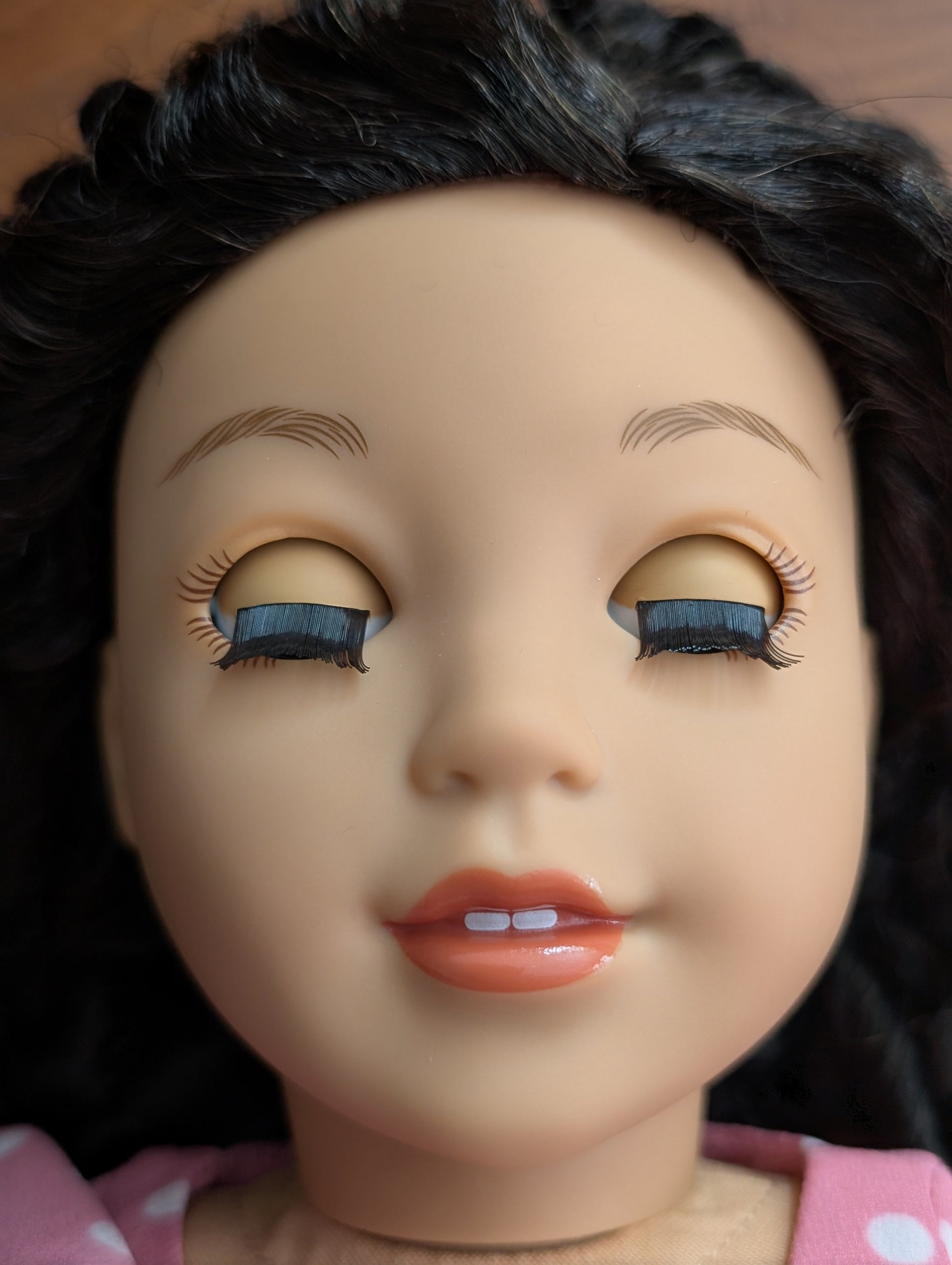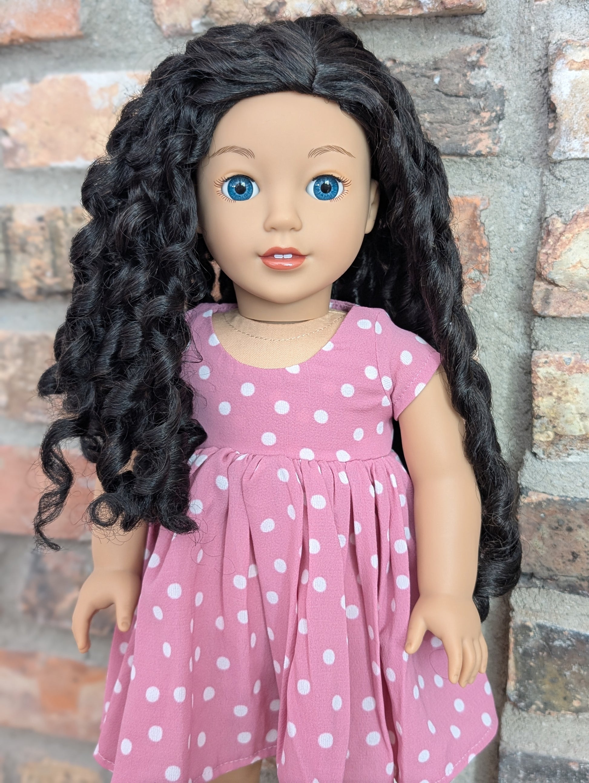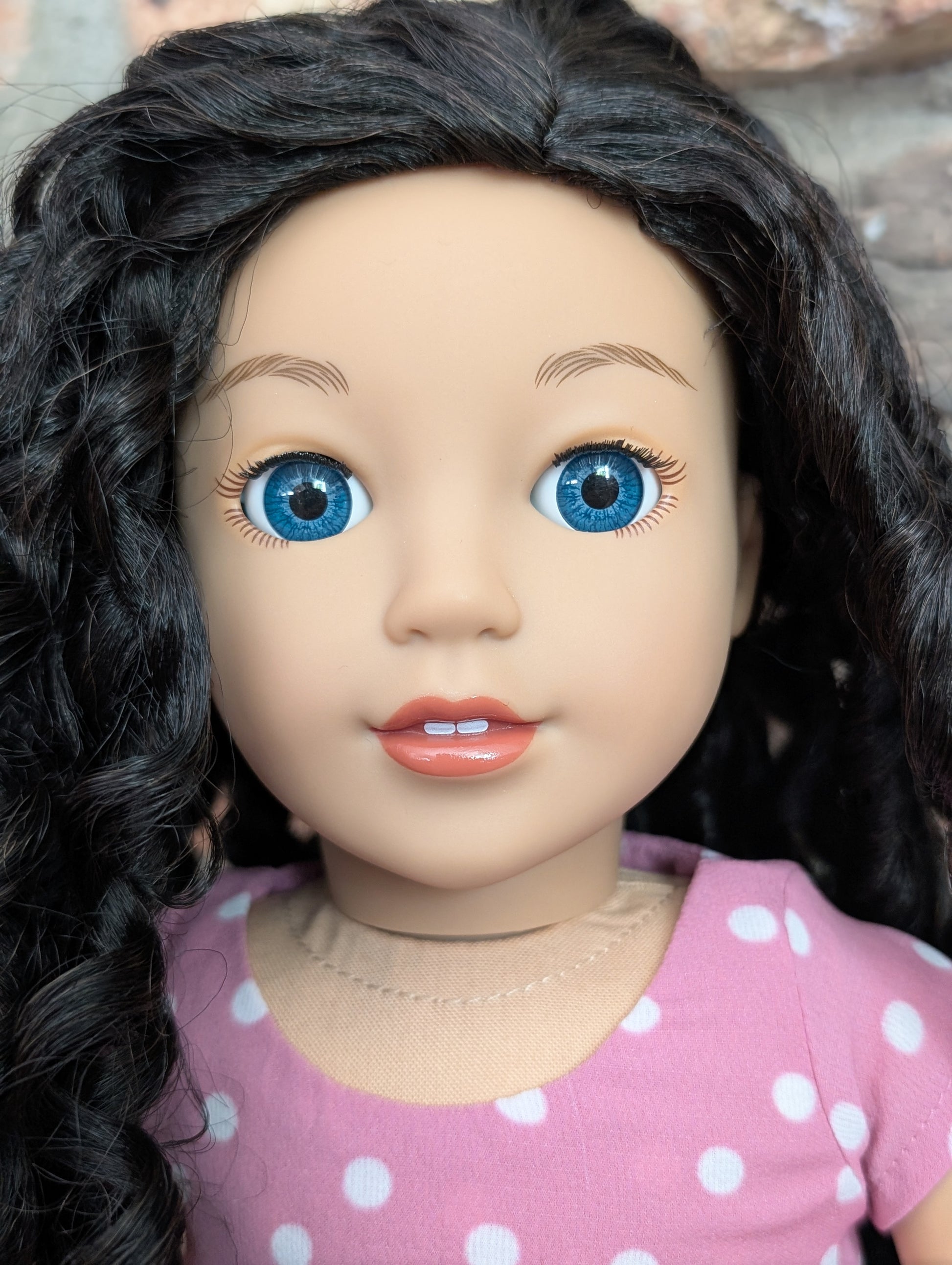 This one of a kind OOAK custom American Girl doll was created with a brand new doll, a black wig, and blue eyes from Etsy. She has lip gloss and a beauty mark that were hand painted and sealed. She may have some minor shine marks from handling. She comes with the outfit pictured.
