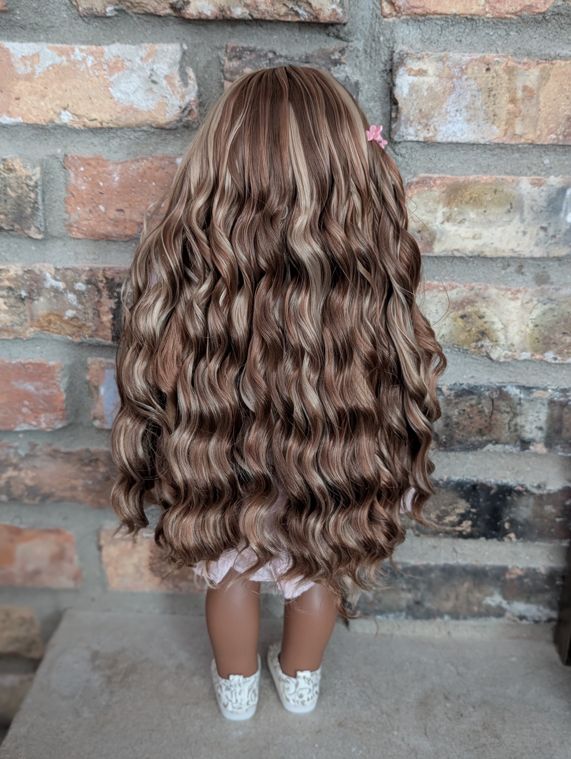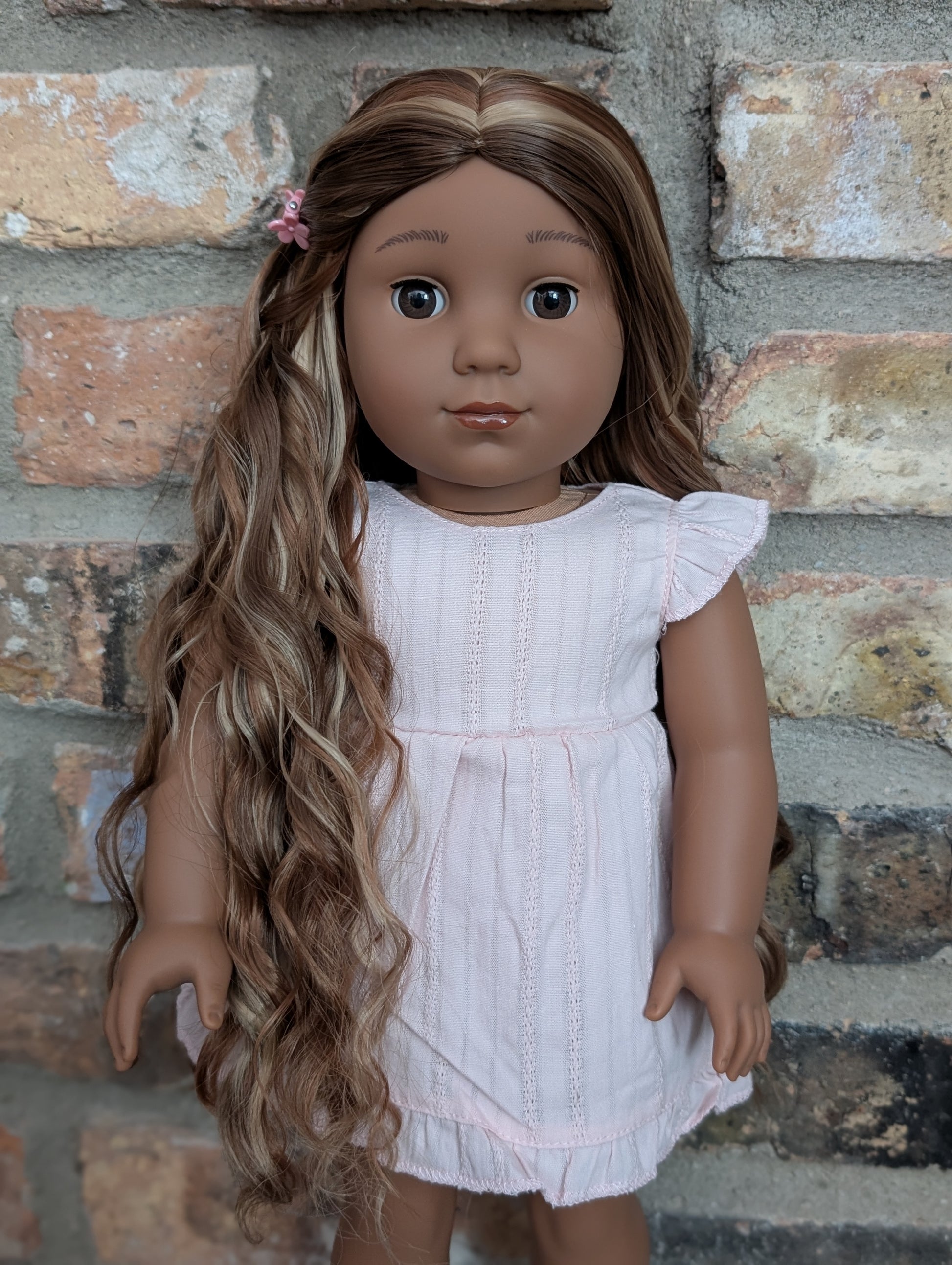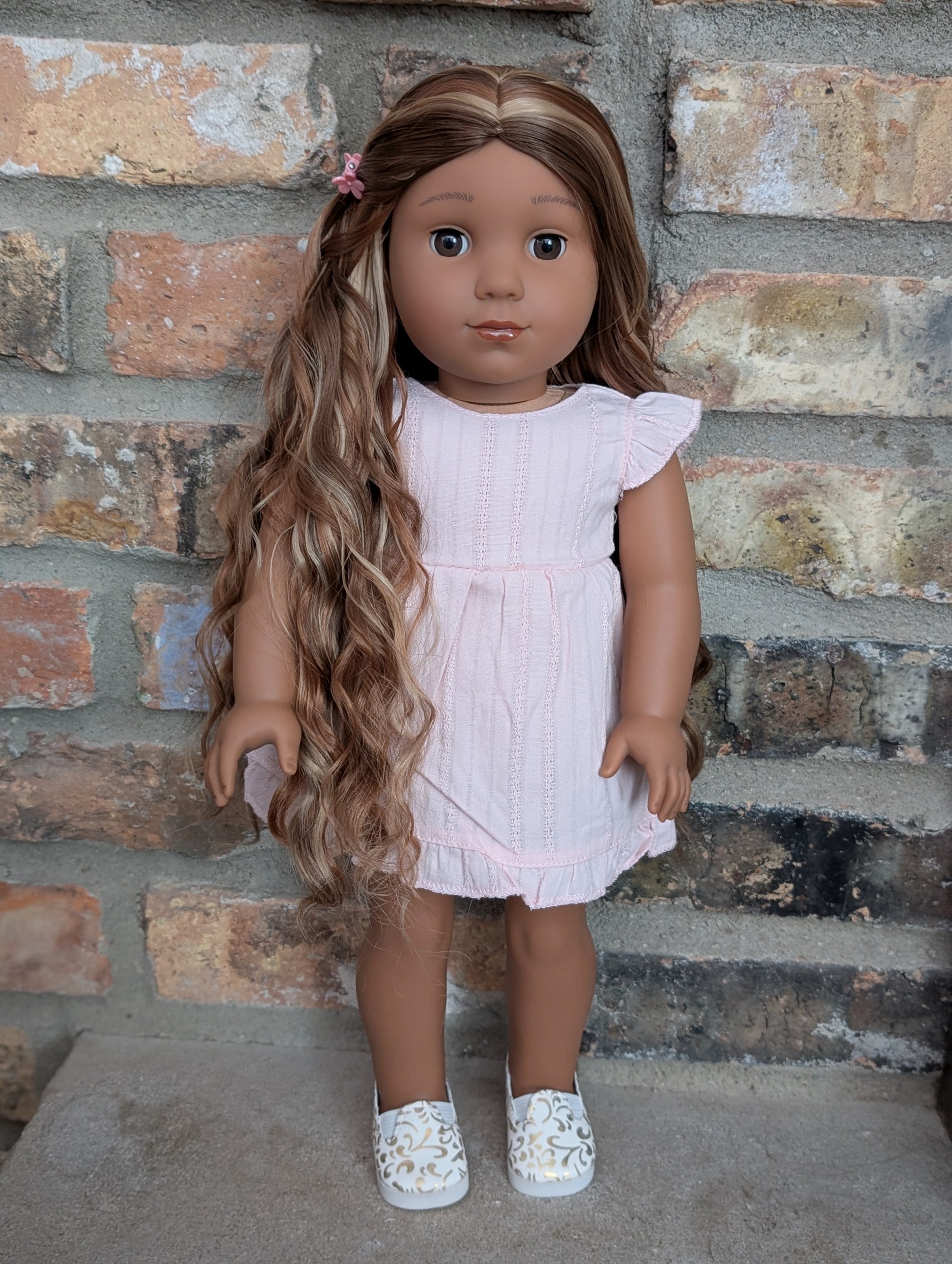 This one of a kind OOAK custom American Girl doll was created with a brand new Kaya doll, a brown wig, and brown eyes. She has lip gloss that was hand painted and sealed. She may have some minor shine marks from handling. She comes with the outfit pictured.