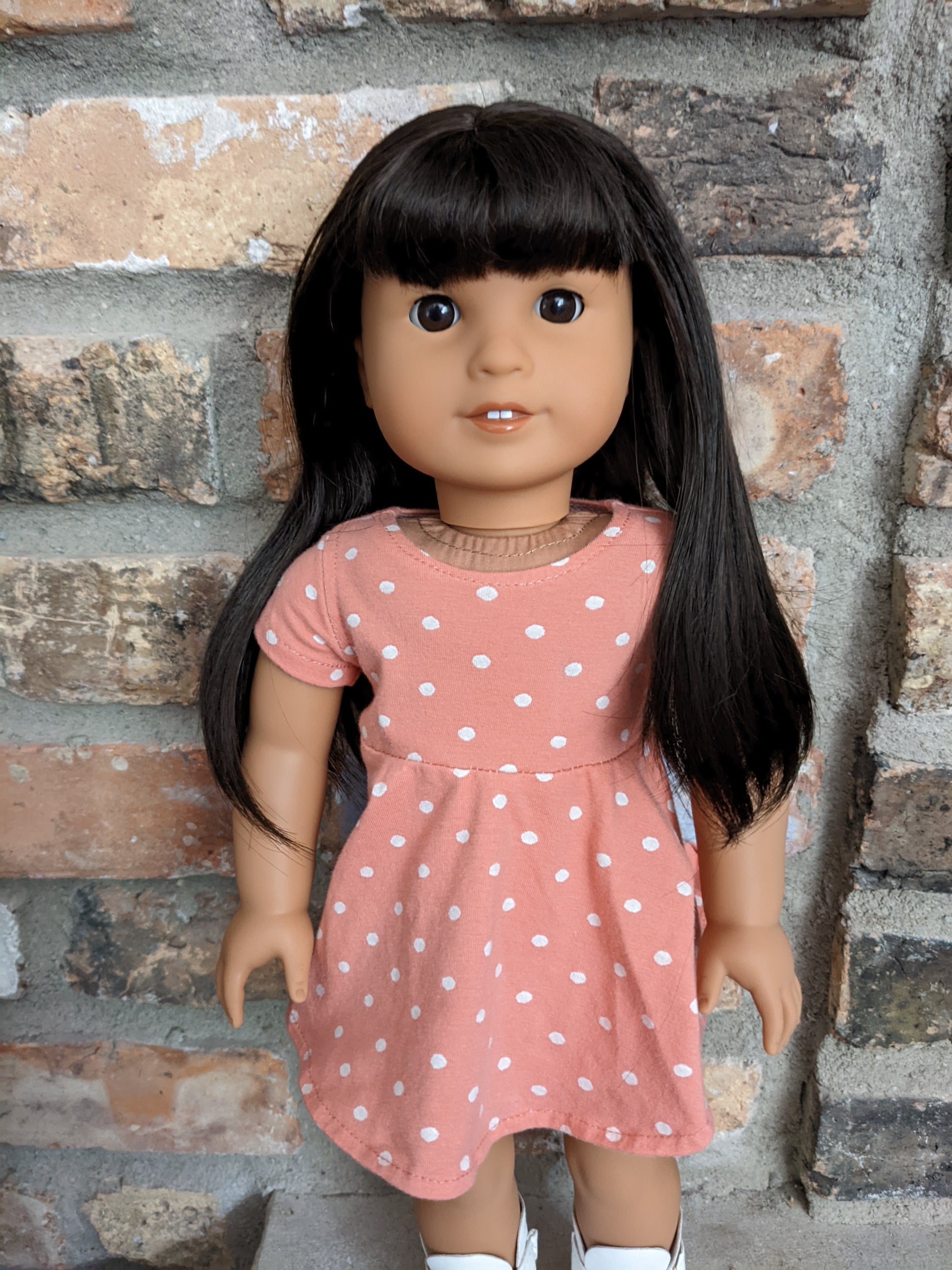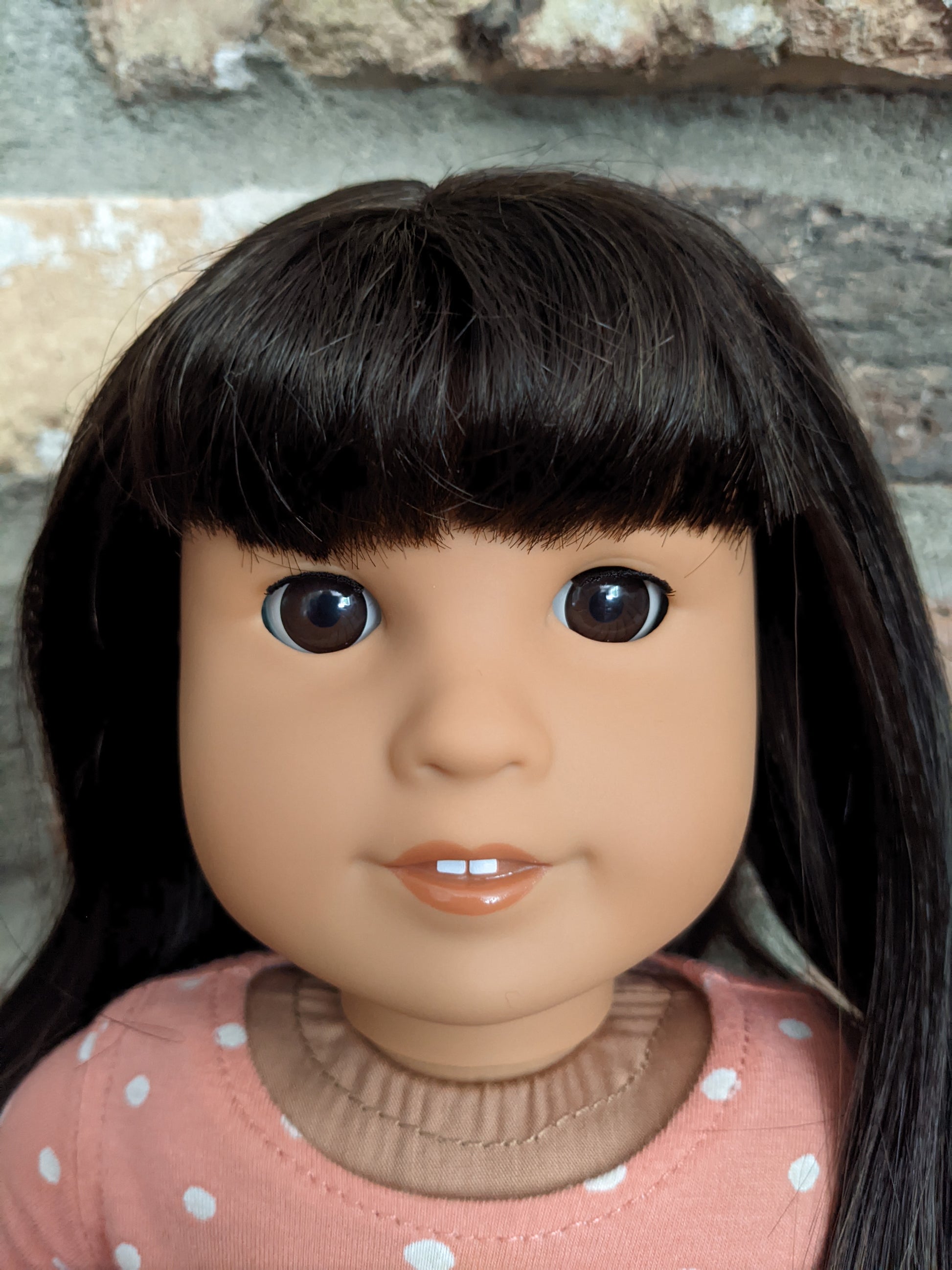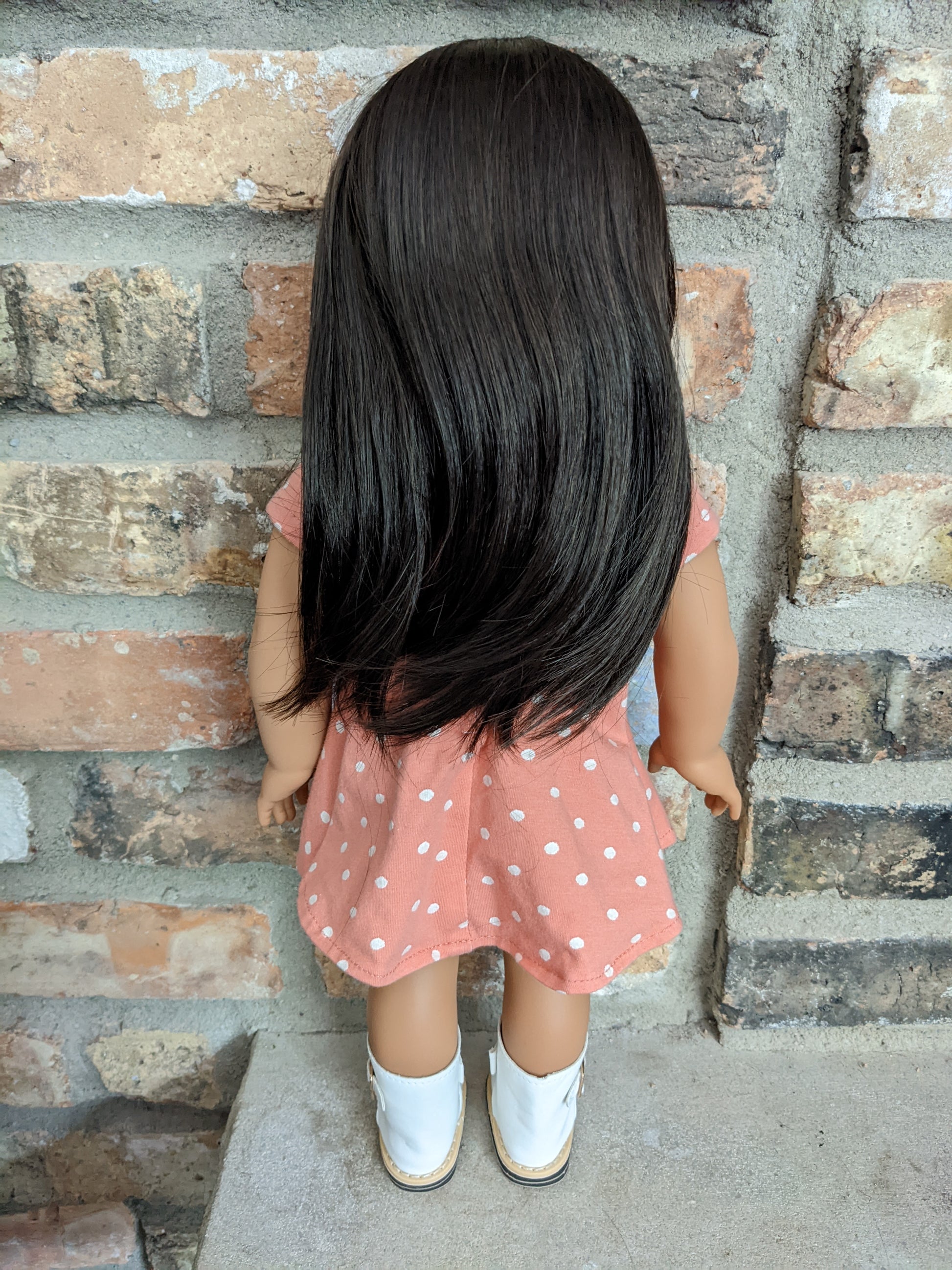 This one of a kind OOAK custom American Girl doll was created with a brand new Truly Me doll, a dark brown wig from a new TM doll, and brown eyes. She has lip gloss that was hand painted and sealed. She may have some minor shine marks from handling. She comes with the outfit pictured. She has a microfiber cloth body.