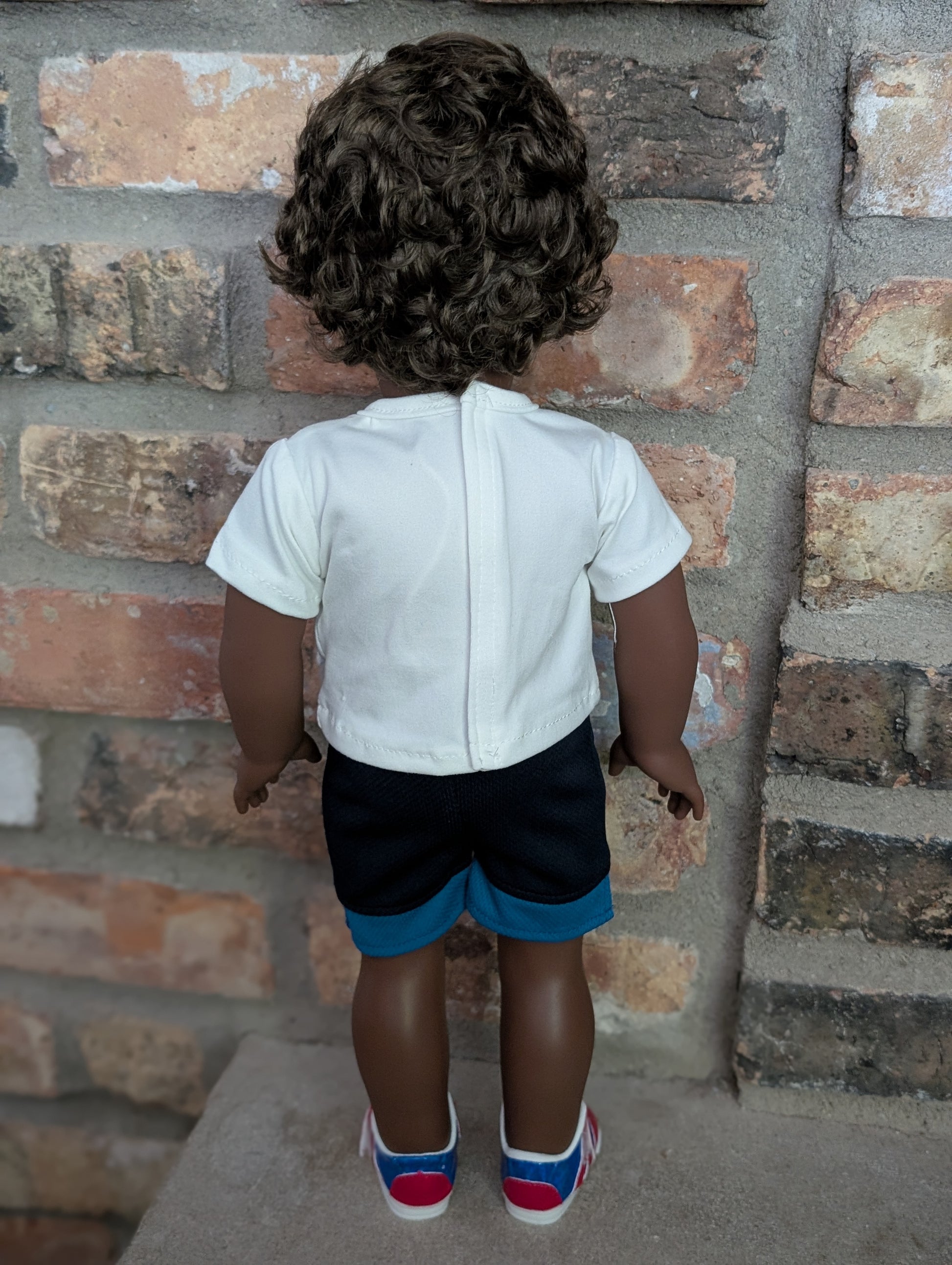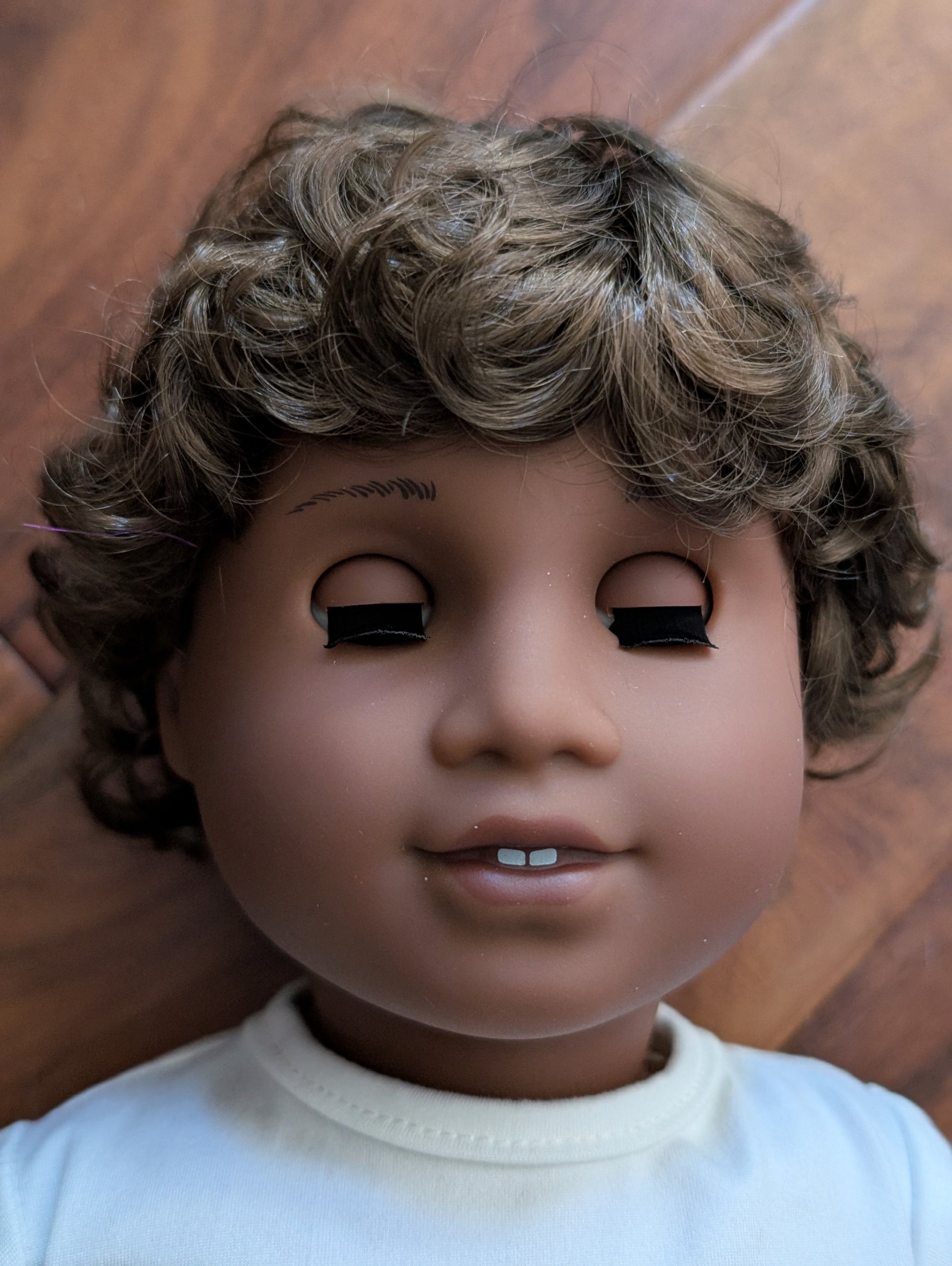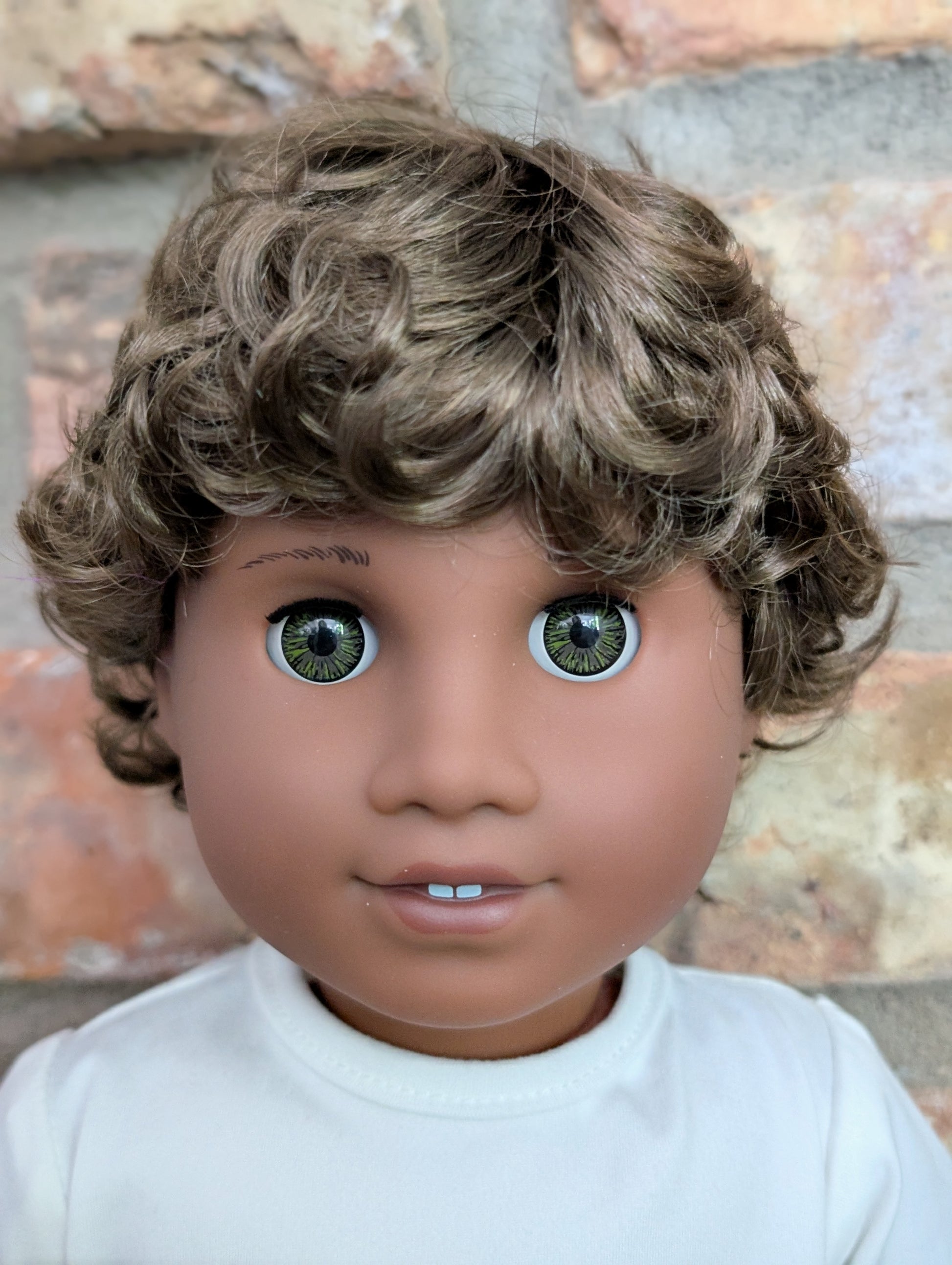 This one of a kind OOAK custom boy American Girl doll was created with a brand new doll, a brown wig, and hazel eyes. He may have some minor shine marks from handling. He comes with the outfit pictured.