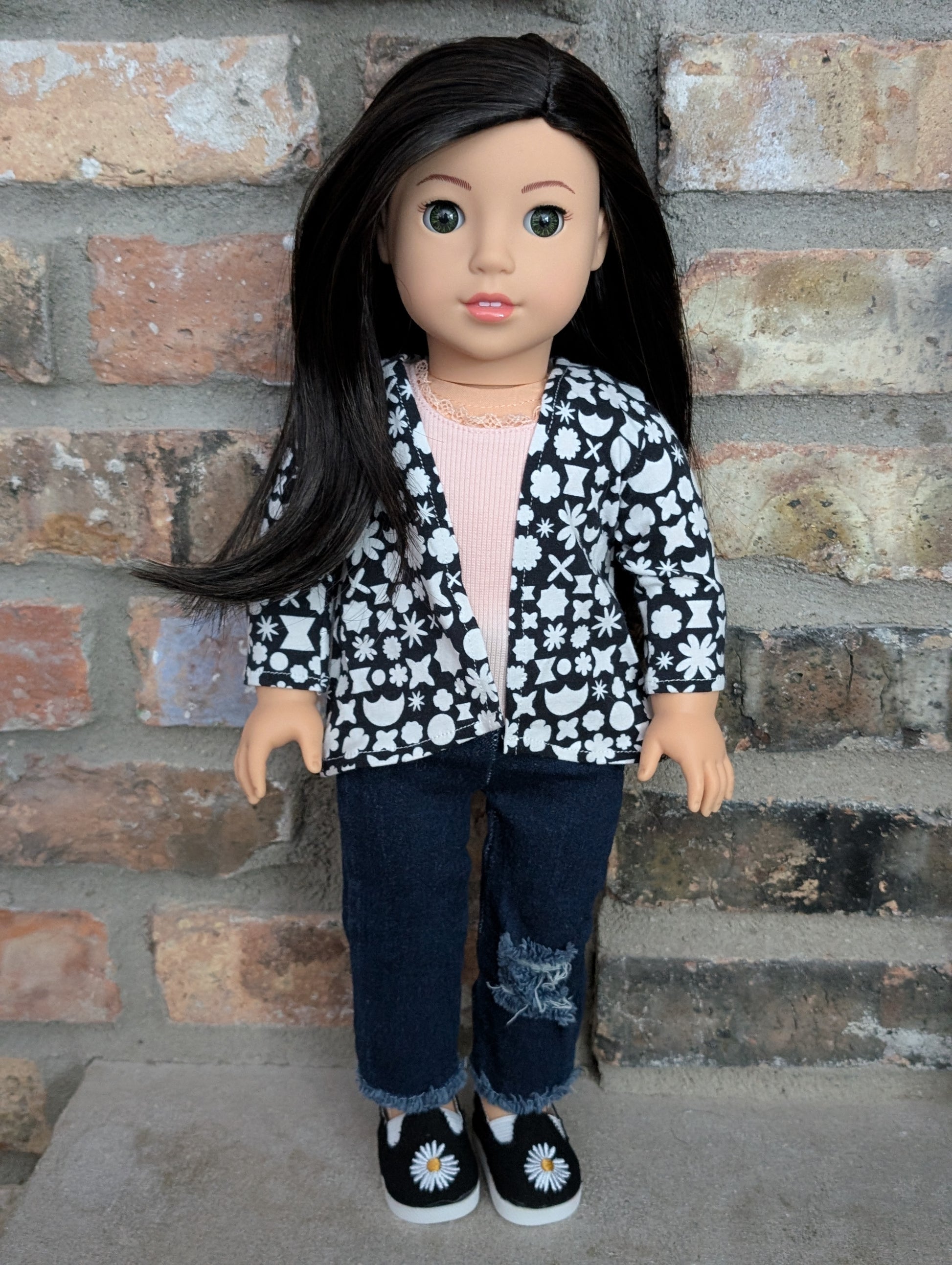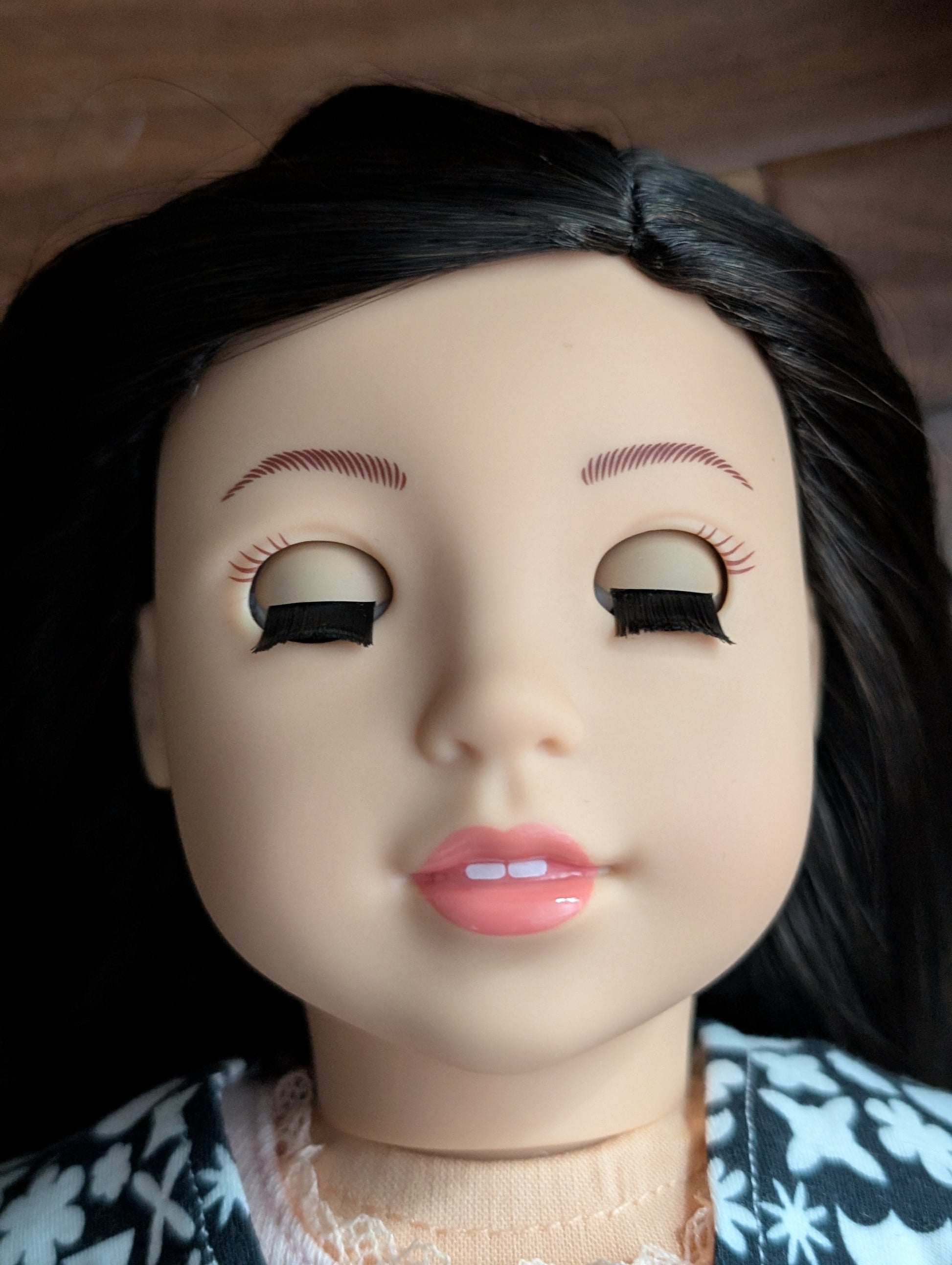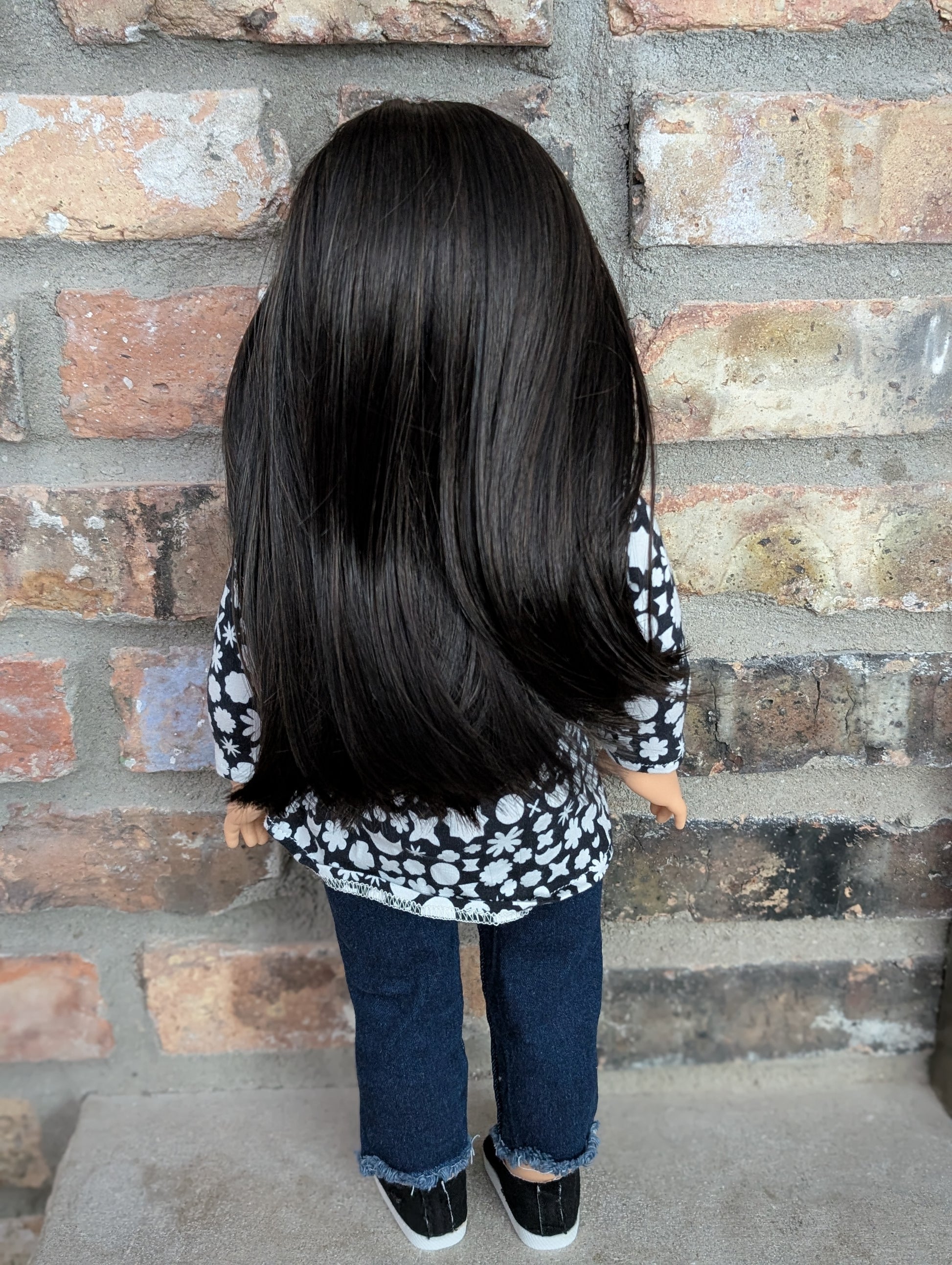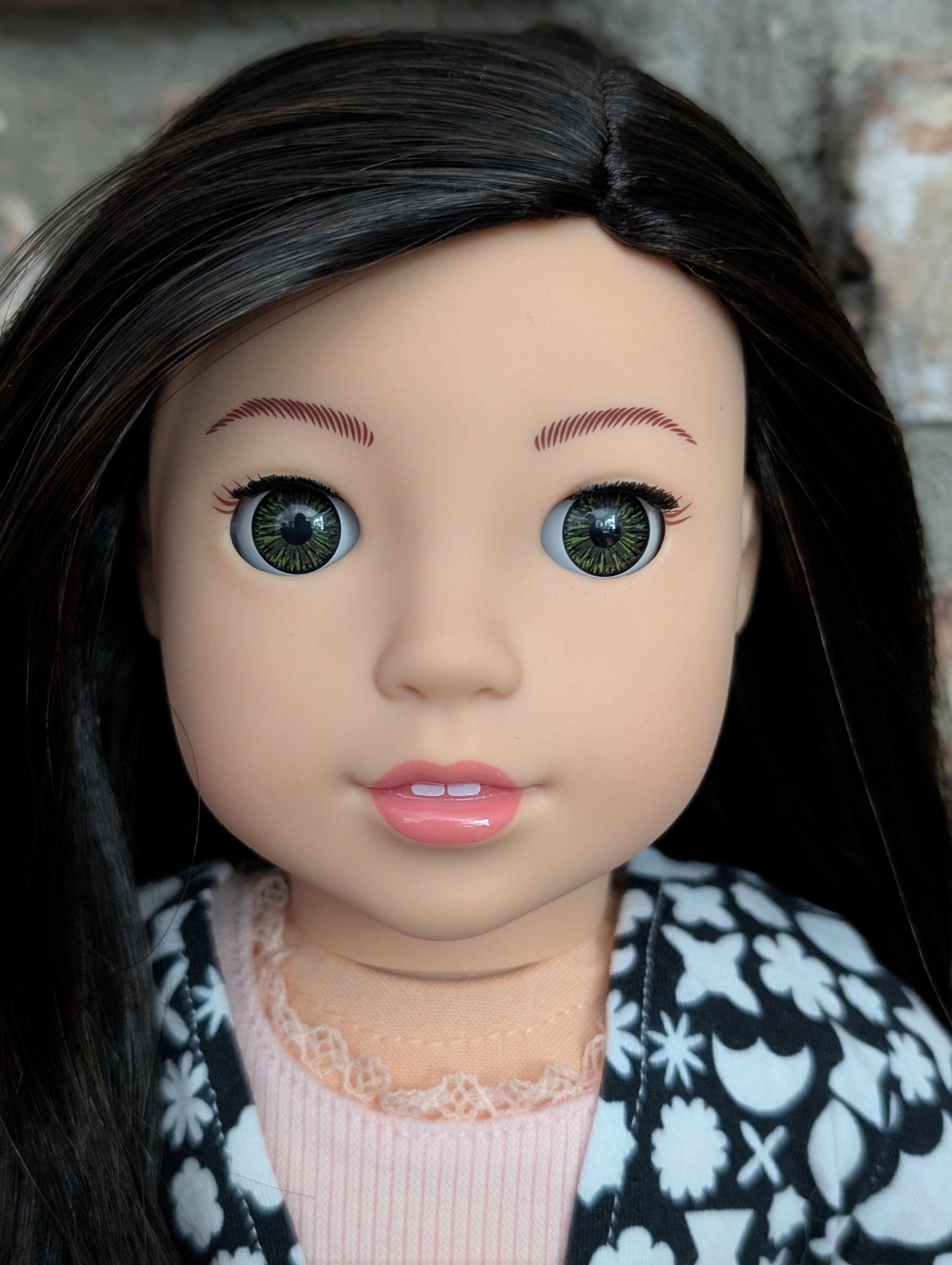 This one of a kind OOAK custom American Girl doll was created with a brand new Ariel doll, a black wig, and hazel eyes. She has lip gloss that was hand painted and sealed. She may have some minor shine marks from handling. She comes with the outfit pictured.