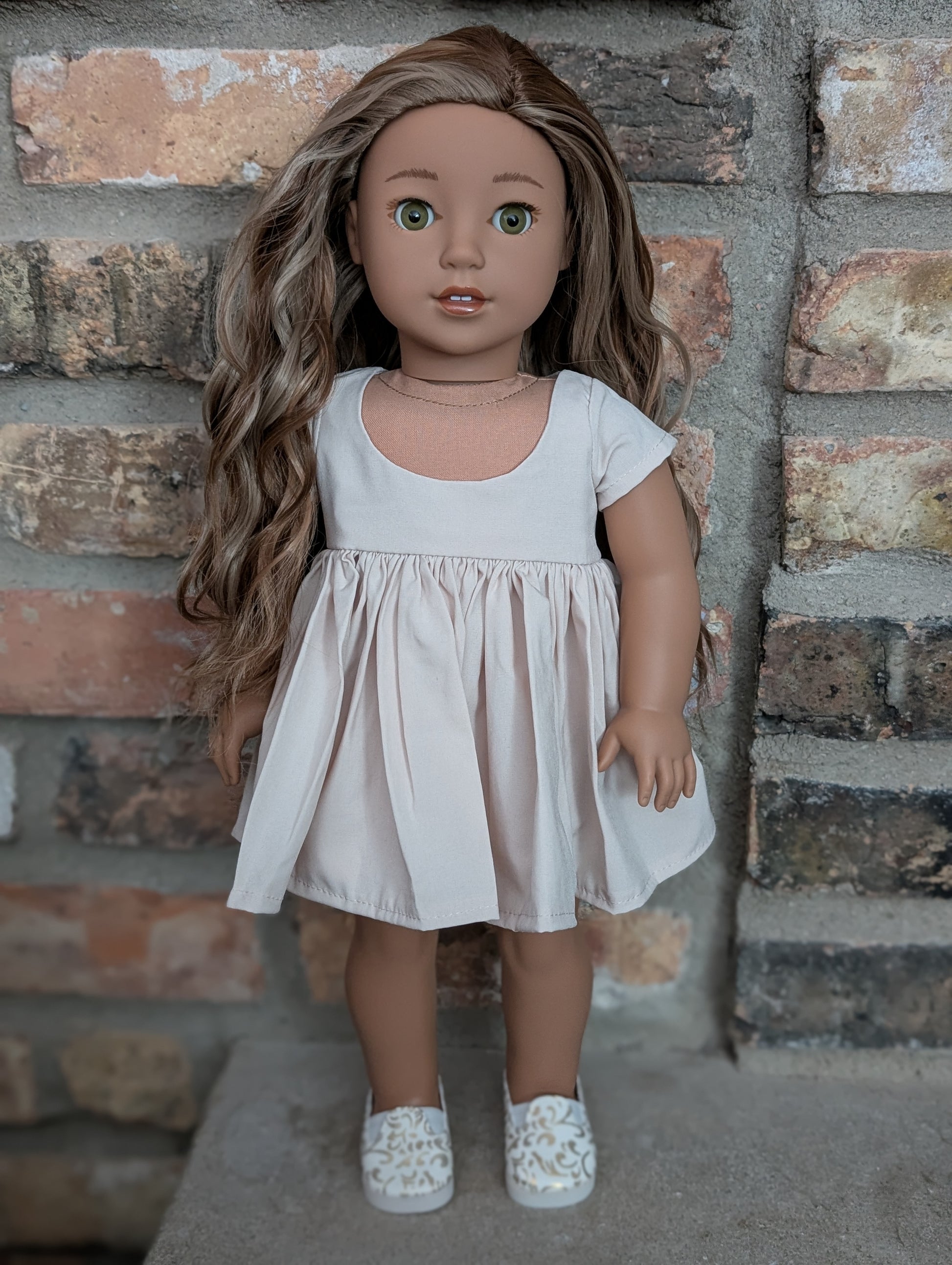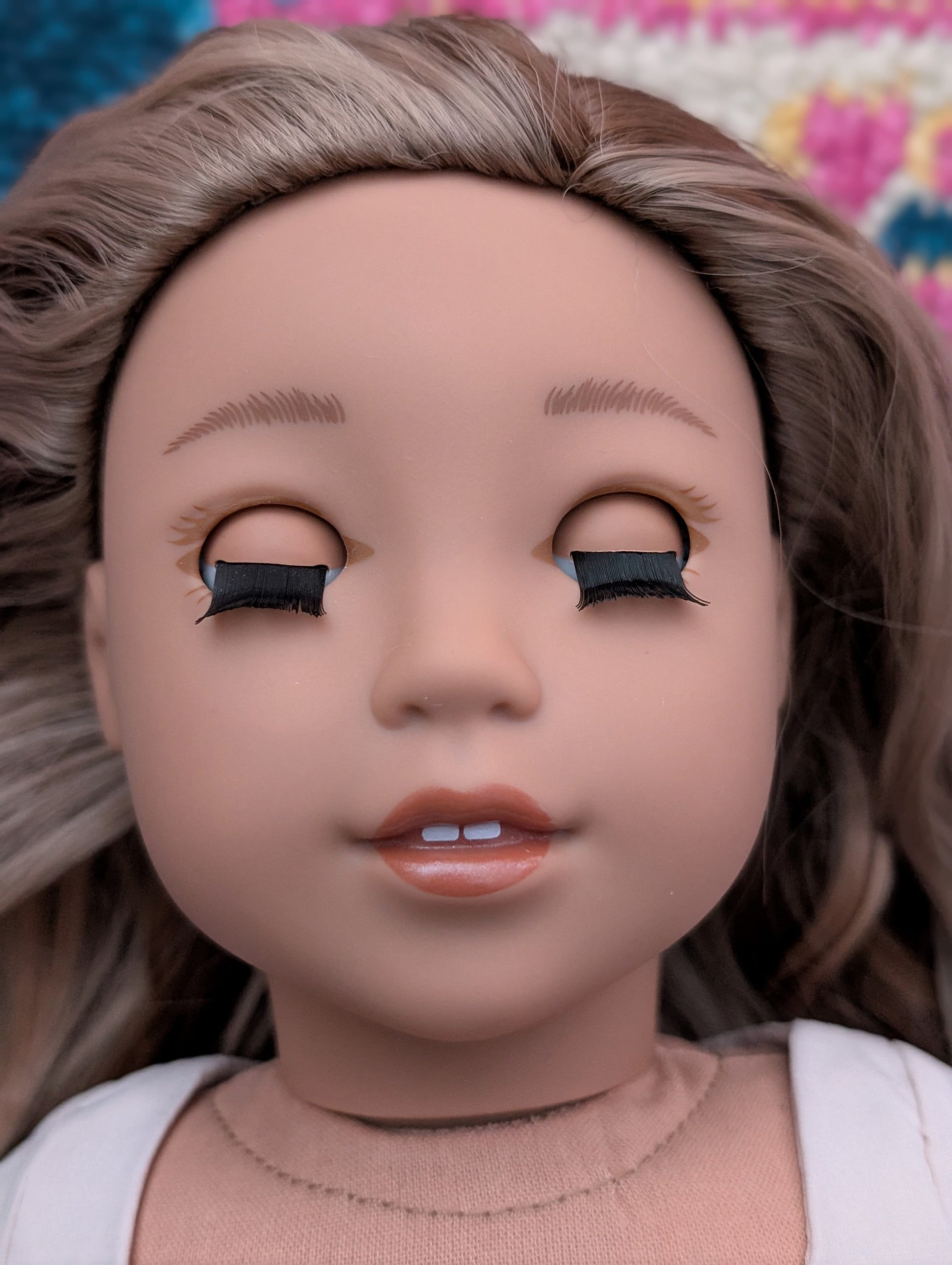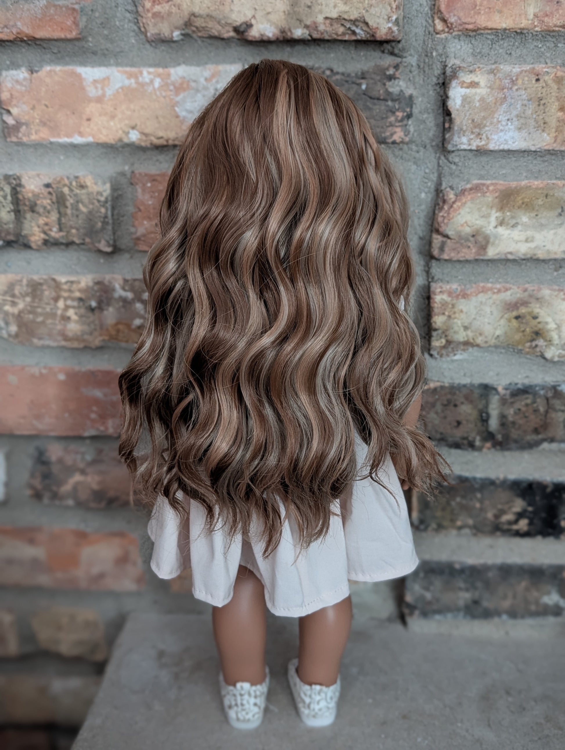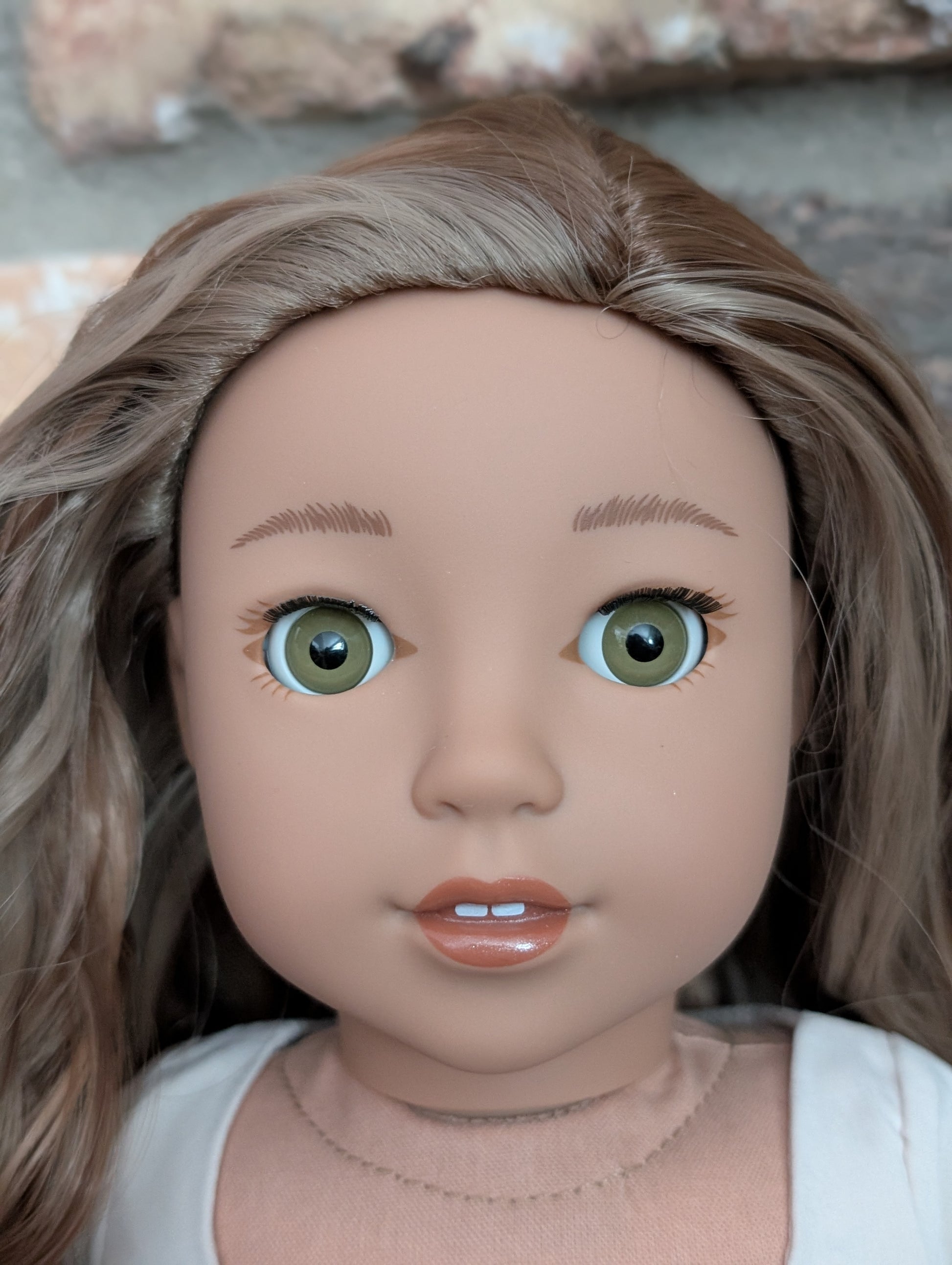 This one of a kind OOAK custom American Girl doll was created with a brand new doll, a brown wig, and green eyes from Etay. She has lip gloss that was hand painted and sealed. She may have some minor shine marks from handling. She comes with the outfit pictured.