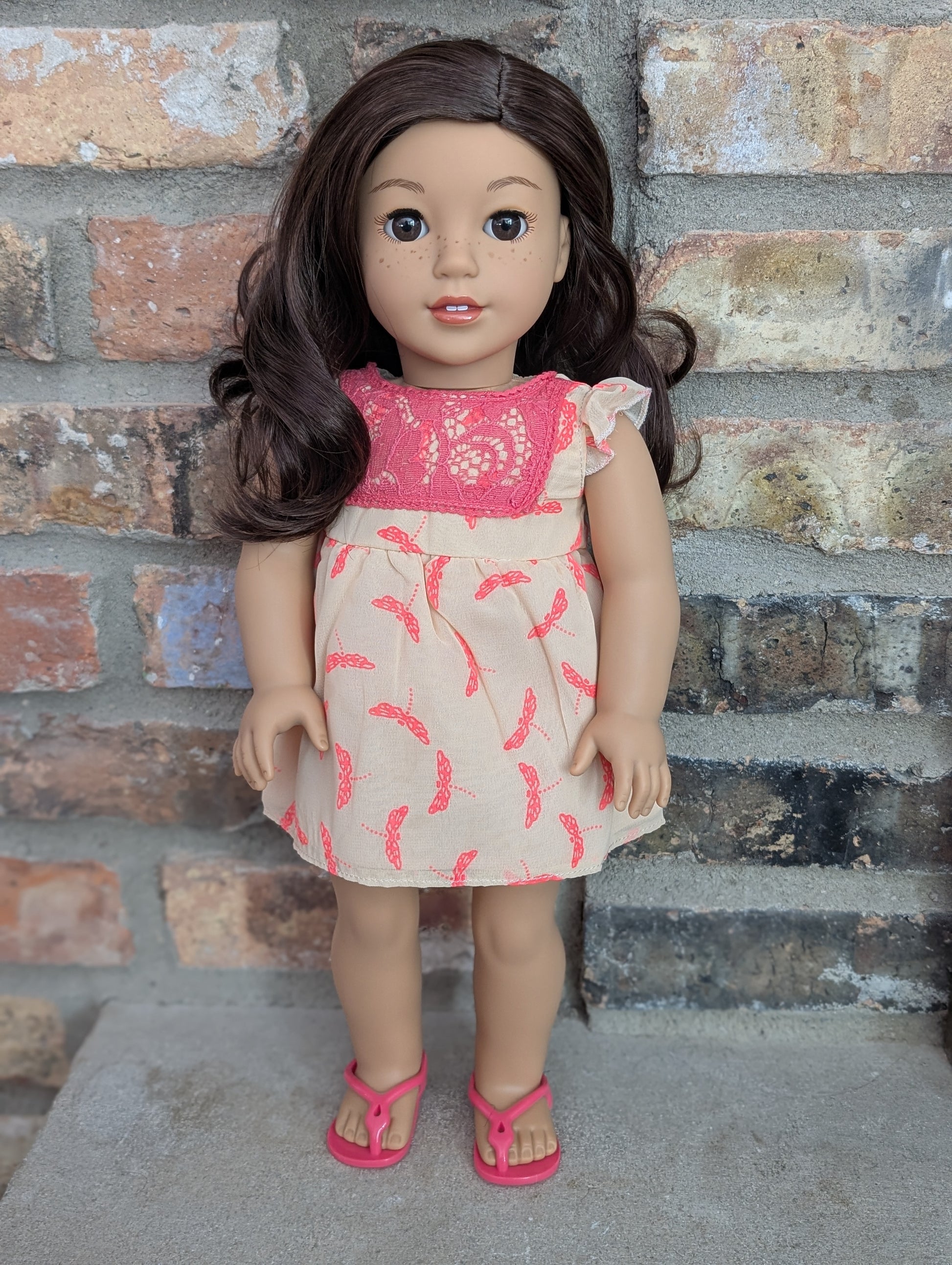 This one of a kind OOAK custom American Girl doll was created with a brand new doll, a brown wig, and brown eyes. She has lip gloss and freckles that were hand painted and sealed. She may have some minor shine marks from handling. She comes with the outfit pictured.