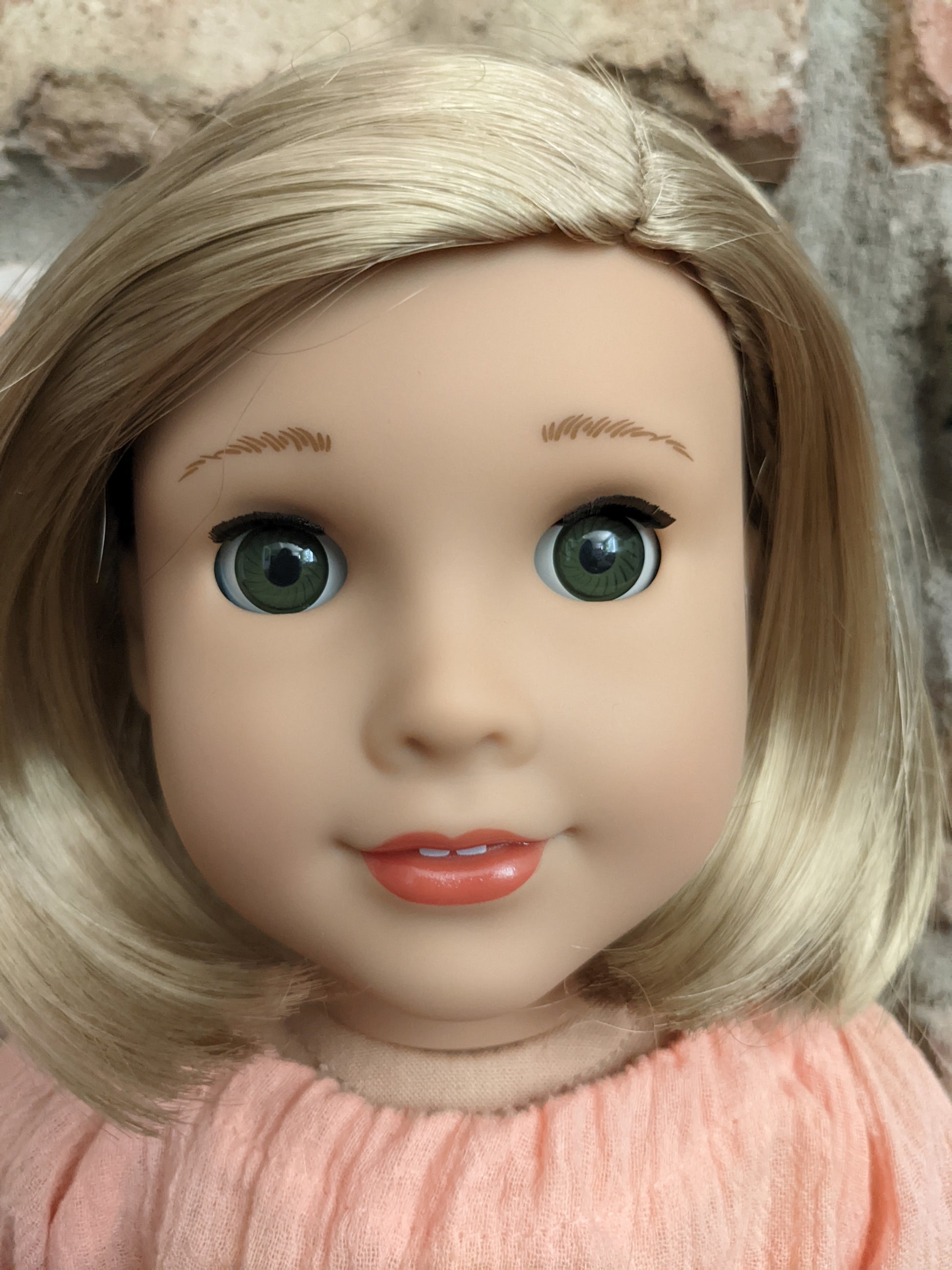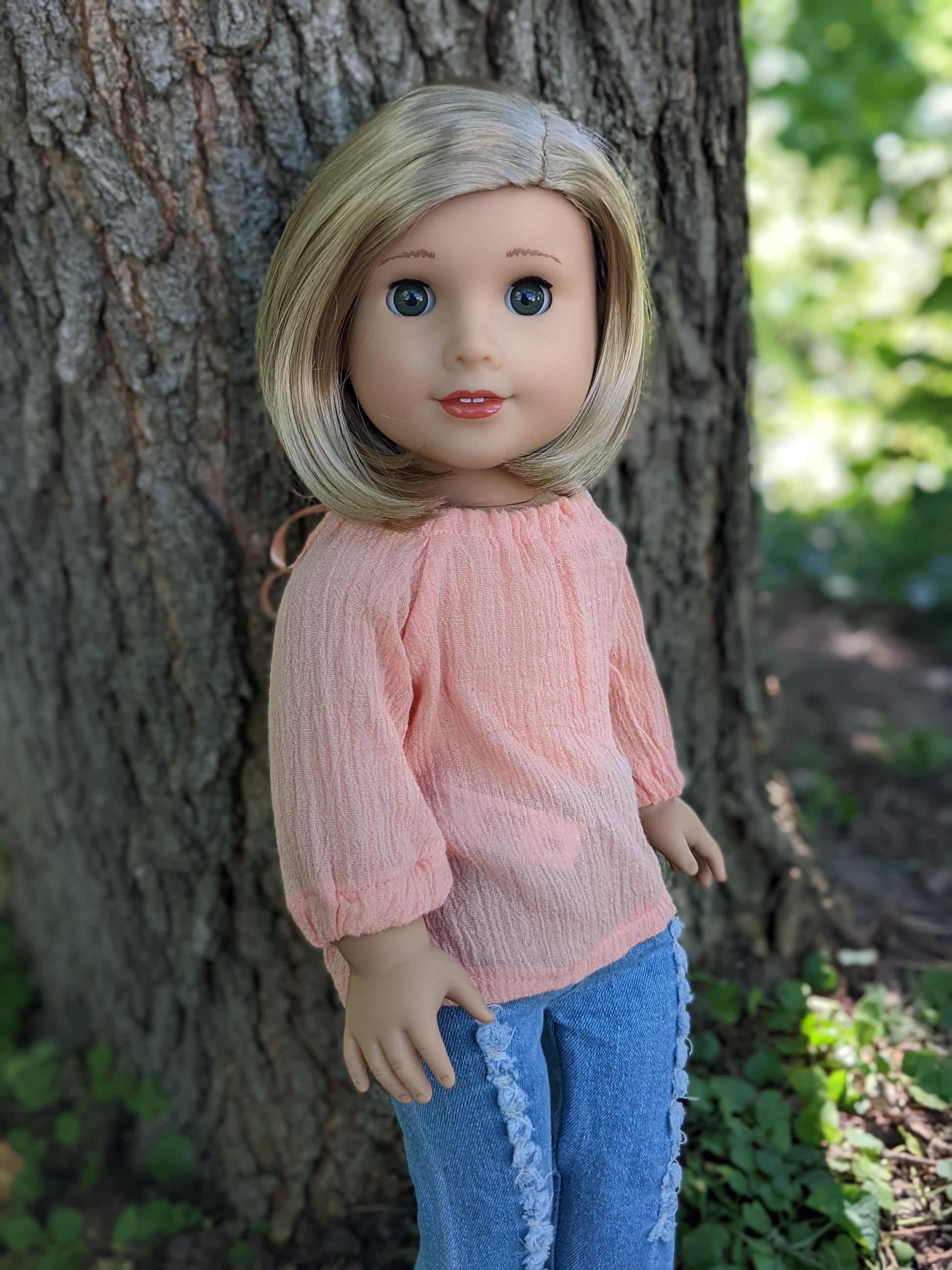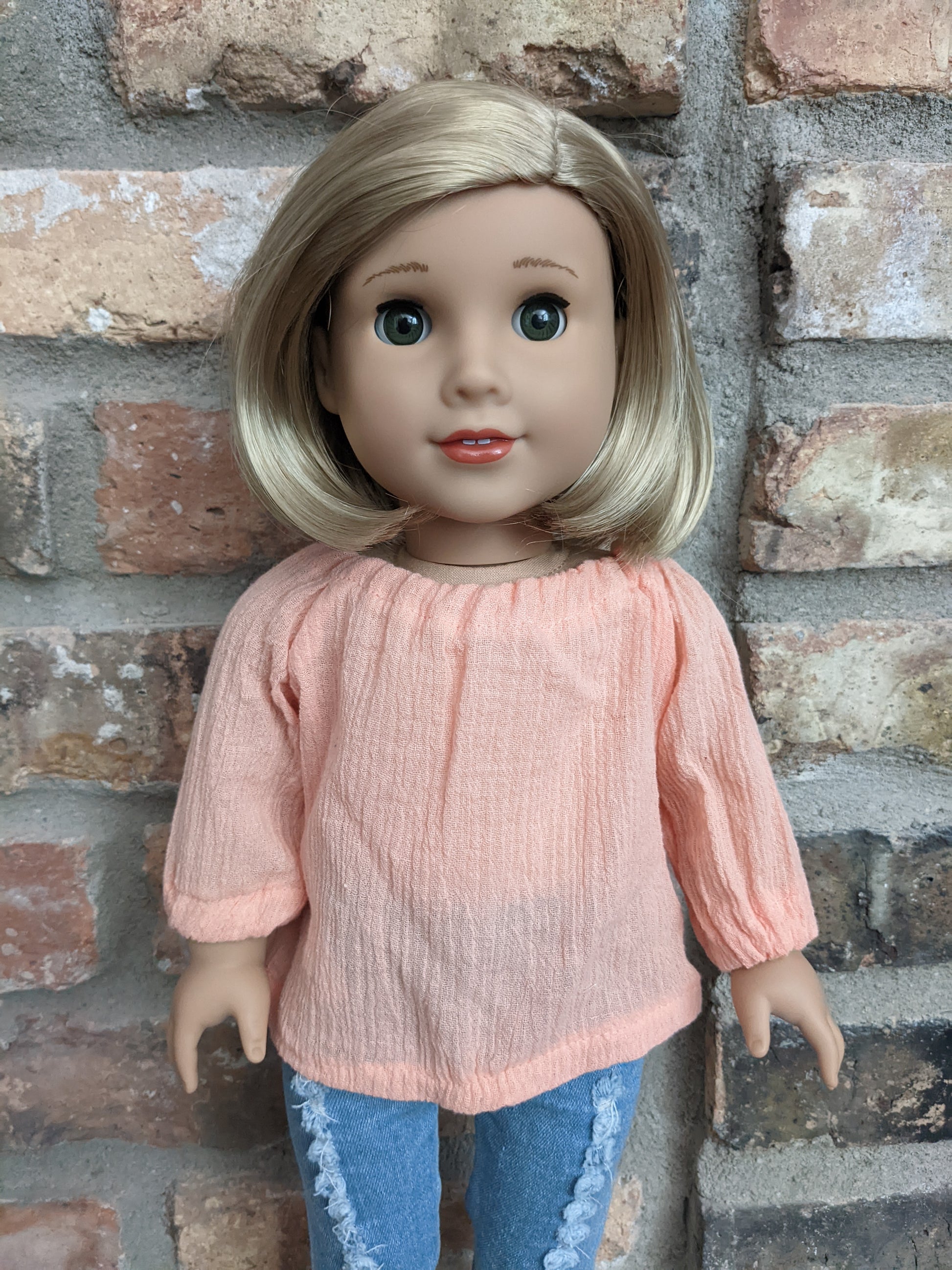 This one of a kind OOAK custom American Girl doll was created with a brand new Joss doll, a blonde bob wig from a new Kit doll, and green eyes. She has lip gloss that was hand painted and sealed. She may have some minor shine marks from handling. She comes with the outfit pictured.
