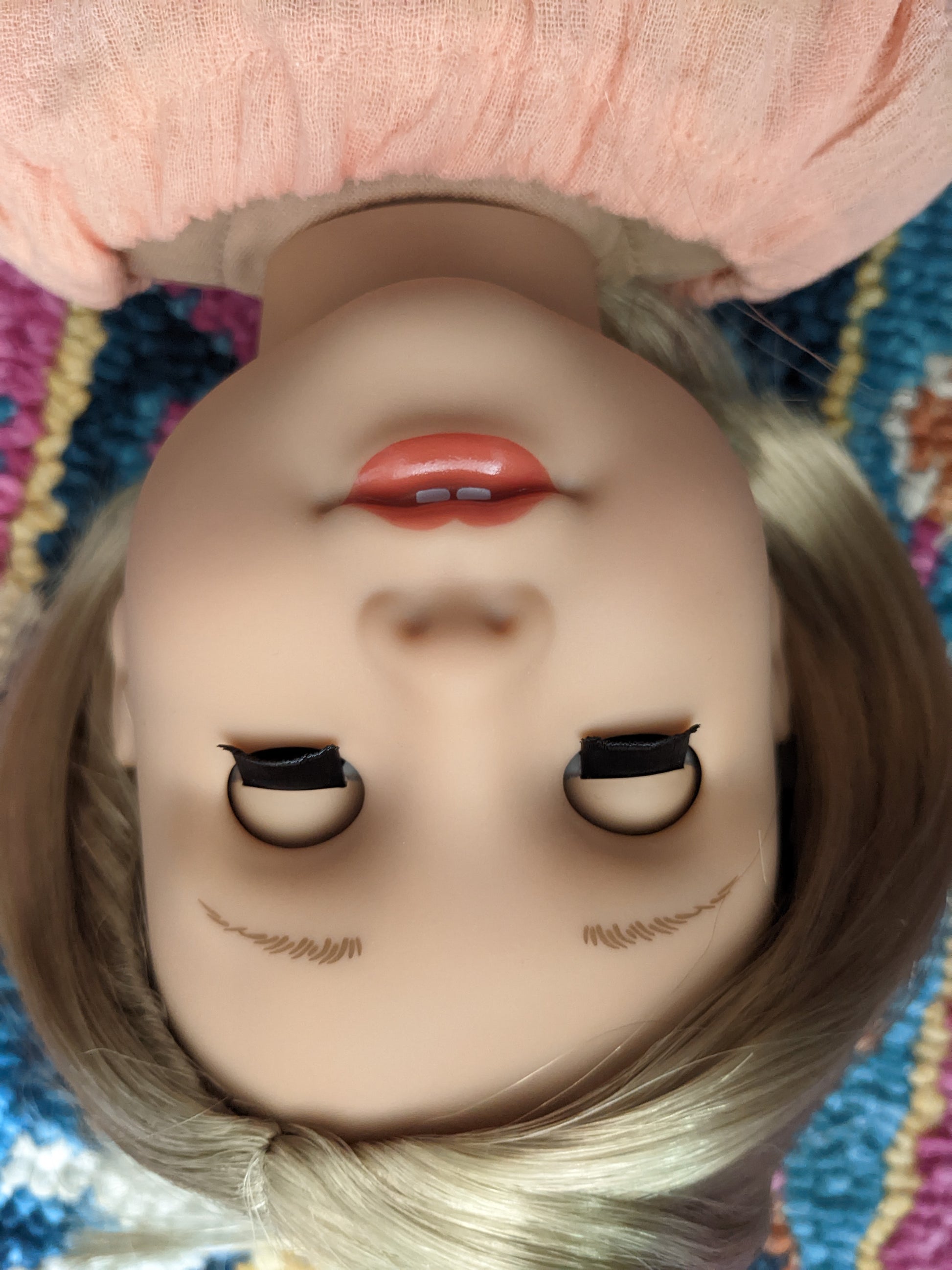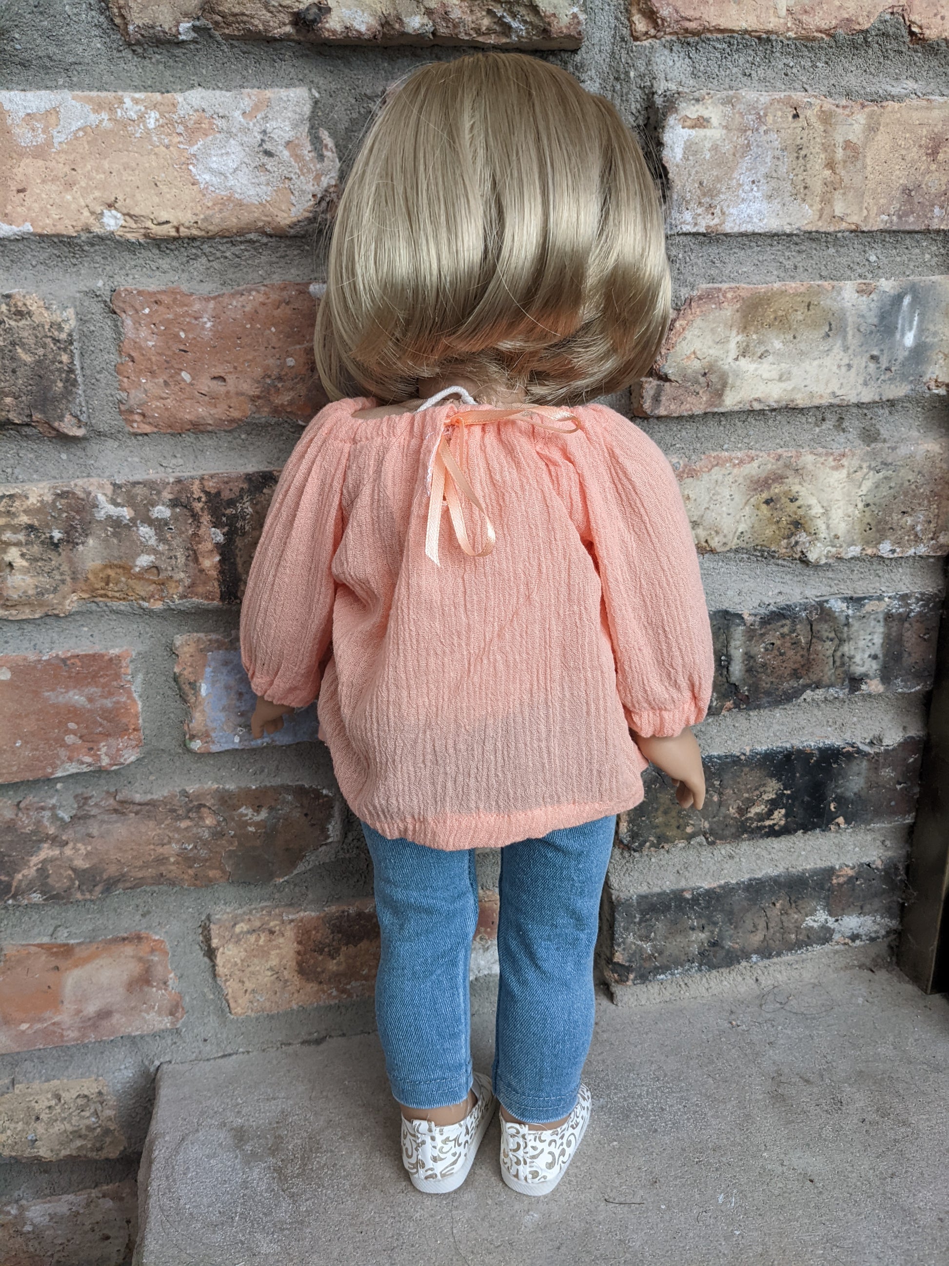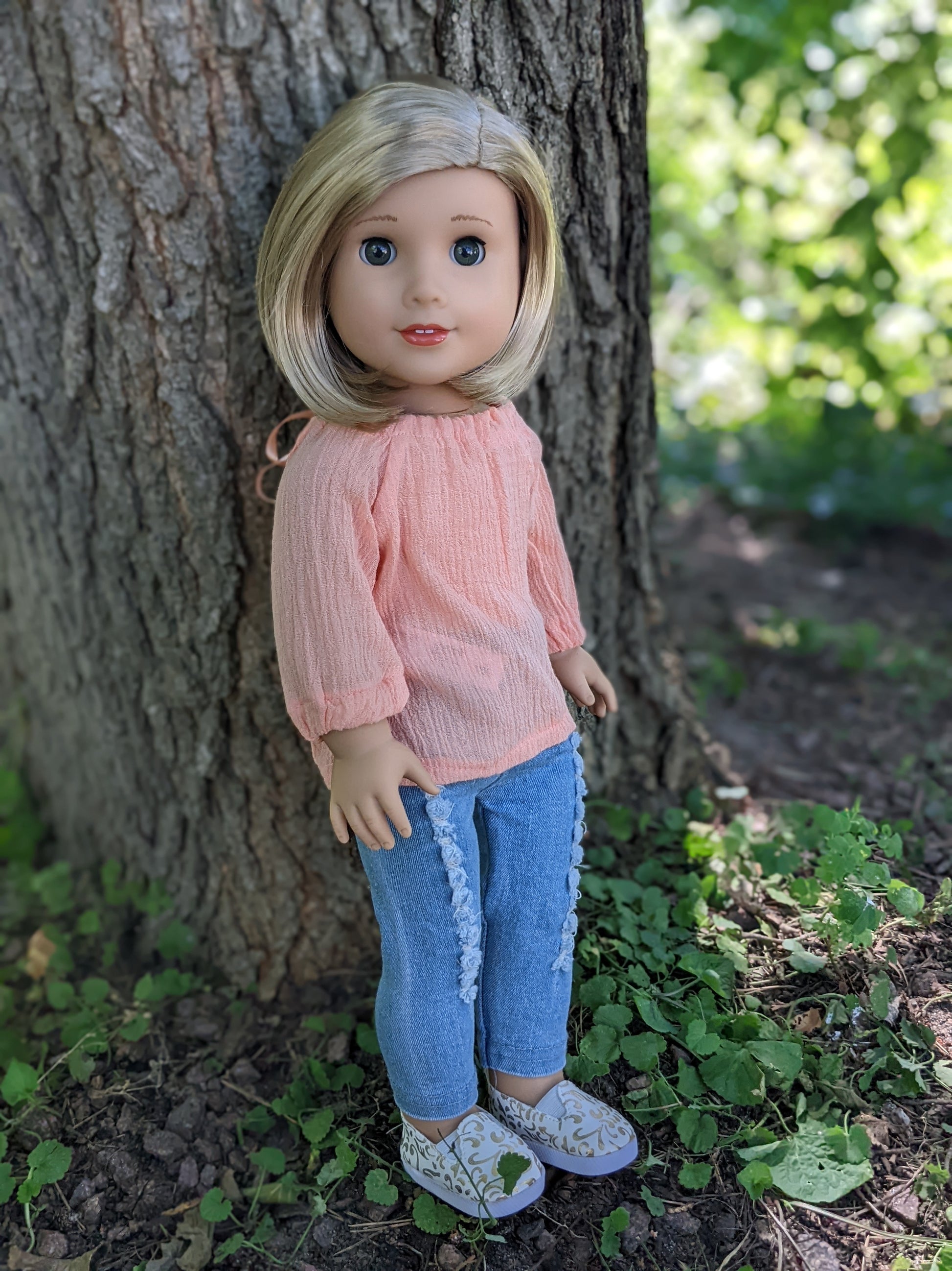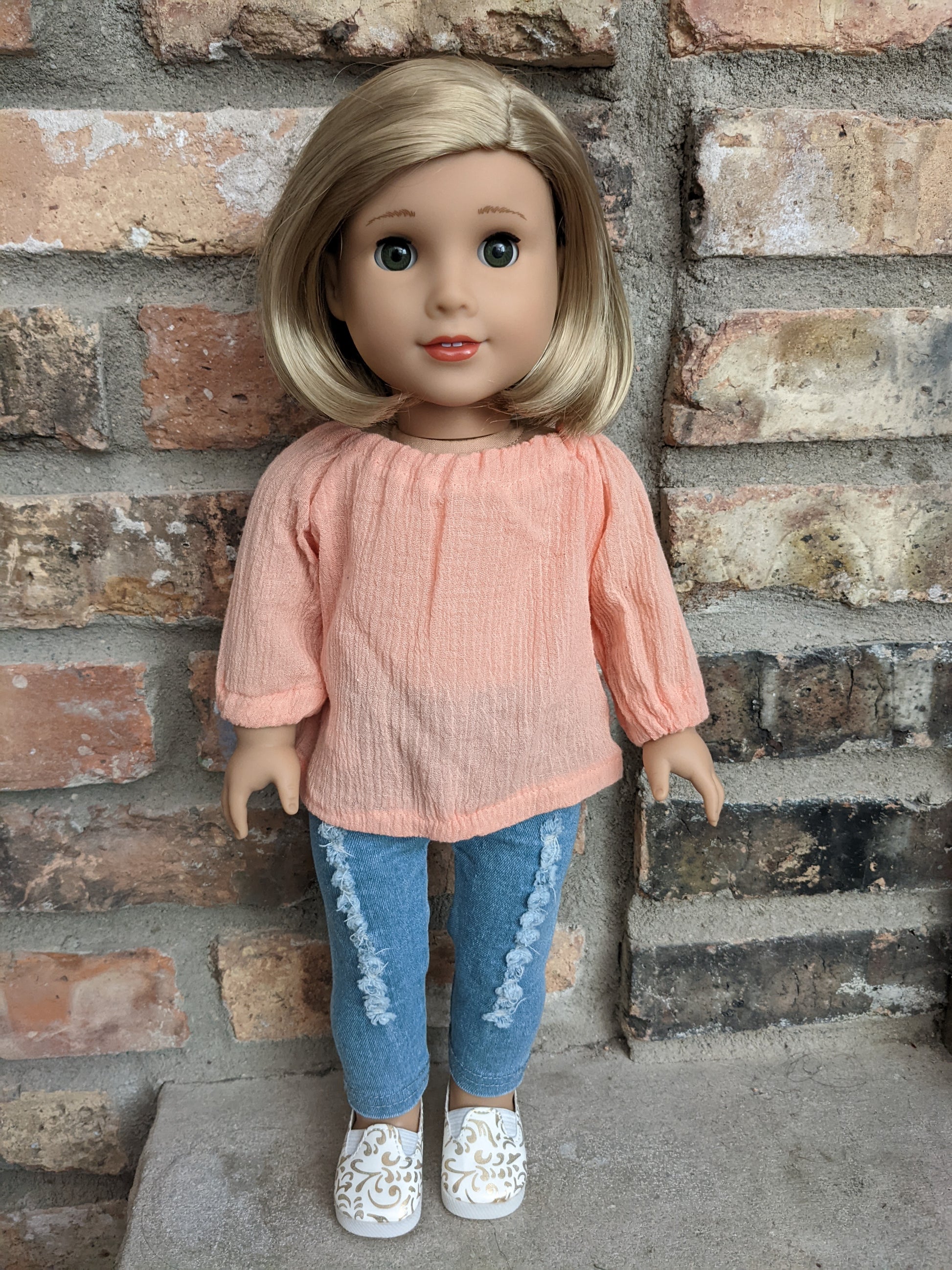 This one of a kind OOAK custom American Girl doll was created with a brand new Joss doll, a blonde bob wig from a new Kit doll, and green eyes. She has lip gloss that was hand painted and sealed. She may have some minor shine marks from handling. She comes with the outfit pictured.
