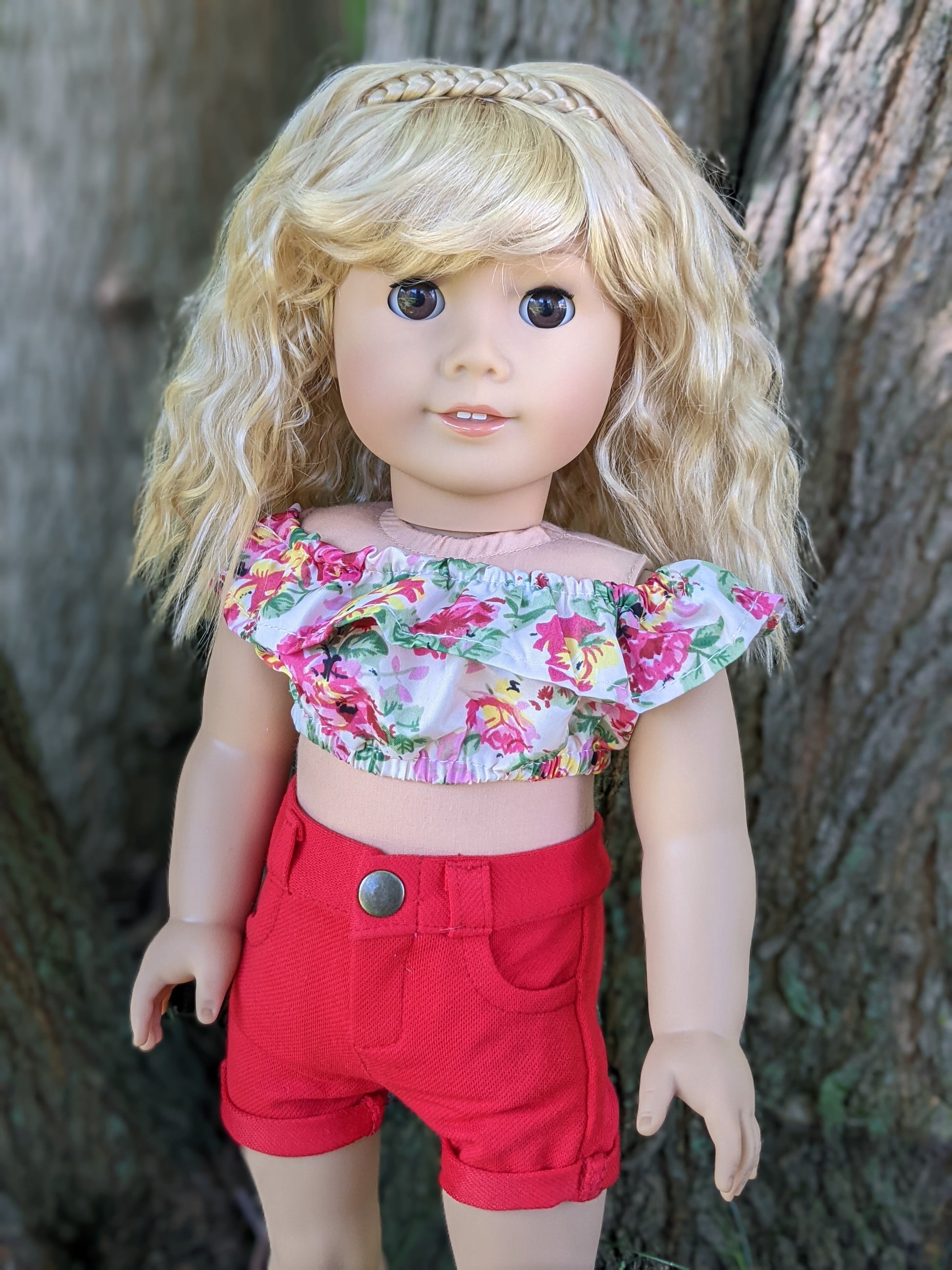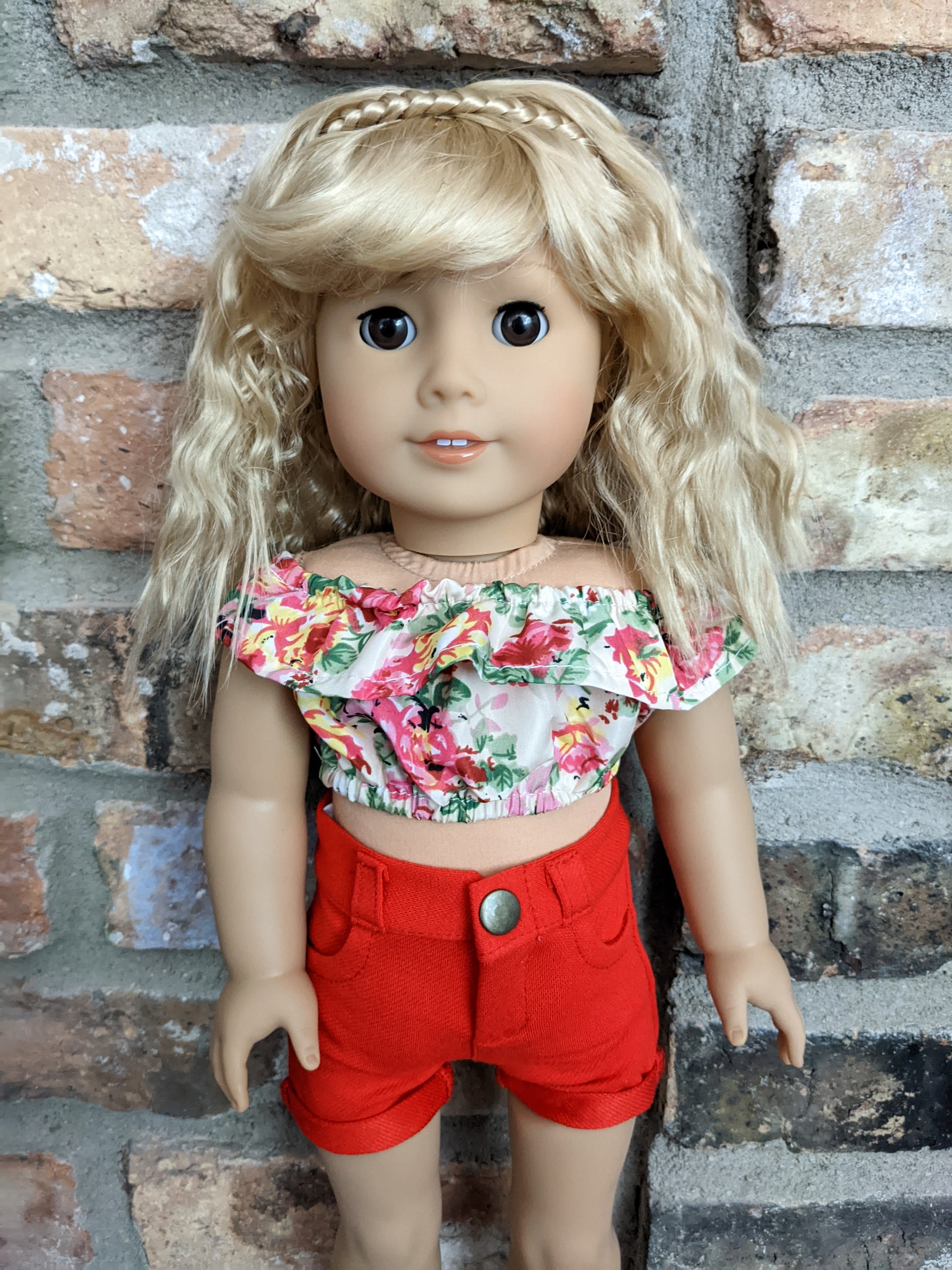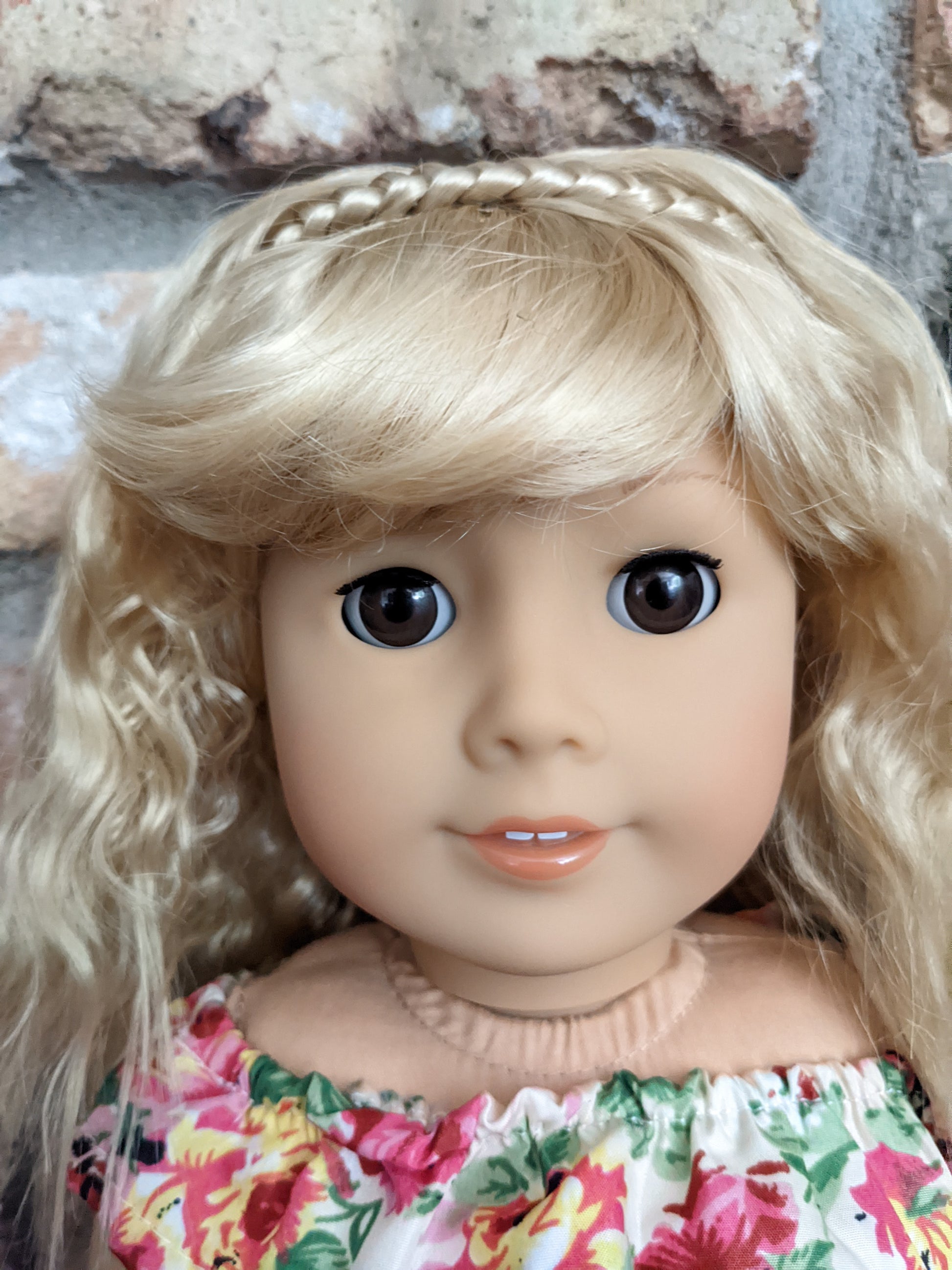 This one of a kind OOAK custom American Girl doll was created with a brand new Truly Me doll, a blonde super soft vegan mohair wig with bangs, and brown eyes. She has lip gloss that was hand painted and sealed. She may have some minor shine marks from handling. She comes with the outfit pictured. She has the microfiber cloth body with permapanties and a tiny x on her bum.