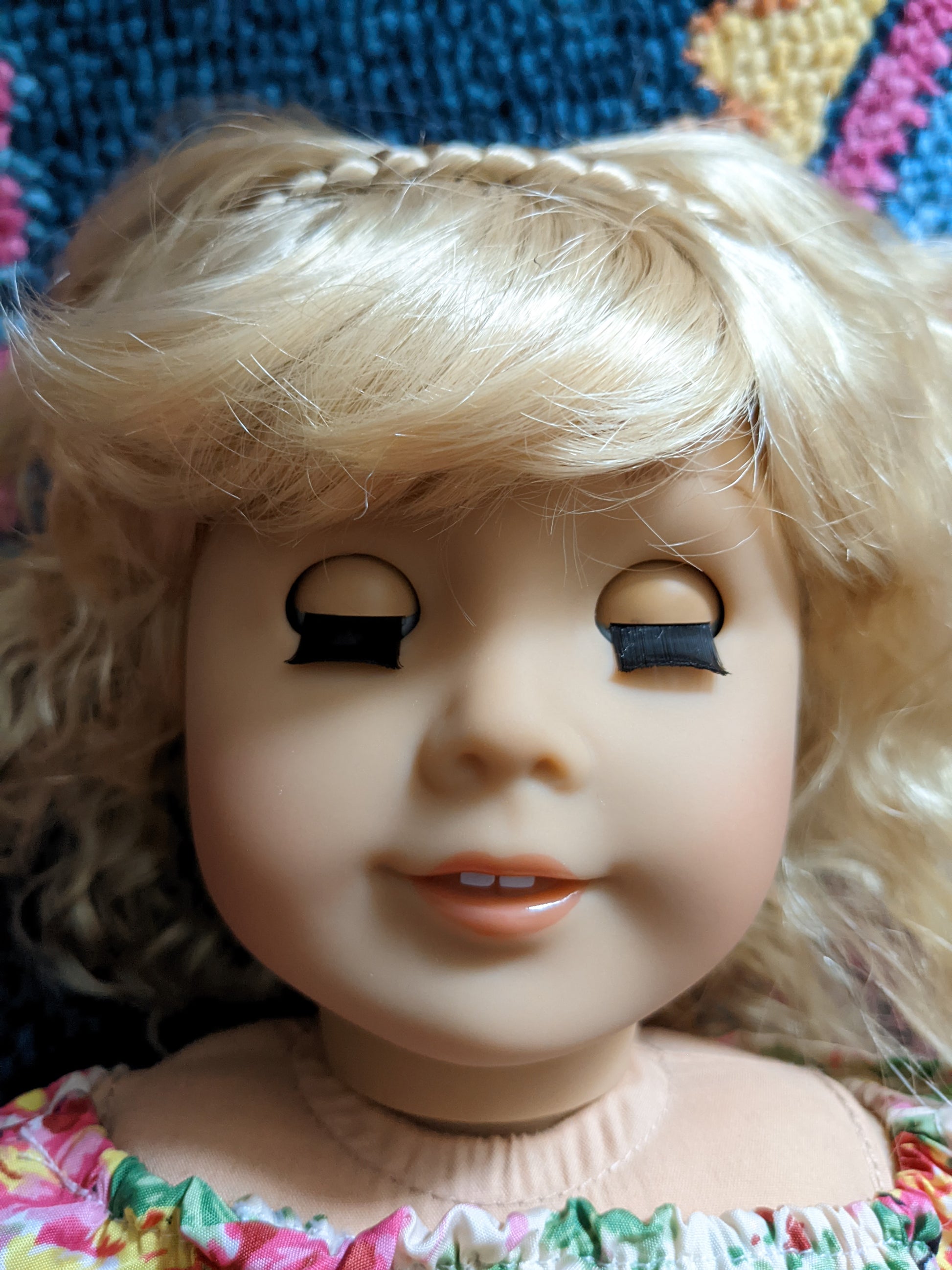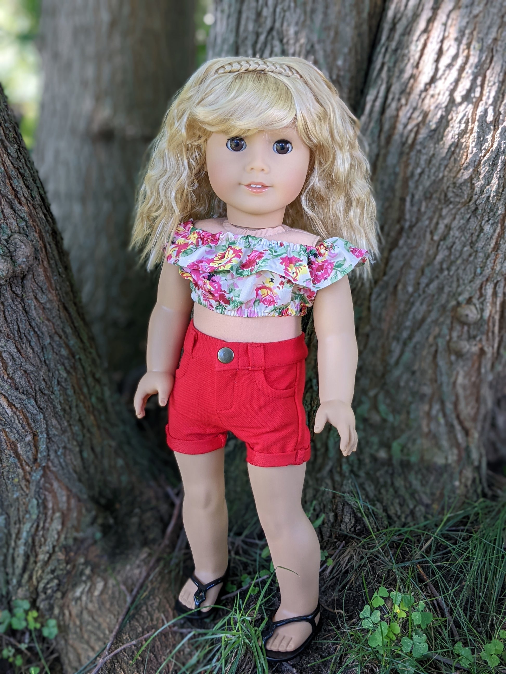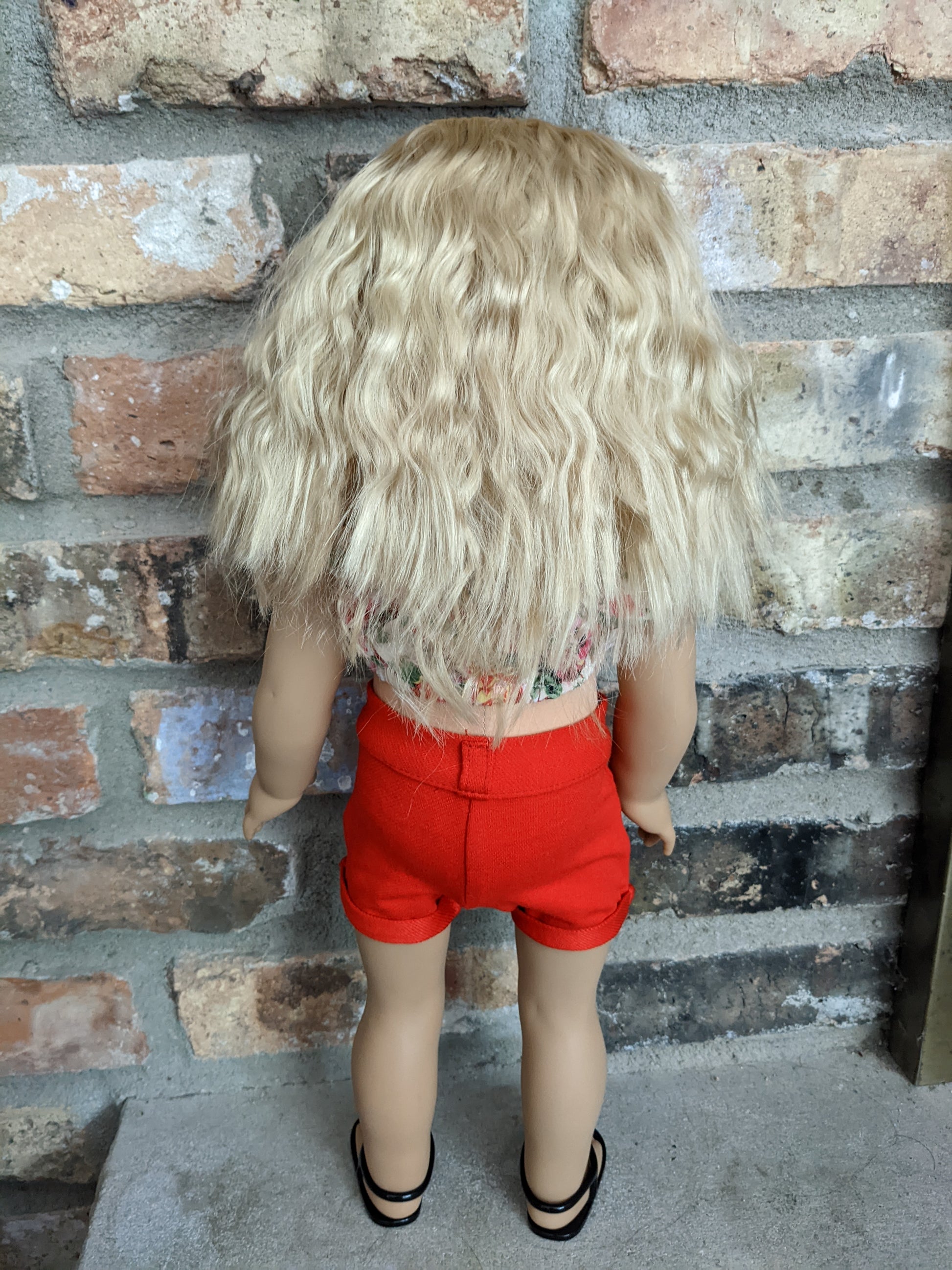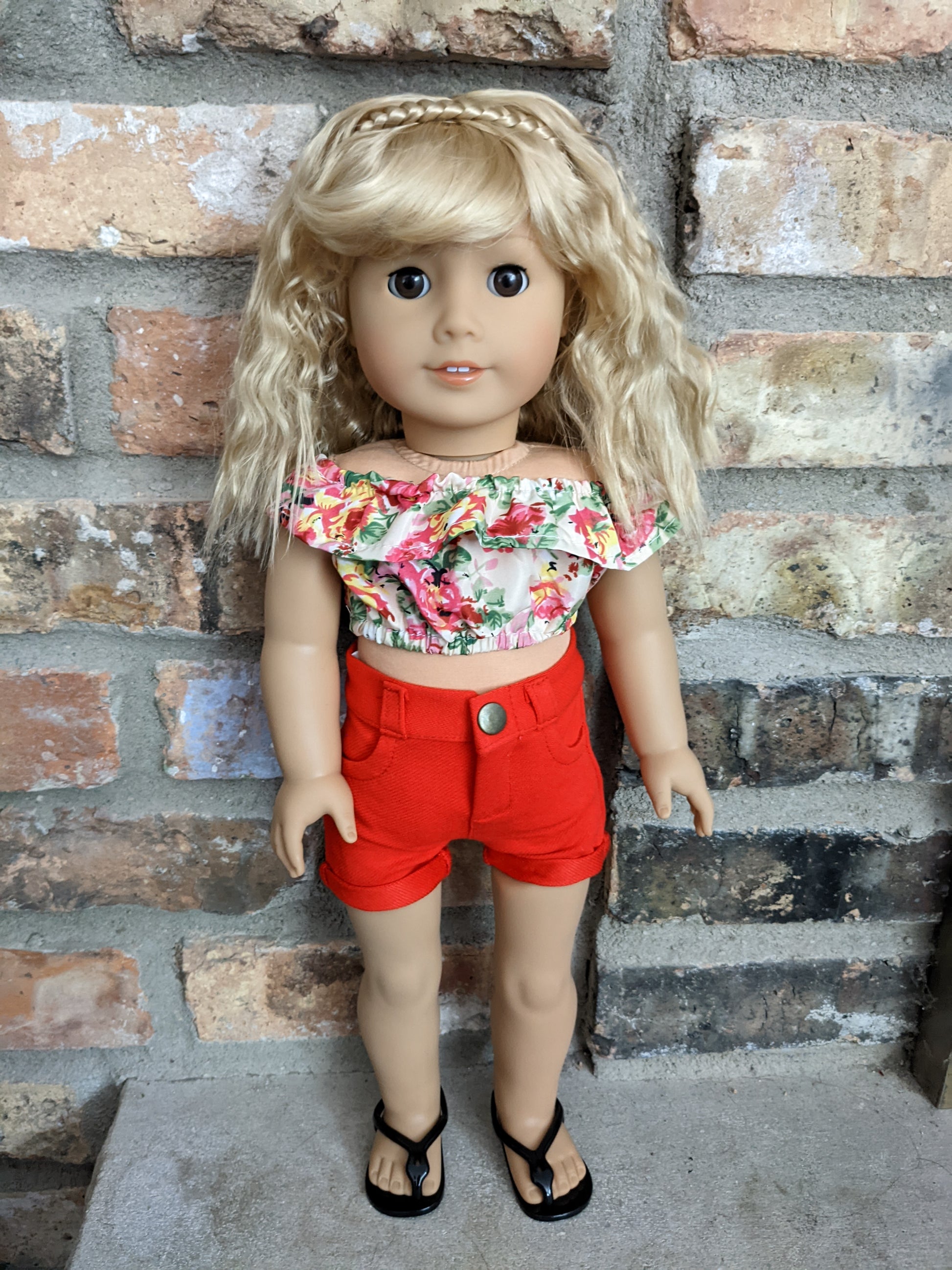 This one of a kind OOAK custom American Girl doll was created with a brand new Truly Me doll, a blonde super soft vegan mohair wig with bangs, and brown eyes. She has lip gloss that was hand painted and sealed. She may have some minor shine marks from handling. She comes with the outfit pictured. She has the microfiber cloth body with permapanties and a tiny x on her bum.