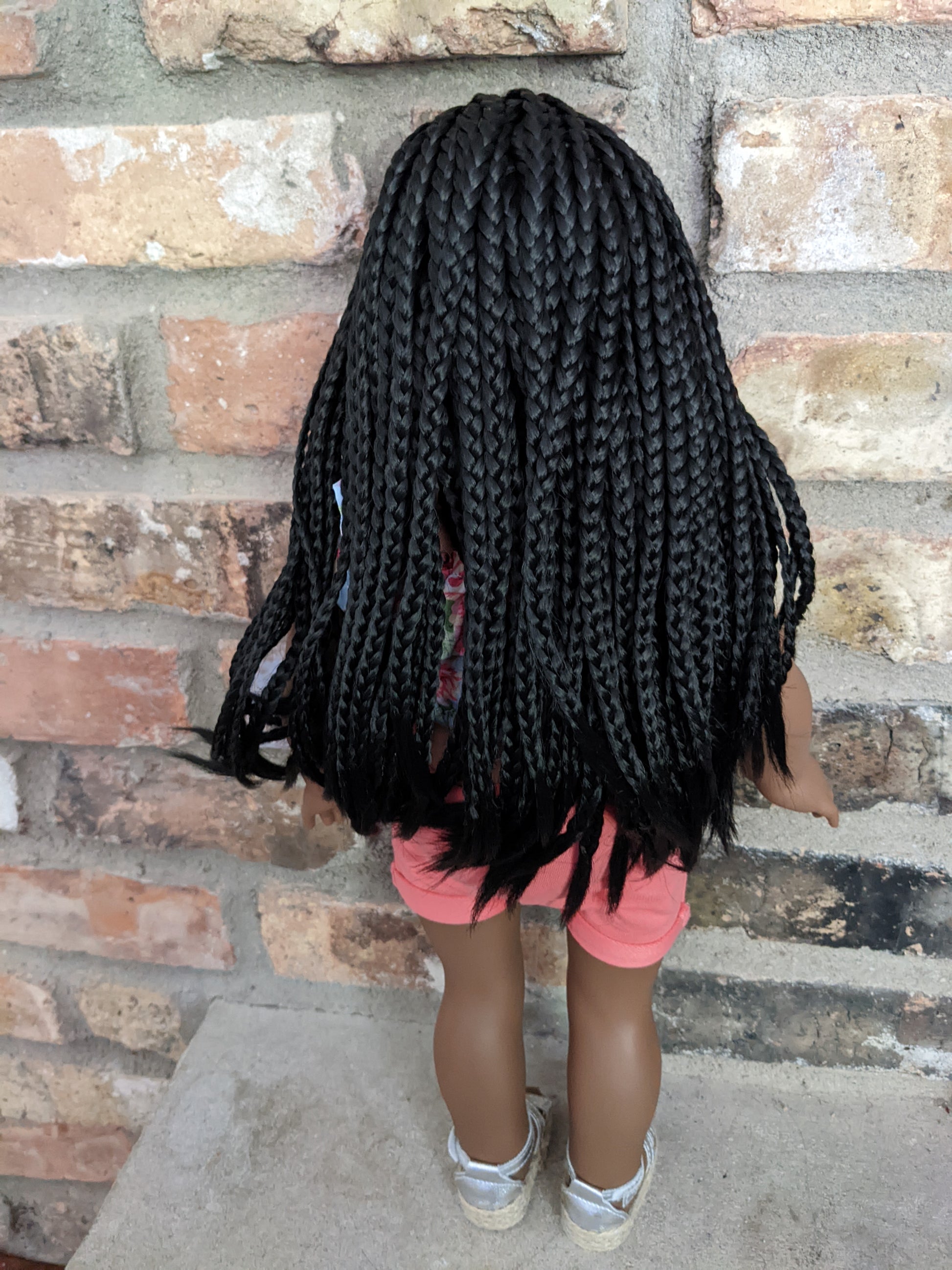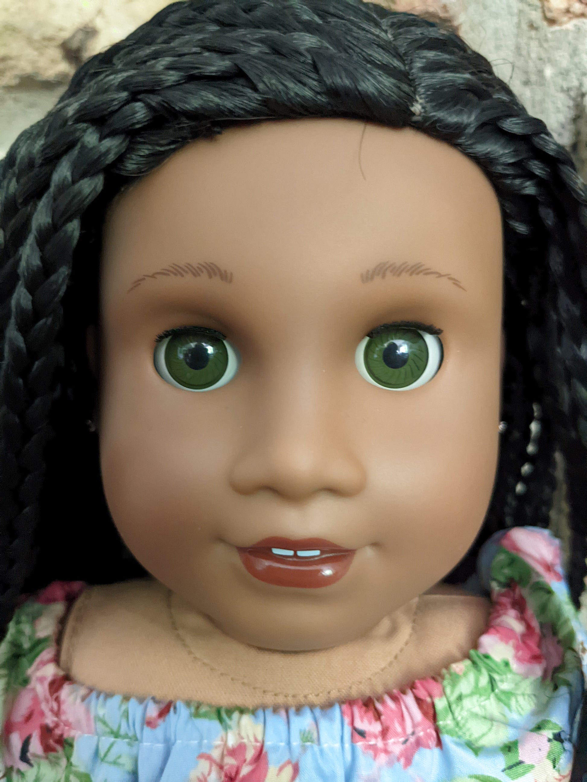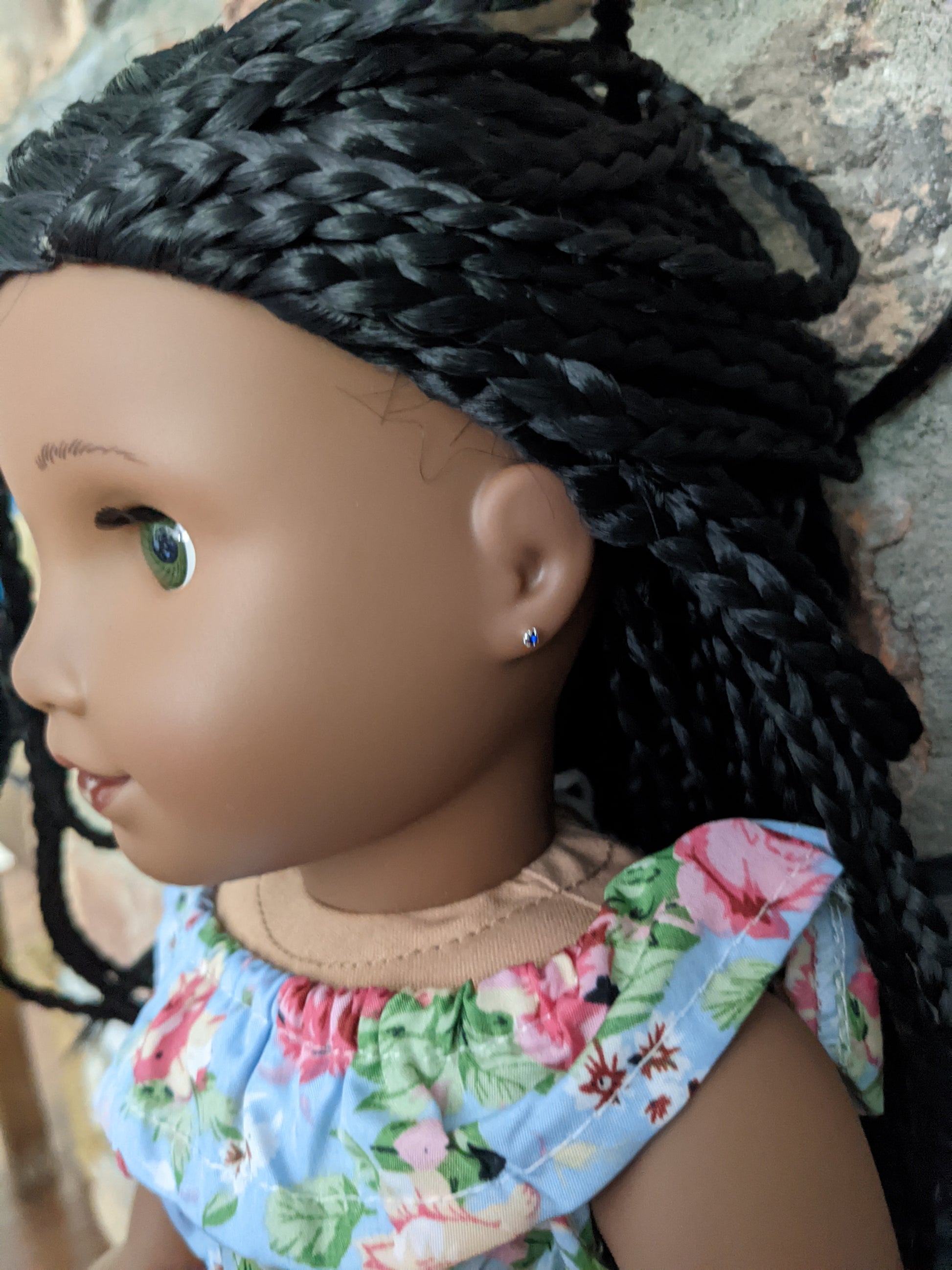This one of a kind OOAK custom American Girl doll was created with a brand new Sparkling Ballerina doll, a black braided wig, and green eyes. She has lip gloss that was hand painted and sealed. She may have some minor shine marks from handling. She comes with the outfit pictured. Her ears are pierced with normal earrings and the tiny diamond look studs are included.