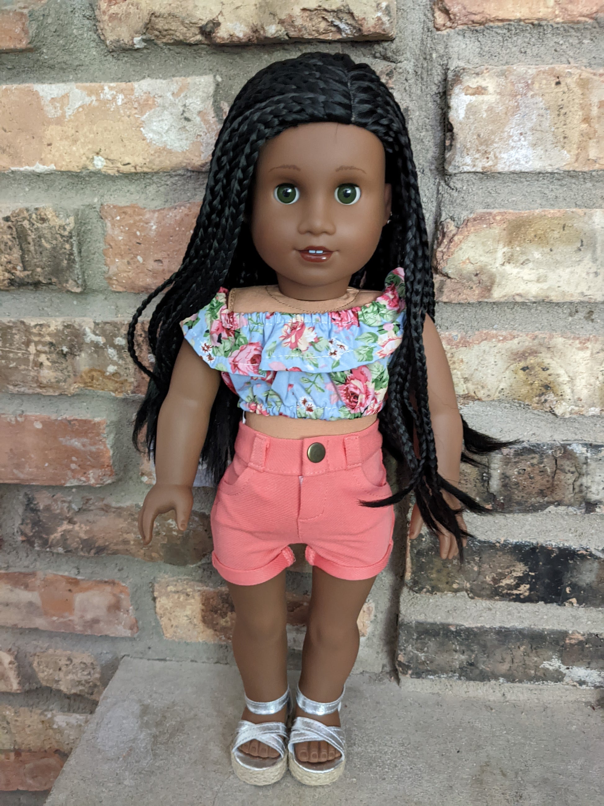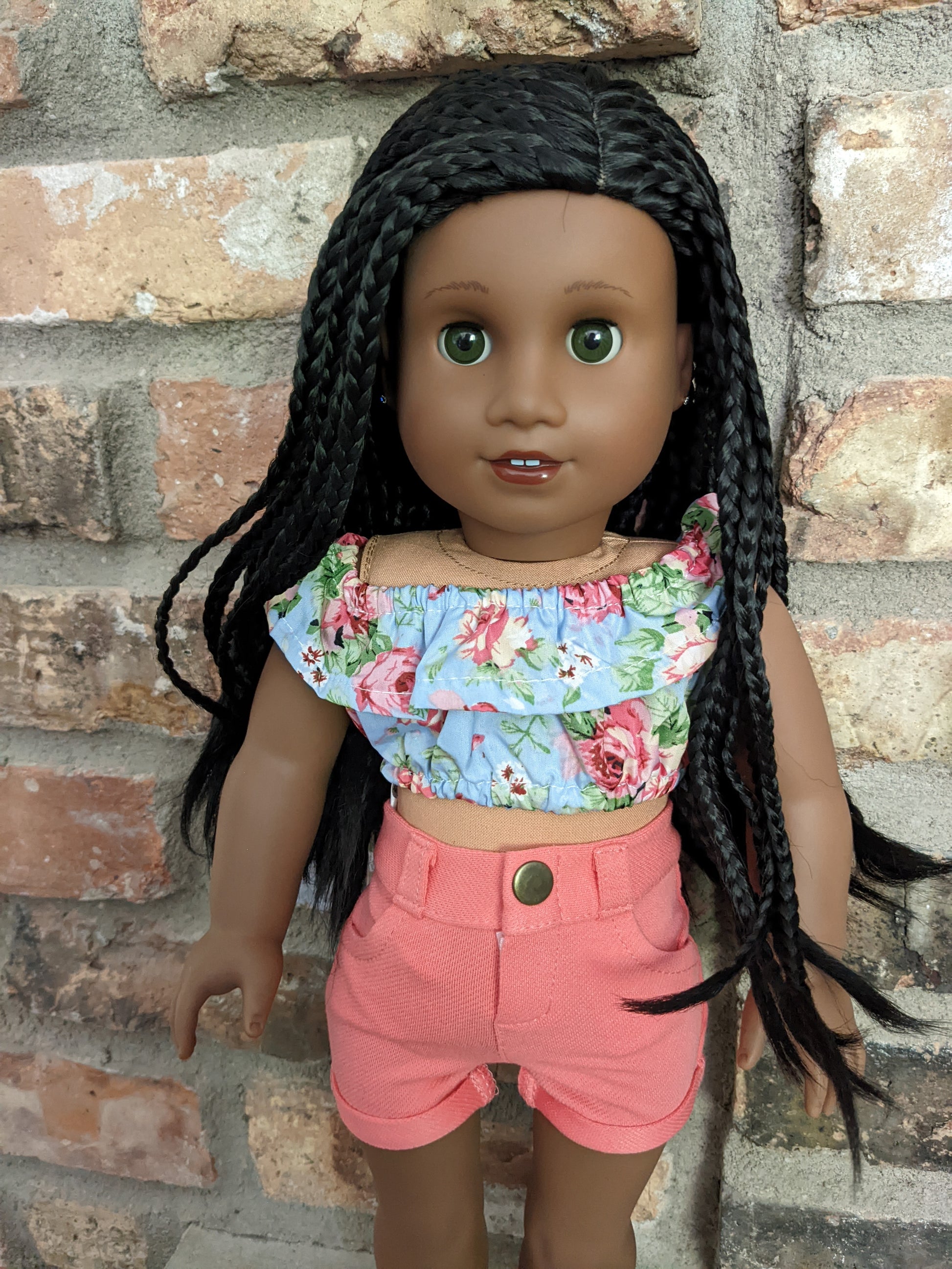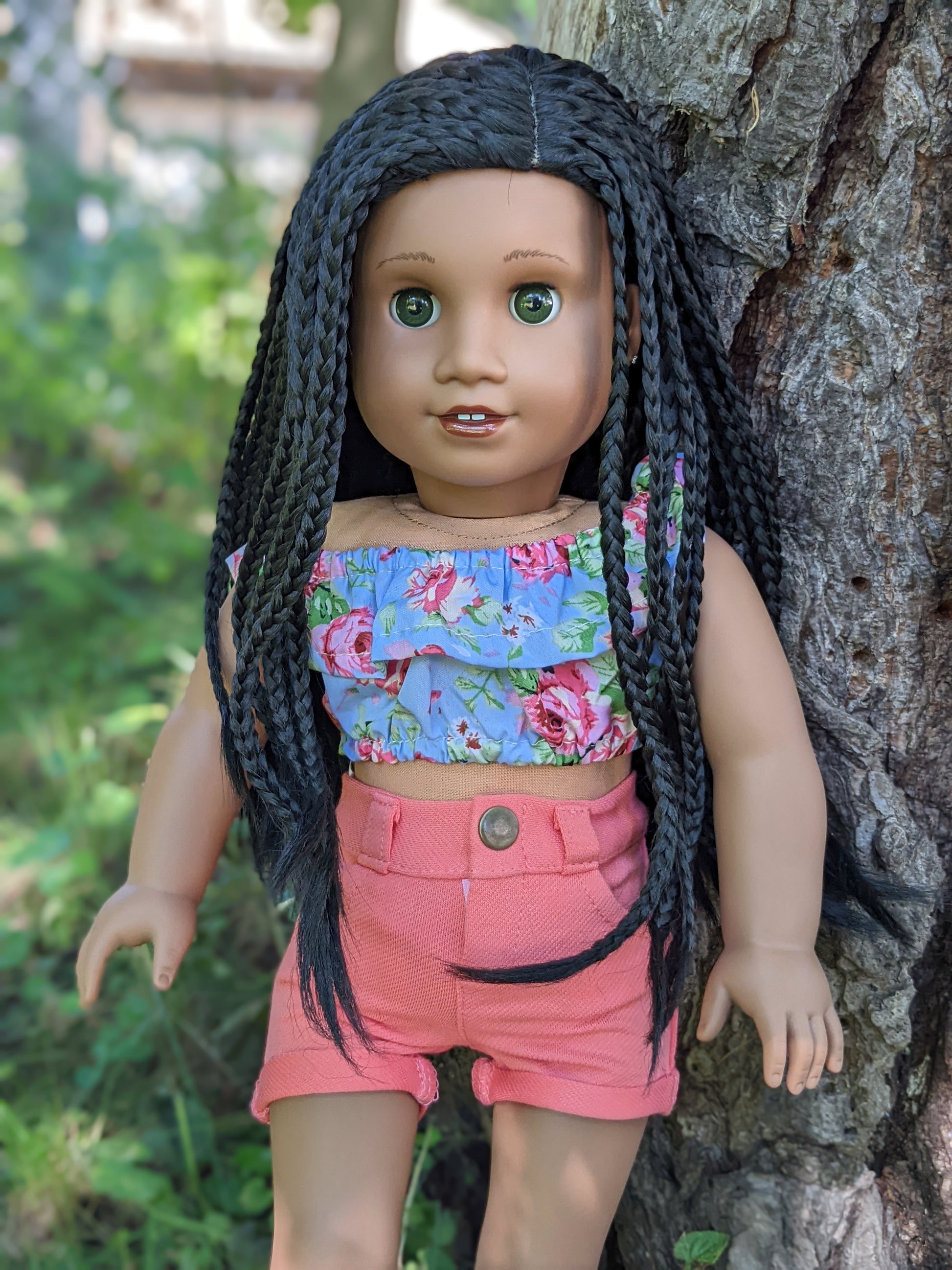 This one of a kind OOAK custom American Girl doll was created with a brand new Sparkling Ballerina doll, a black braided wig, and green eyes. She has lip gloss that was hand painted and sealed. She may have some minor shine marks from handling. She comes with the outfit pictured. Her ears are pierced with normal earrings and the tiny diamond look studs are included.