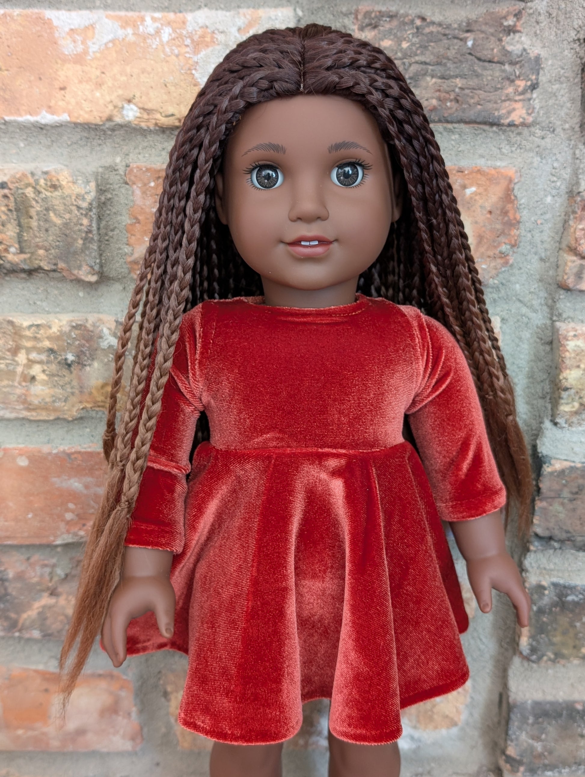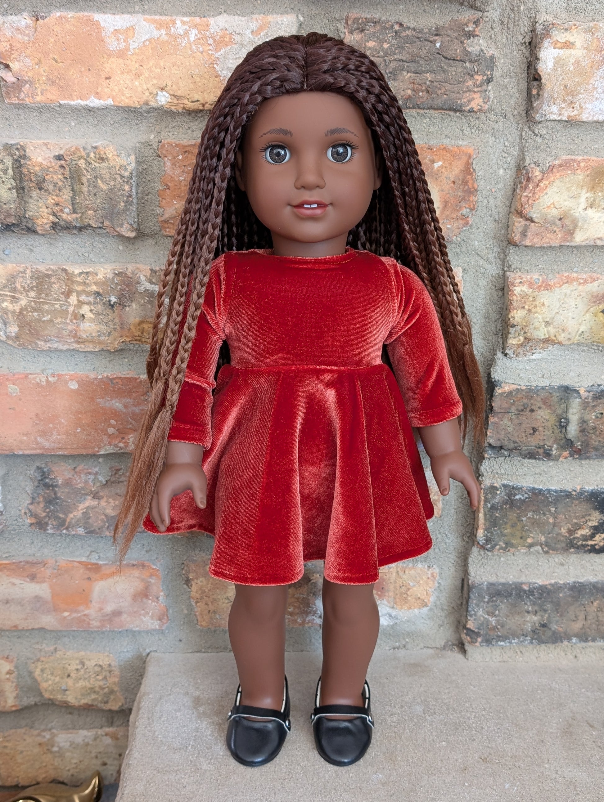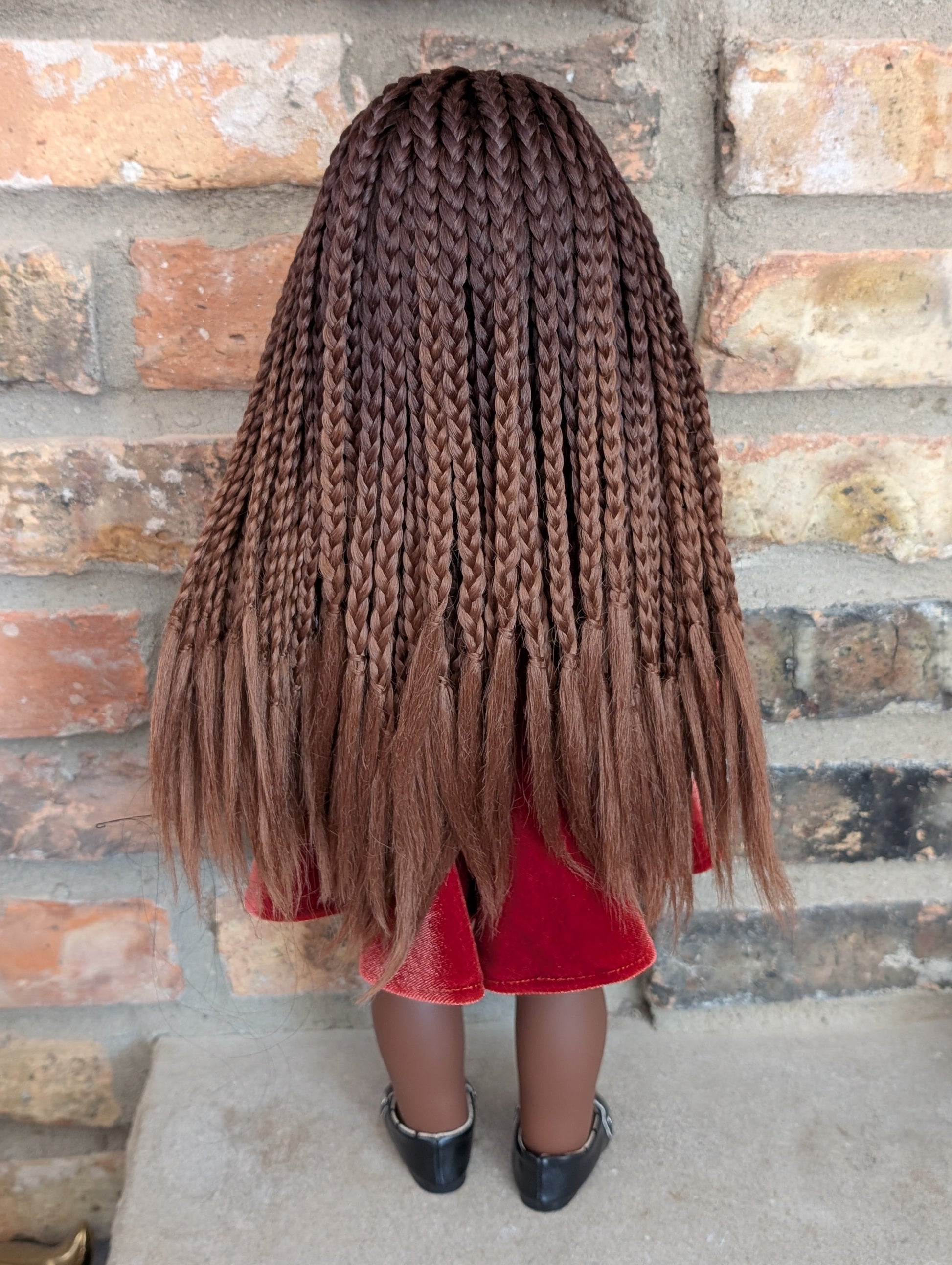 This one of a kind OOAK custom American Girl doll was created with a brand new doll, a brown wig, and brown decal eyes. She may have some minor shine marks from handling. She comes with the outfit pictured.