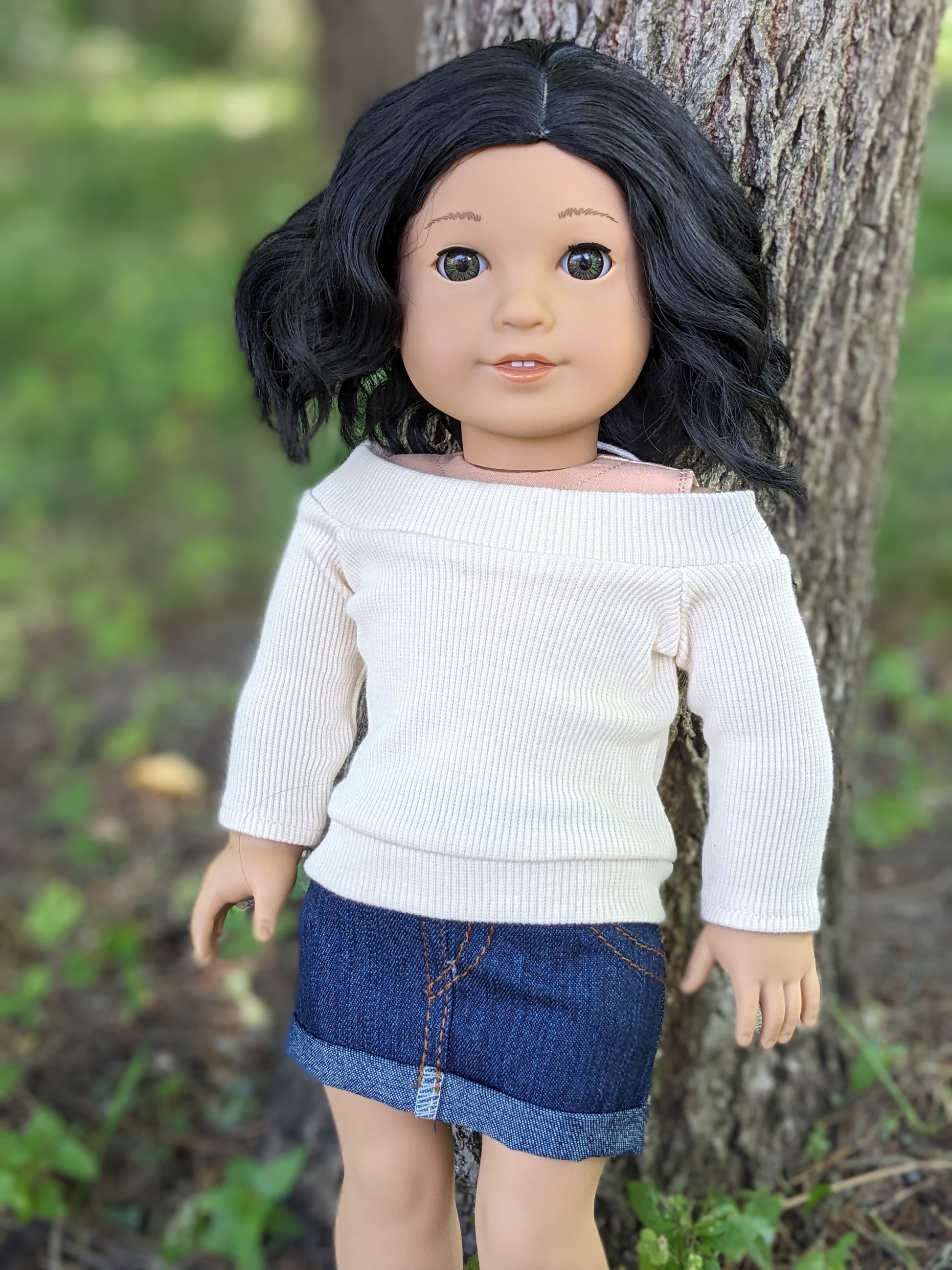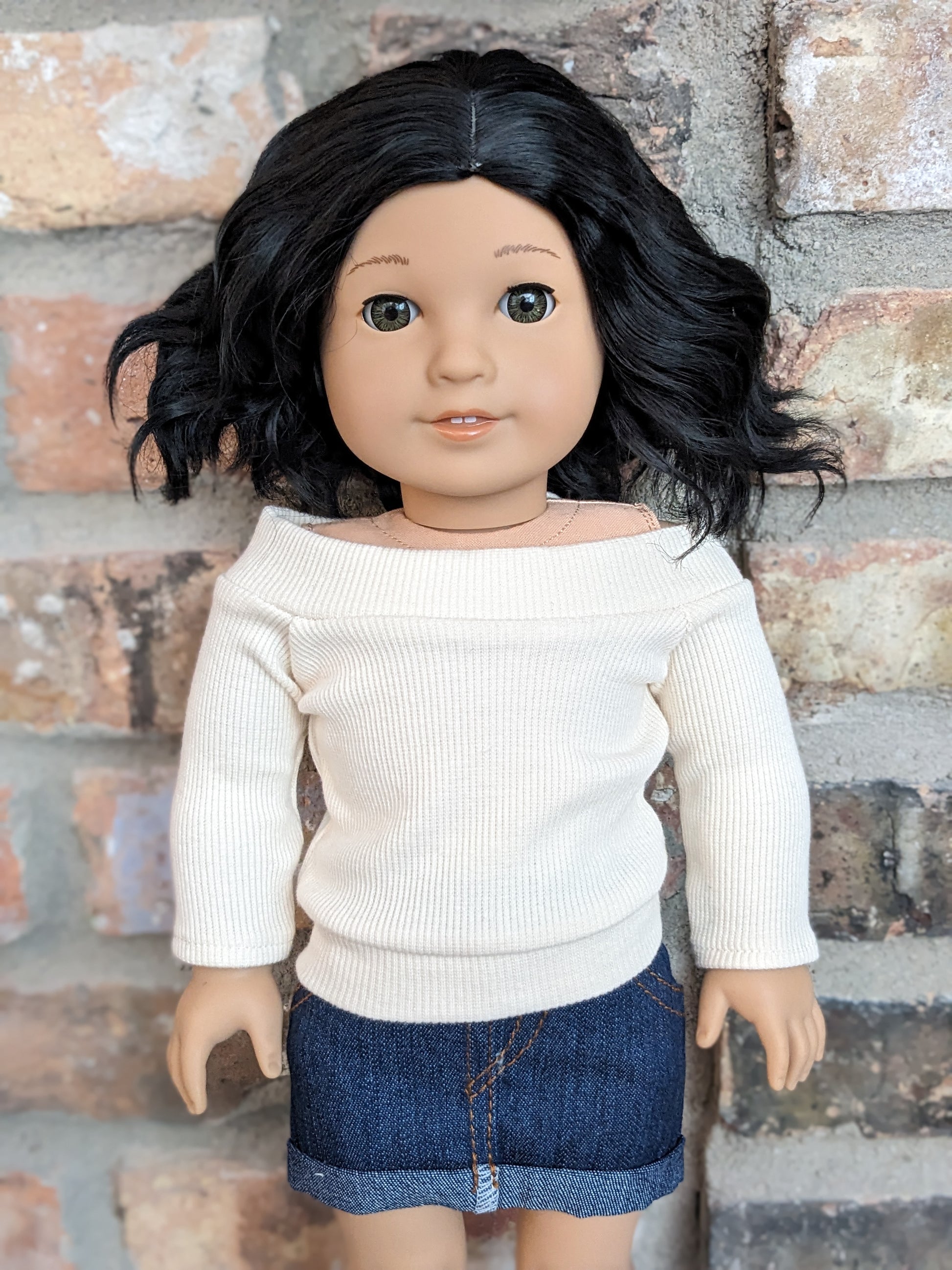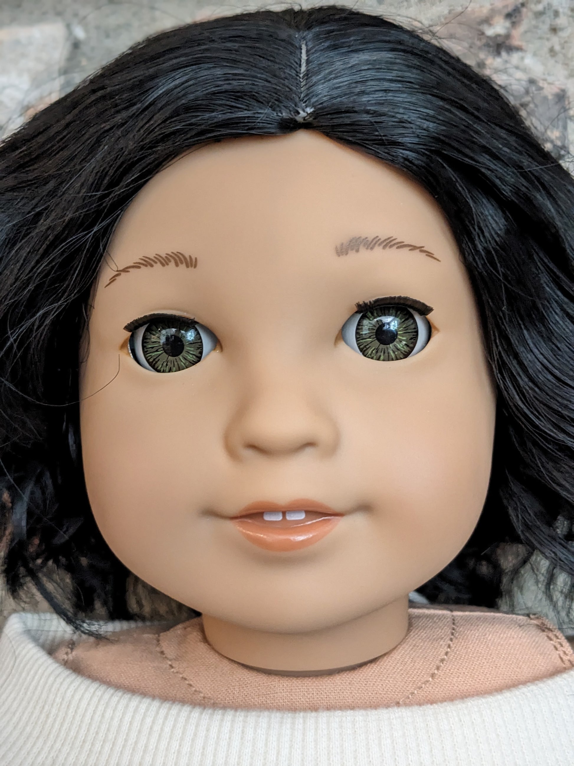 This one of a kind OOAK custom American Girl doll was created with a brand new Truly Me doll, a black wig, and hazel eyes. She has lip gloss that was hand painted and sealed. She may have some minor shine marks from handling. She comes with the outfit pictured. She has a microfiber cloth body.