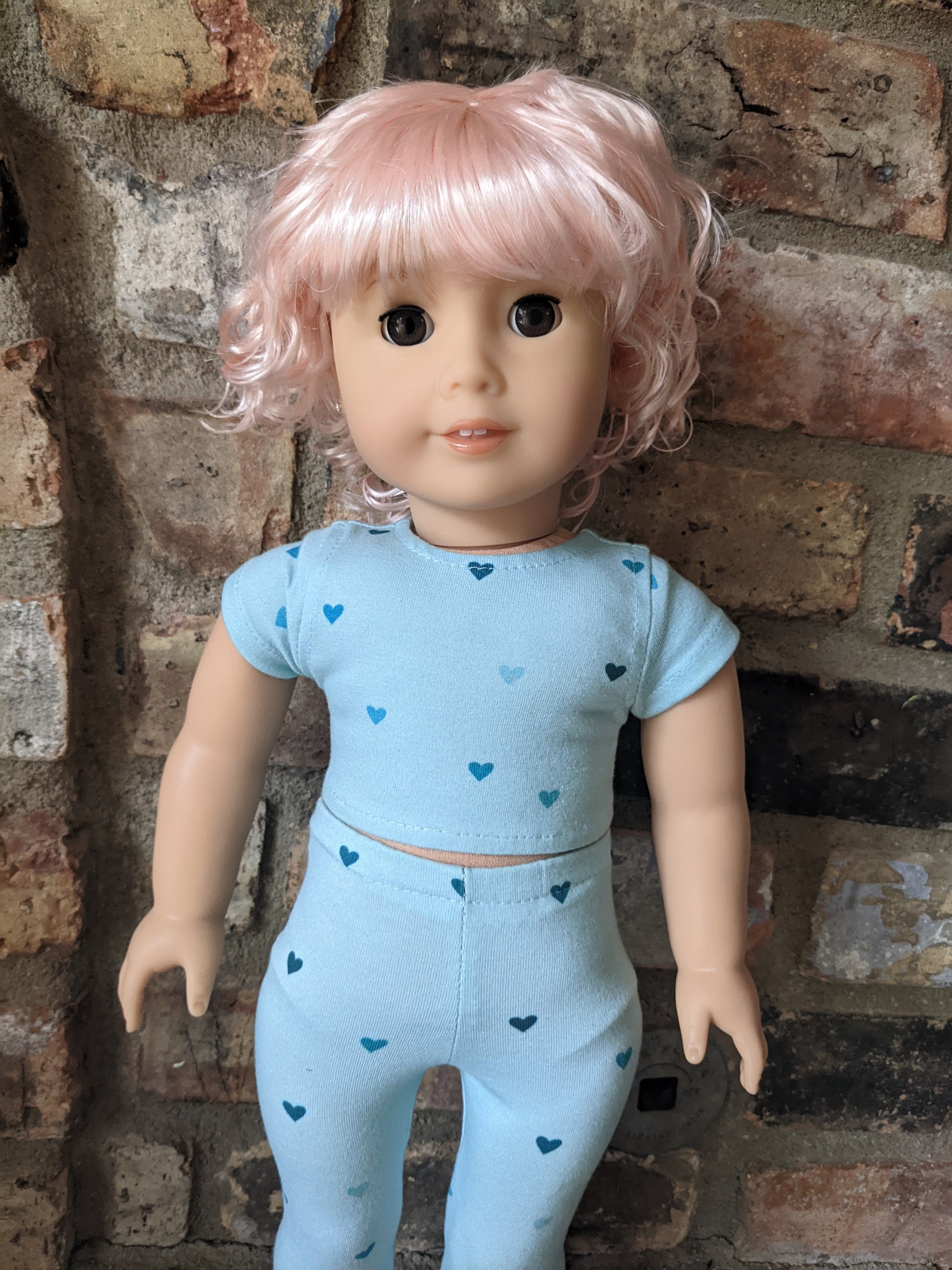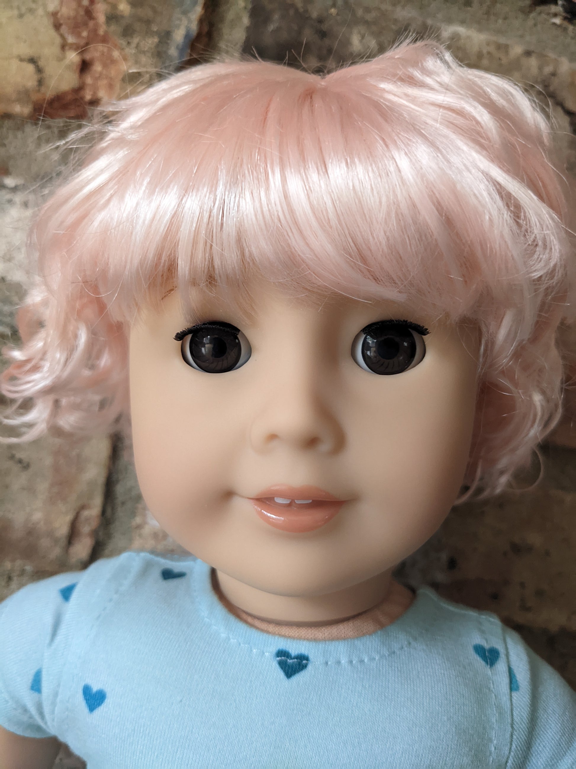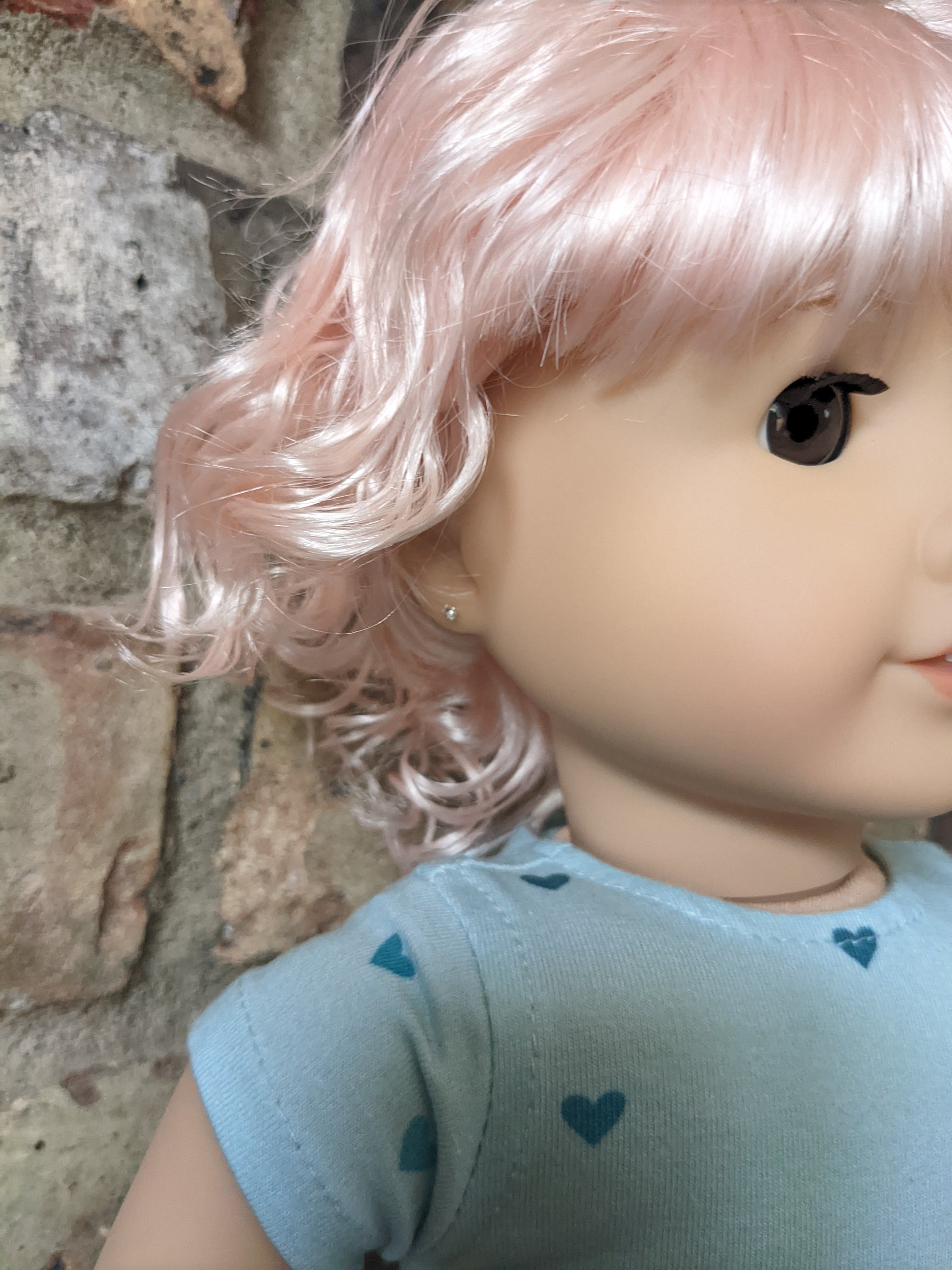 This one of a kind OOAK custom American Girl doll was created with a brand new Truly Me doll, a pink vegan mohair wig with bangs, and brown eyes. She has lip gloss that was hand painted and sealed. She may have some minor shine marks from handling. She comes with the outfit pictured. Her ears are pierced with normal earrings and the tiny diamond look studs are included.