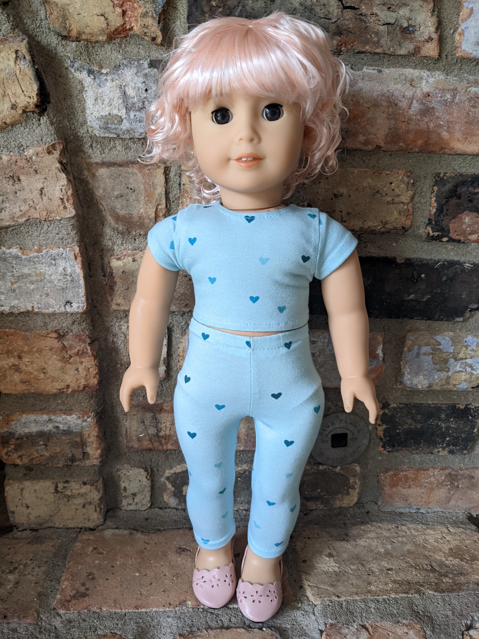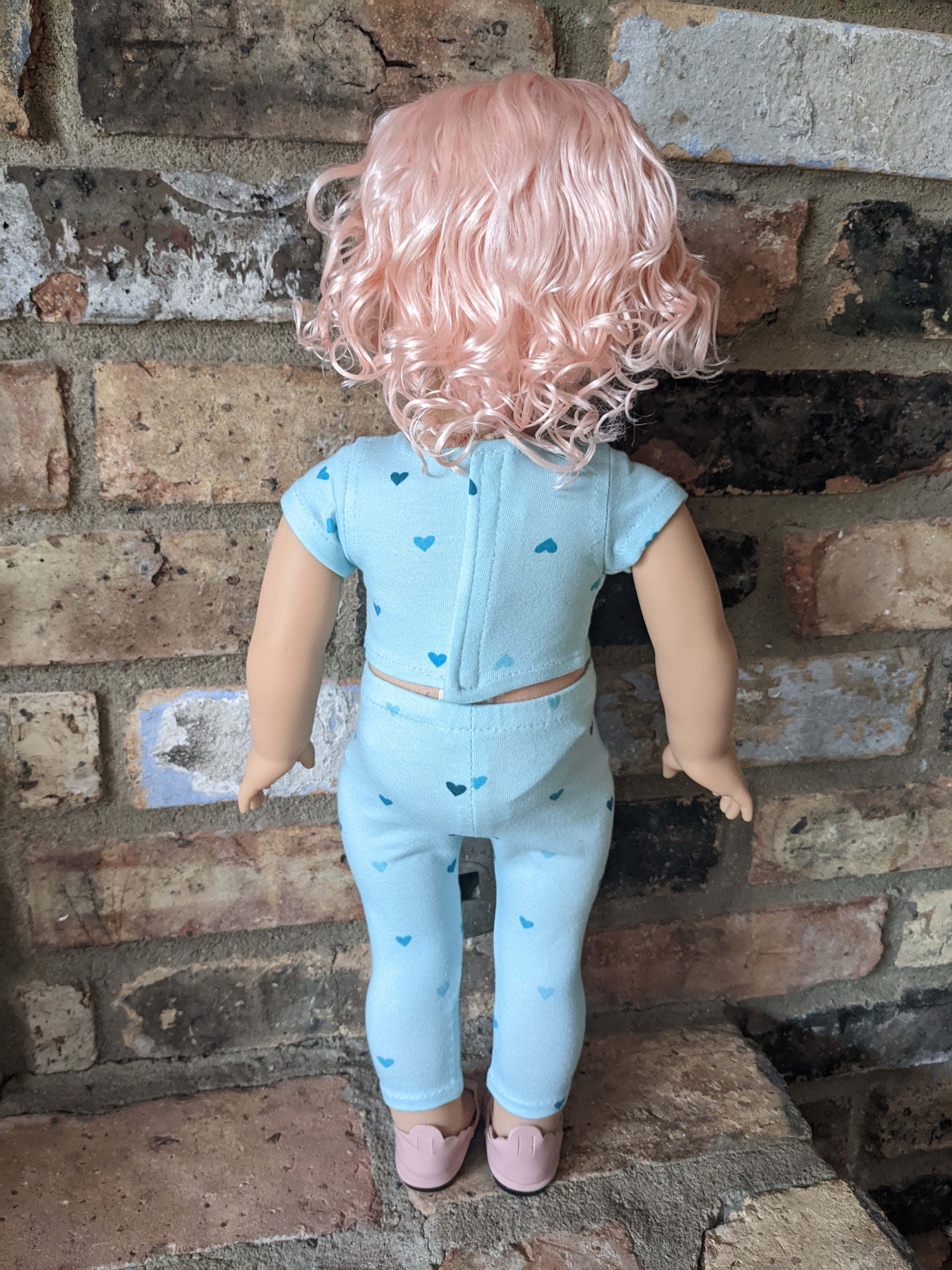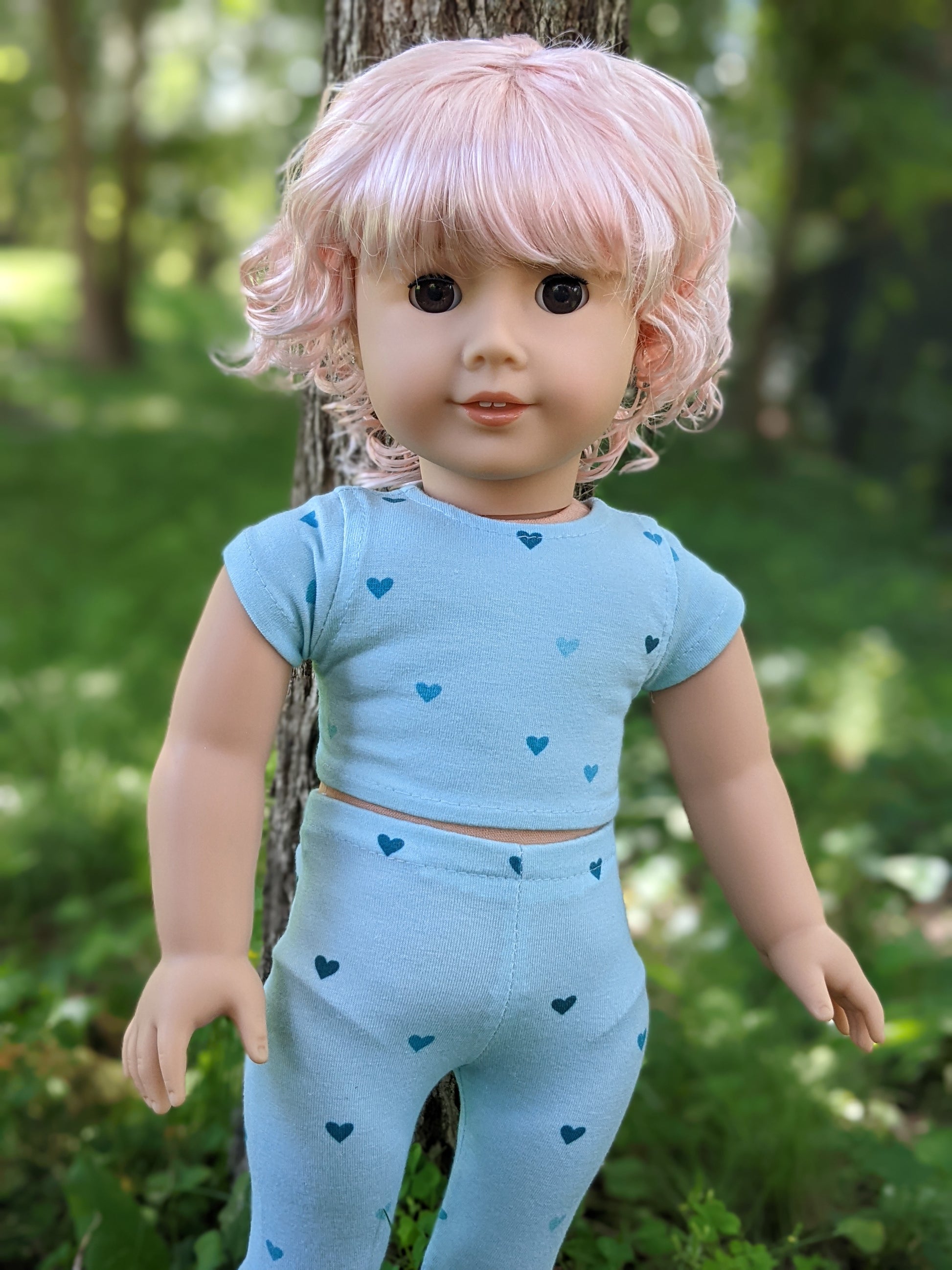 This one of a kind OOAK custom American Girl doll was created with a brand new Truly Me doll, a pink vegan mohair wig with bangs, and brown eyes. She has lip gloss that was hand painted and sealed. She may have some minor shine marks from handling. She comes with the outfit pictured. Her ears are pierced with normal earrings and the tiny diamond look studs are included.
