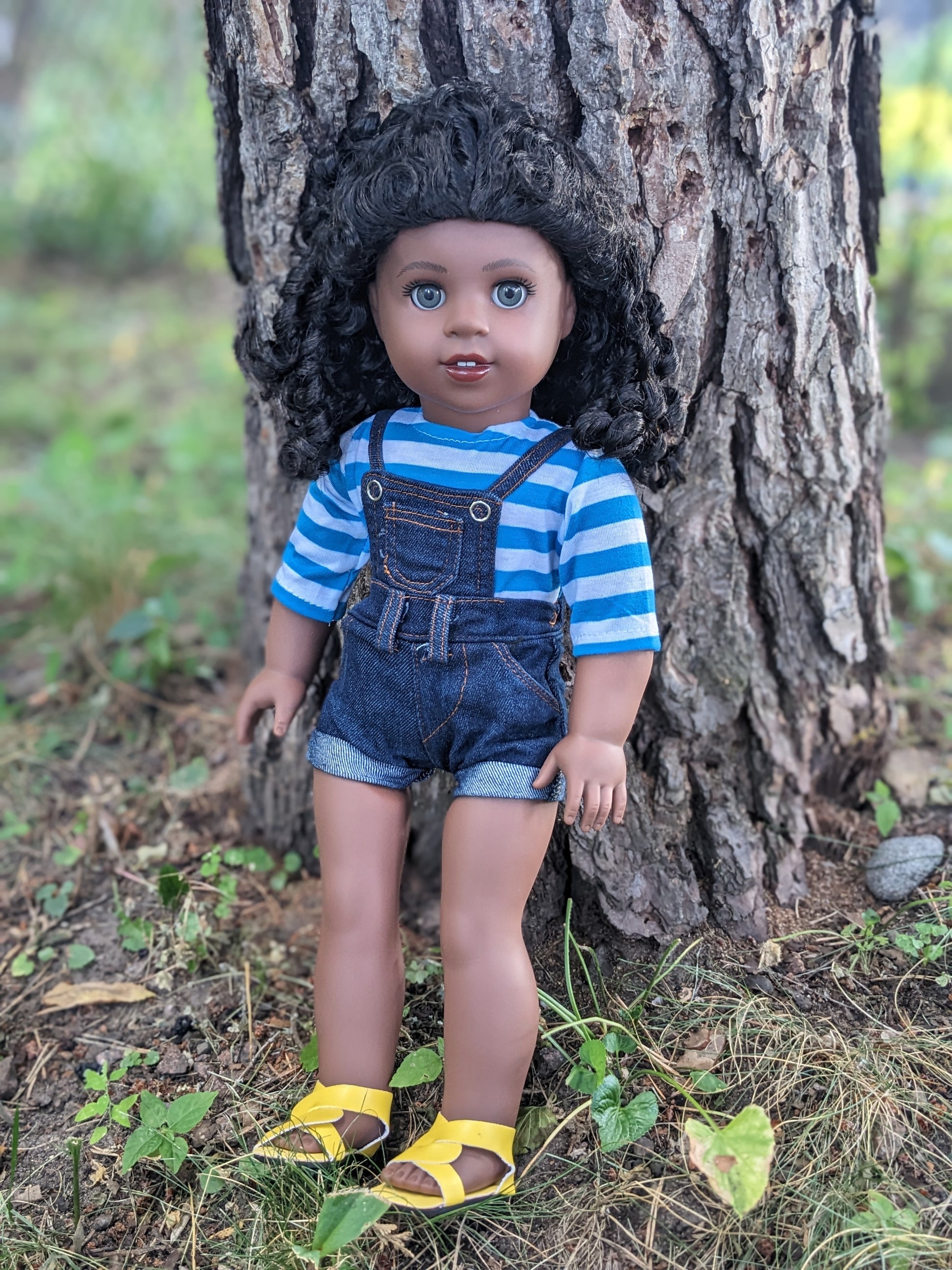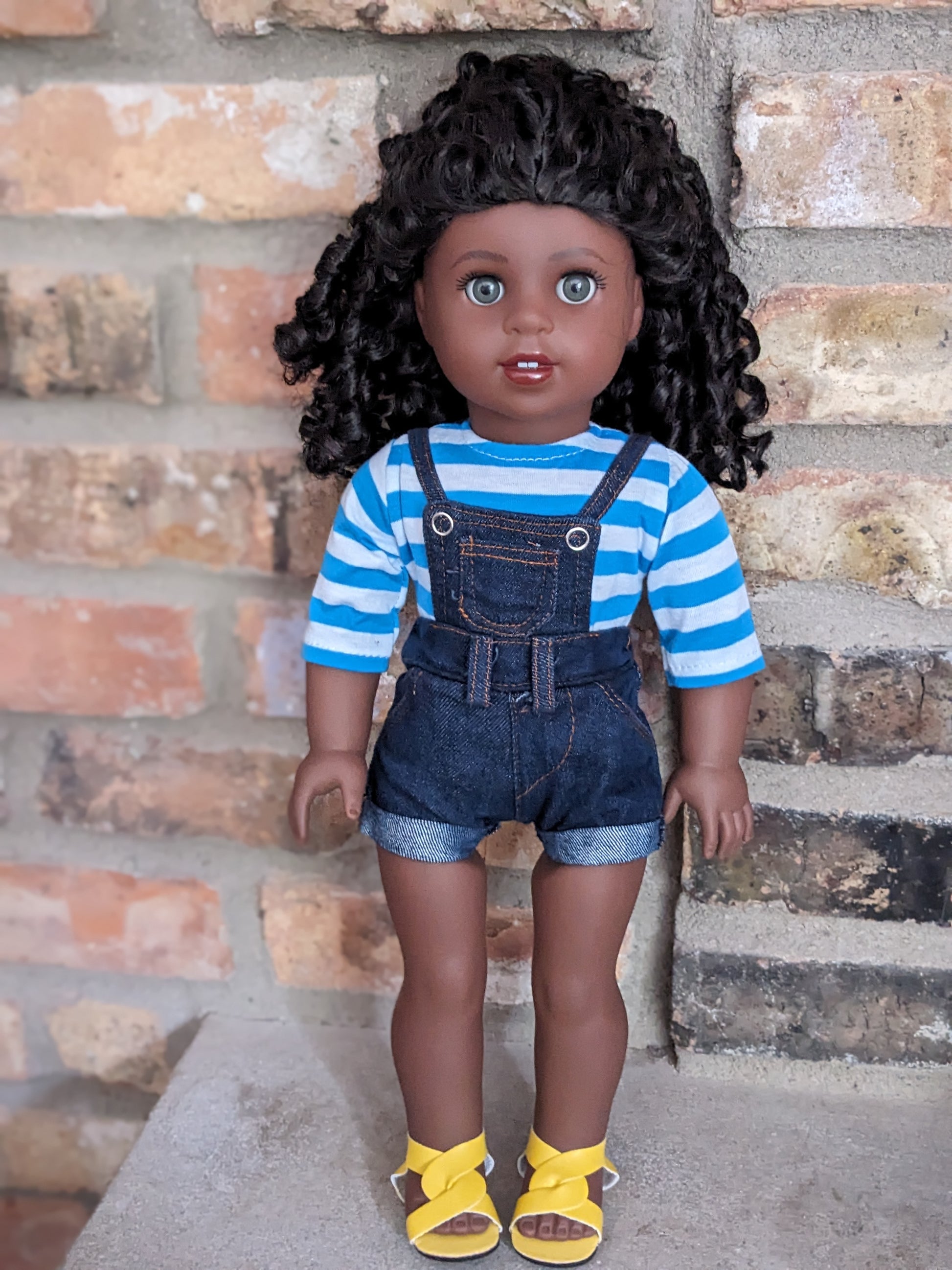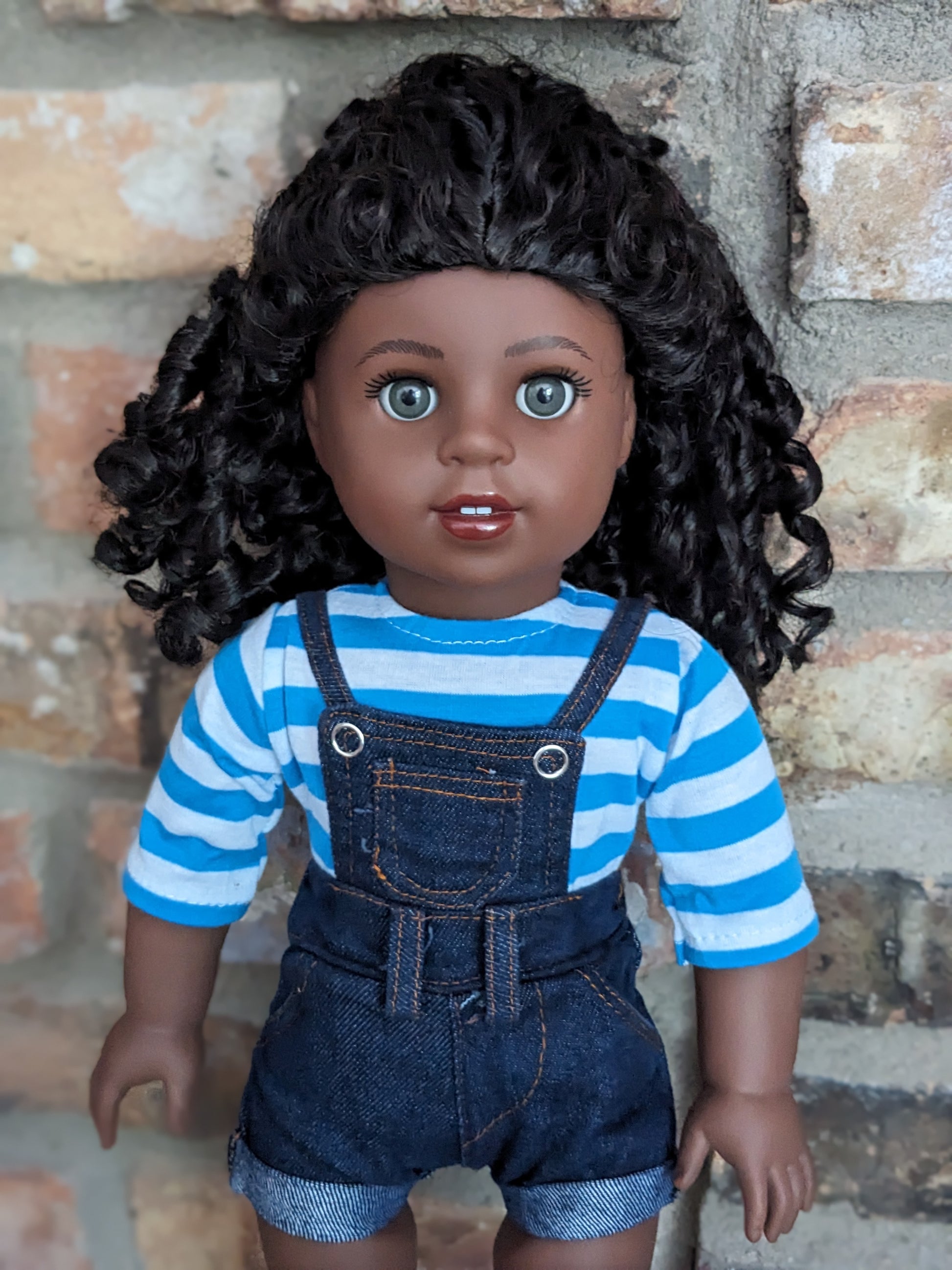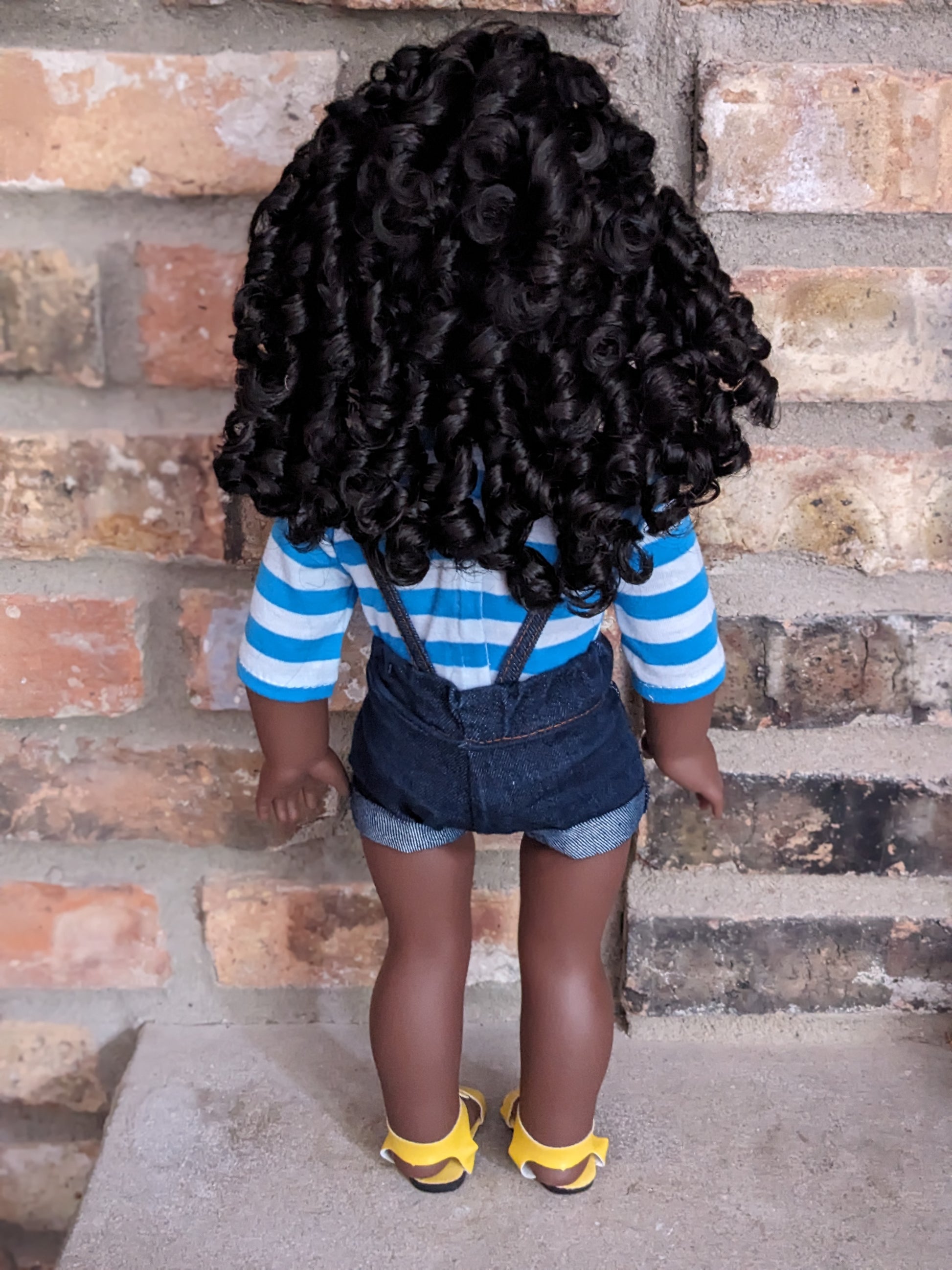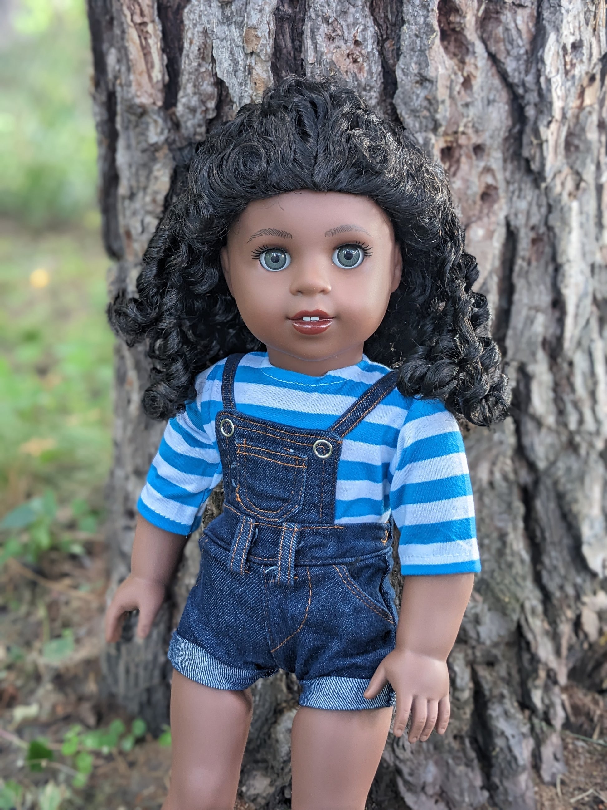This one of a kind OOAK custom American Girl doll was created with a new doll, a black wig, and grey eyes. She has lip gloss that was hand painted and sealed. She may have some minor shine marks from handling. She comes with the outfit pictured.