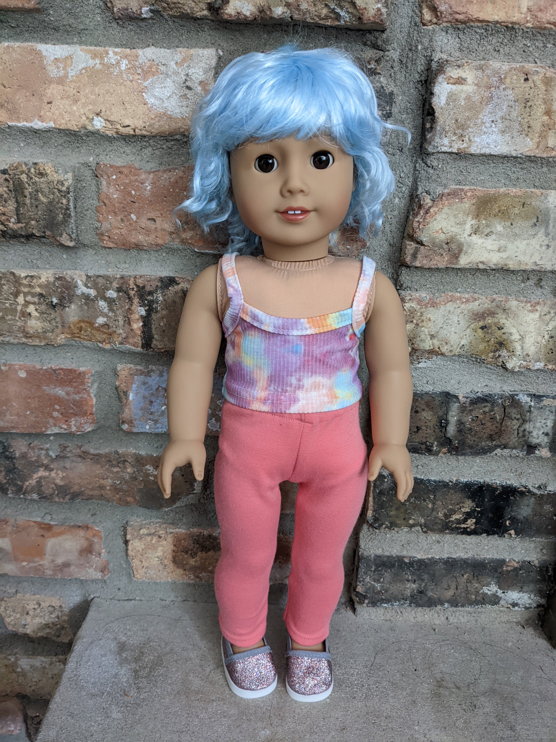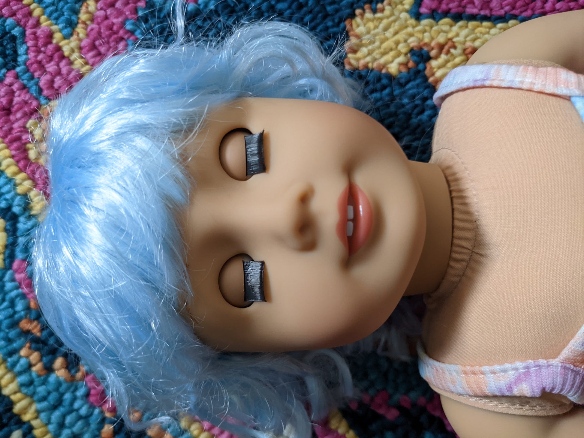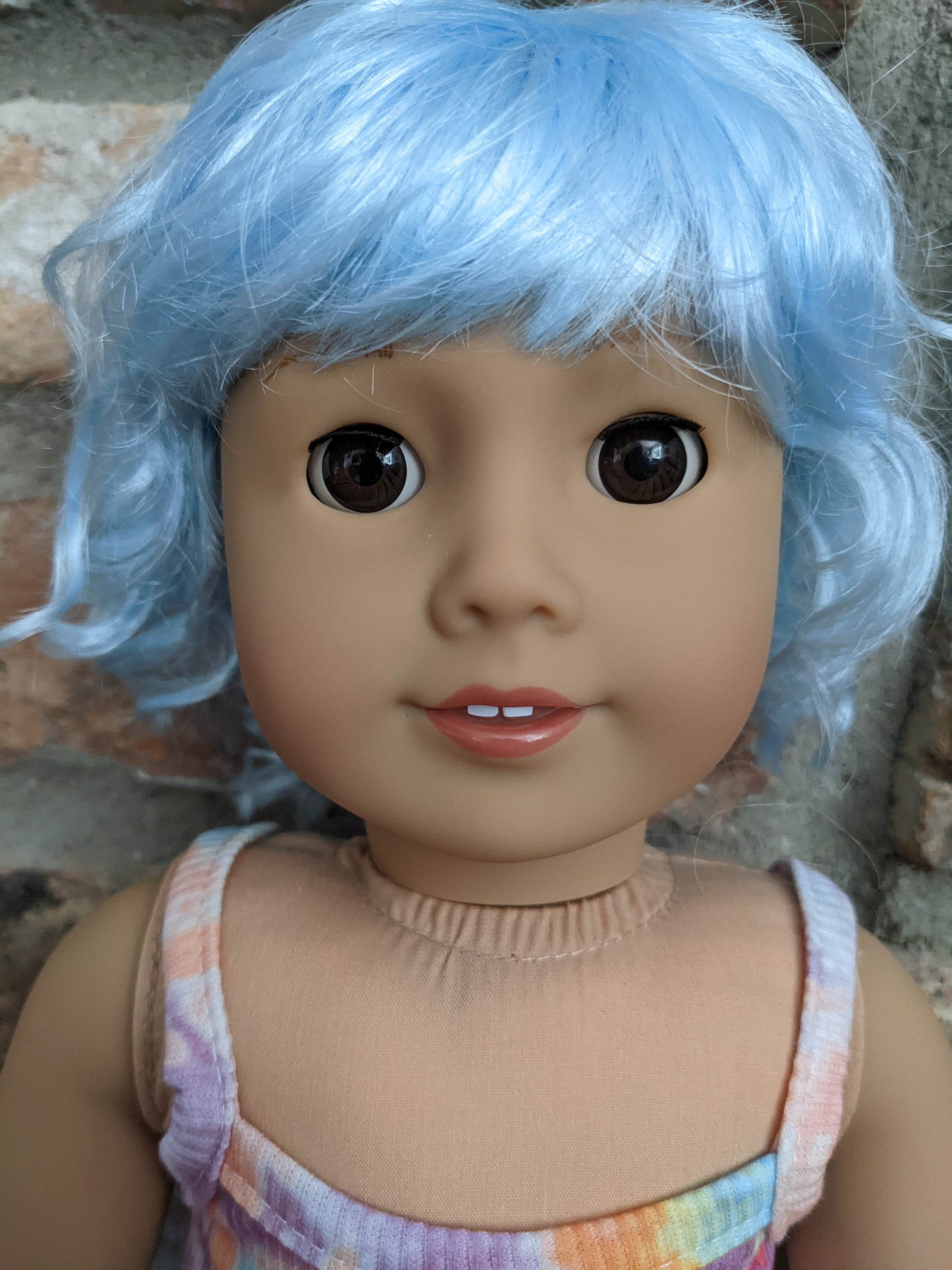This one of a kind OOAK custom American Girl doll was created with a new Truly Me doll, a blue vegan mohair wig with bangs, and brown eyes. She has lip gloss that was hand painted and sealed. She may have some minor shine marks from handling. She comes with the outfit pictured. She has a microfiber cloth body with permapanties.