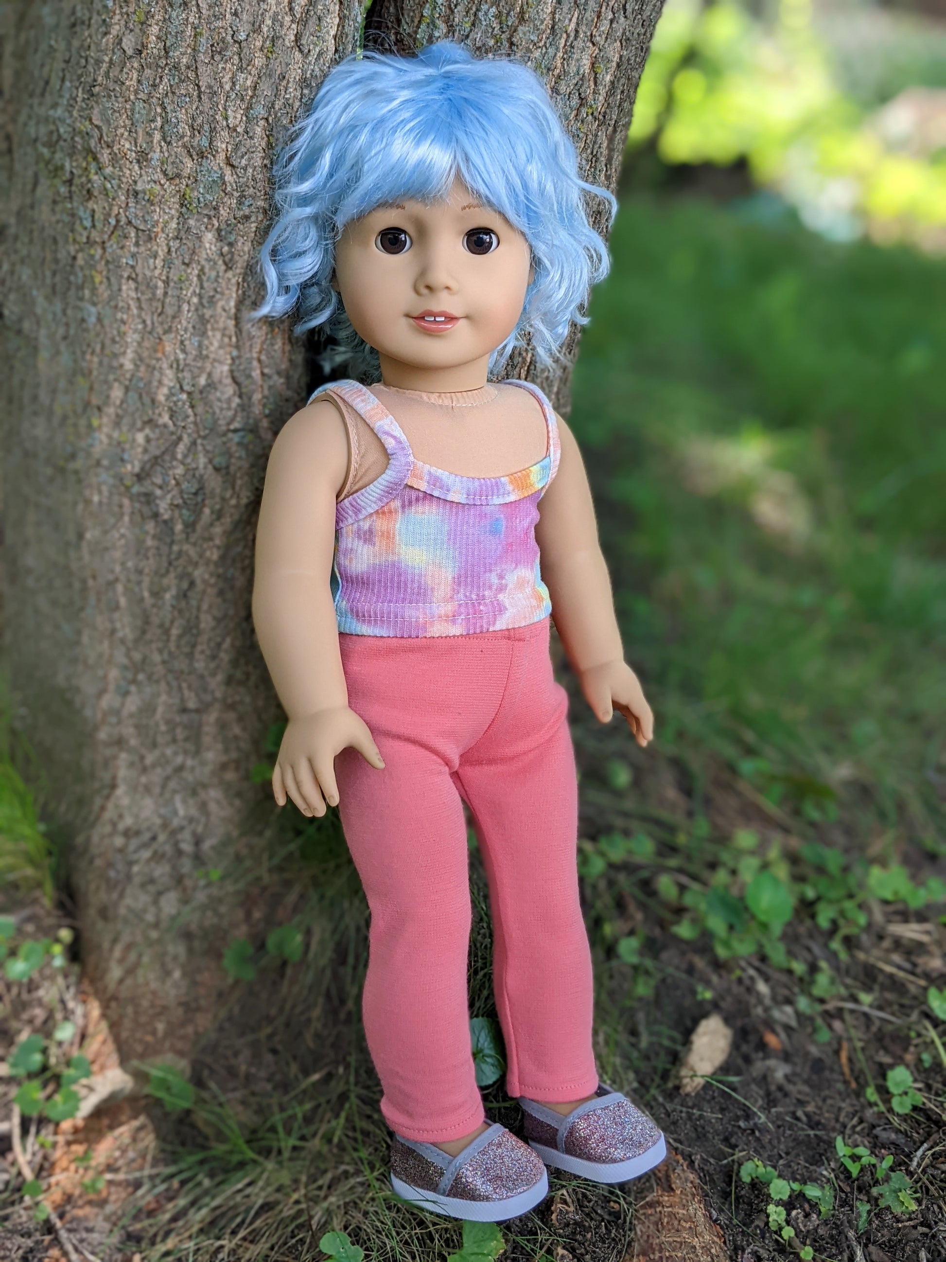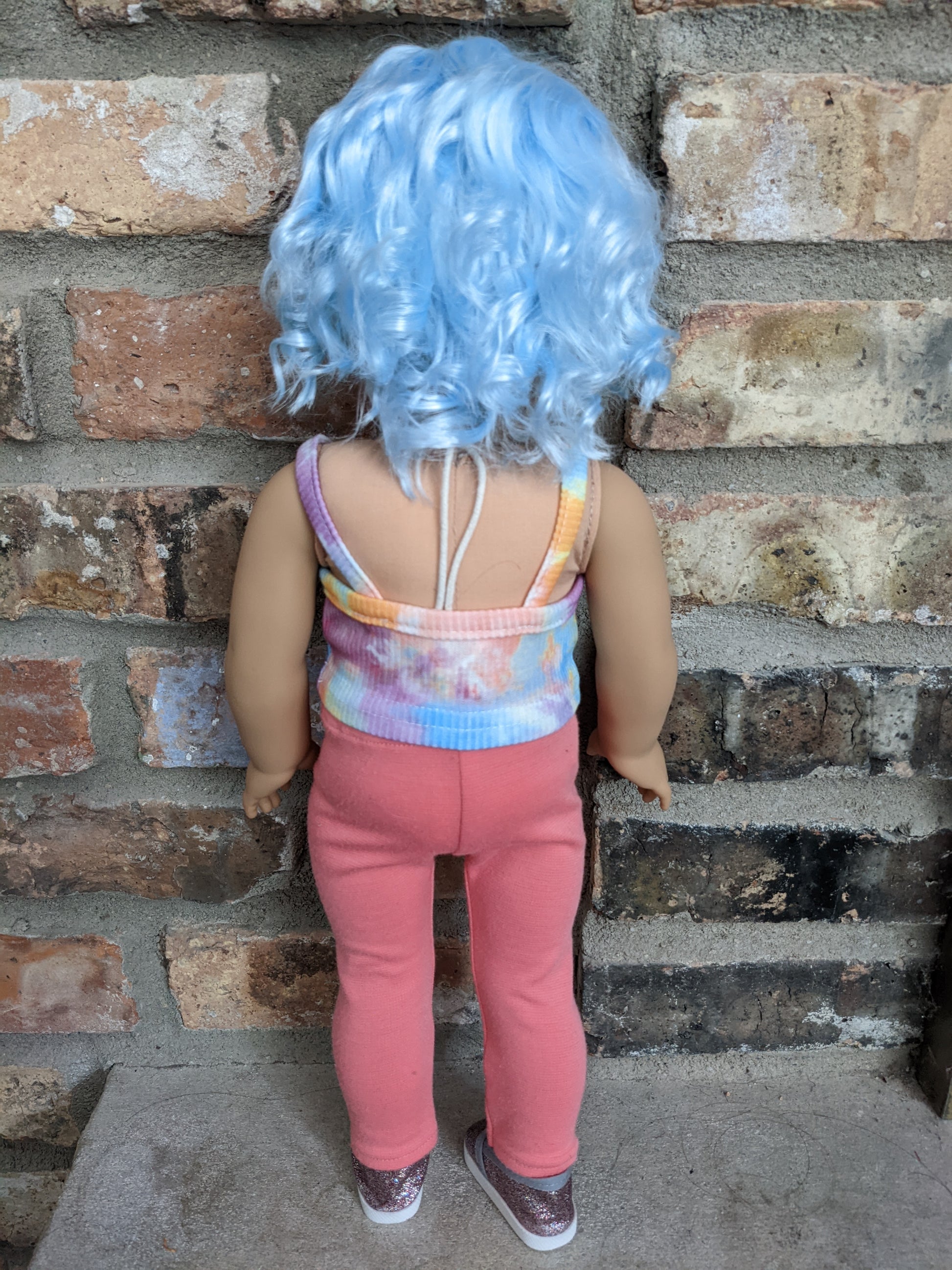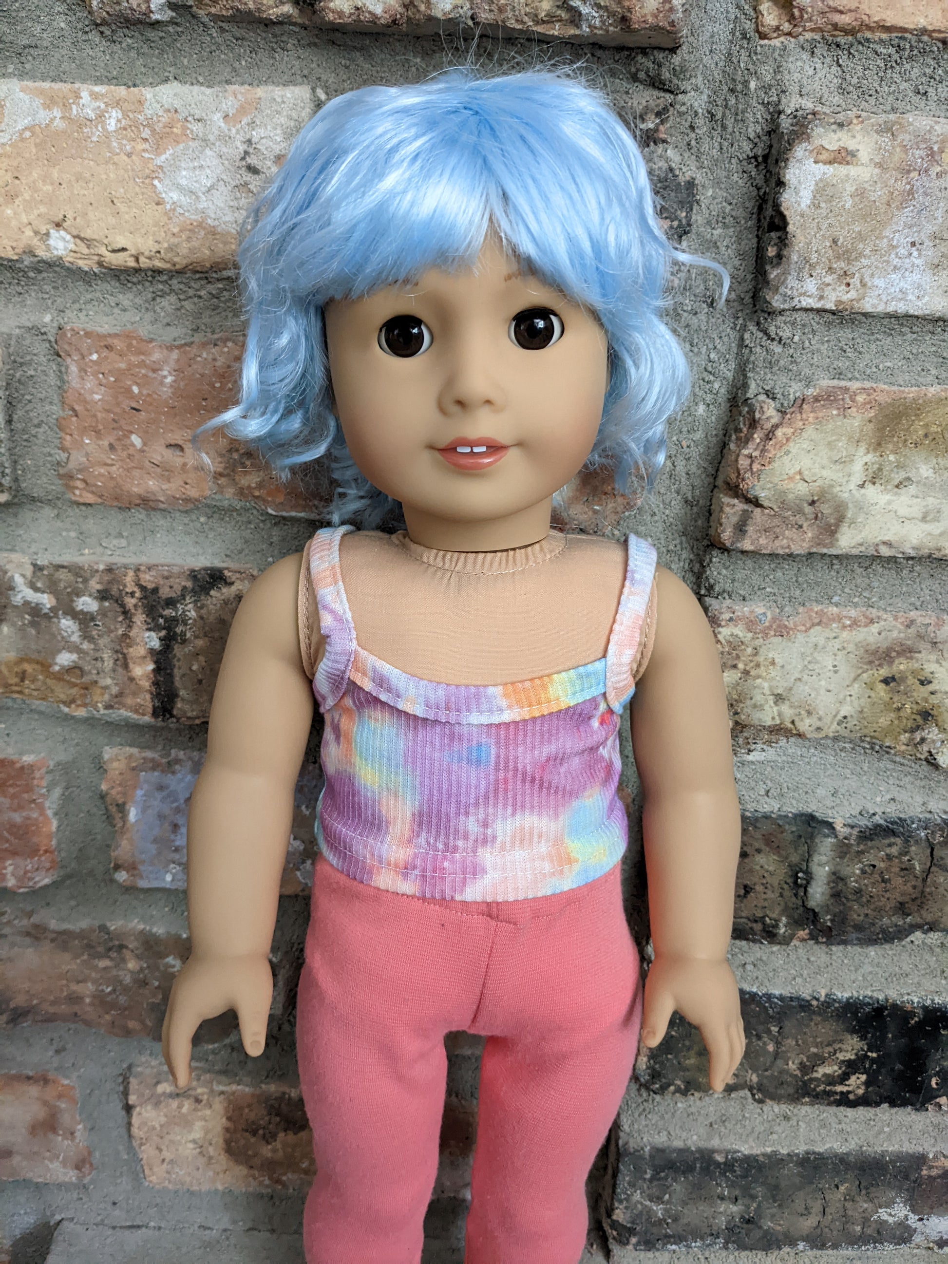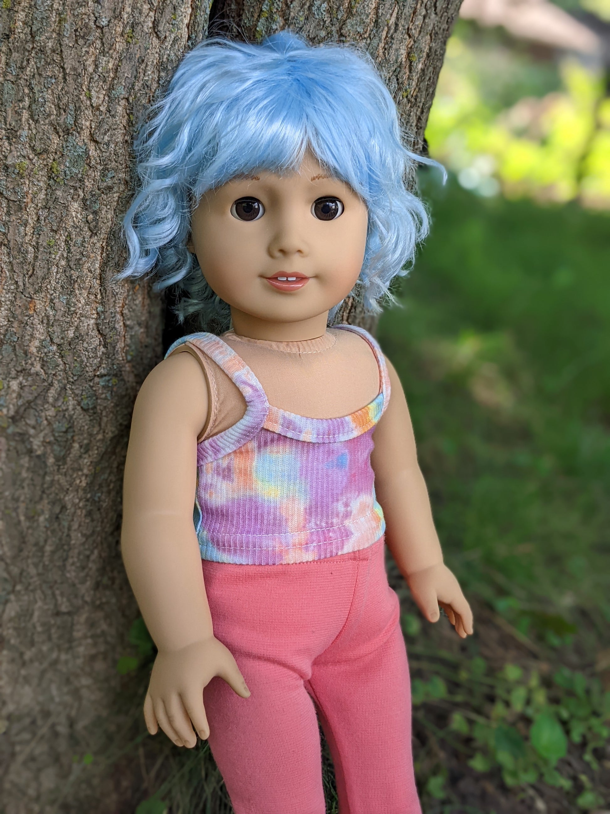 This one of a kind OOAK custom American Girl doll was created with a new Truly Me doll, a blue vegan mohair wig with bangs, and brown eyes. She has lip gloss that was hand painted and sealed. She may have some minor shine marks from handling. She comes with the outfit pictured. She has a microfiber cloth body with permapanties.