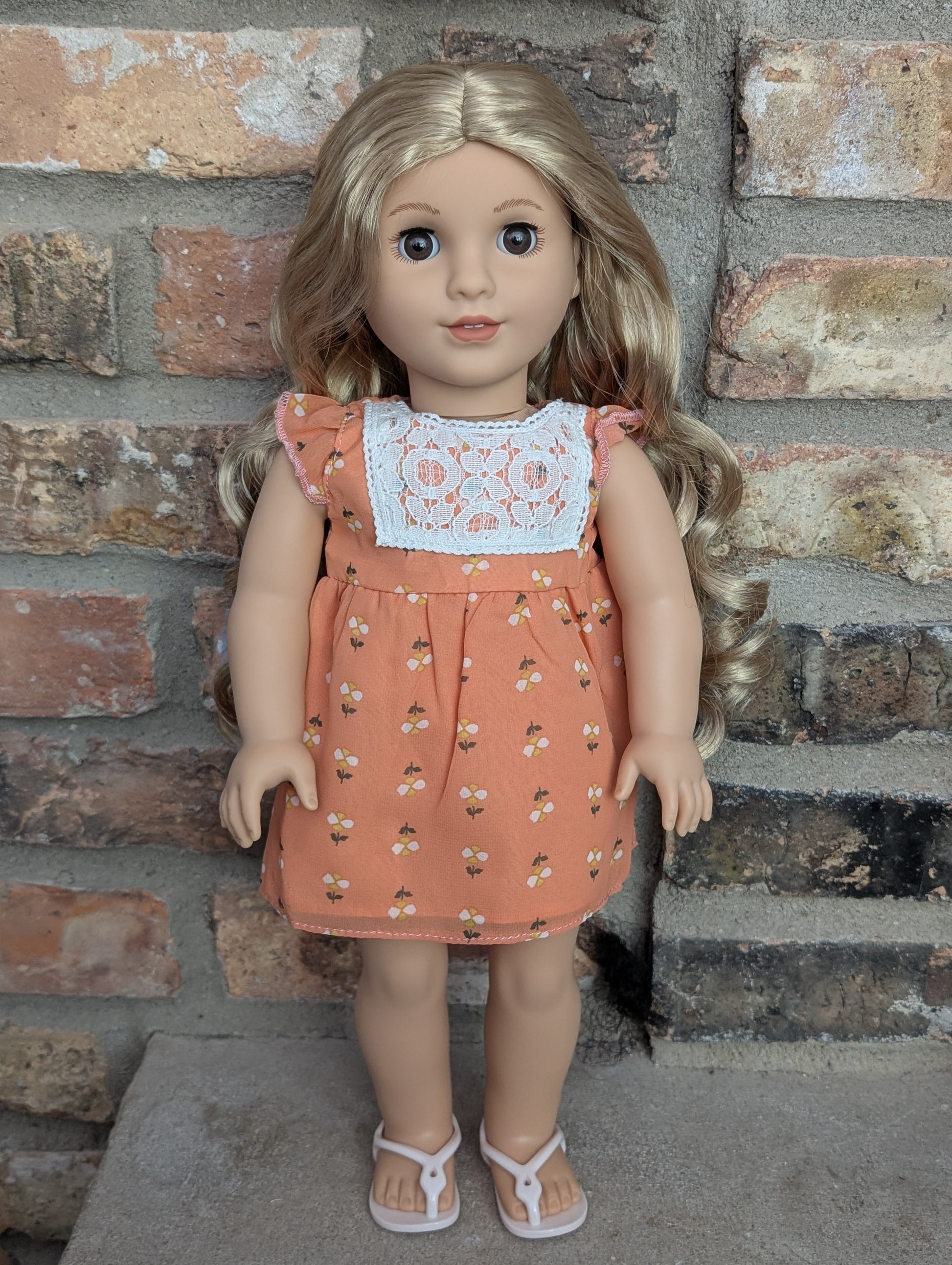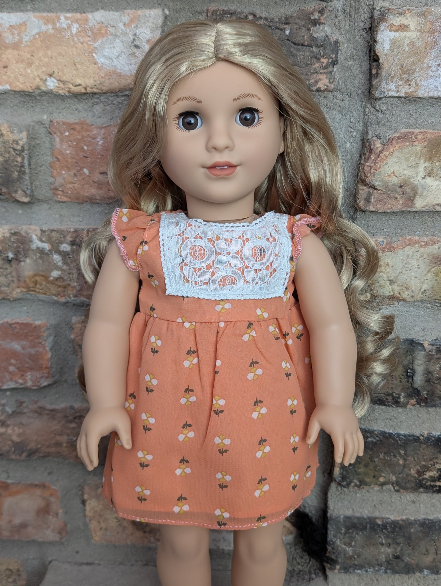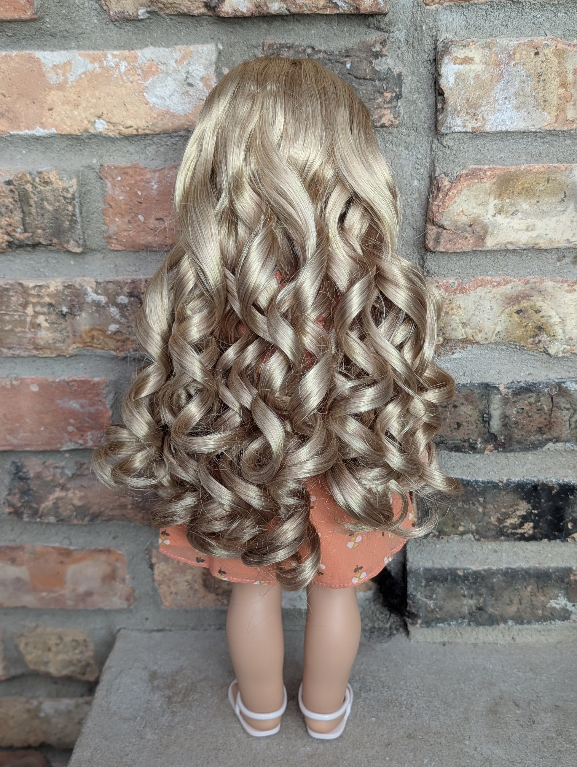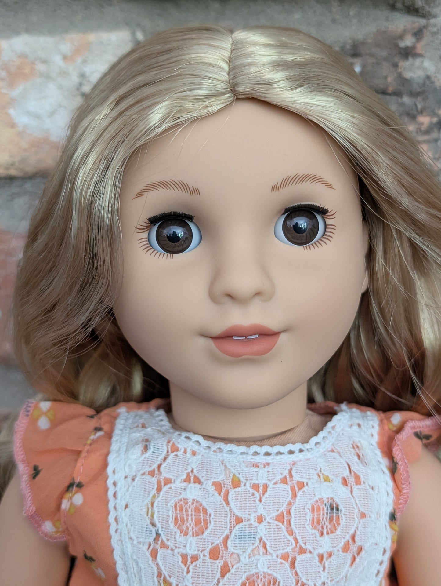 This one of a kind OOAK custom American Girl doll was created with a brand new doll, a blonde wig, and brown eyes. She may have some minor shine marks from handling. She comes with the outfit pictured.