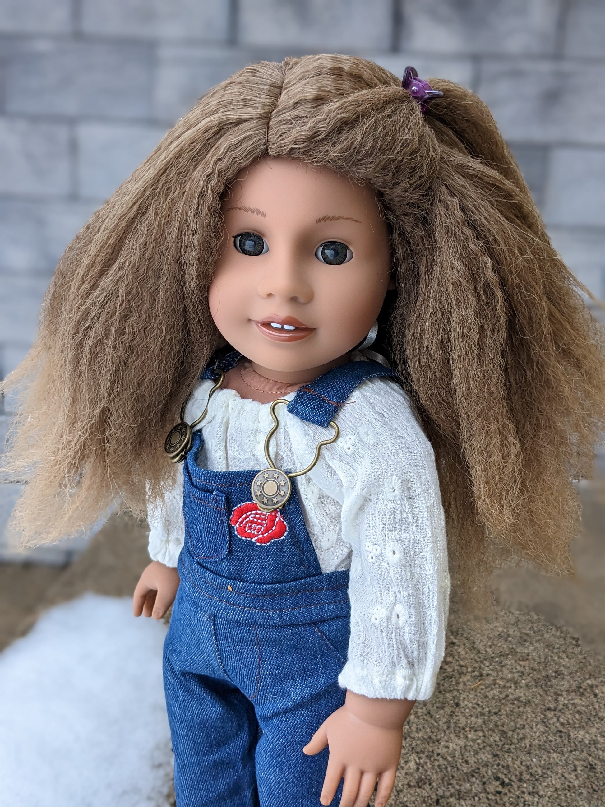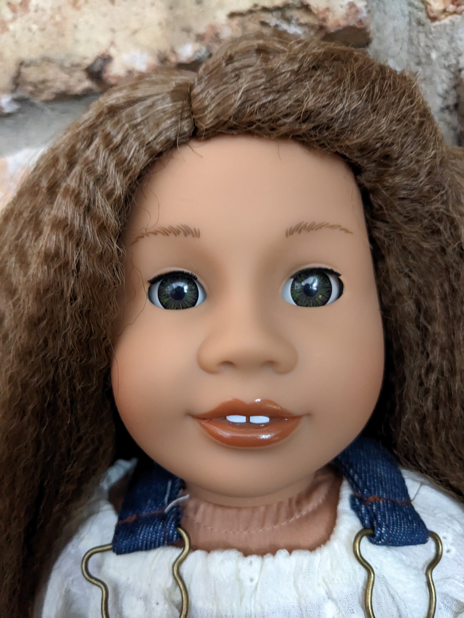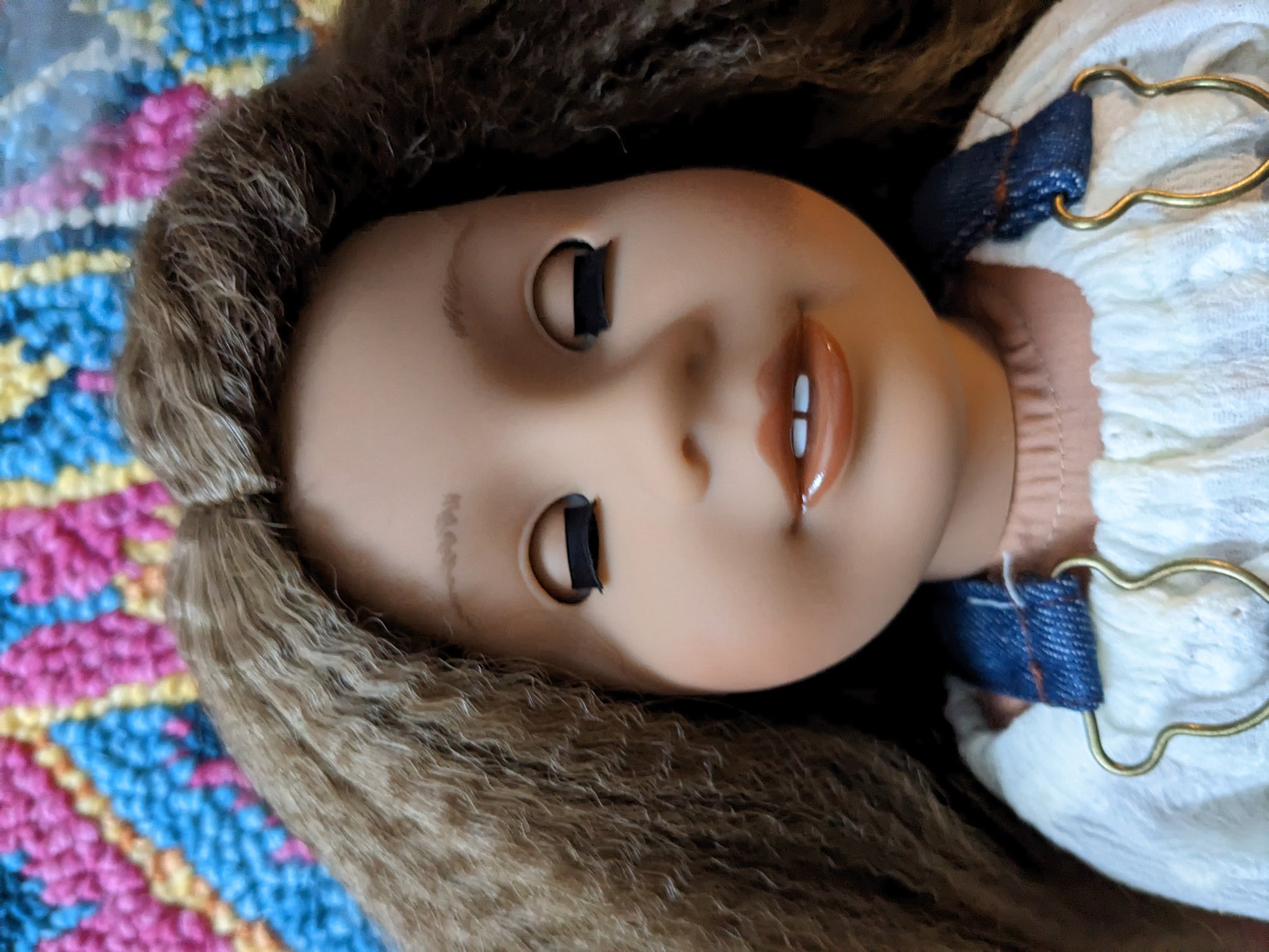 This one of a kind OOAK custom American Girl doll was created with a brand new TM 26 doll, a brown textured wig, and hazel eyes. She has lip gloss that was hand painted and sealed. She may have some minor shine marks from handling. She comes with the outfit pictured. She has a microfiber cloth body with permapanties and a tiny x on her bum.