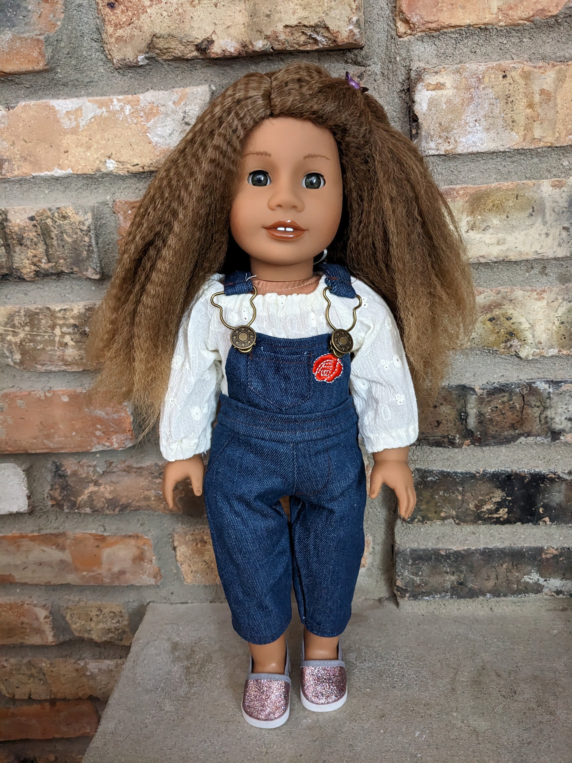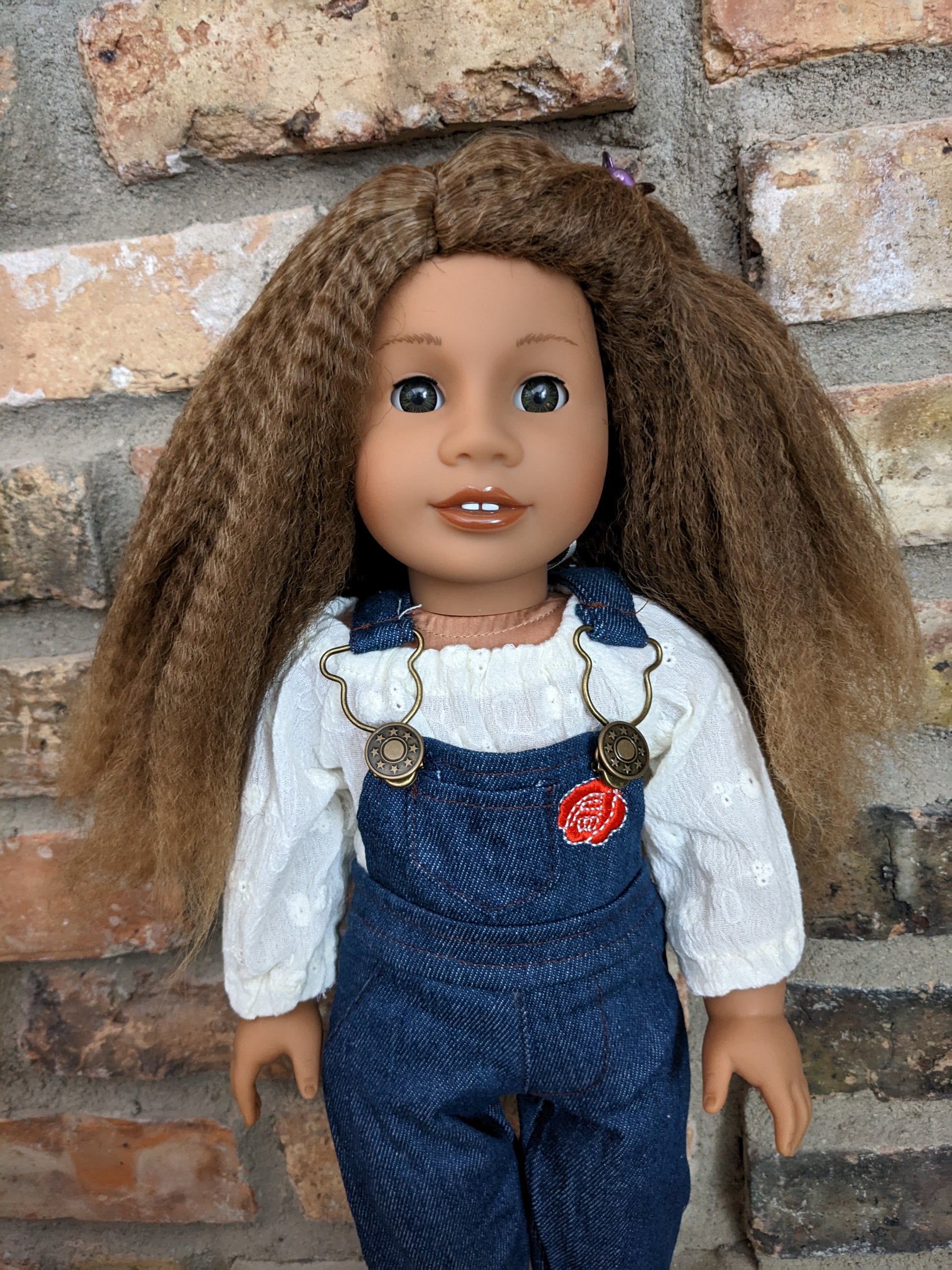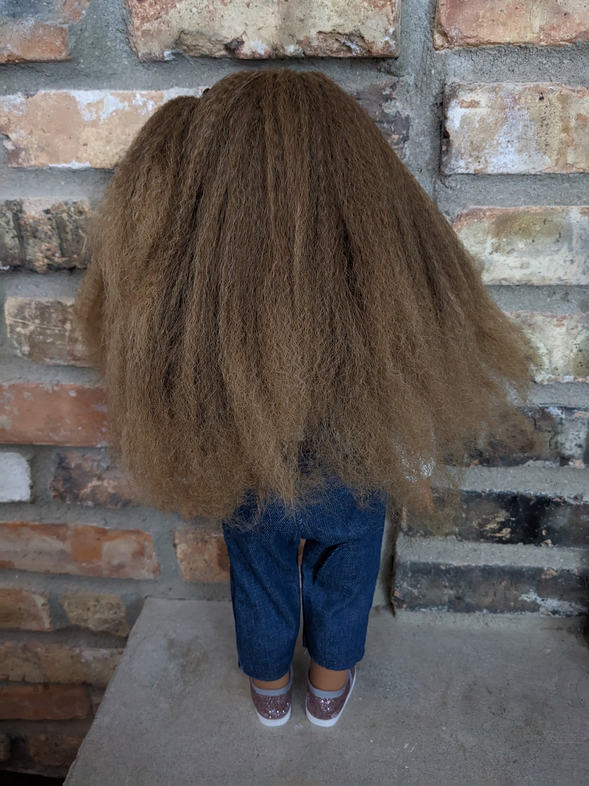 This one of a kind OOAK custom American Girl doll was created with a brand new TM 26 doll, a brown textured wig, and hazel eyes. She has lip gloss that was hand painted and sealed. She may have some minor shine marks from handling. She comes with the outfit pictured. She has a microfiber cloth body with permapanties and a tiny x on her bum.