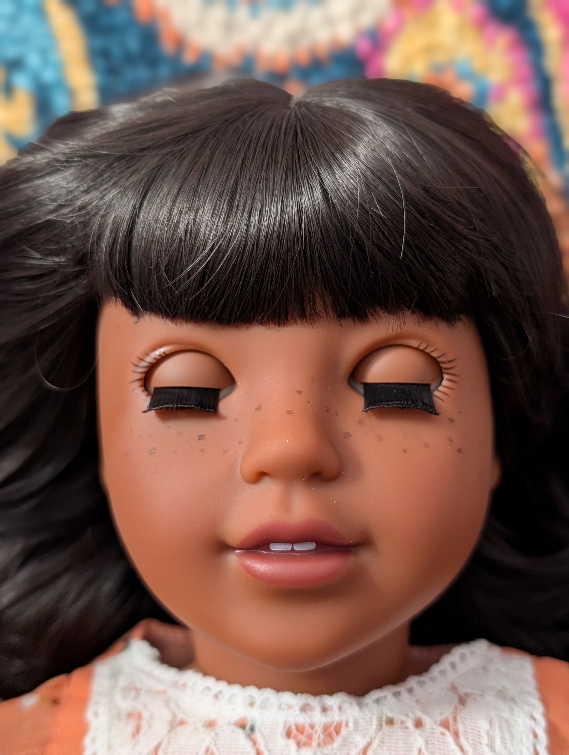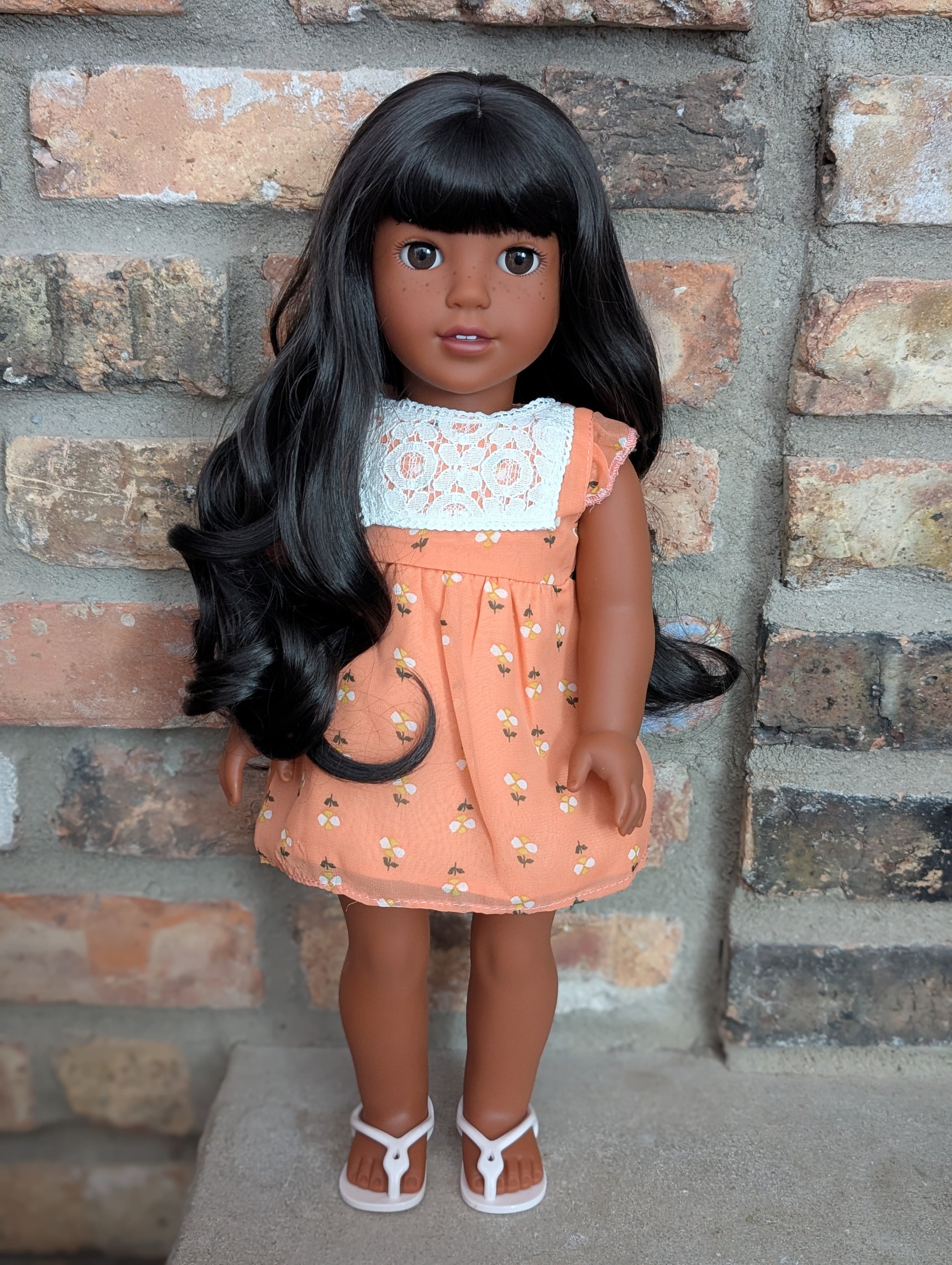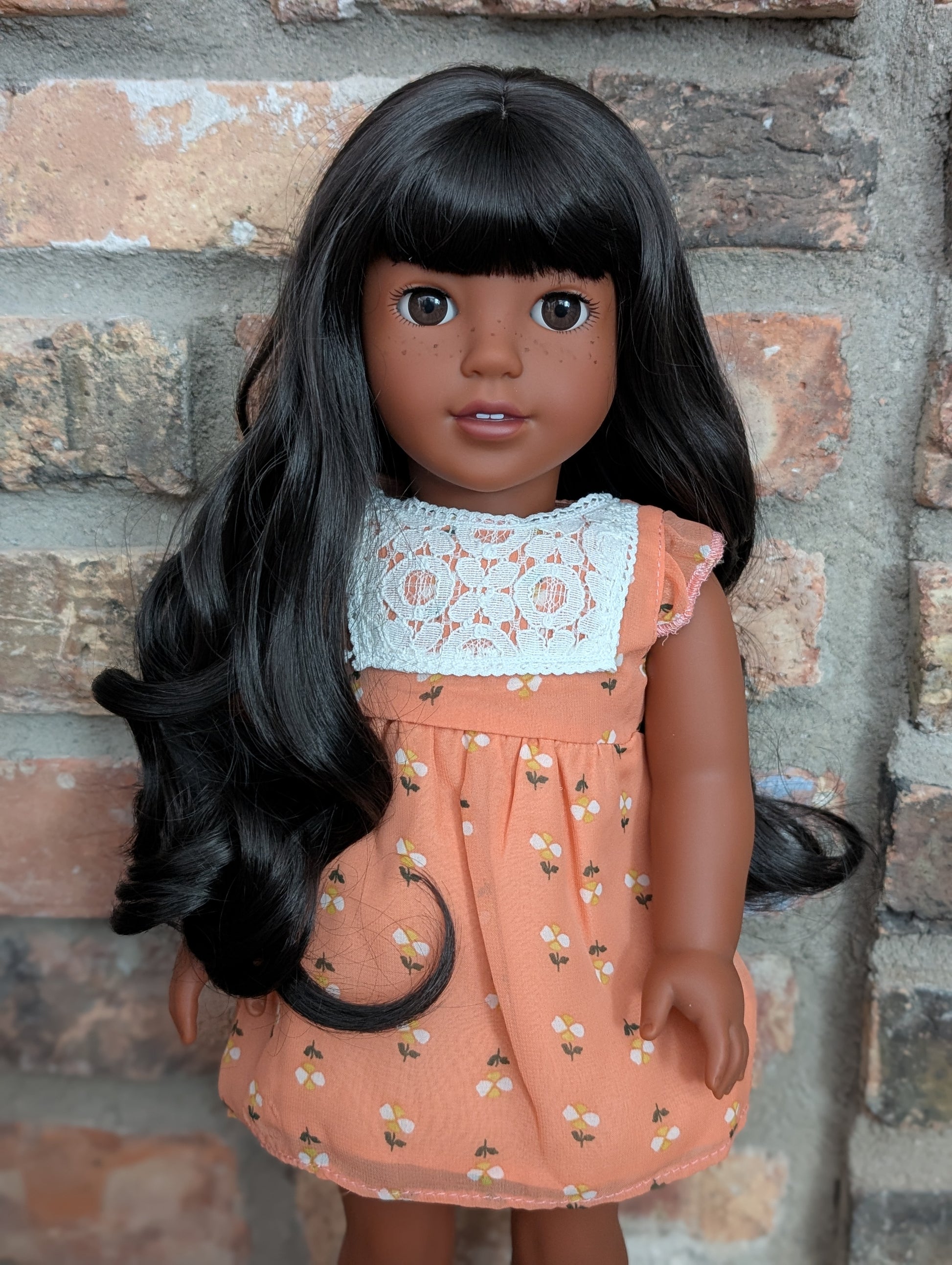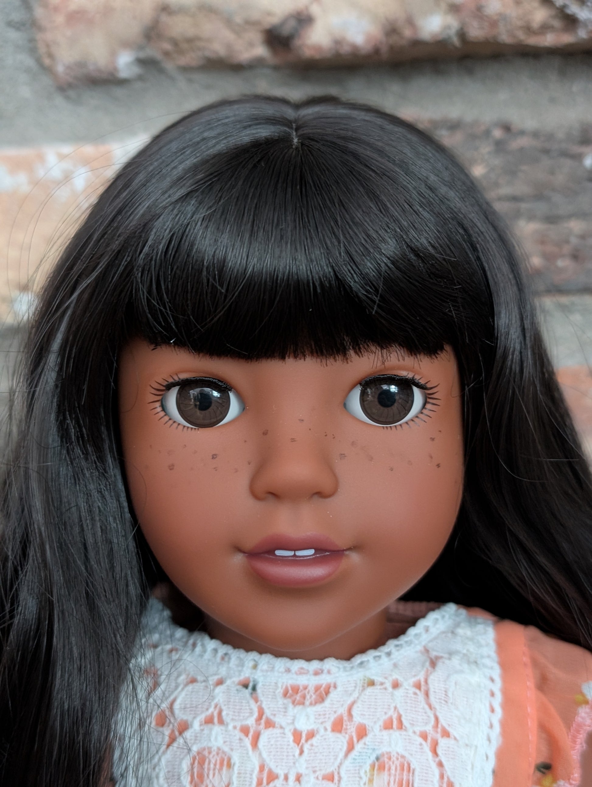This one of a kind OOAK custom American Girl doll was created with a brand new Moana doll, a black wig, and brown eyes. She has freckles that were hand painted and sealed. She may have some minor shine marks from handling. She comes with the outfit pictured.