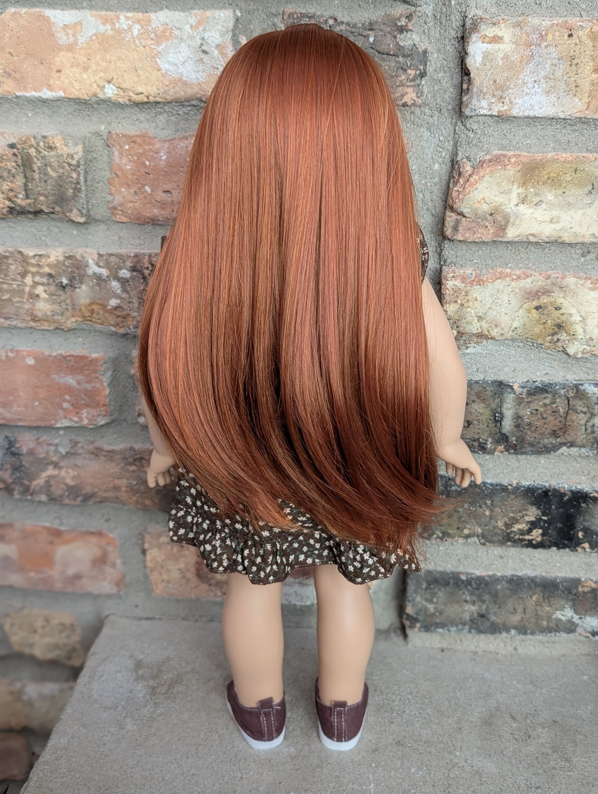 This one of a kind OOAK custom American Girl doll was created with a brand new doll, a red wig, and green from a BeForever Felicity. She has lip gloss that was hand painted and sealed. She may have some minor shine marks from handling. She comes with the outfit pictured.
