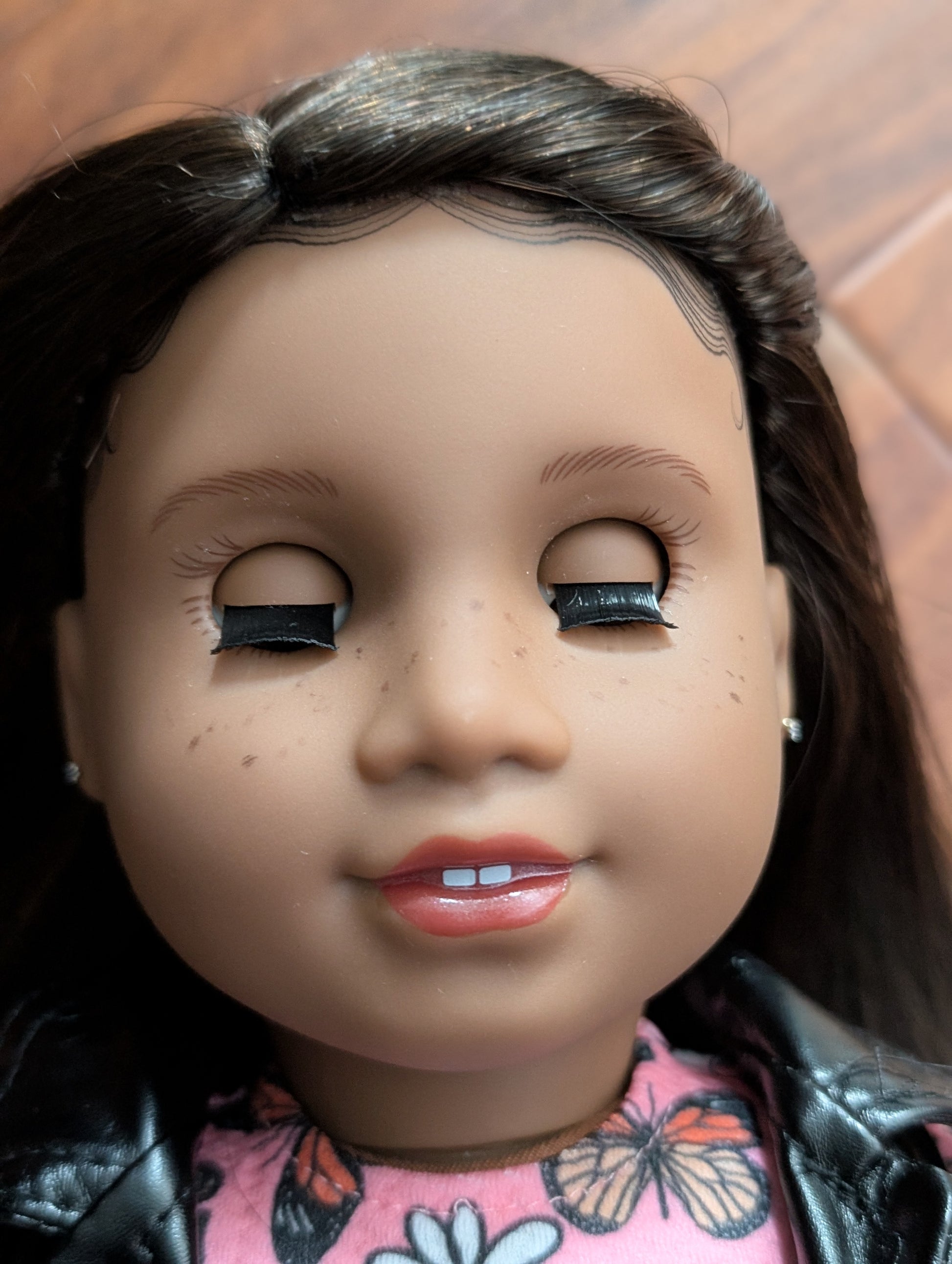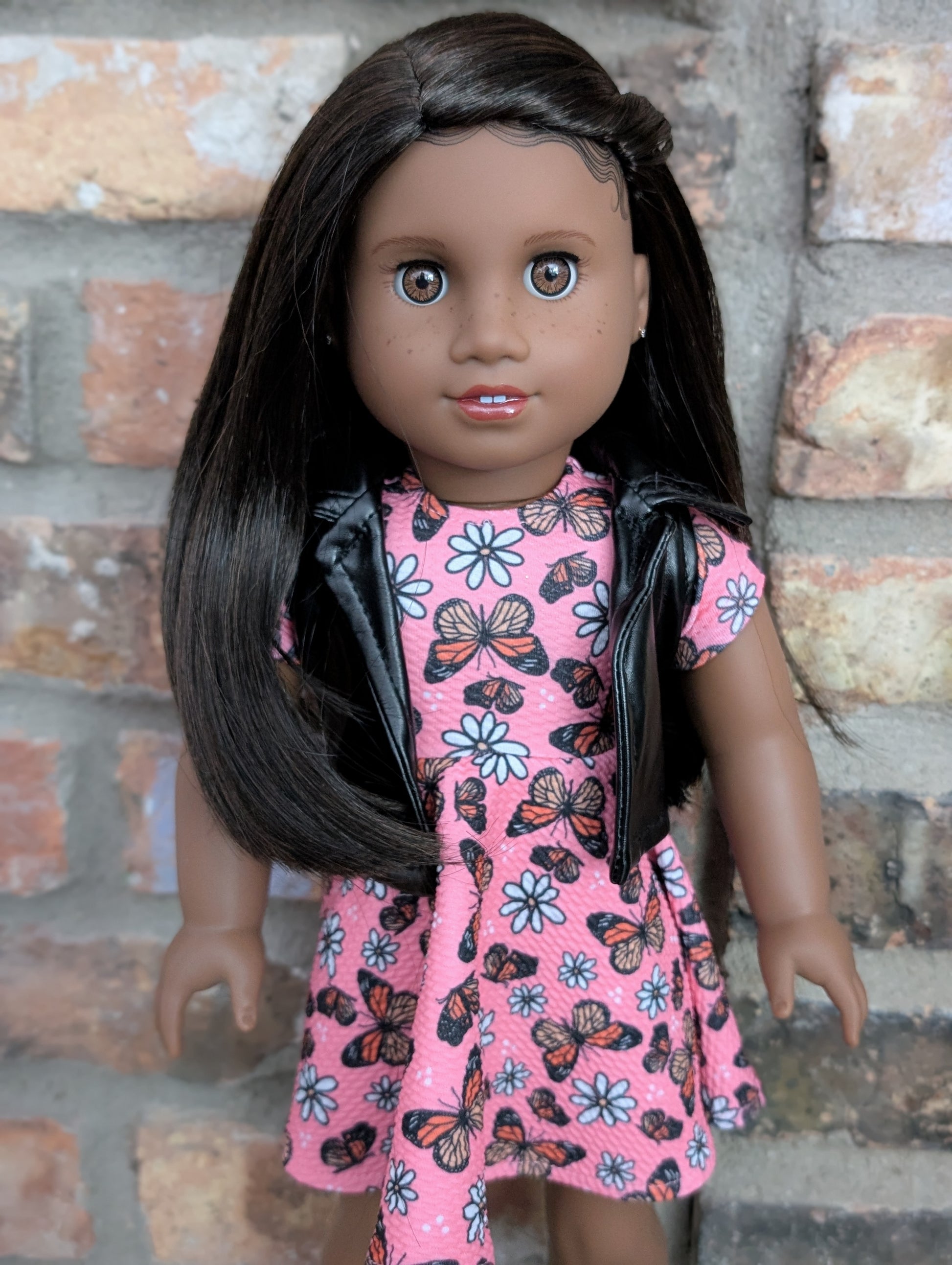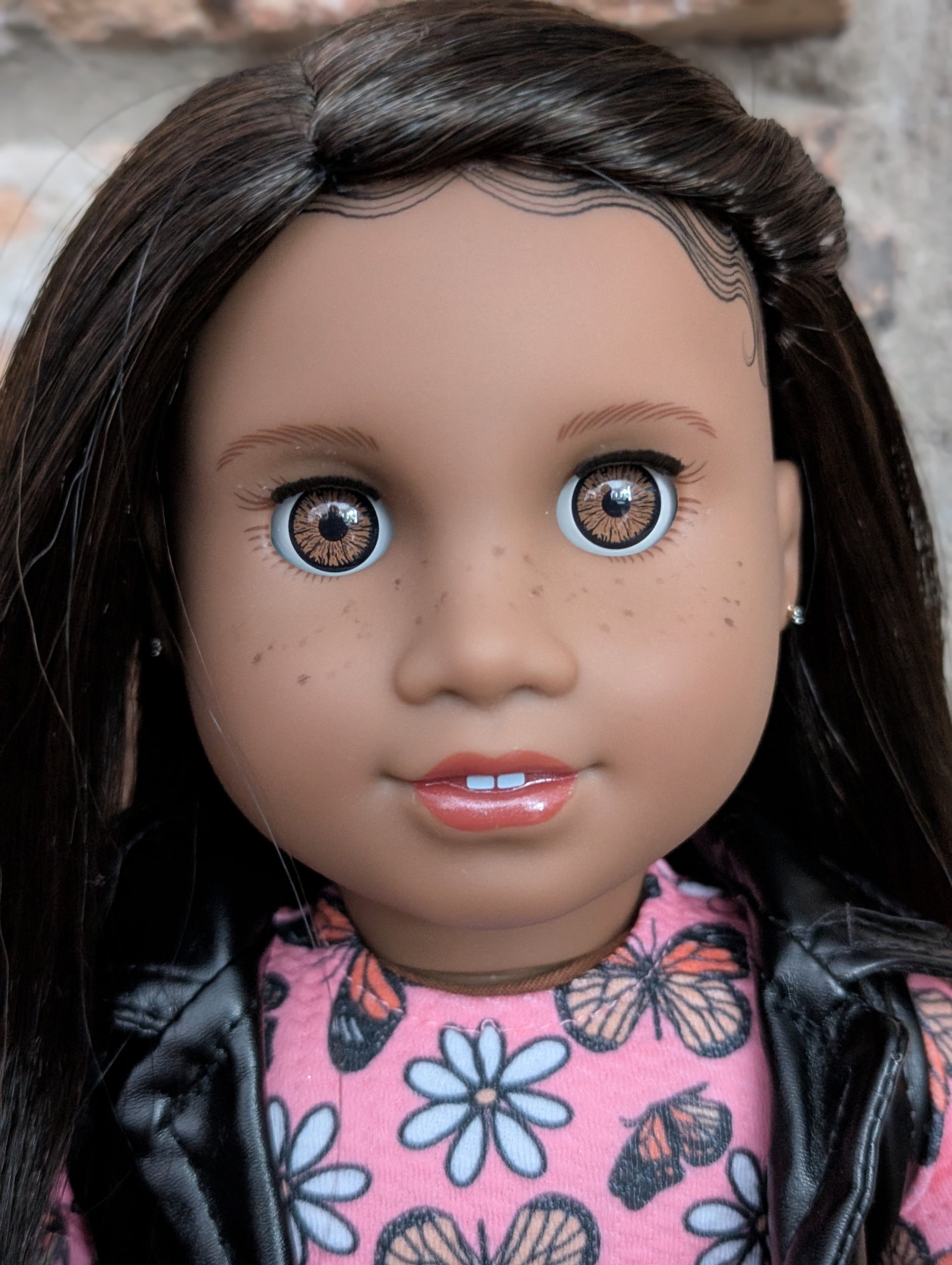 This one of a kind OOAK custom American Girl doll was created with a brand new doll, a black brown wig, and light brown eyes from a Tiana doll. She has lip gloss and freckles that were hand painted and sealed. She may have some minor shine marks from handling. She comes with the outfit pictured. Her ears are pierced with normal earrings and the tiny diamond look studs are included.