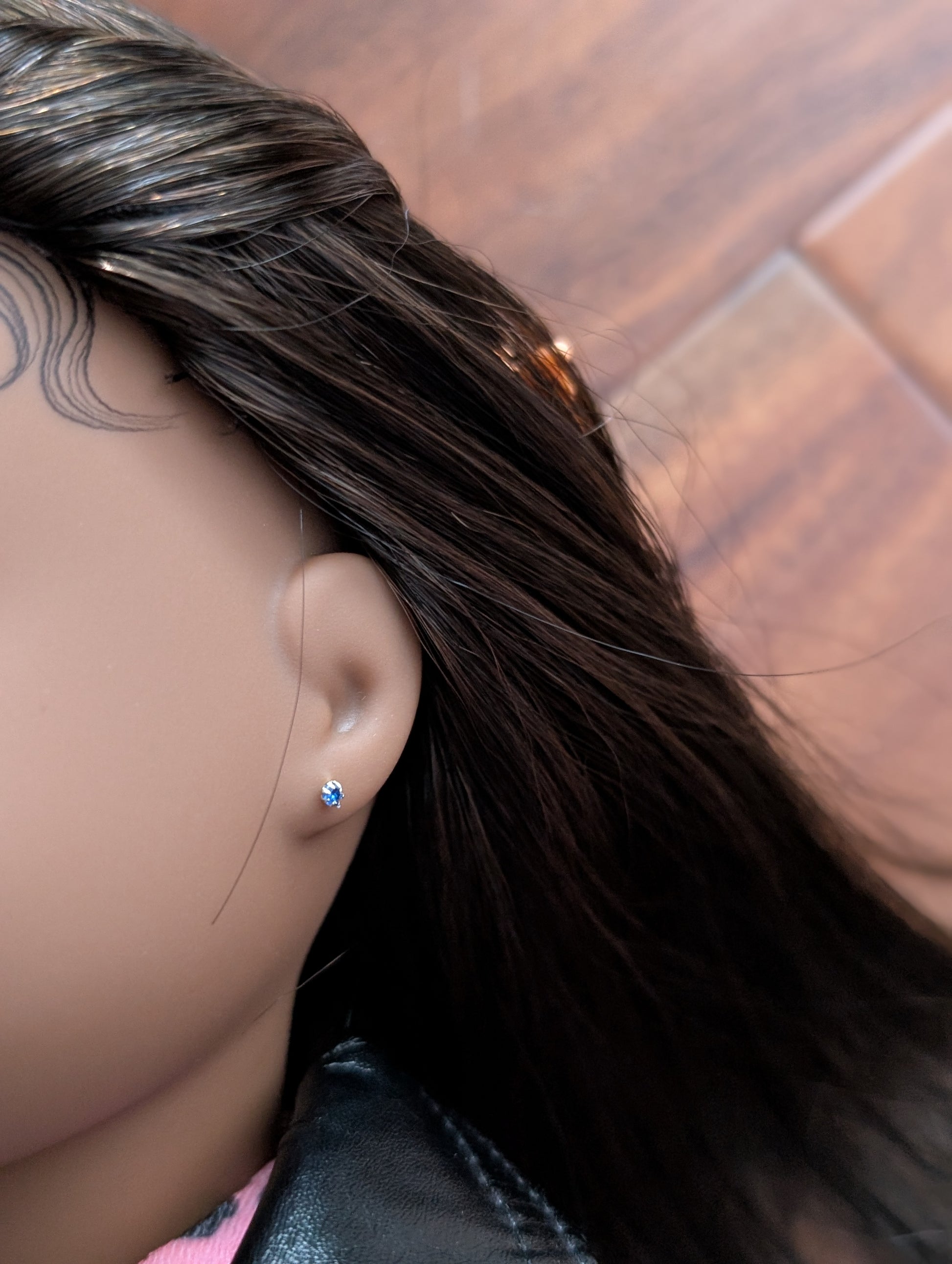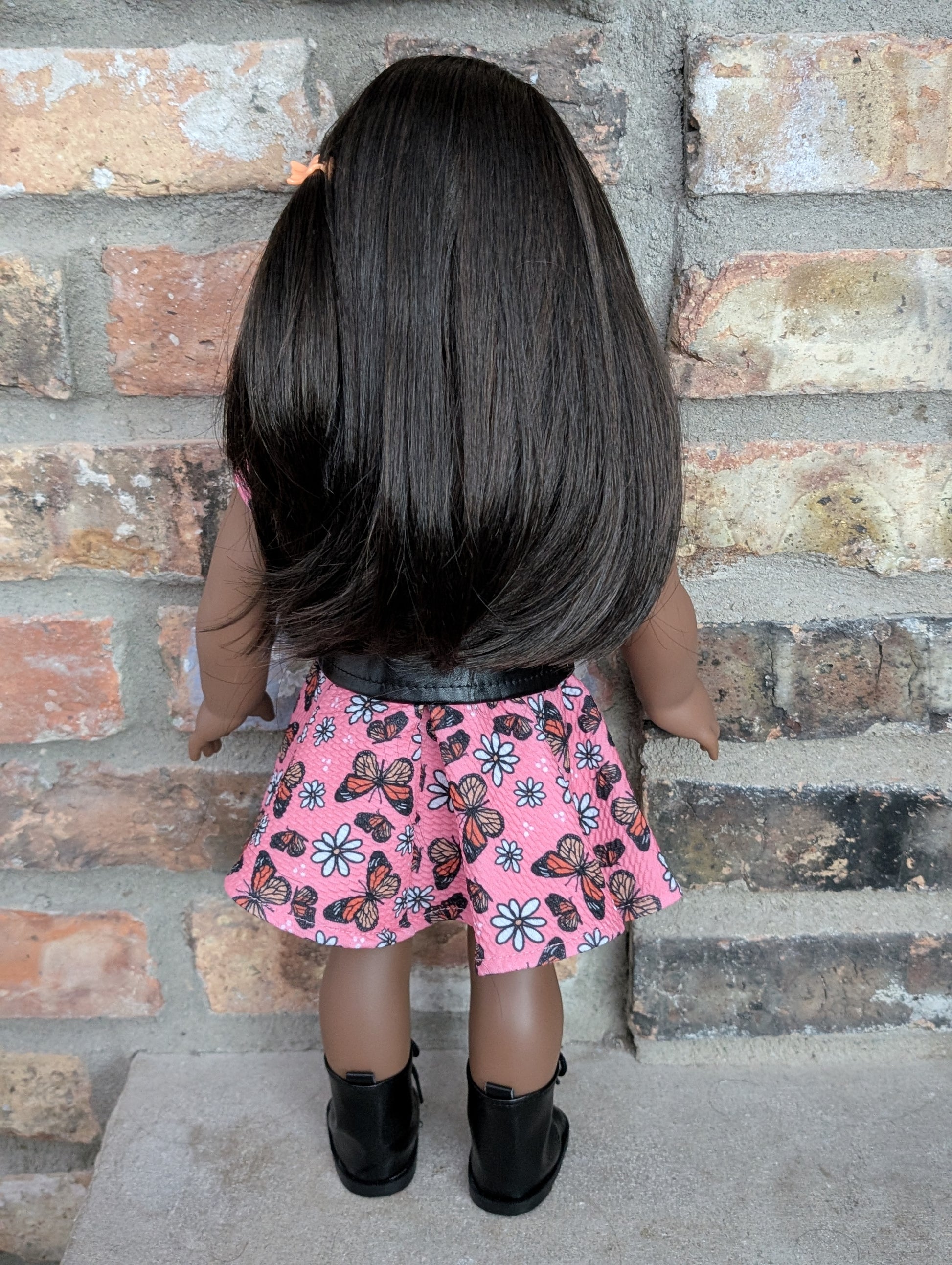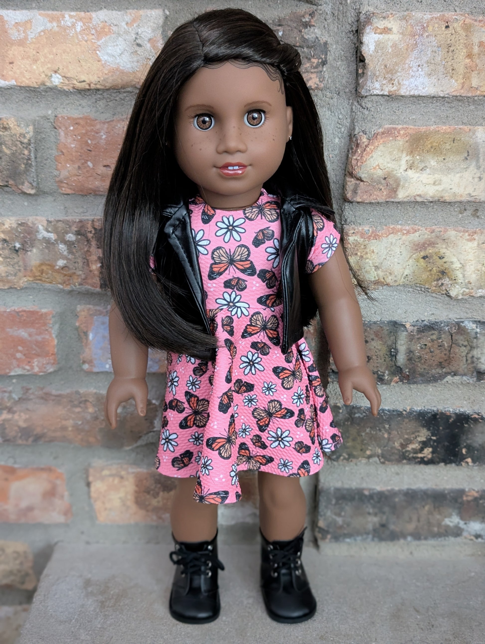 This one of a kind OOAK custom American Girl doll was created with a brand new doll, a black brown wig, and light brown eyes from a Tiana doll. She has lip gloss and freckles that were hand painted and sealed. She may have some minor shine marks from handling. She comes with the outfit pictured. Her ears are pierced with normal earrings and the tiny diamond look studs are included.