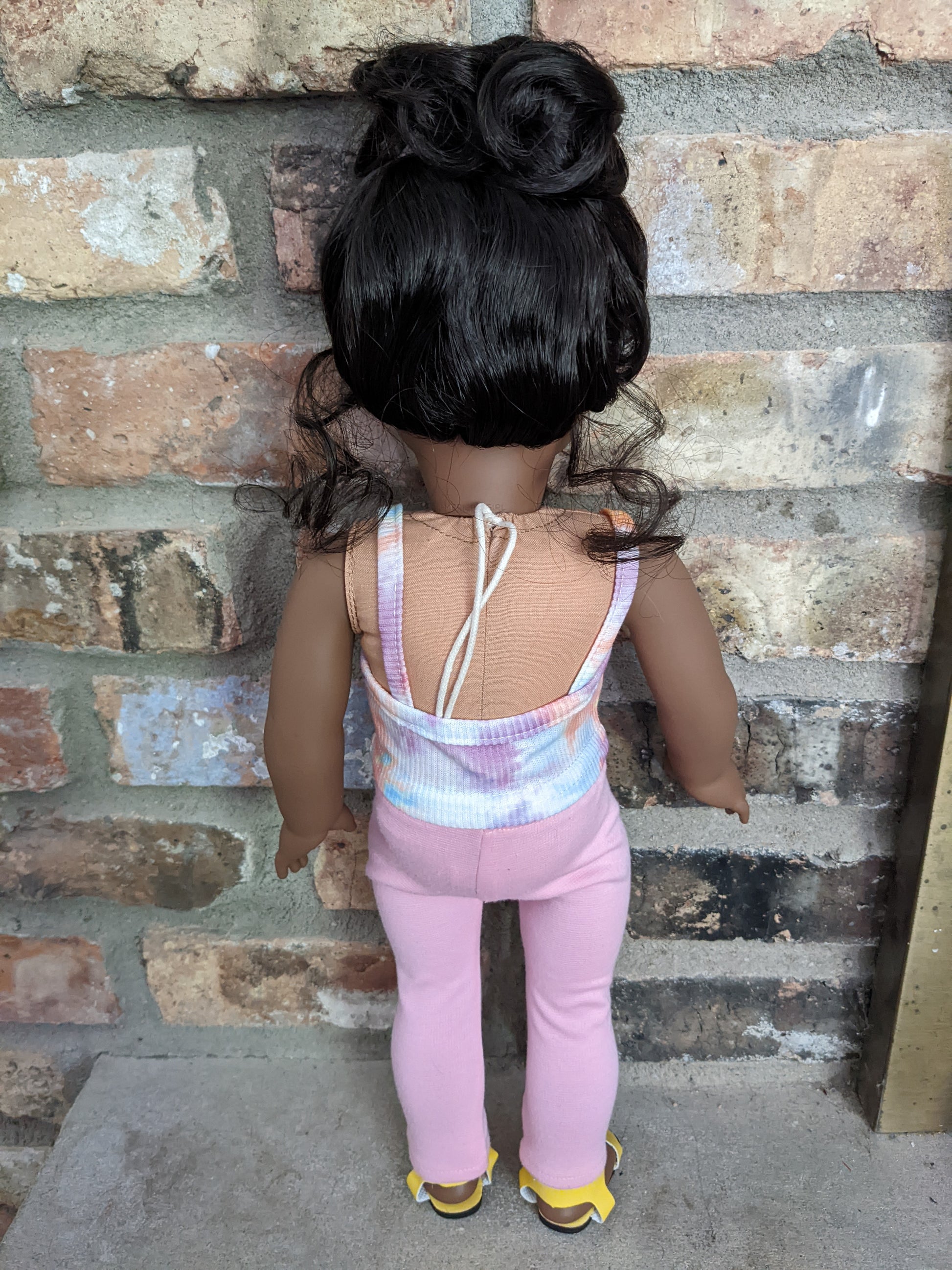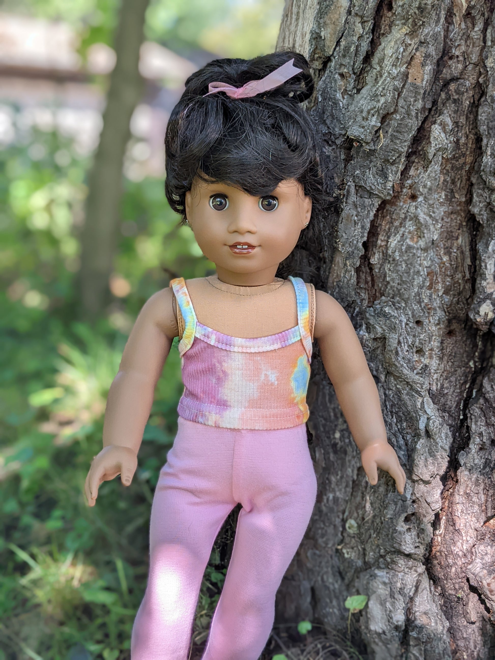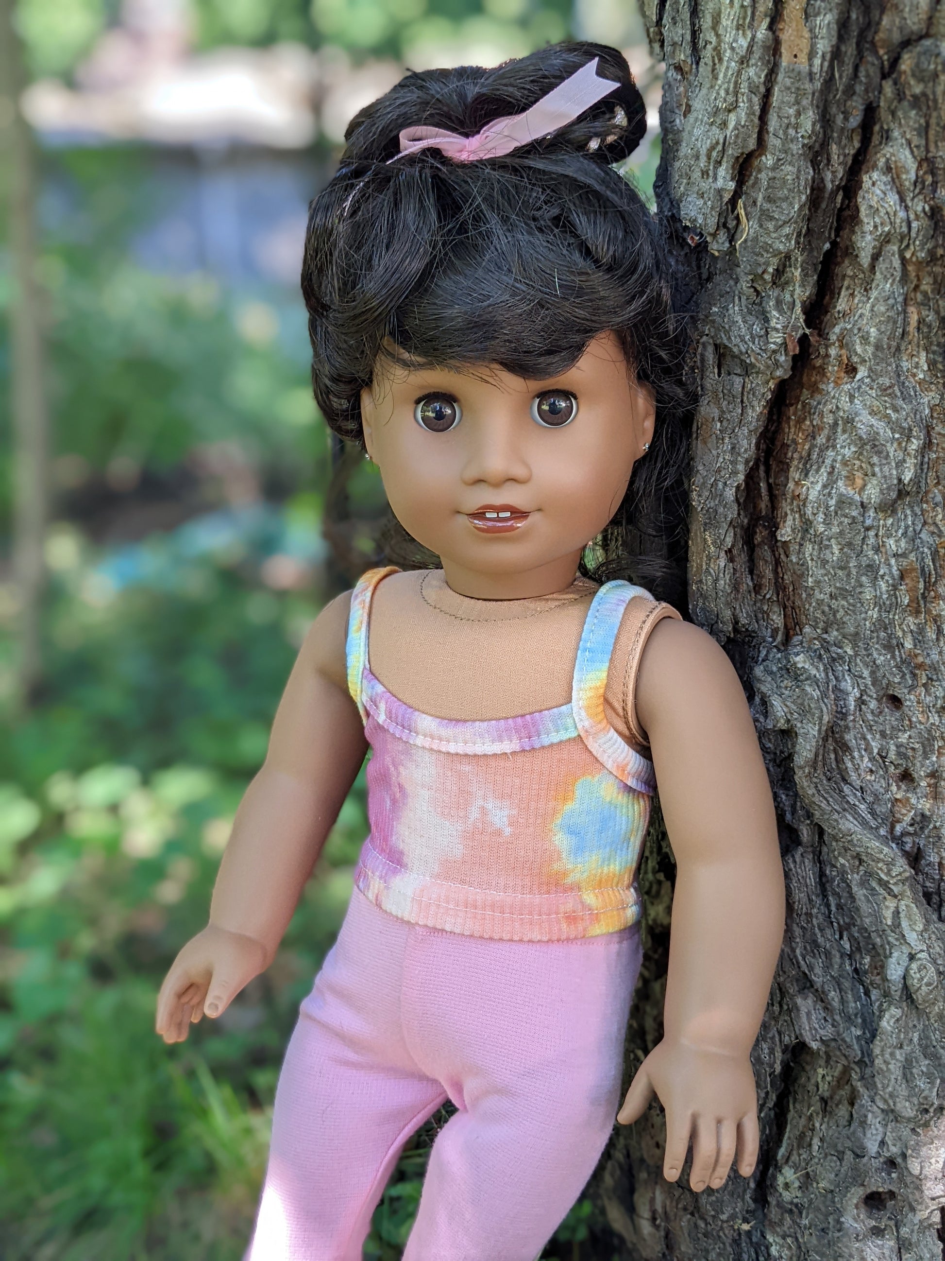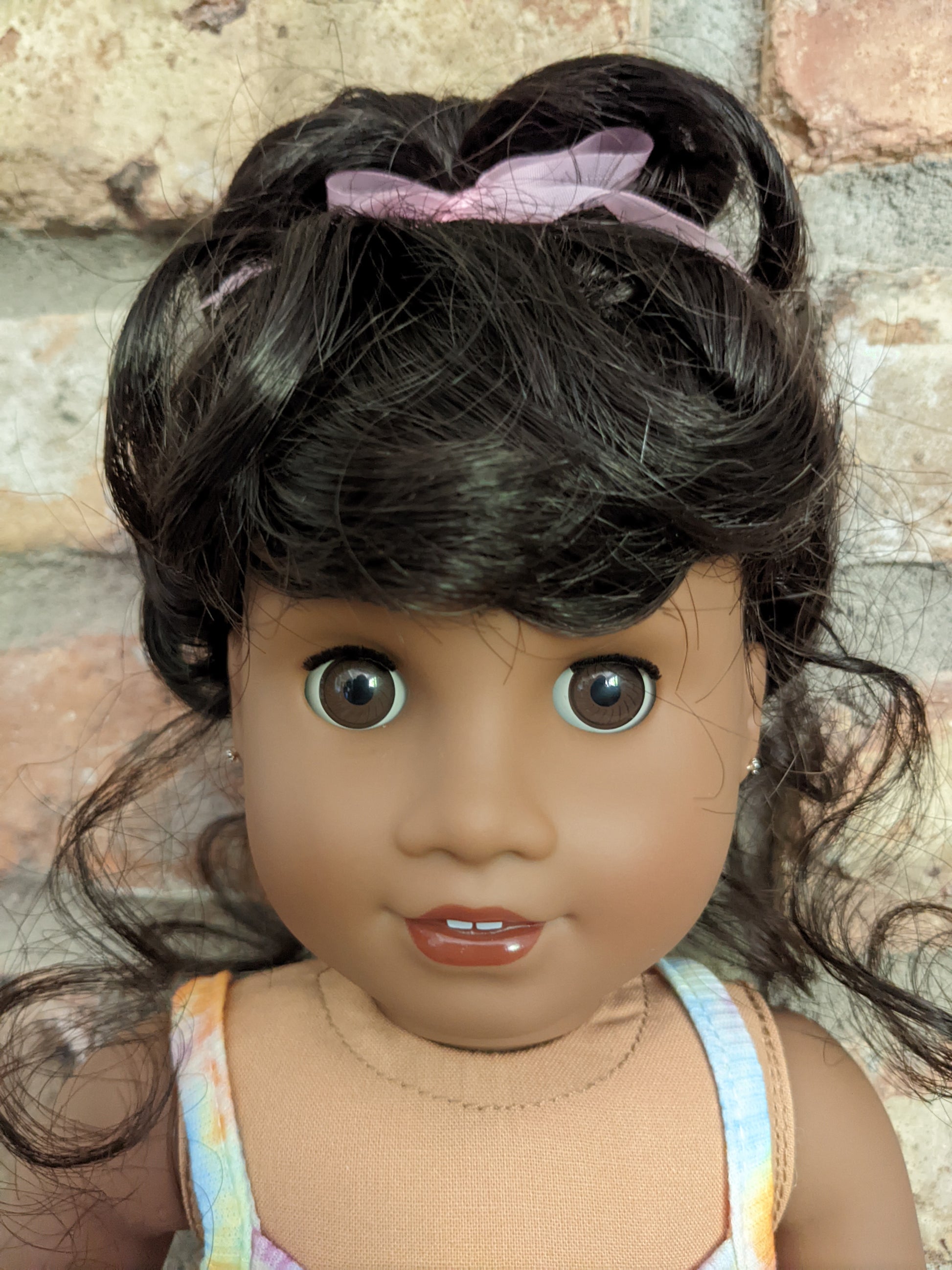 This one of a kind OOAK custom American Girl doll was created with a brand new Sparkling Ballerina doll, a dark brown wig styled into an updo, and brown eyes. She has lip gloss that was hand painted and sealed. She may have some minor shine marks from handling. She comes with the outfit pictured. Her ears are pierced with normal earrings and the tiny diamond look studs are included.