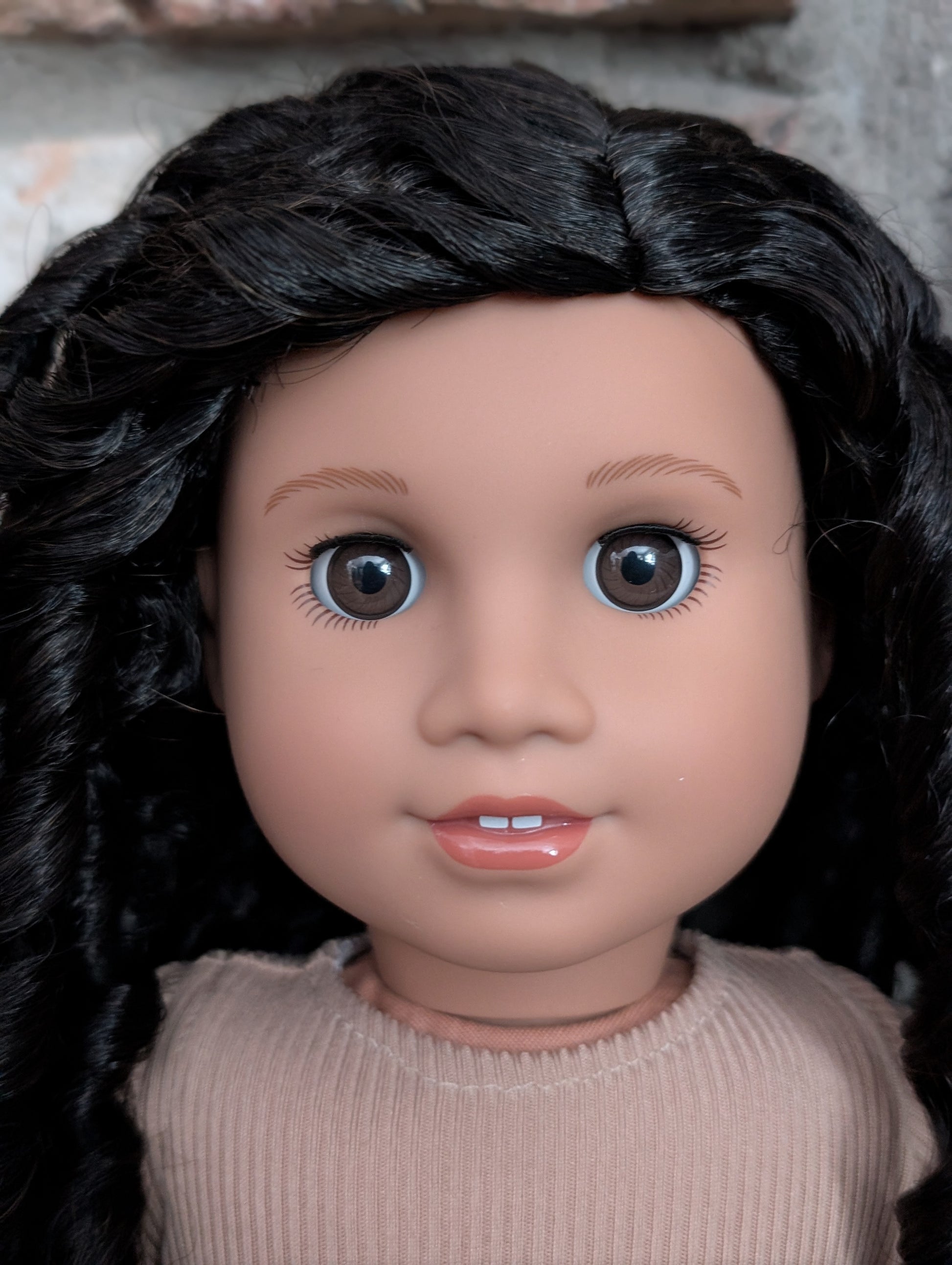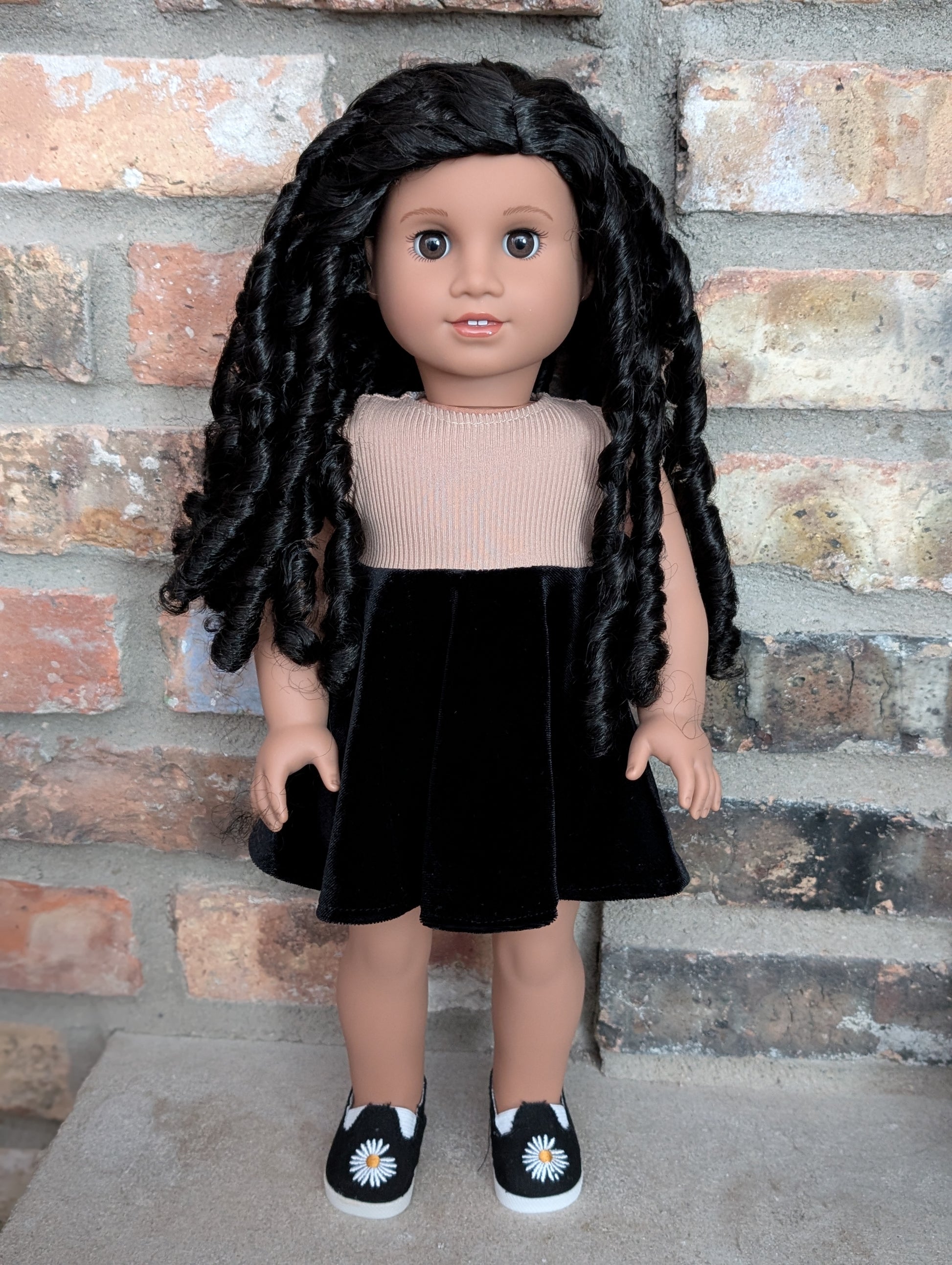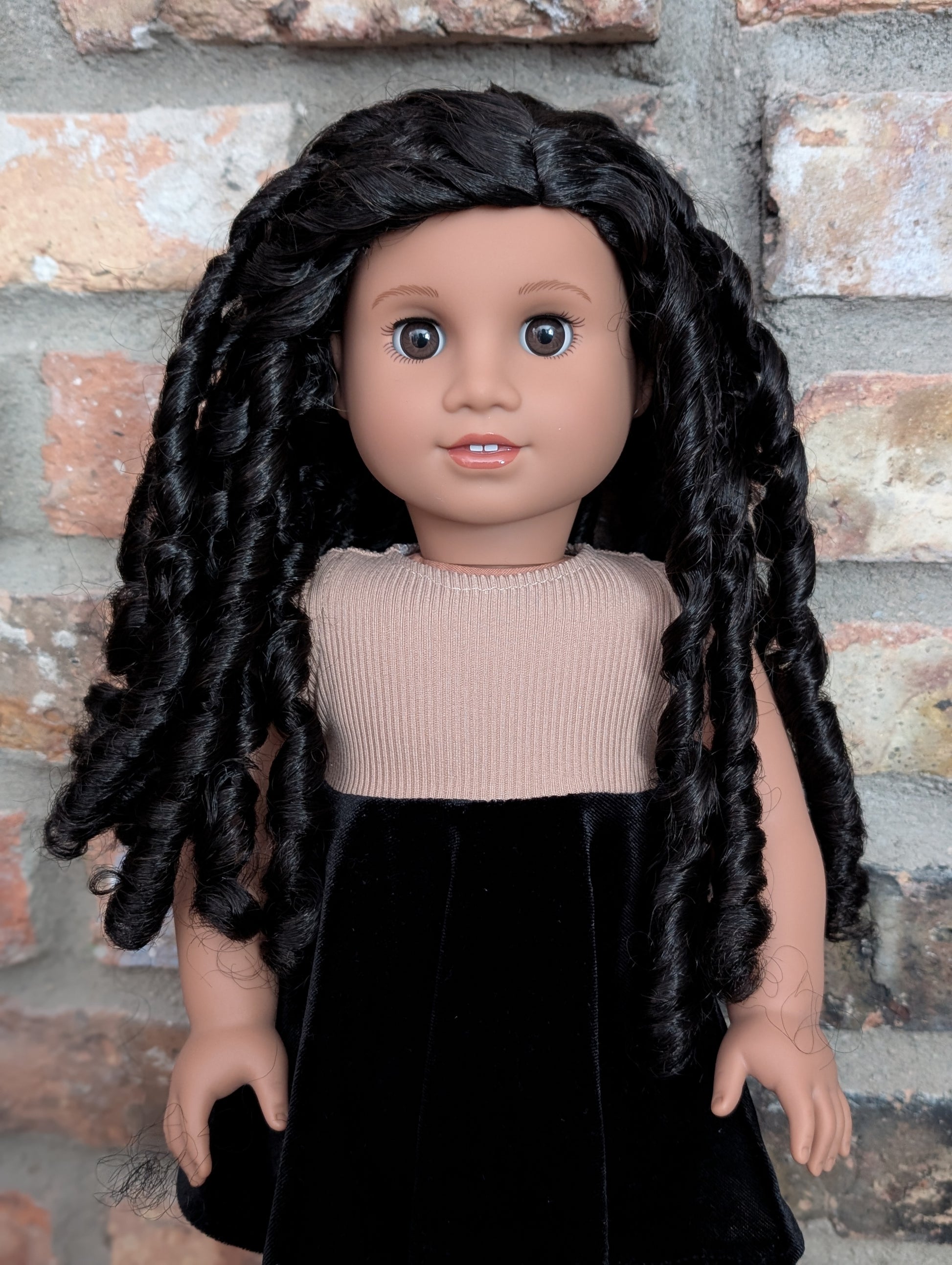 This one of a kind OOAK custom American Girl doll was created with a brand new doll, a black wig, and brown eyes. She has lip gloss that was hand painted and sealed. She may have some minor shine marks from handling. She comes with the outfit pictured.