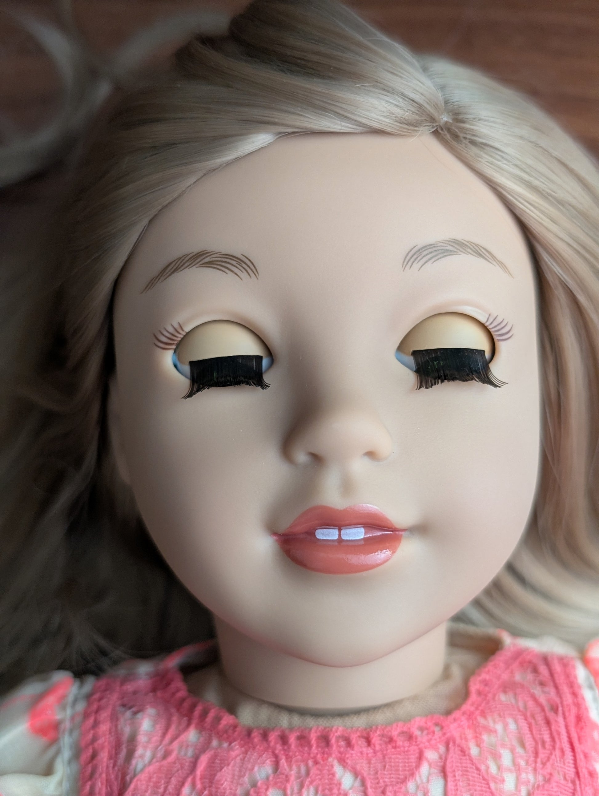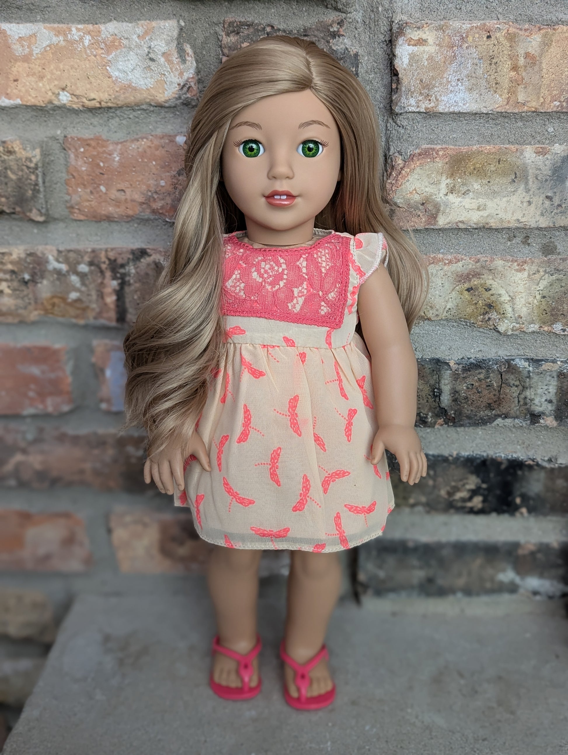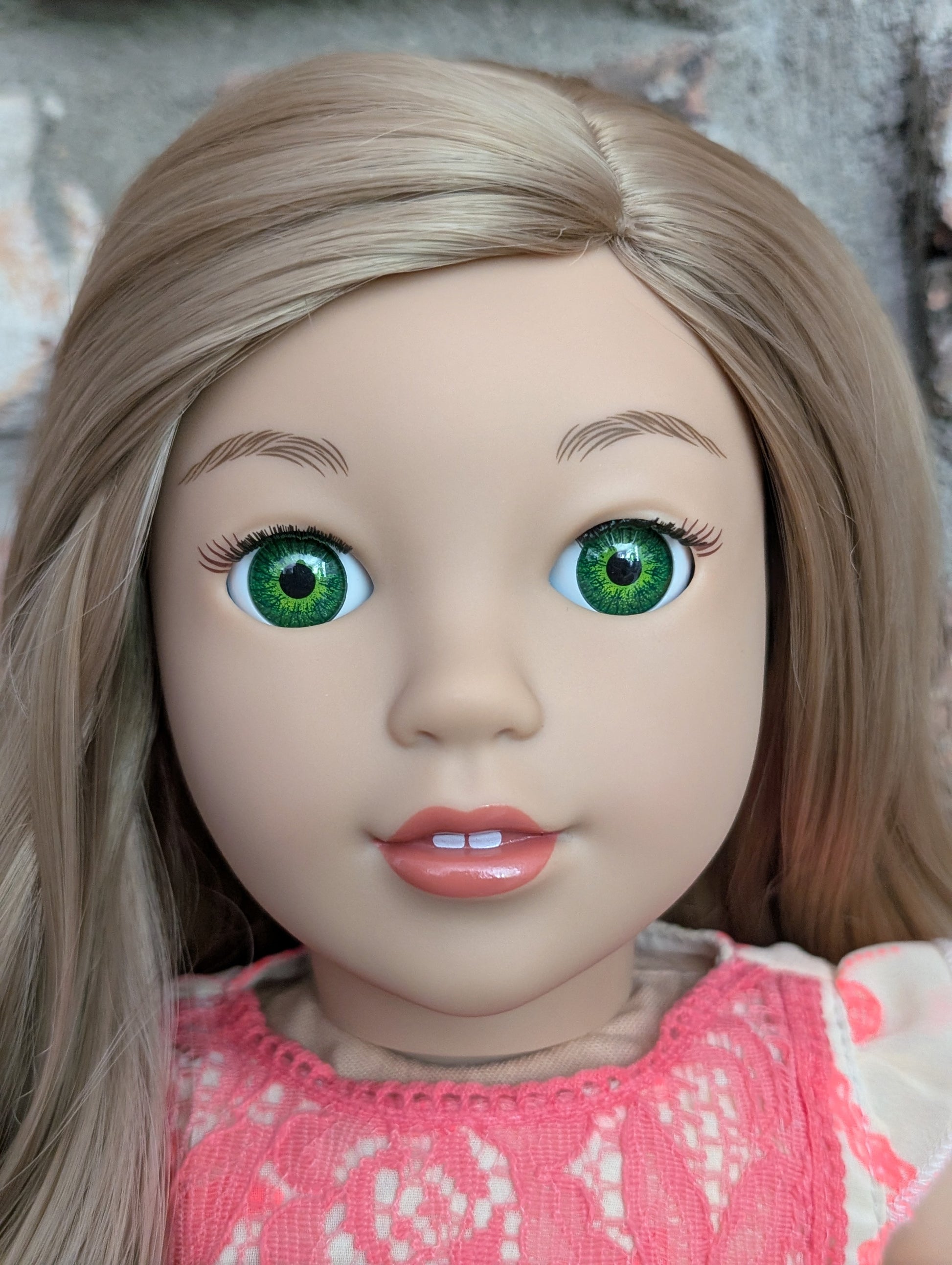 This one of a kind OOAK custom American Girl doll was created with a brand new doll, a blonde wig, and green eyes from Etsy. She has lip gloss that was hand painted and sealed. She may have some minor shine marks from handling. She comes with the outfit pictured.