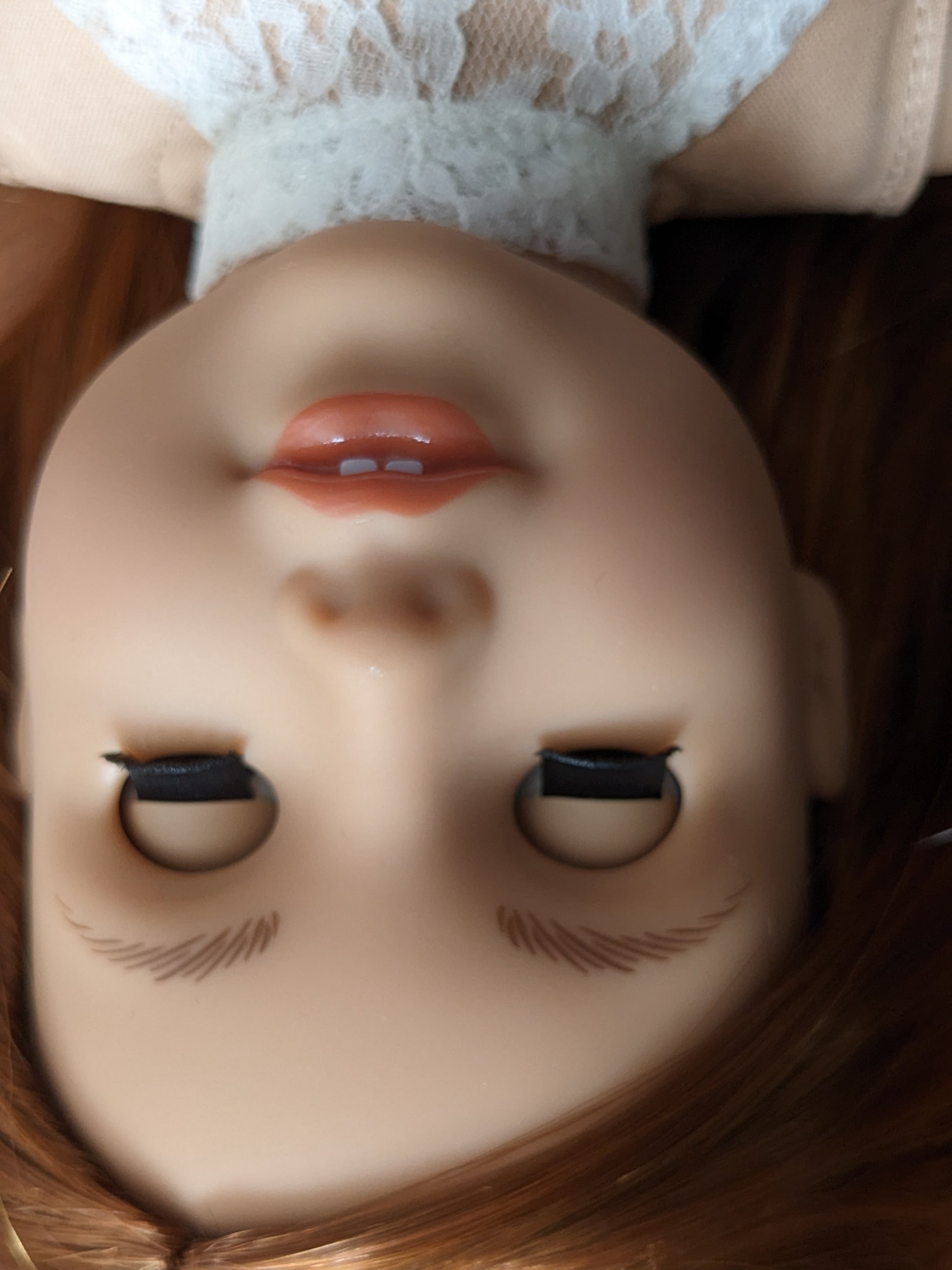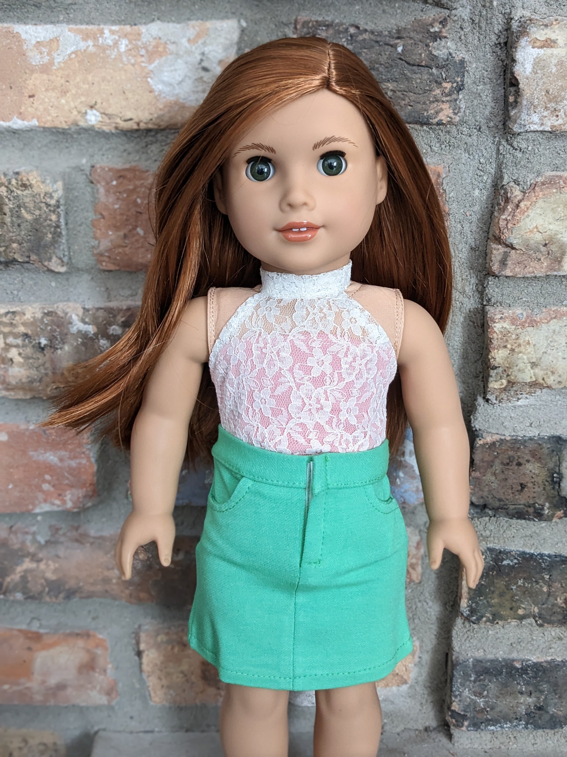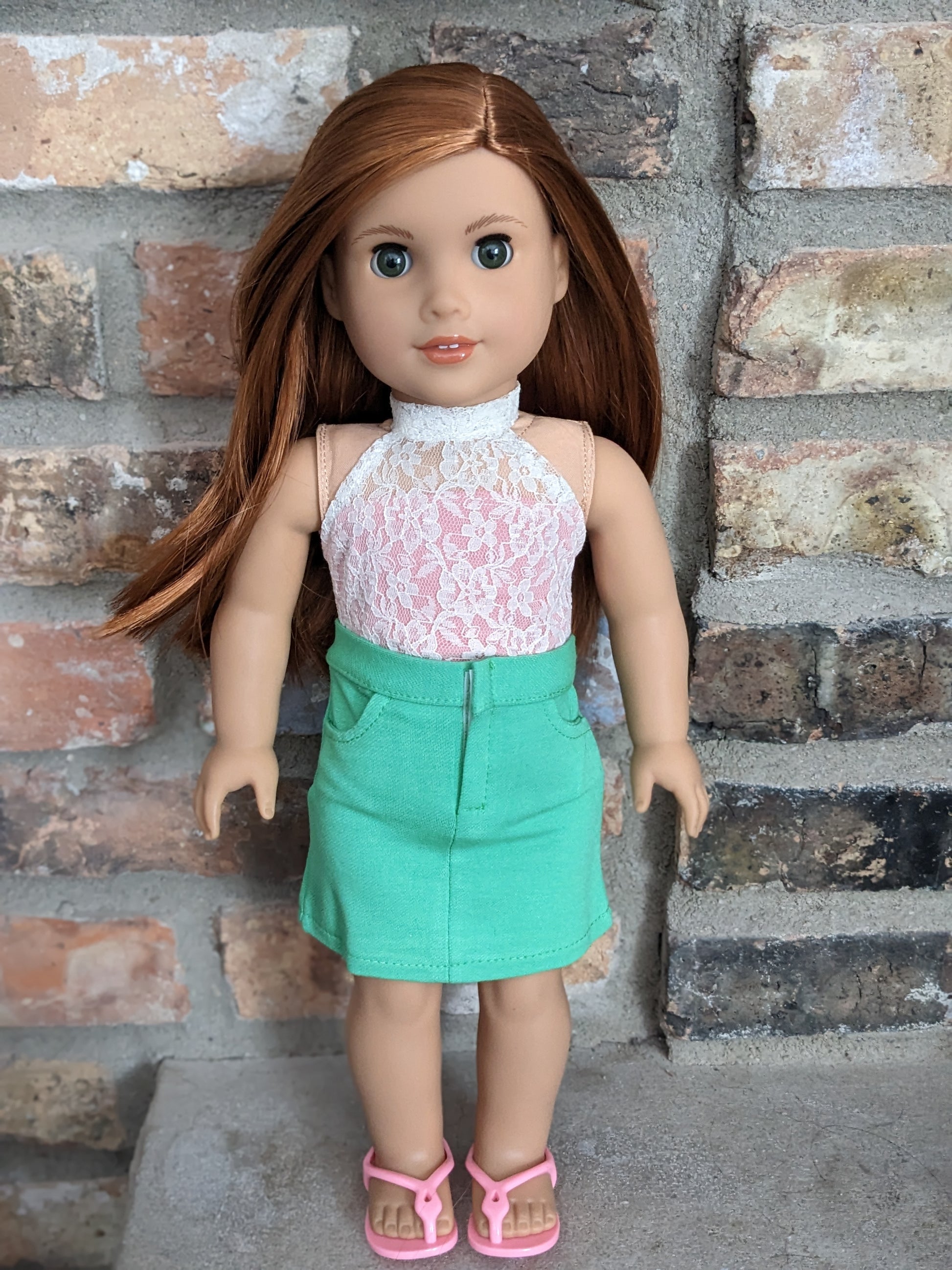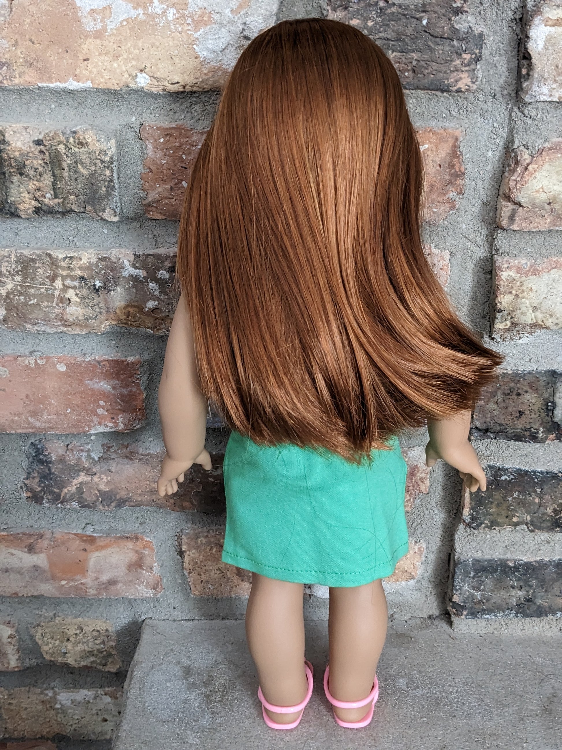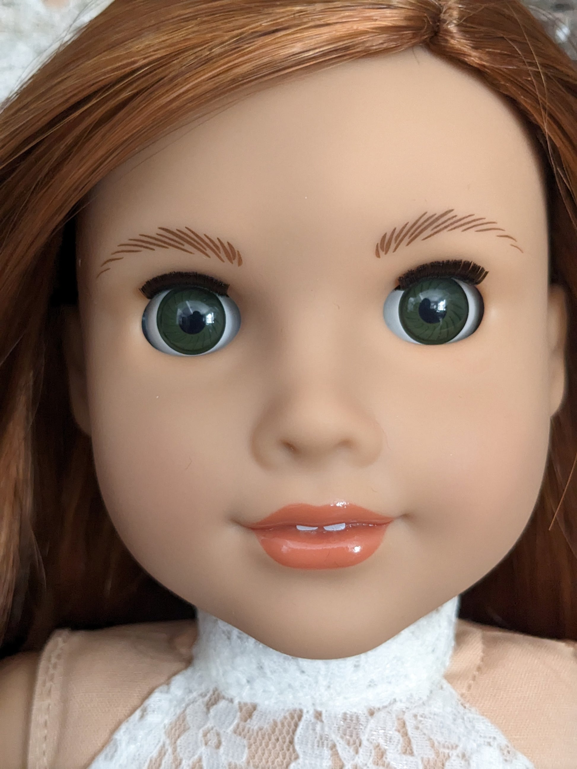 This one of a kind OOAK custom American Girl doll was created with a new doll, a red wig from a new TM doll, and green eyes. She has lip gloss that was hand painted and sealed. She may have some minor shine marks from handling. She comes with the outfit pictured. Her painted on eyelashes have been removed.