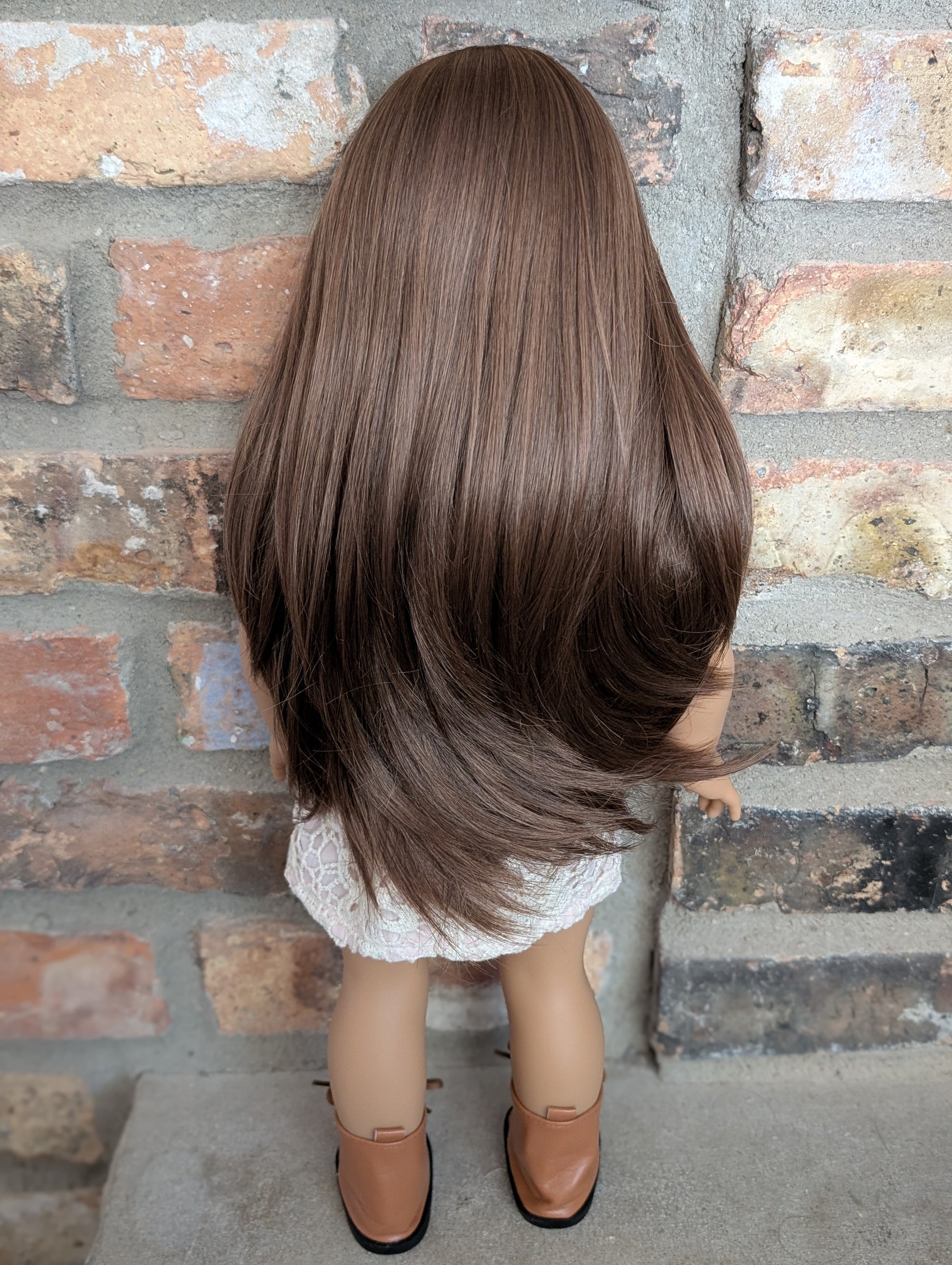 This one of a kind OOAK custom American Girl doll was created with a brand new doll, a brown wig, and green eyes from a BeForever Felicity. She may have some minor shine marks from handling. She comes with the outfit pictured.